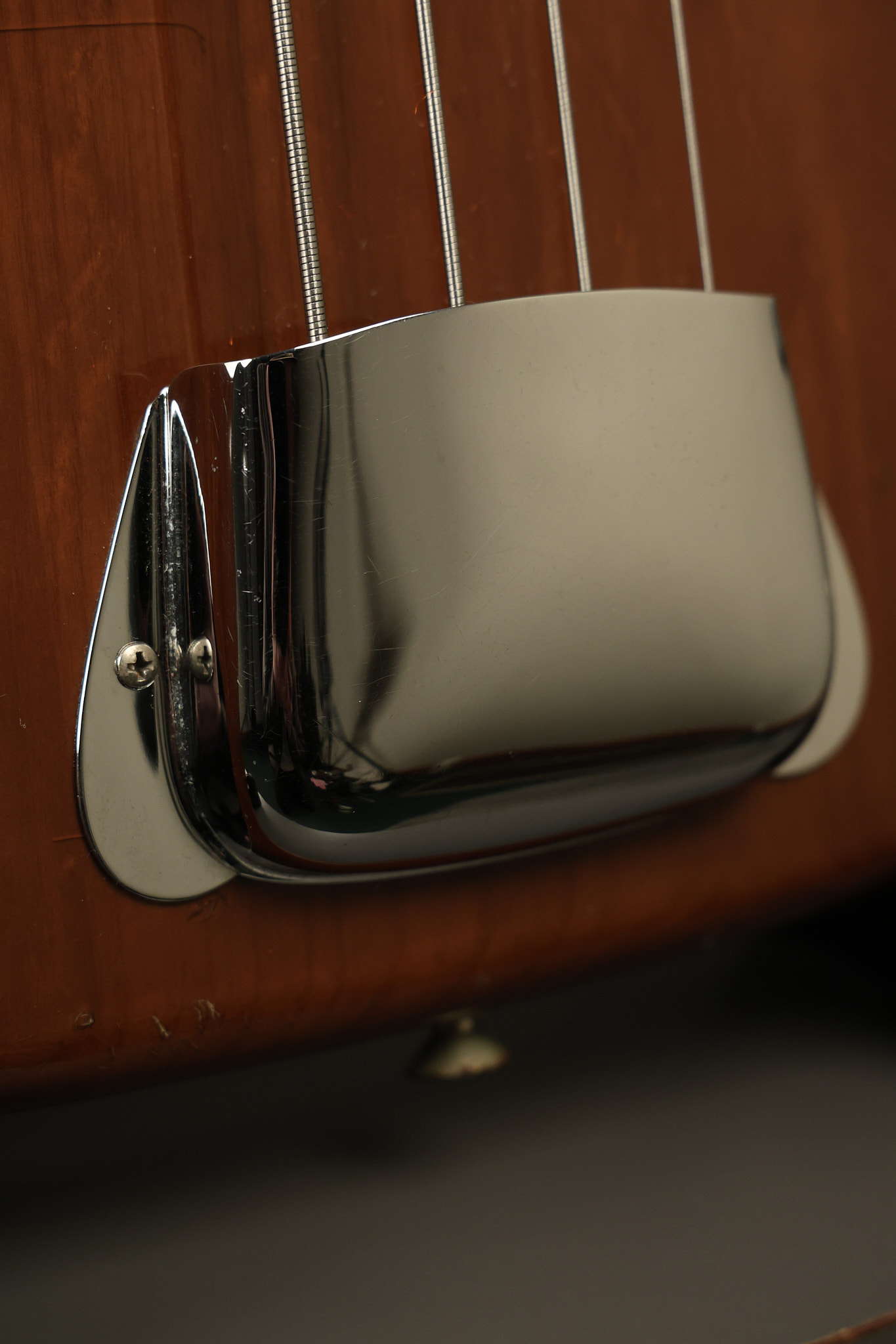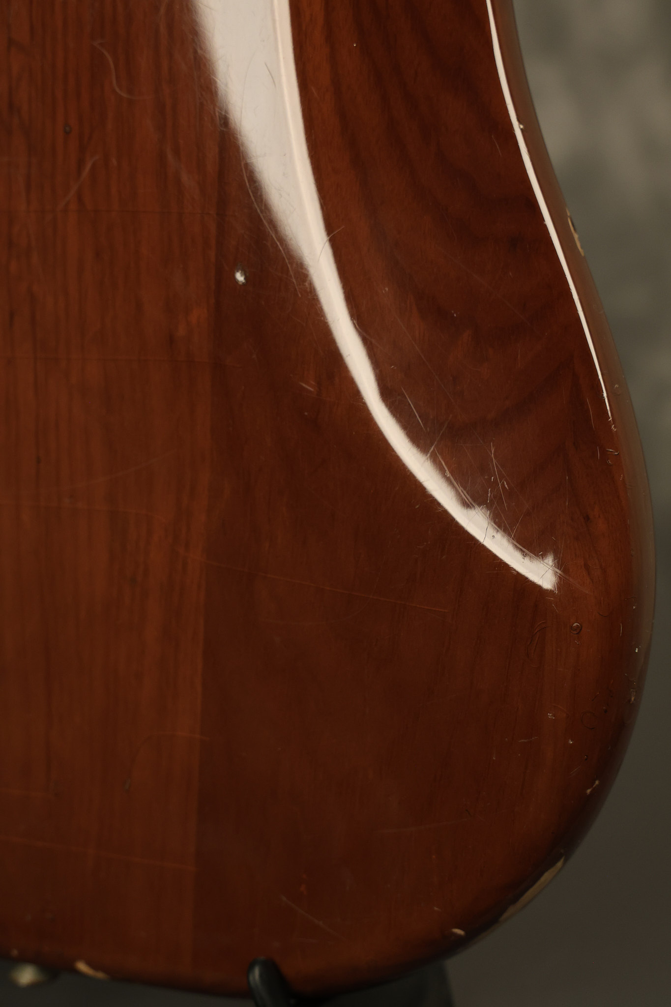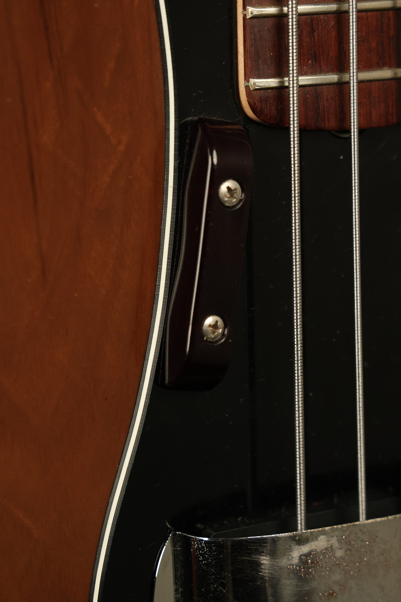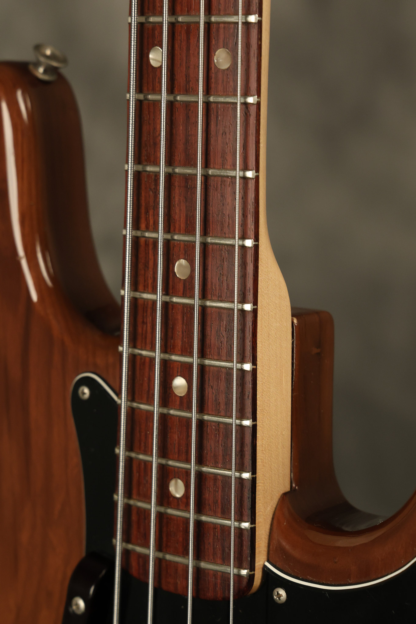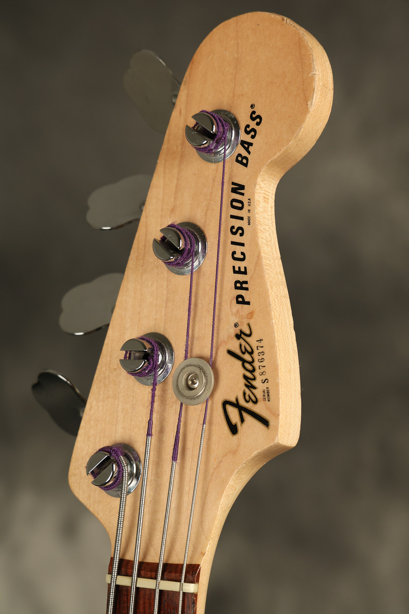 1978 Fender Precision Bass in its original Walnut finish. It has a good playing neck with great frets. It's all original with the exception of the jack and a couple of wires. The treble side pickup has been professionally rewound. It's also 100% complete along with both chrome covers and the original hardshell case. There are nicks + dings, a few finish cracks on the back of the body and other cosmetic wear. The bass itself remains structurally sound with no cracks, breaks or repairs. All electronics work and sound great as it provides an authentic '70's P-Bass tone.