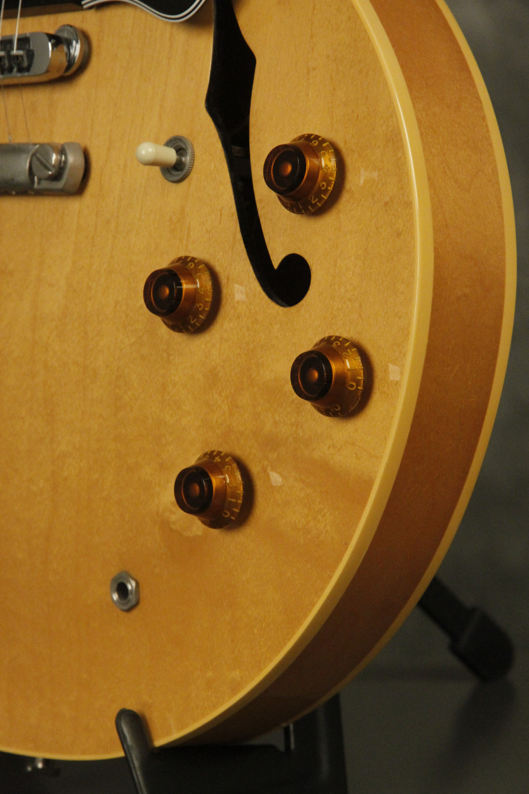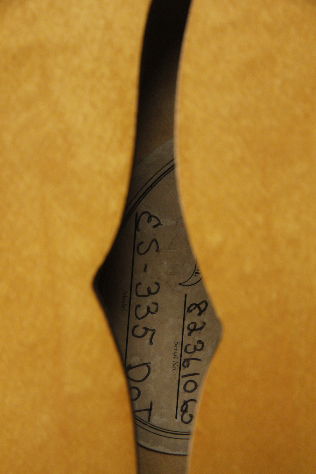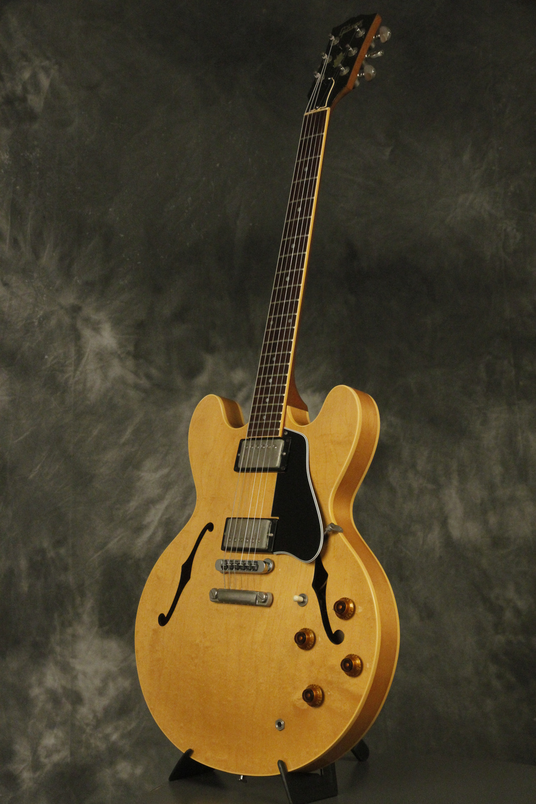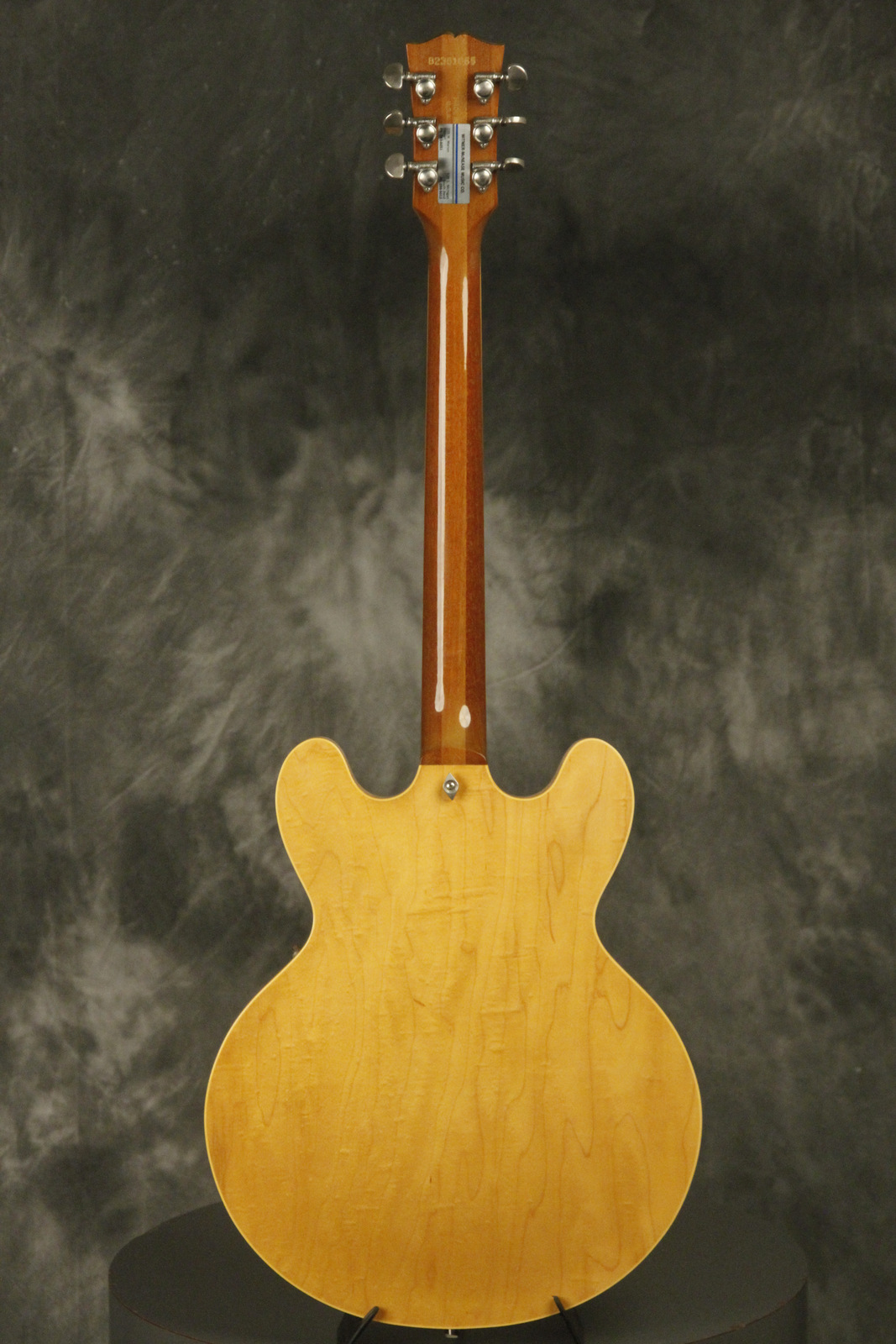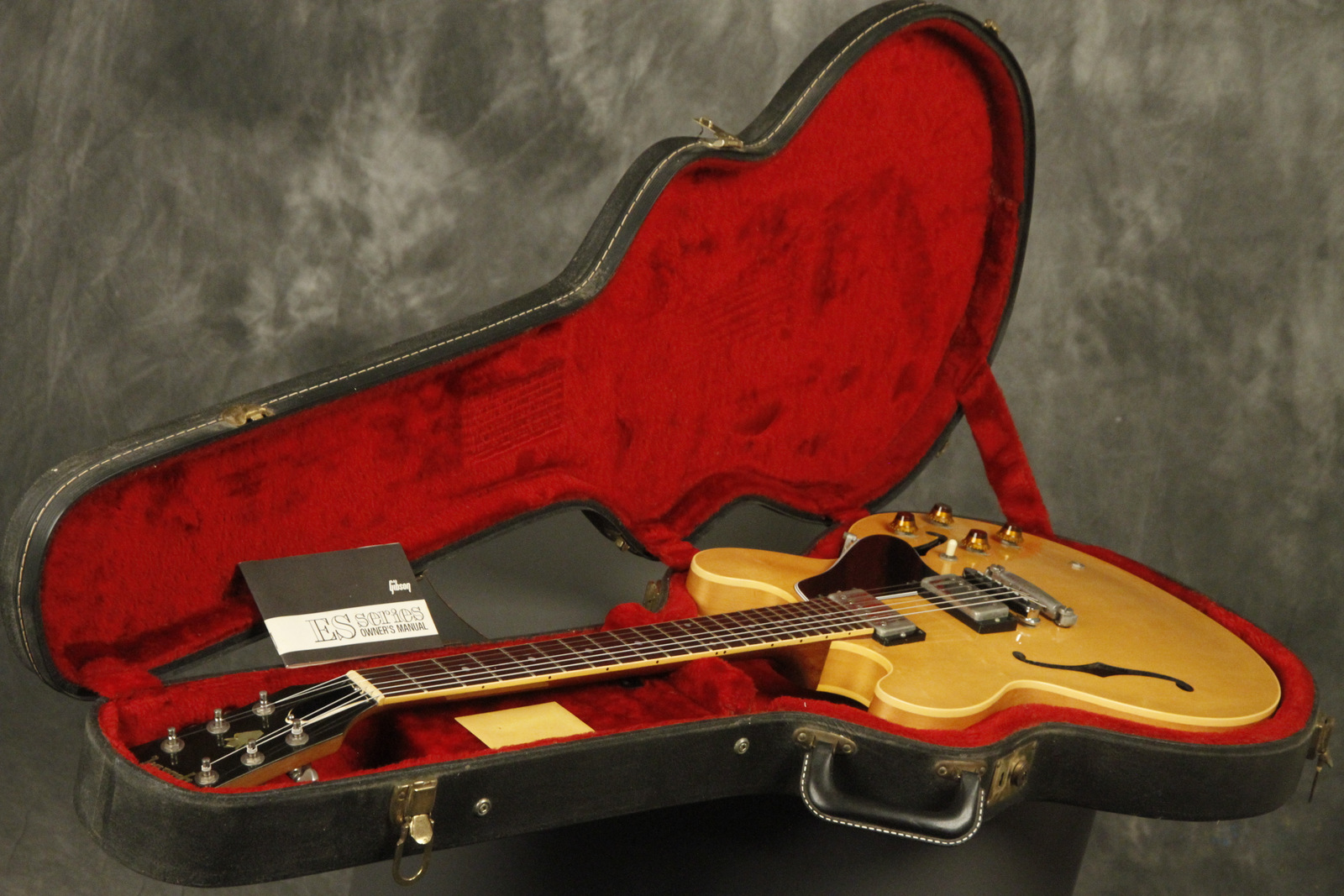 1981 Gibson ES-335 DOT reissue in its original Blonde finish. It has a great playing neck with good frets. It's all original and 100% complete along with its original hardshell case. It's in very good condition with surface wear on the hardware and other minor cosmetic wear. There is an old guitar store decal on the back of the headstock. Everything remains structurally sound with no cracks, breaks or repairs. All electronics work and sound great.