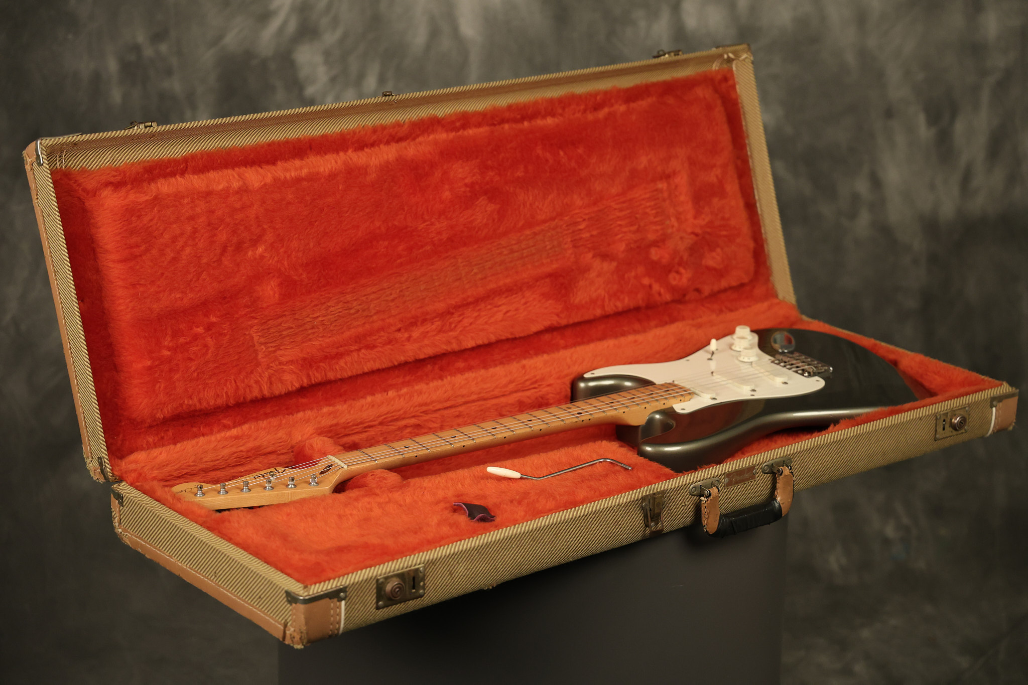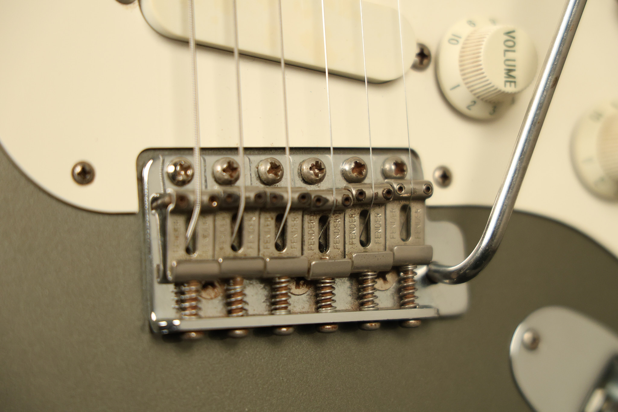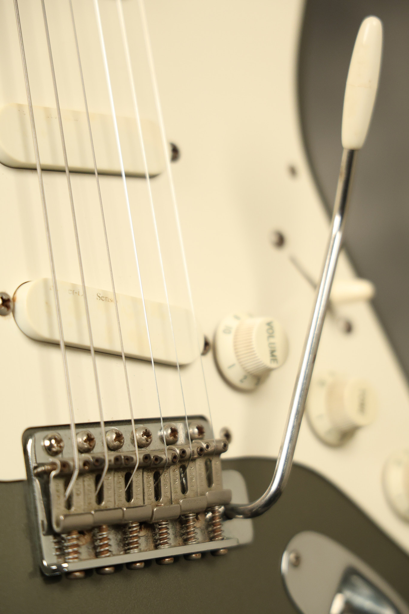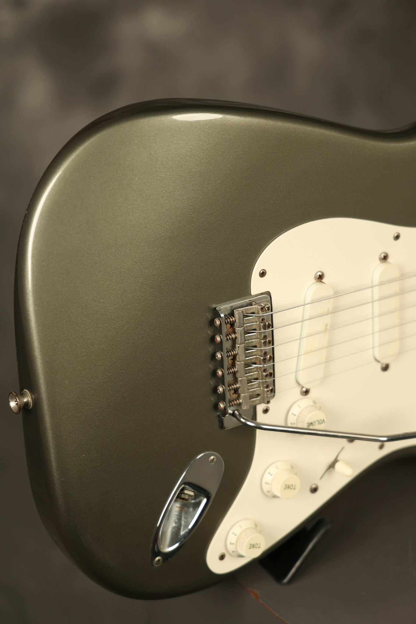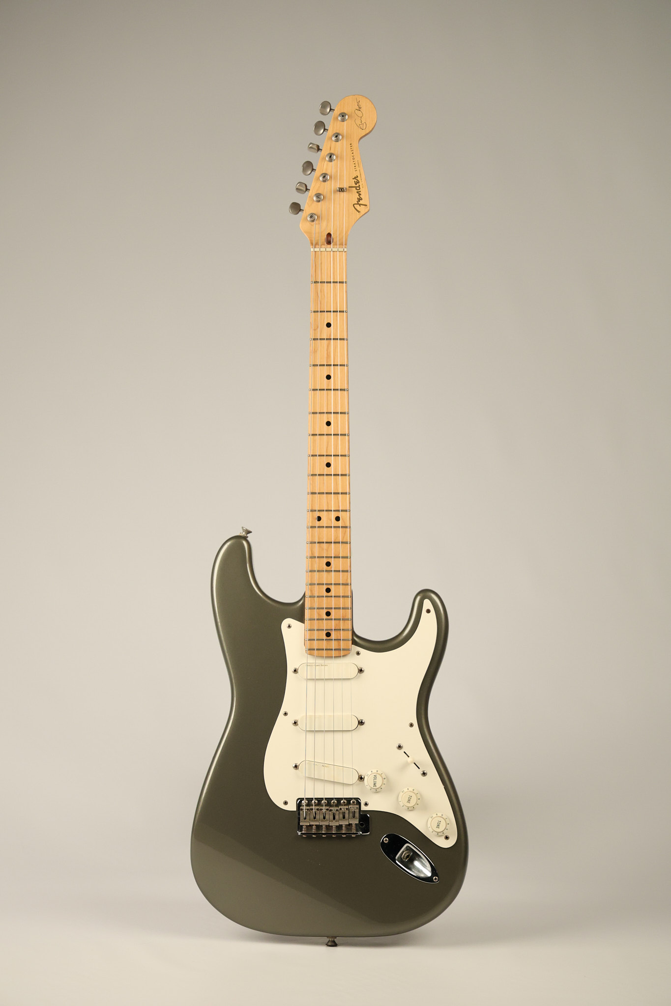 1988 Fender Eric Clapton signature Stratocaster in its original Pewter finish. It has a great playing neck with good frets. It's all original and includes the original tweed hardshell case. It's in very good condition with some minor nicks + dings, a deeper mark in the wood on the lower treble edge of the body, cracked corners on the plastic tremolo cover on back and other cosmetic wear including some tiny very light marks in the finish on the back of the neck behind the 5th/6th fret area. The guitar itself remains structurally sound with no cracks, breaks or repairs. All electronics work and sound great.