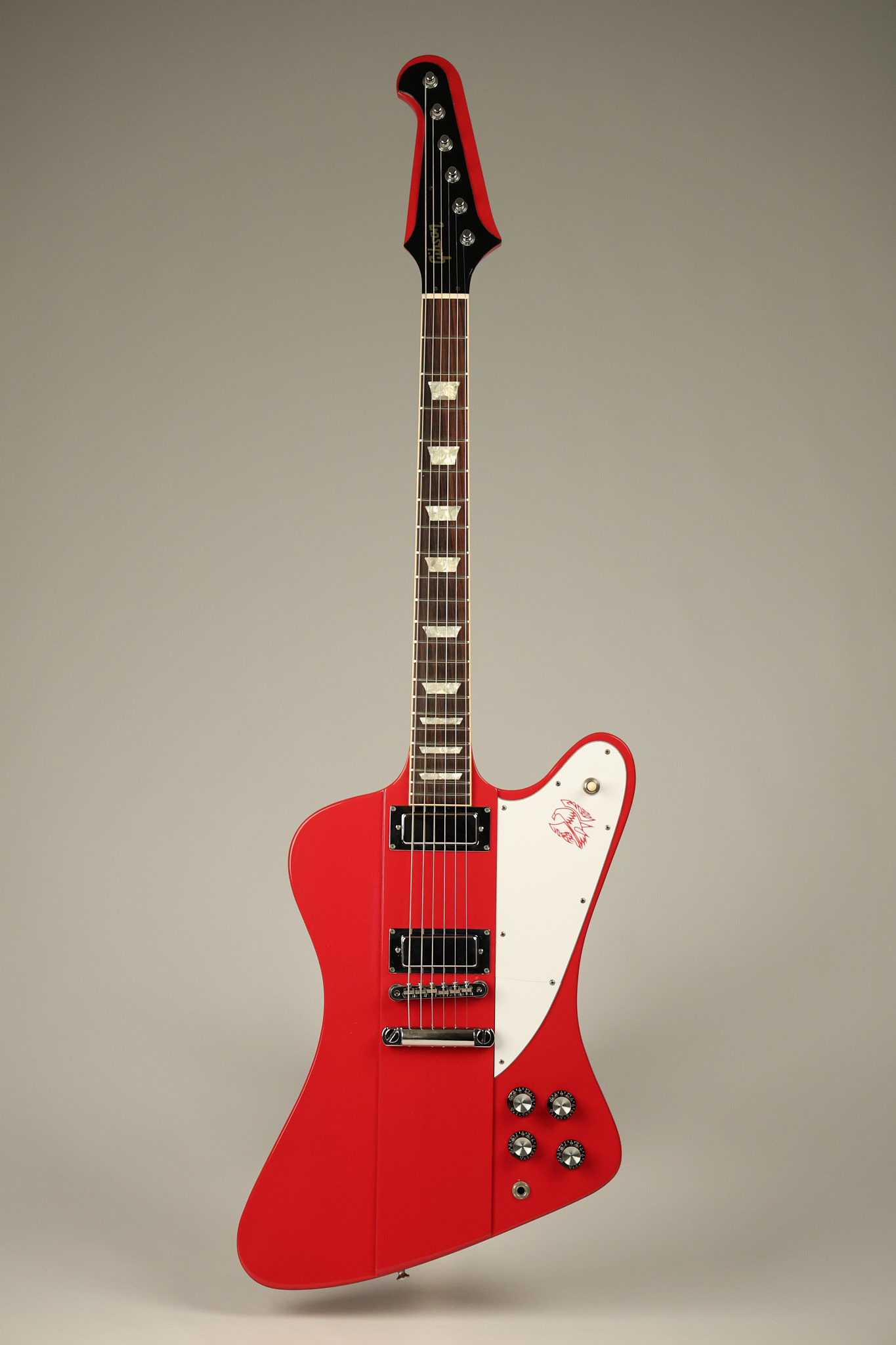 1990 Gibson Firebird V in its original Cardinal Red finish. It has a good playing neck with good frets. It's all original and 100% complete along with its original hardshell case. It's in very good condition with a couple of cracks through the pickguard, some very minor nicks + dings and other very minor cosmetic wear. The guitar itself remains structurally sound with no cracks, breaks or repairs. All electronics work and sound great.