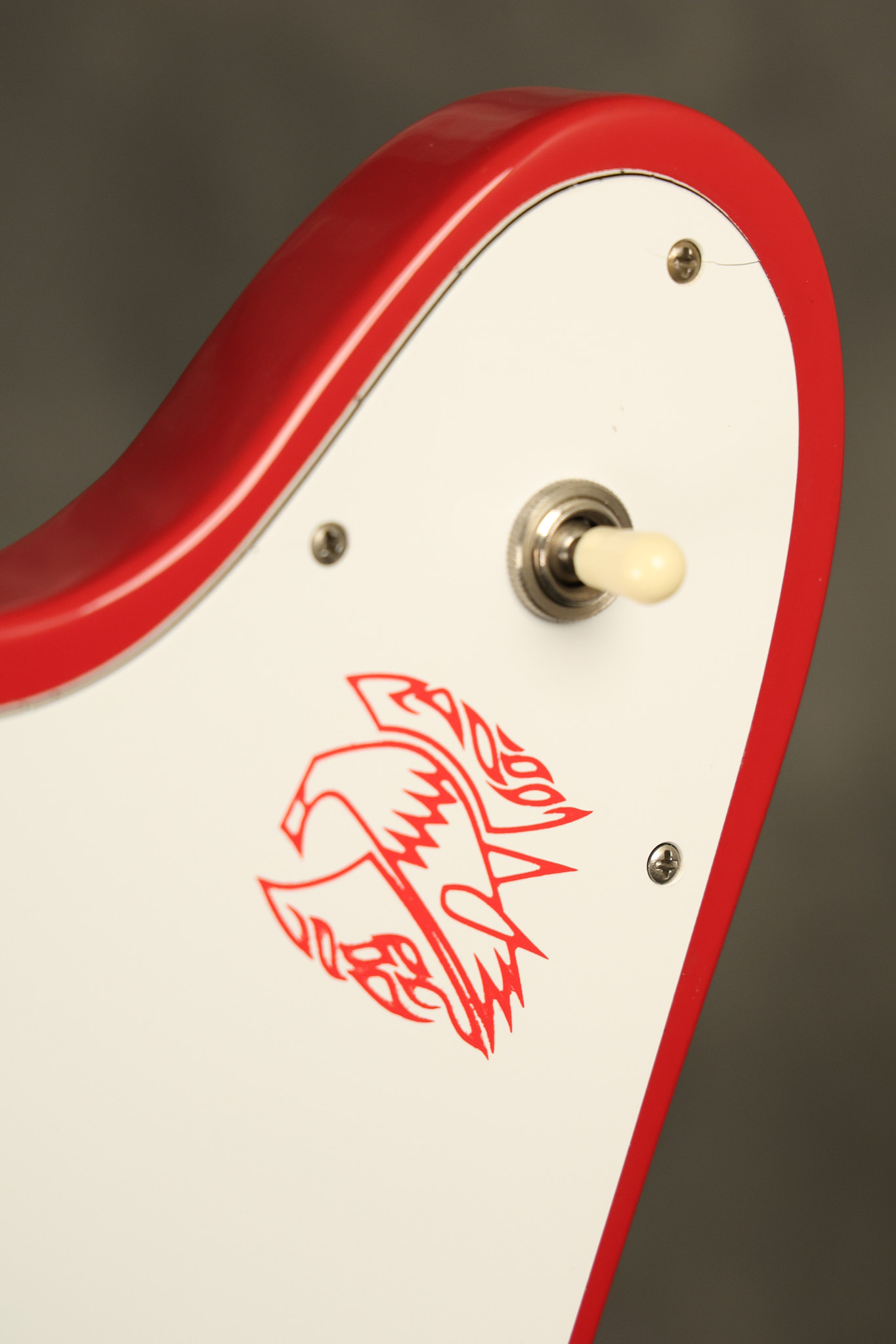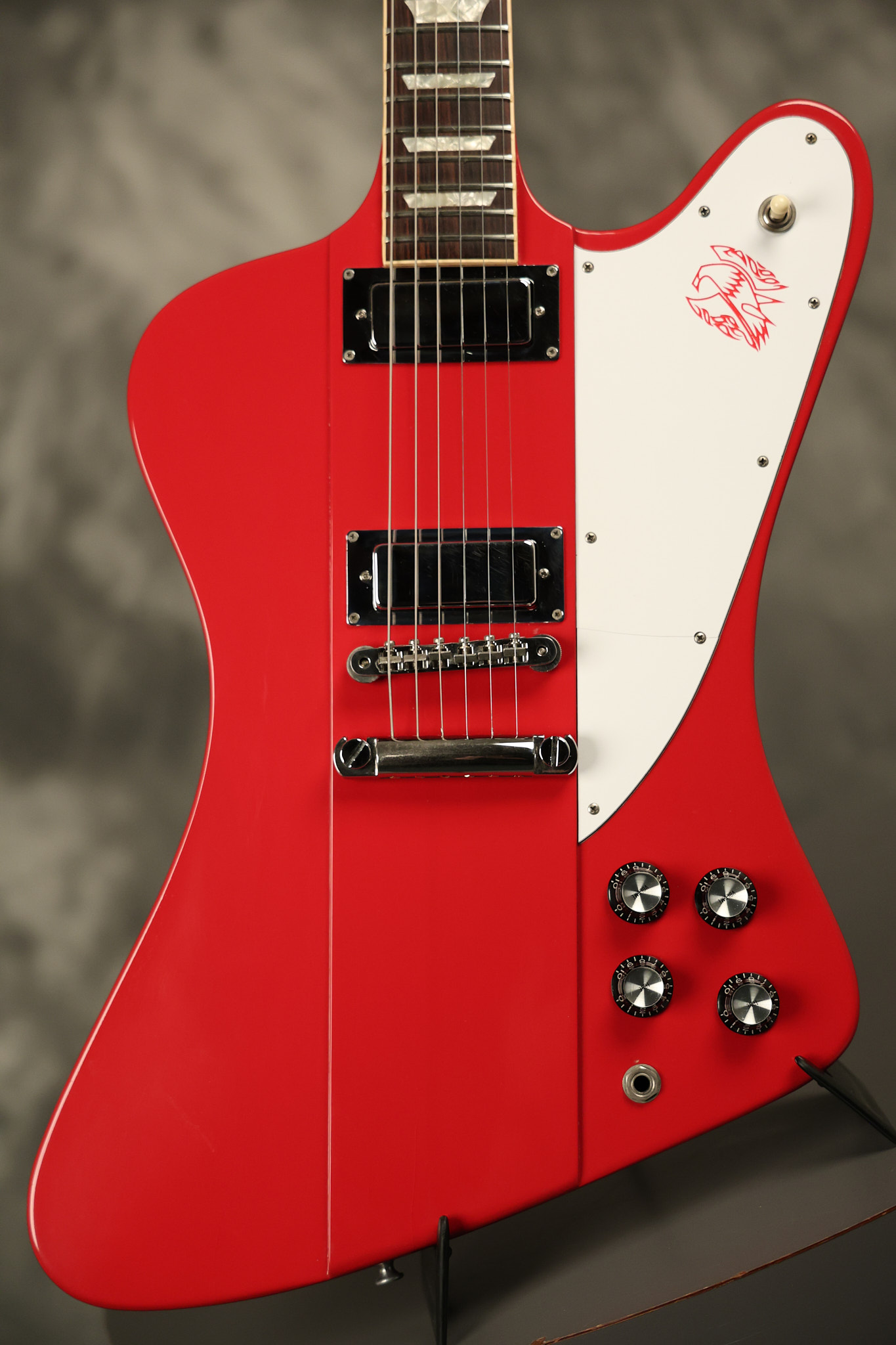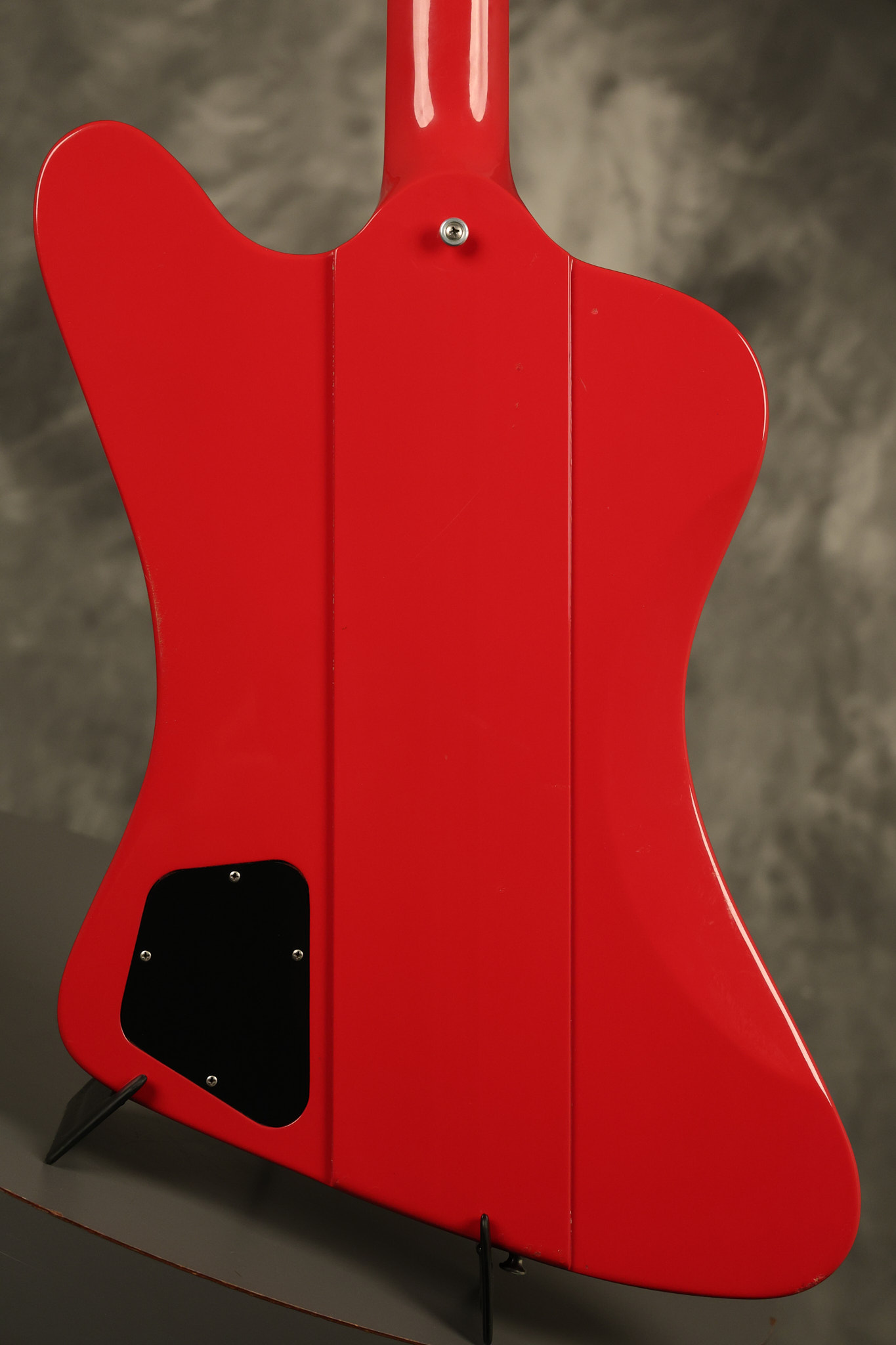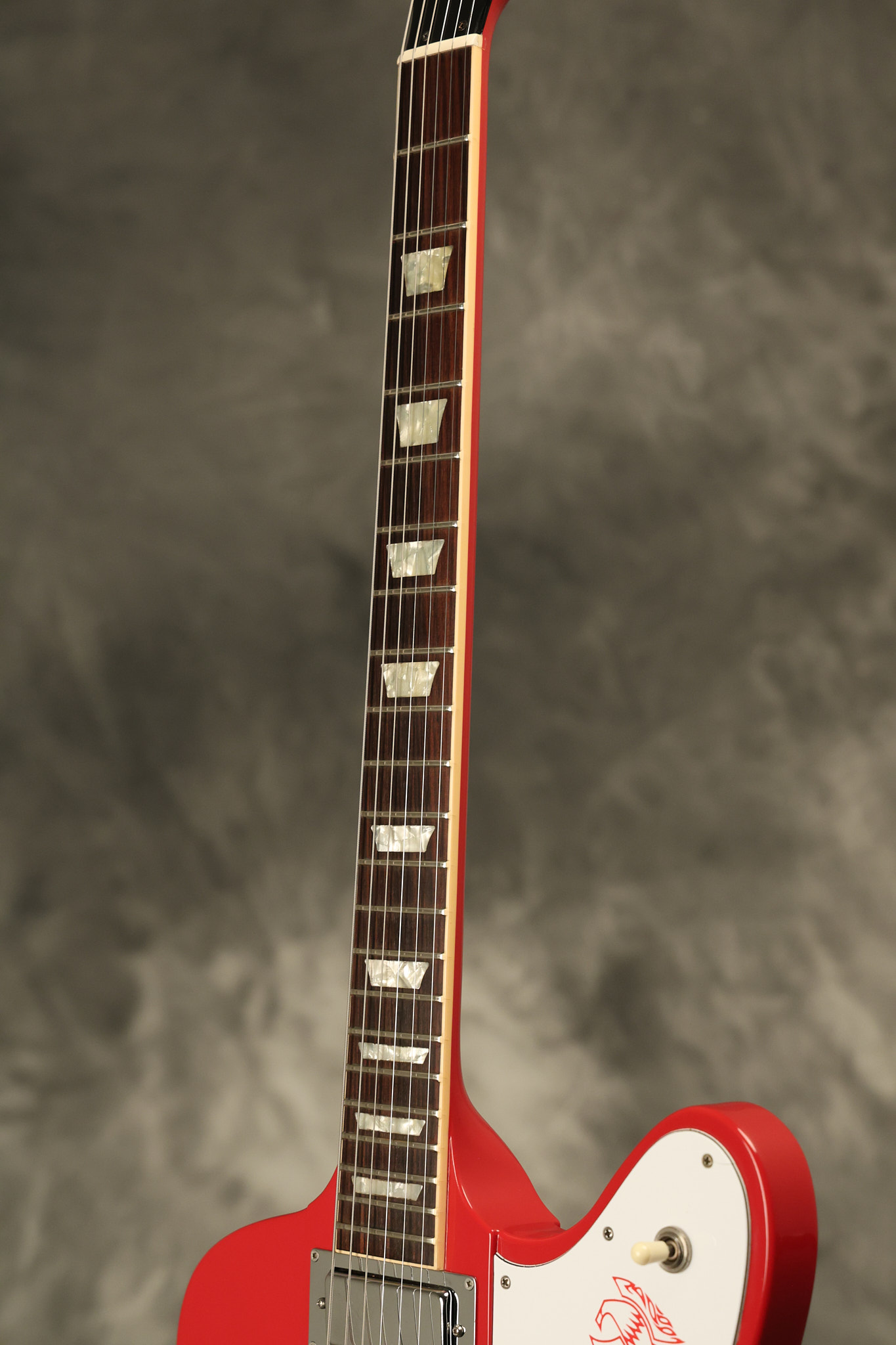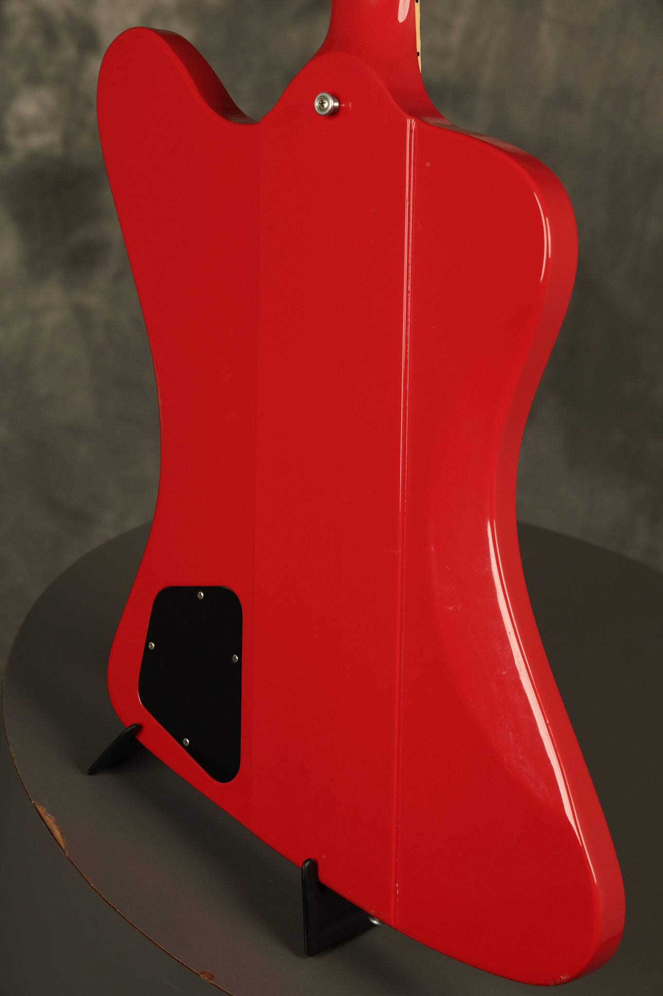 1990 Gibson Firebird V in its original Cardinal Red finish. It has a good playing neck with good frets. It's all original and 100% complete along with its original hardshell case. It's in very good condition with a couple of cracks through the pickguard, some very minor nicks + dings and other very minor cosmetic wear. The guitar itself remains structurally sound with no cracks, breaks or repairs. All electronics work and sound great.