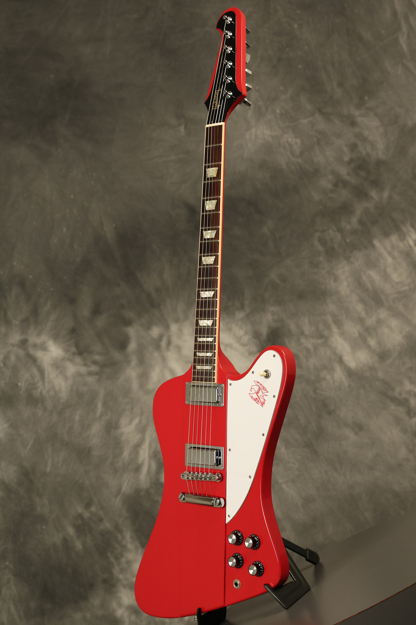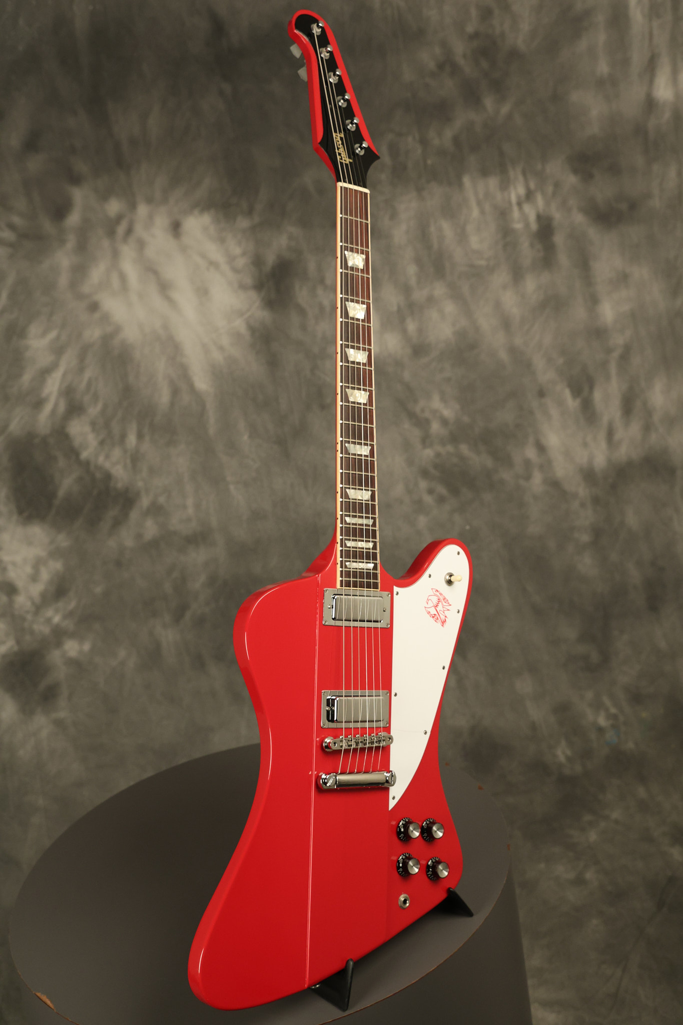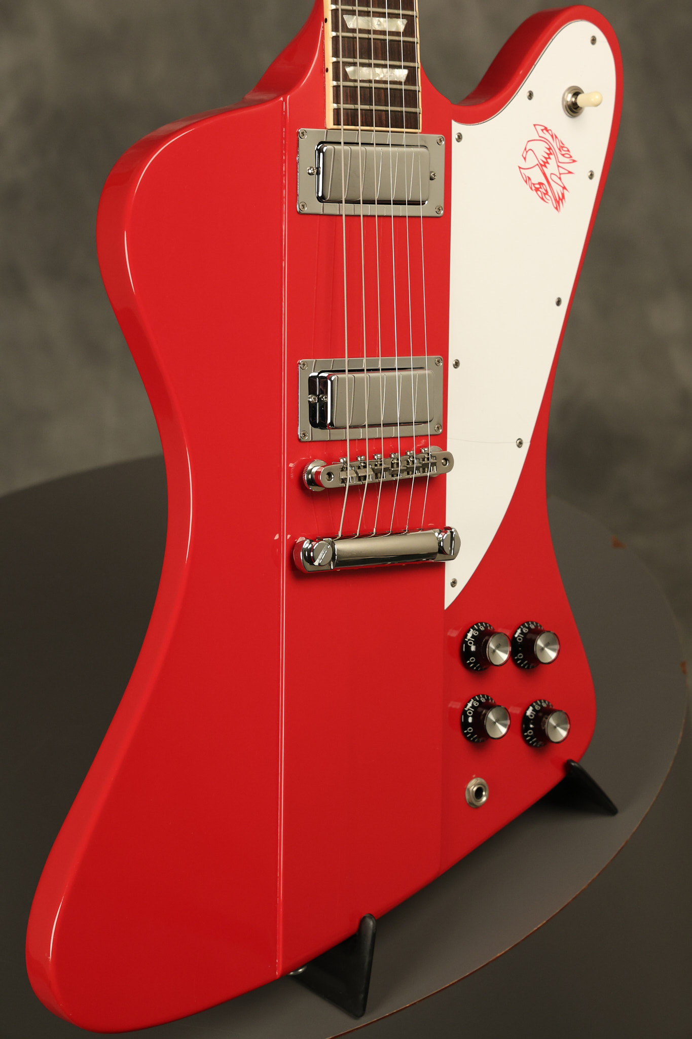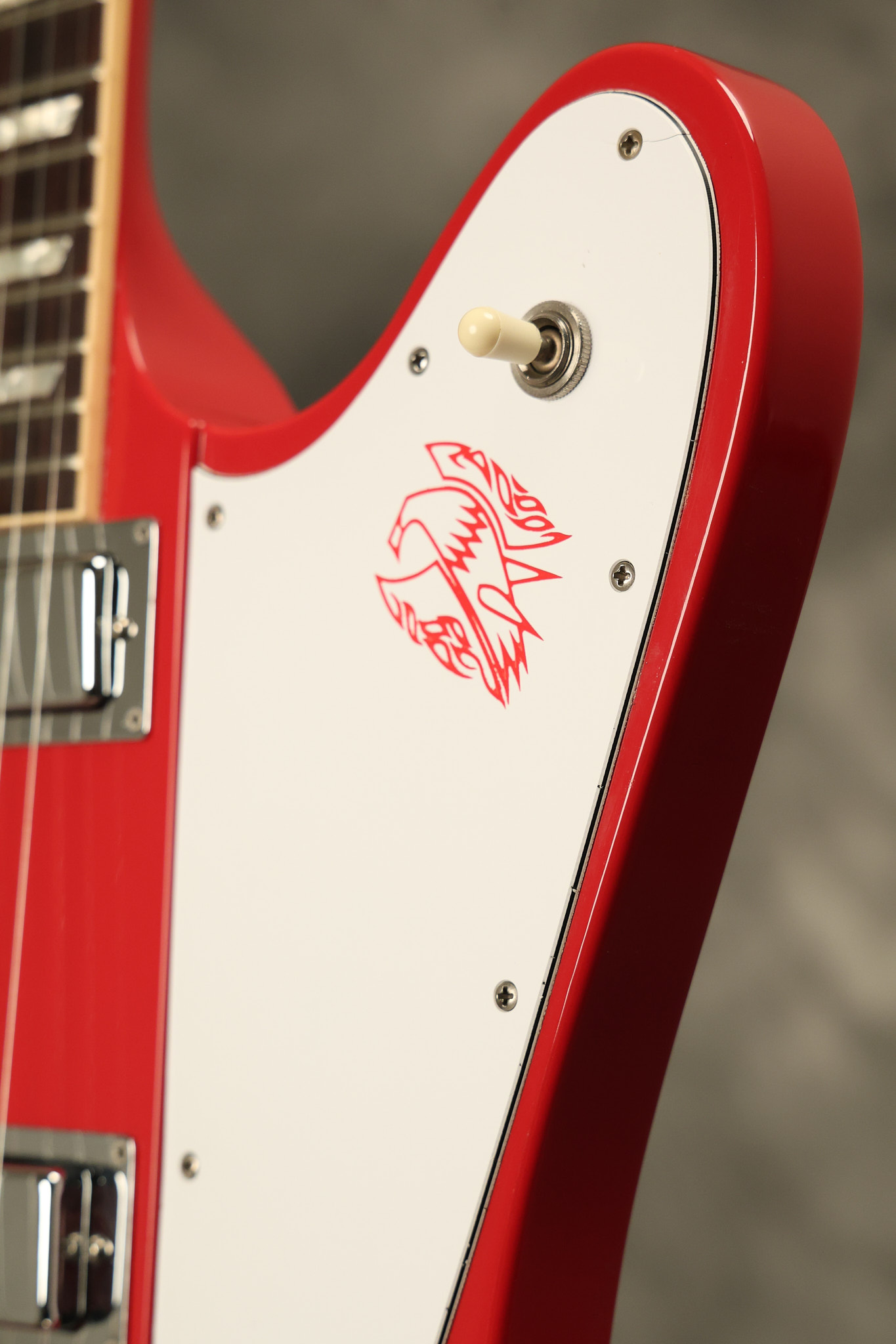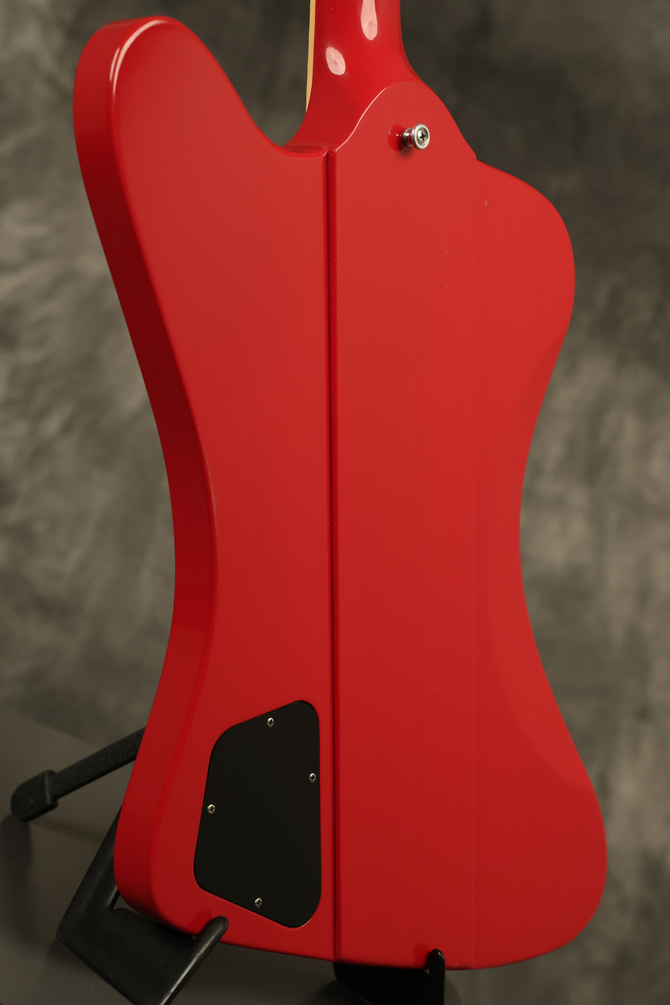 1990 Gibson Firebird V in its original Cardinal Red finish. It has a good playing neck with good frets. It's all original and 100% complete along with its original hardshell case. It's in very good condition with a couple of cracks through the pickguard, some very minor nicks + dings and other very minor cosmetic wear. The guitar itself remains structurally sound with no cracks, breaks or repairs. All electronics work and sound great.