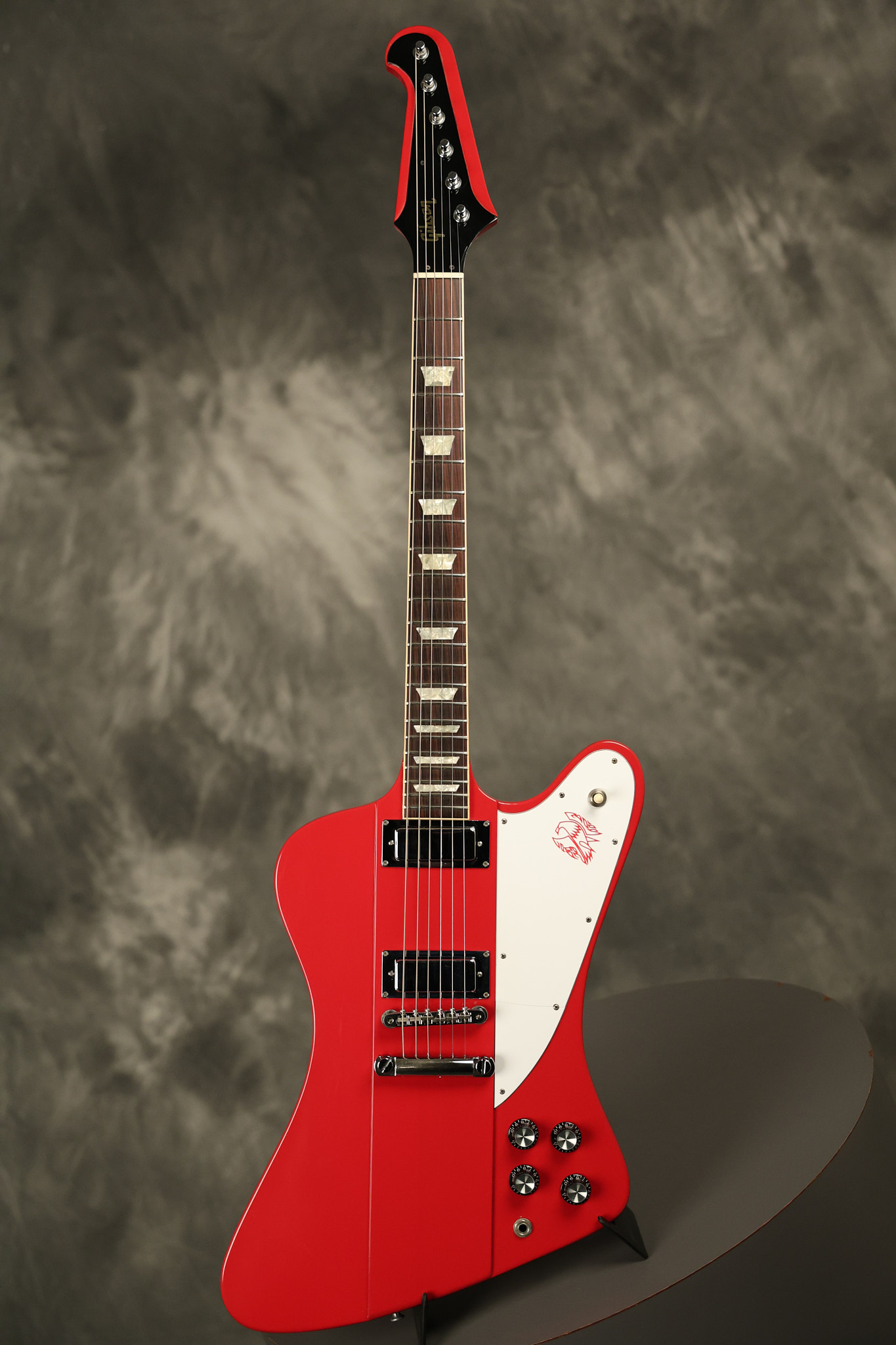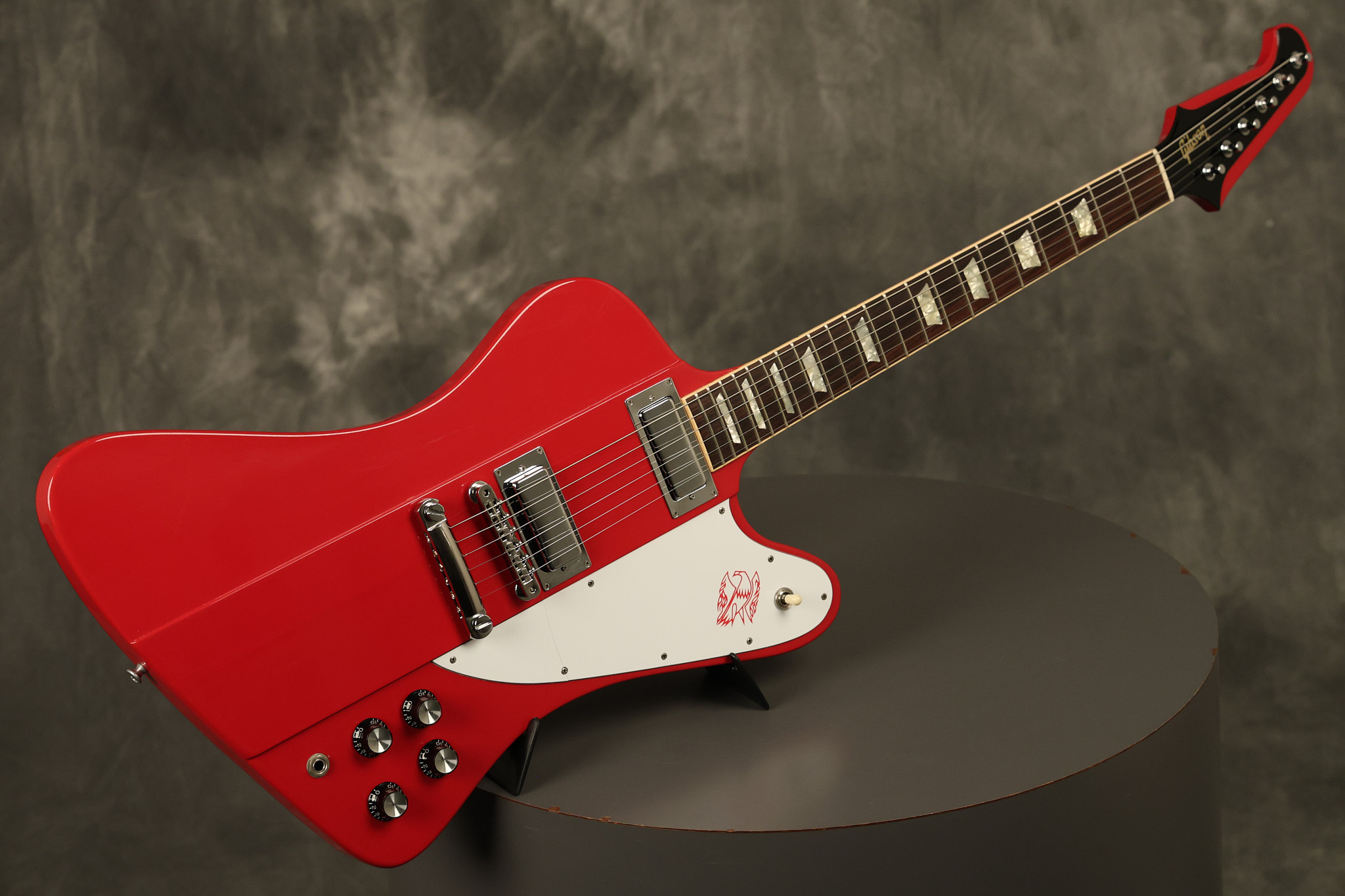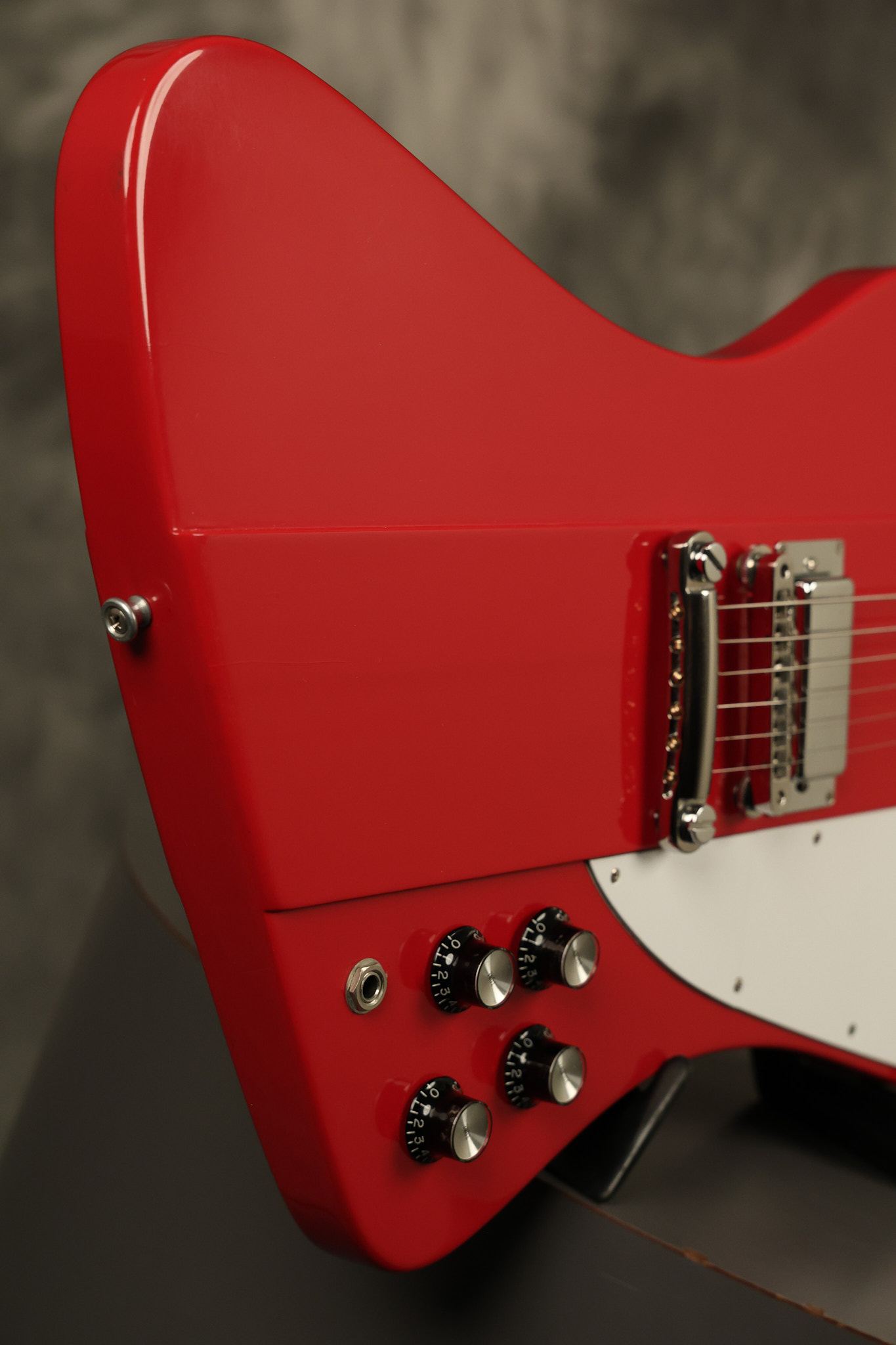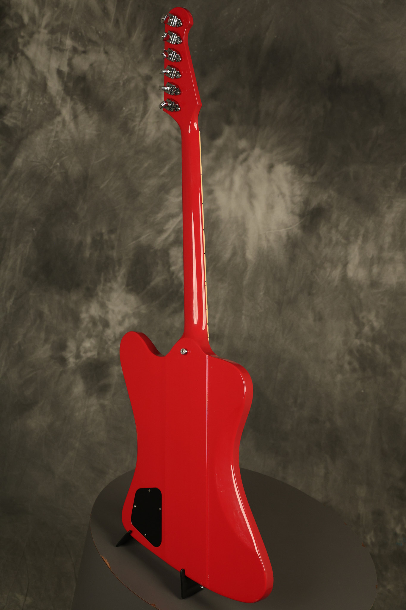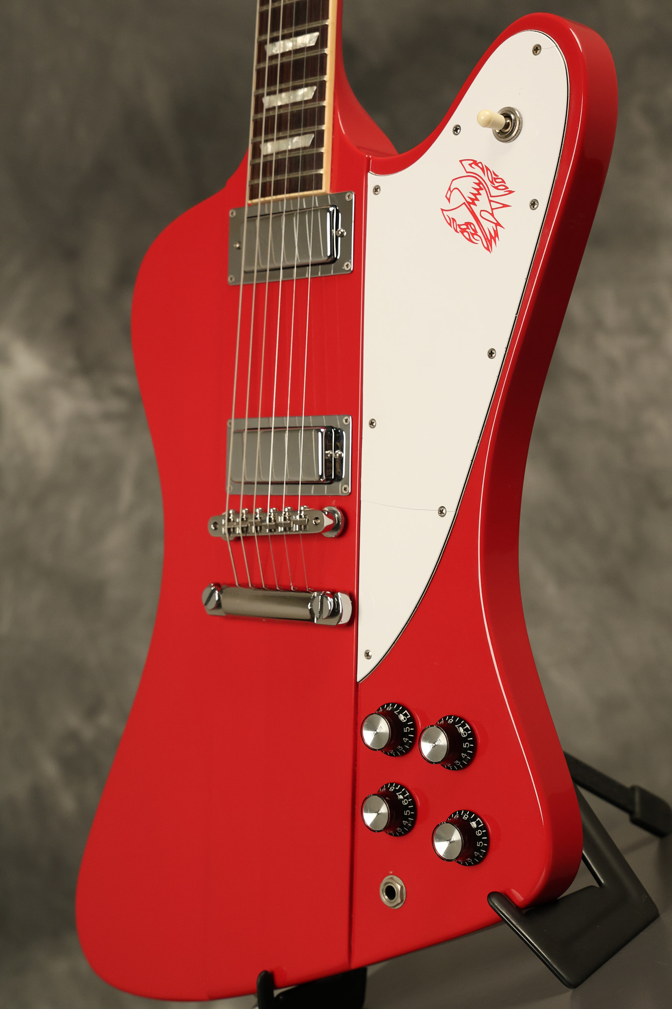 1990 Gibson Firebird V in its original Cardinal Red finish. It has a good playing neck with good frets. It's all original and 100% complete along with its original hardshell case. It's in very good condition with a couple of cracks through the pickguard, some very minor nicks + dings and other very minor cosmetic wear. The guitar itself remains structurally sound with no cracks, breaks or repairs. All electronics work and sound great.