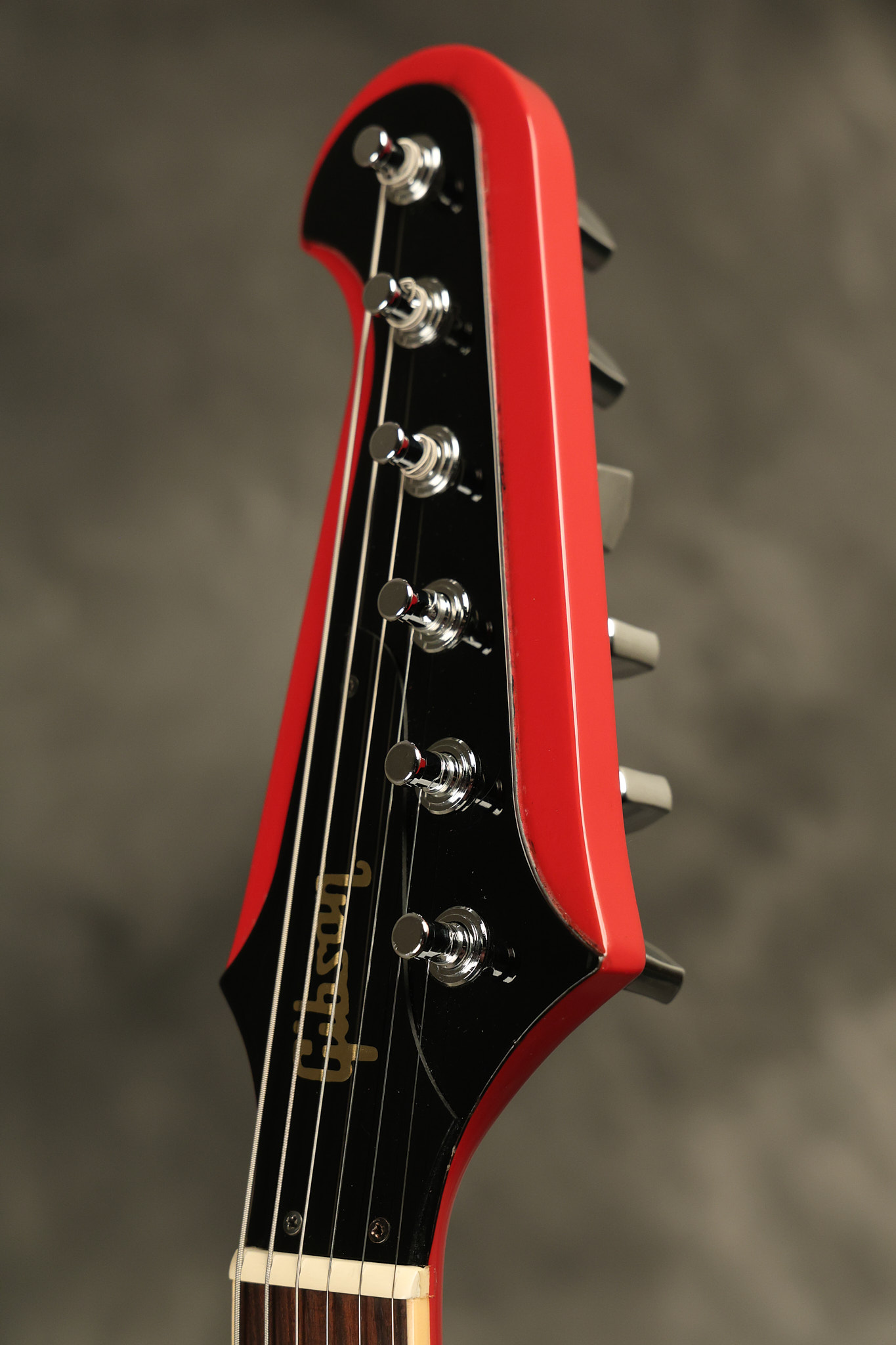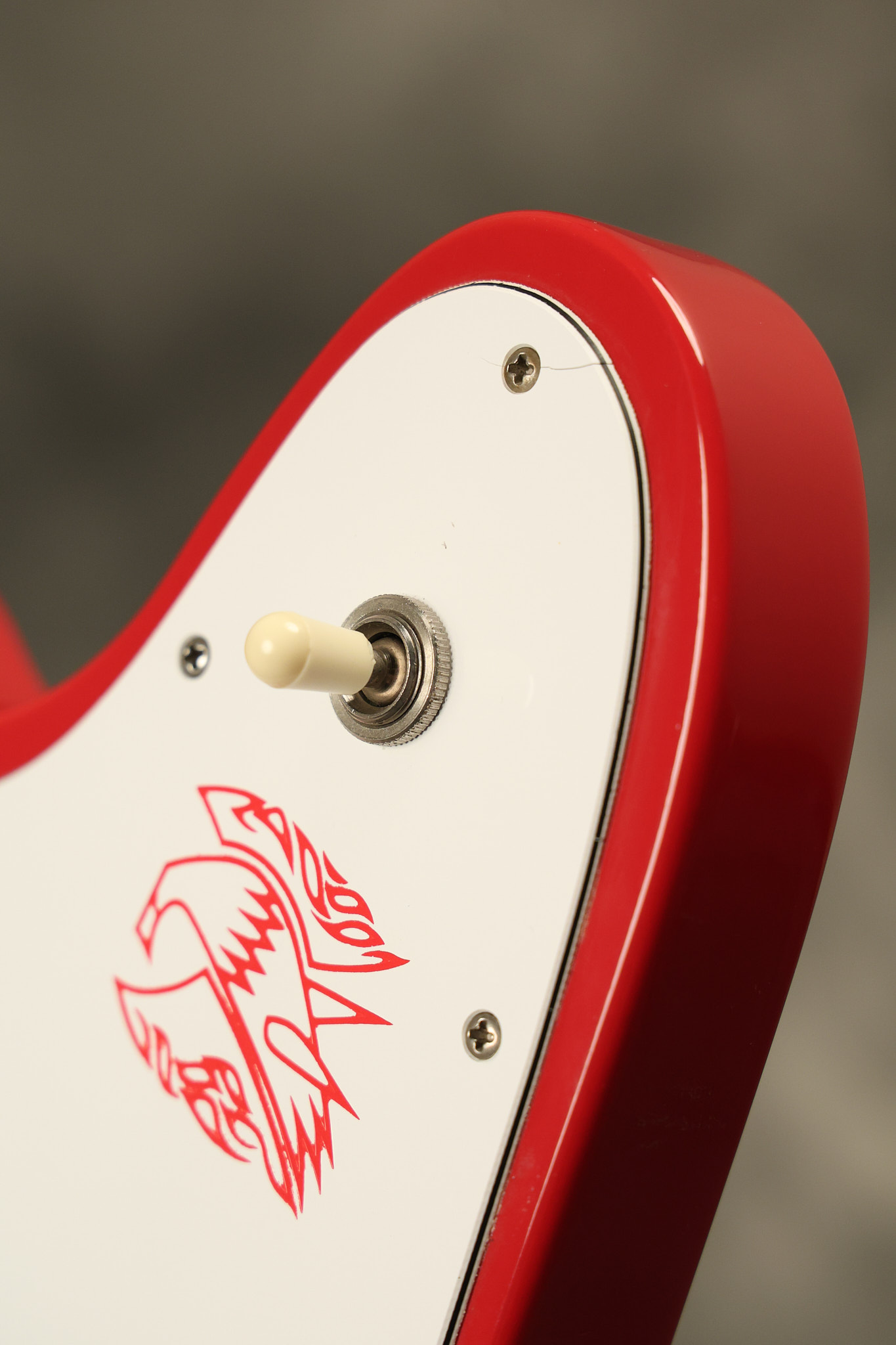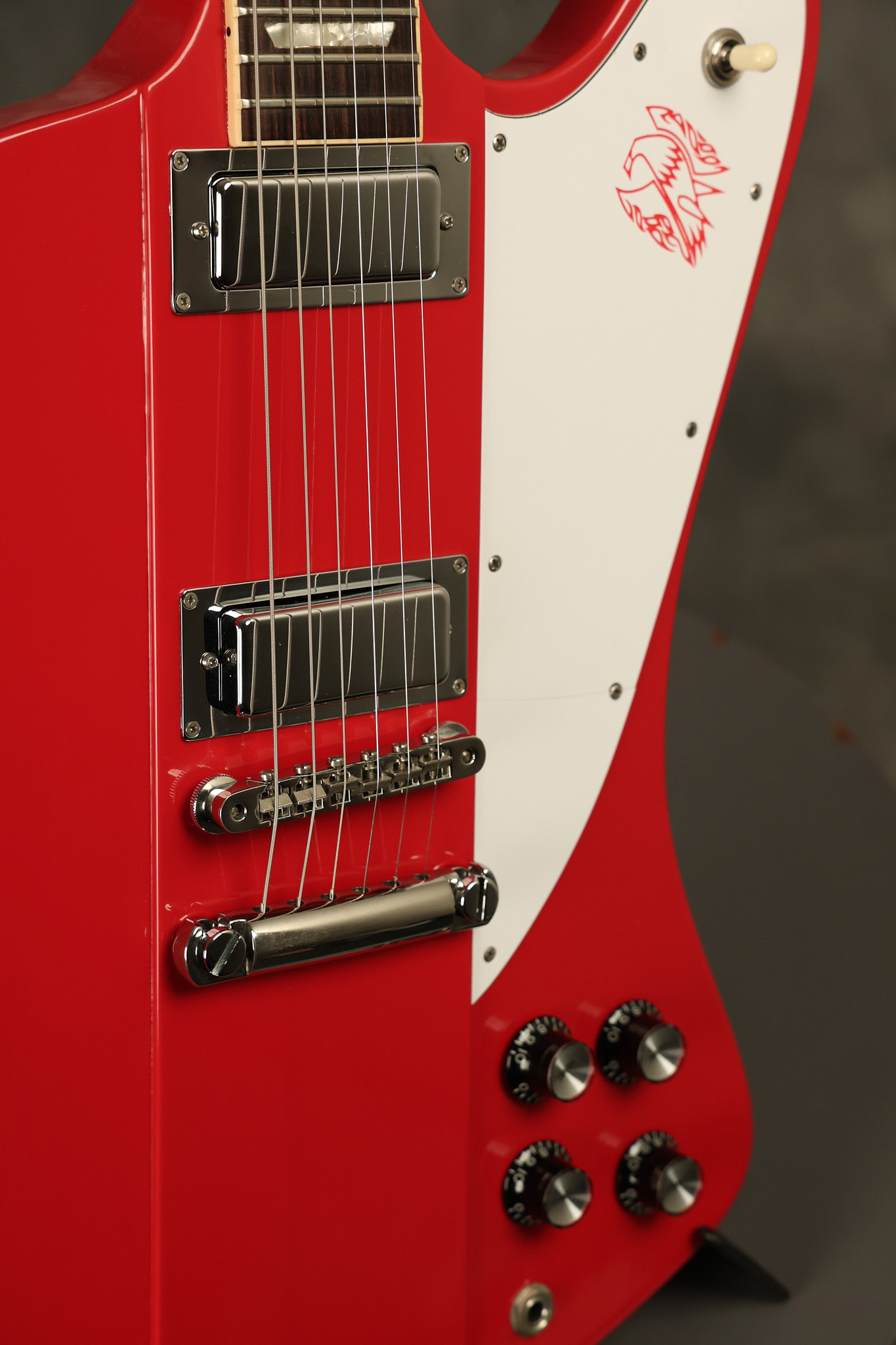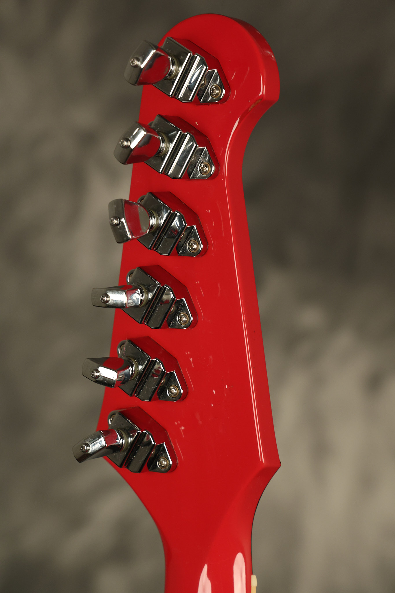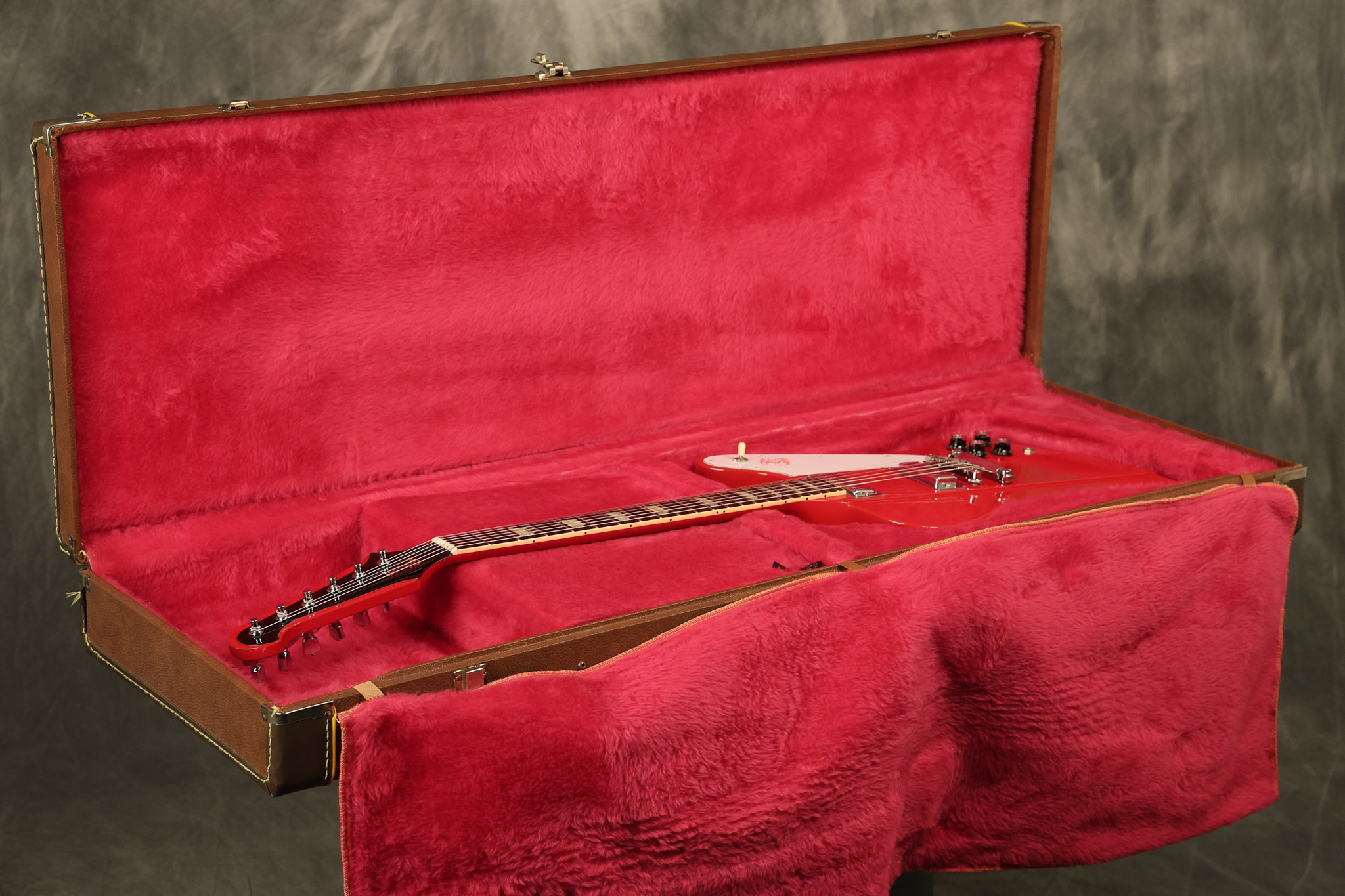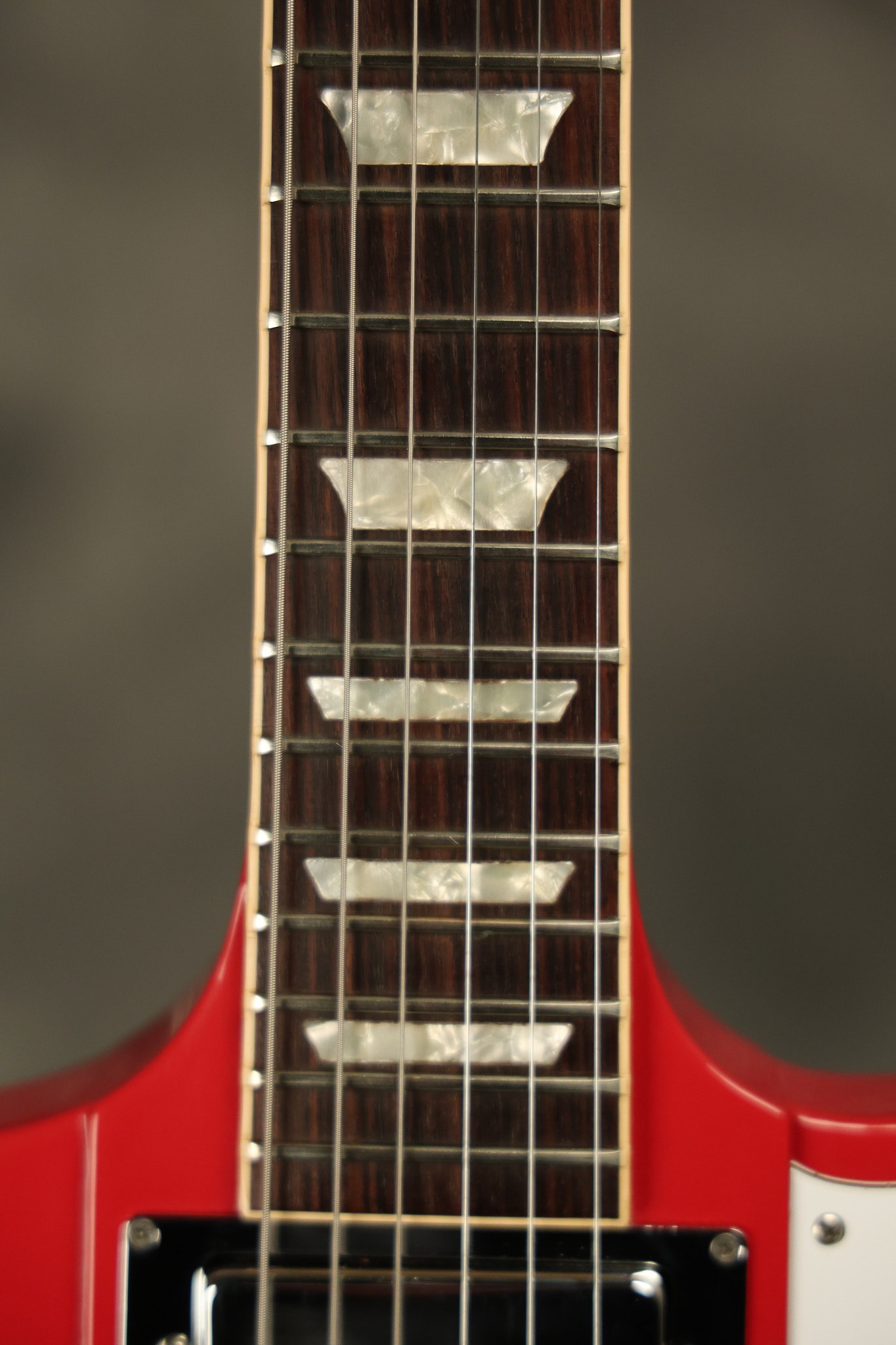 1990 Gibson Firebird V in its original Cardinal Red finish. It has a good playing neck with good frets. It's all original and 100% complete along with its original hardshell case. It's in very good condition with a couple of cracks through the pickguard, some very minor nicks + dings and other very minor cosmetic wear. The guitar itself remains structurally sound with no cracks, breaks or repairs. All electronics work and sound great.