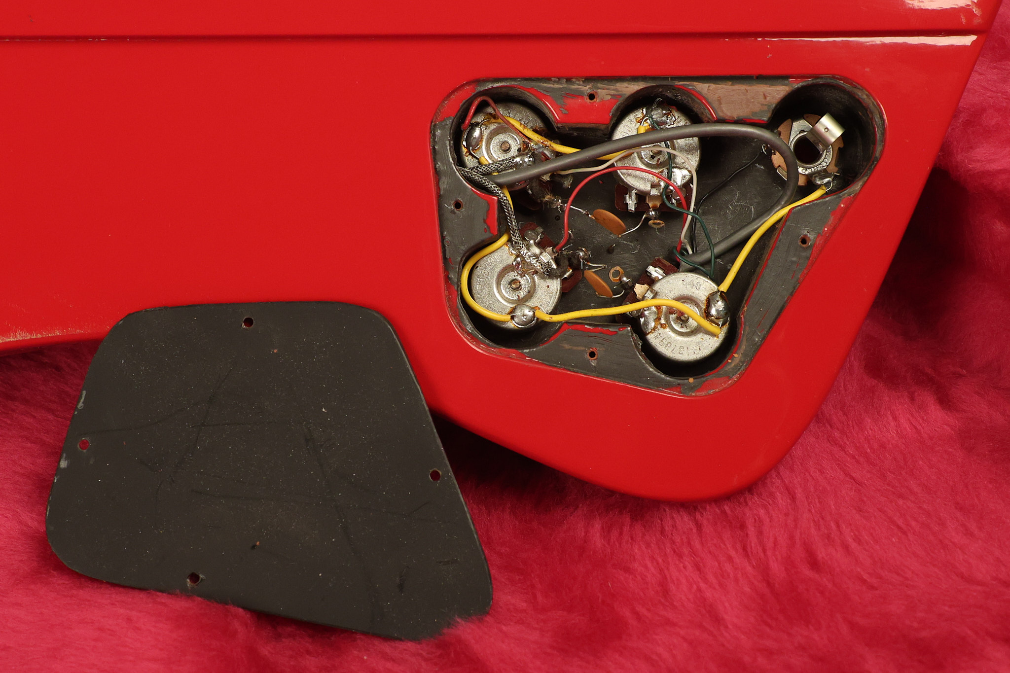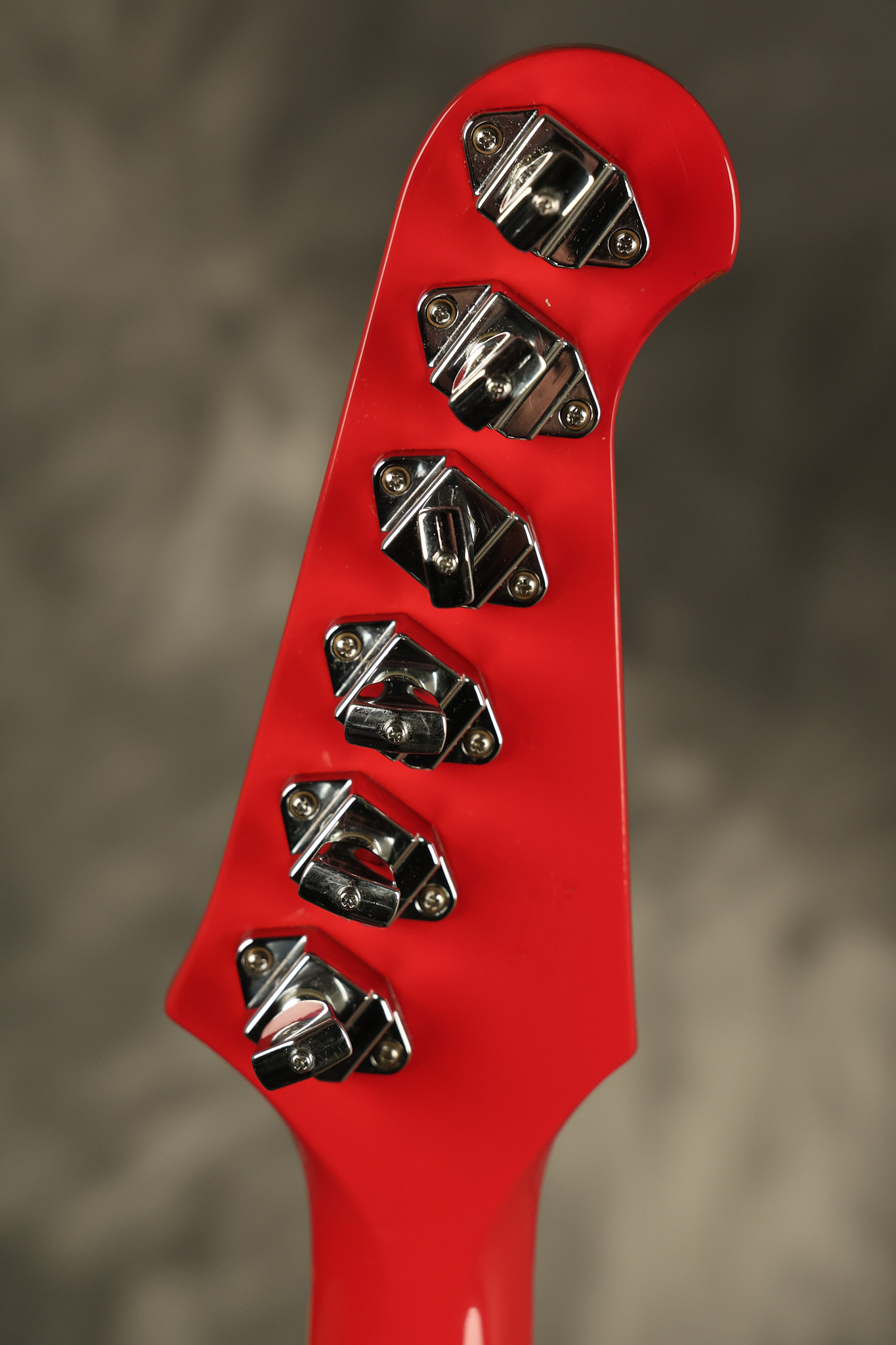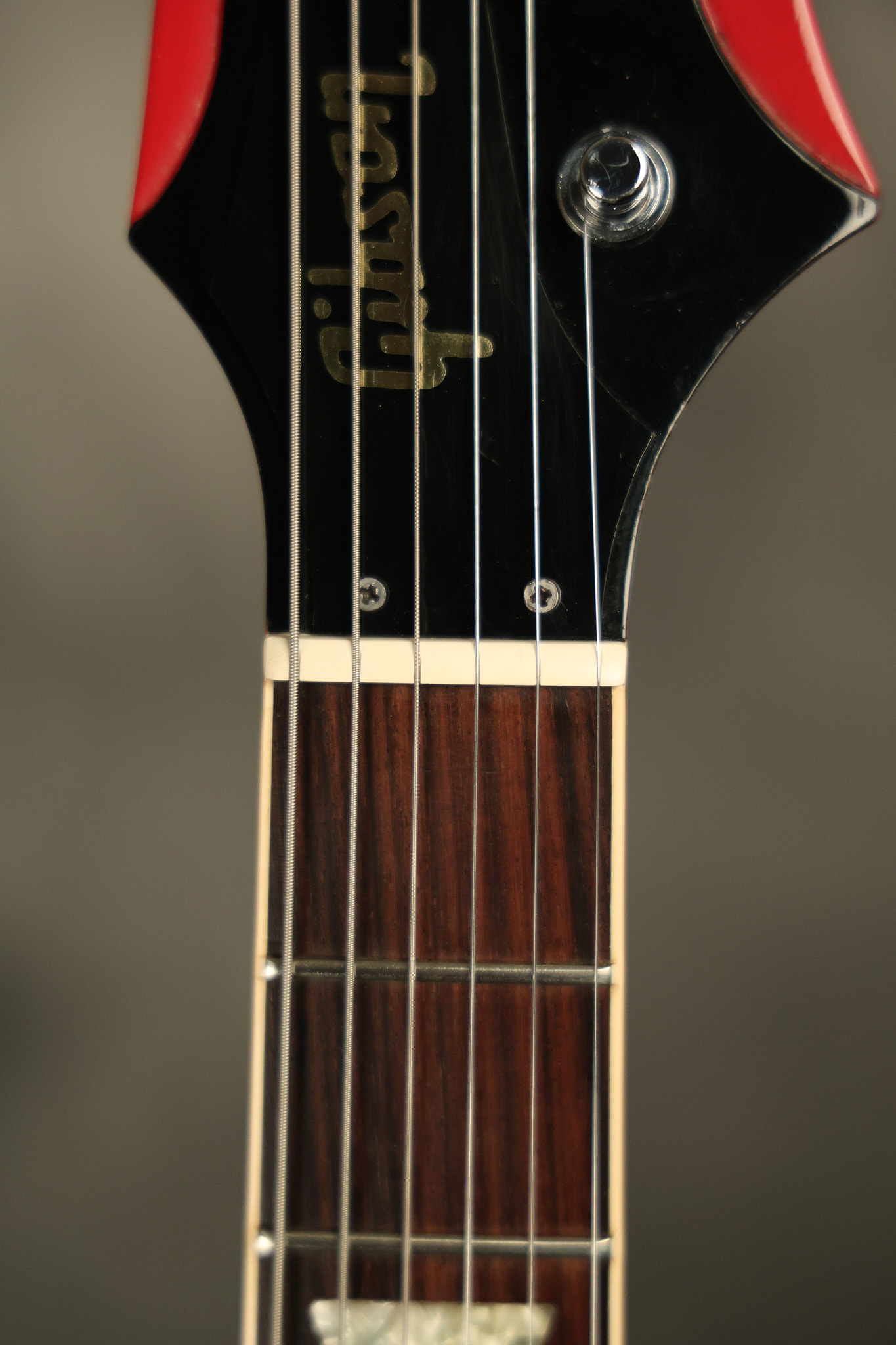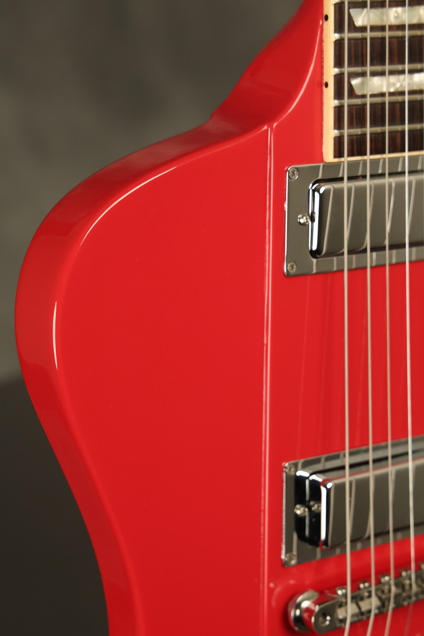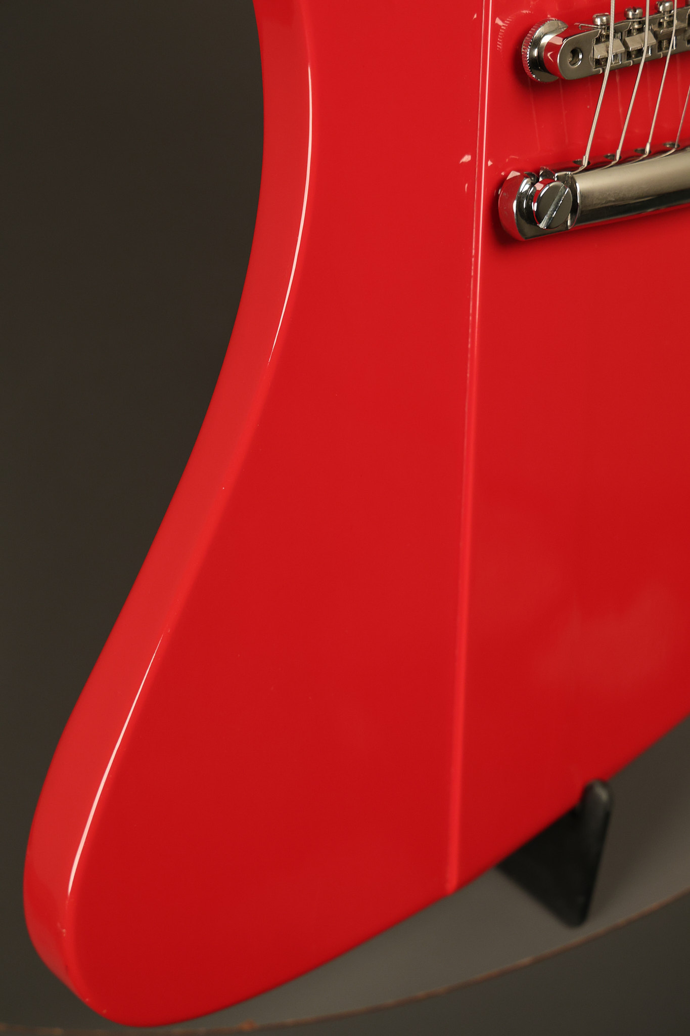 1990 Gibson Firebird V in its original Cardinal Red finish. It has a good playing neck with good frets. It's all original and 100% complete along with its original hardshell case. It's in very good condition with a couple of cracks through the pickguard, some very minor nicks + dings and other very minor cosmetic wear. The guitar itself remains structurally sound with no cracks, breaks or repairs. All electronics work and sound great.