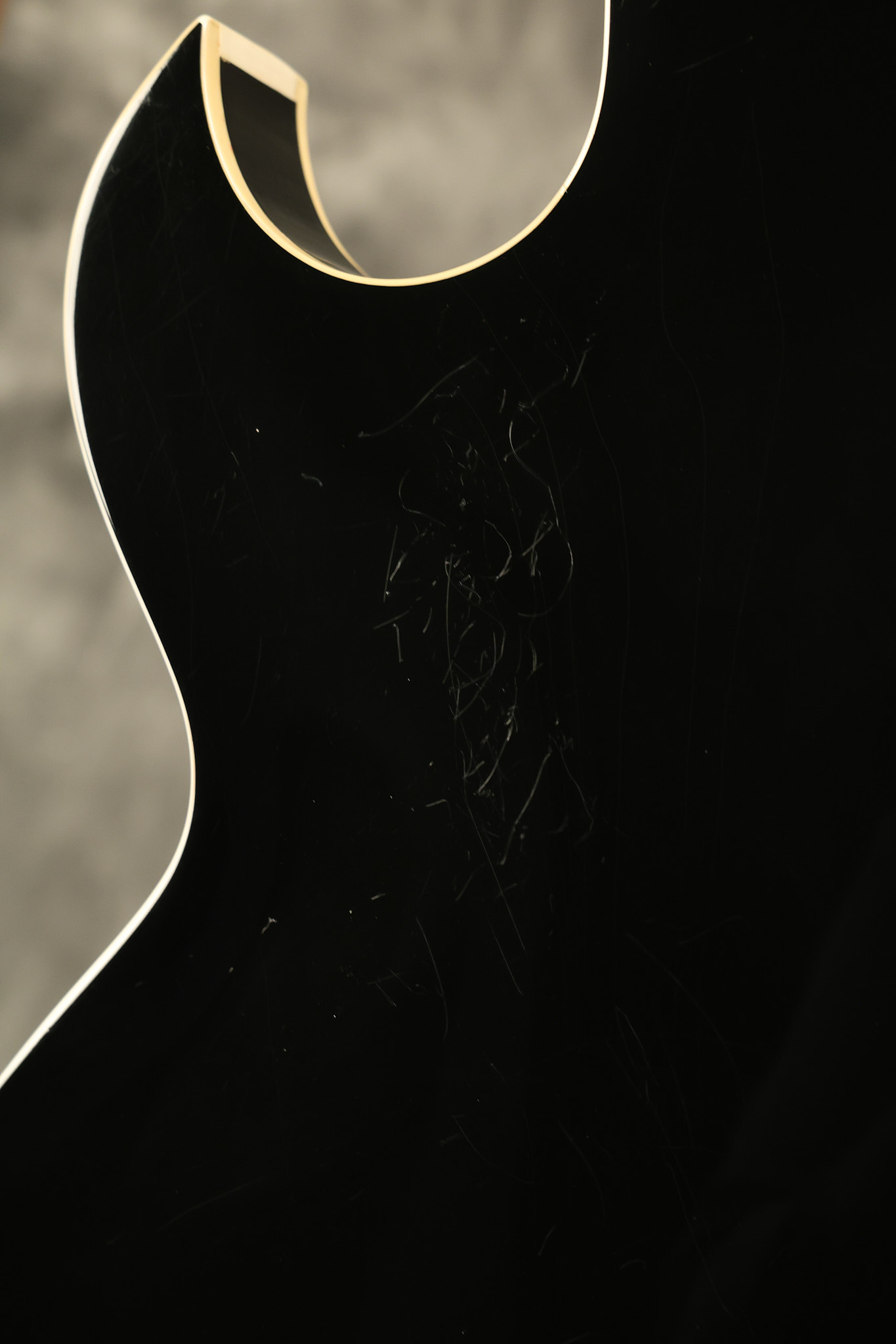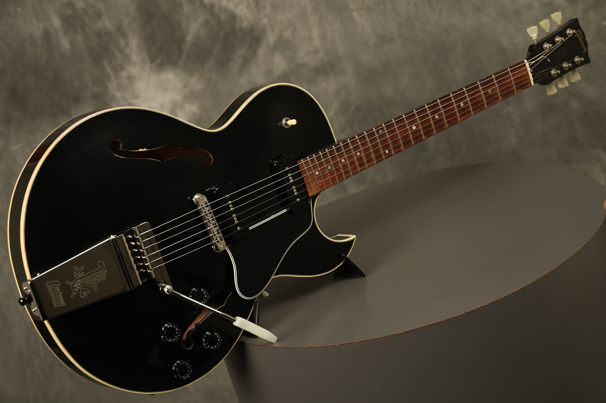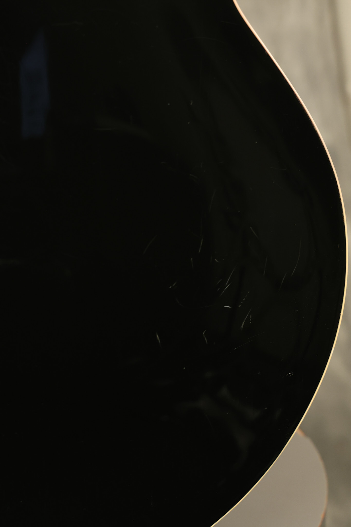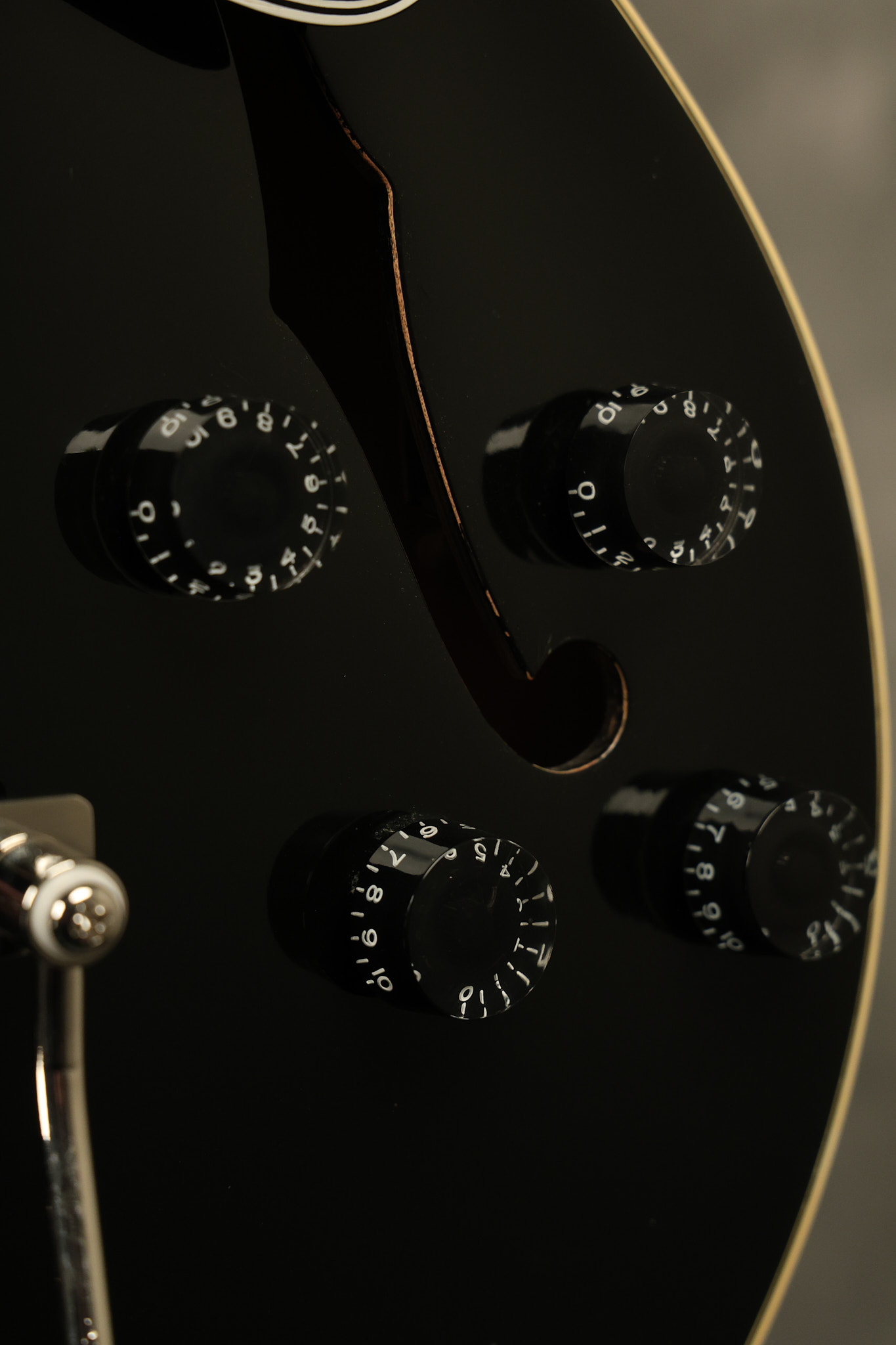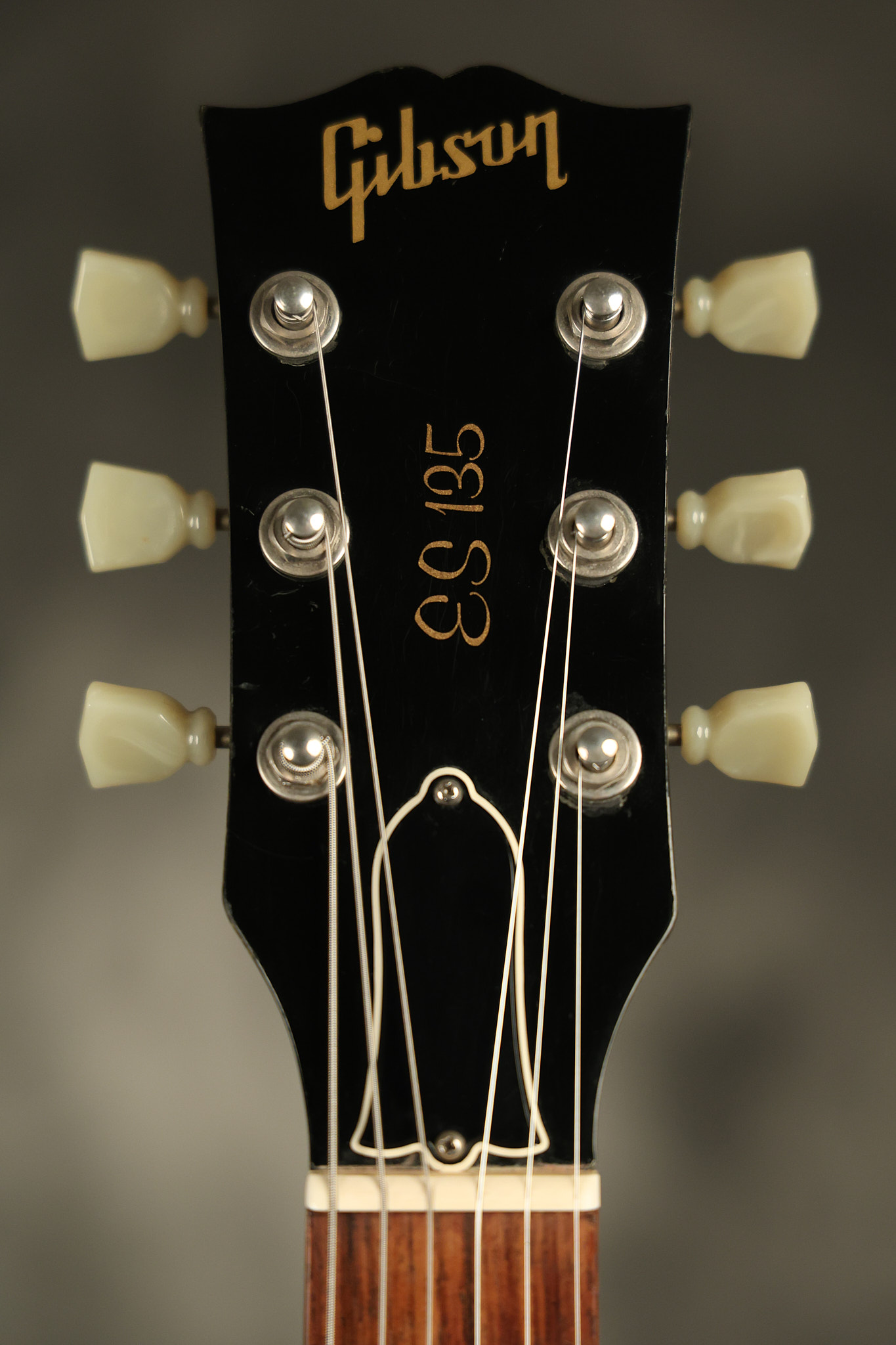 1993 Gibson ES-135 in Black. It has a great playing neck with good frets. It's all original with the exception of the aftermarket "Lyre" style vibrato, a nickel bridge, the knobs, strap buttons and switch tip. A later hardshell case is included. It looks great with some nicks + dings, some small chips in the finish and other minor cosmetic wear. The tip of the vibrato arm had cracked apart and has been glued back together. The guitar itself remains structurally sound with no cracks, breaks or repairs. All electronics work and sound great with its original pair of P-100 pickups.