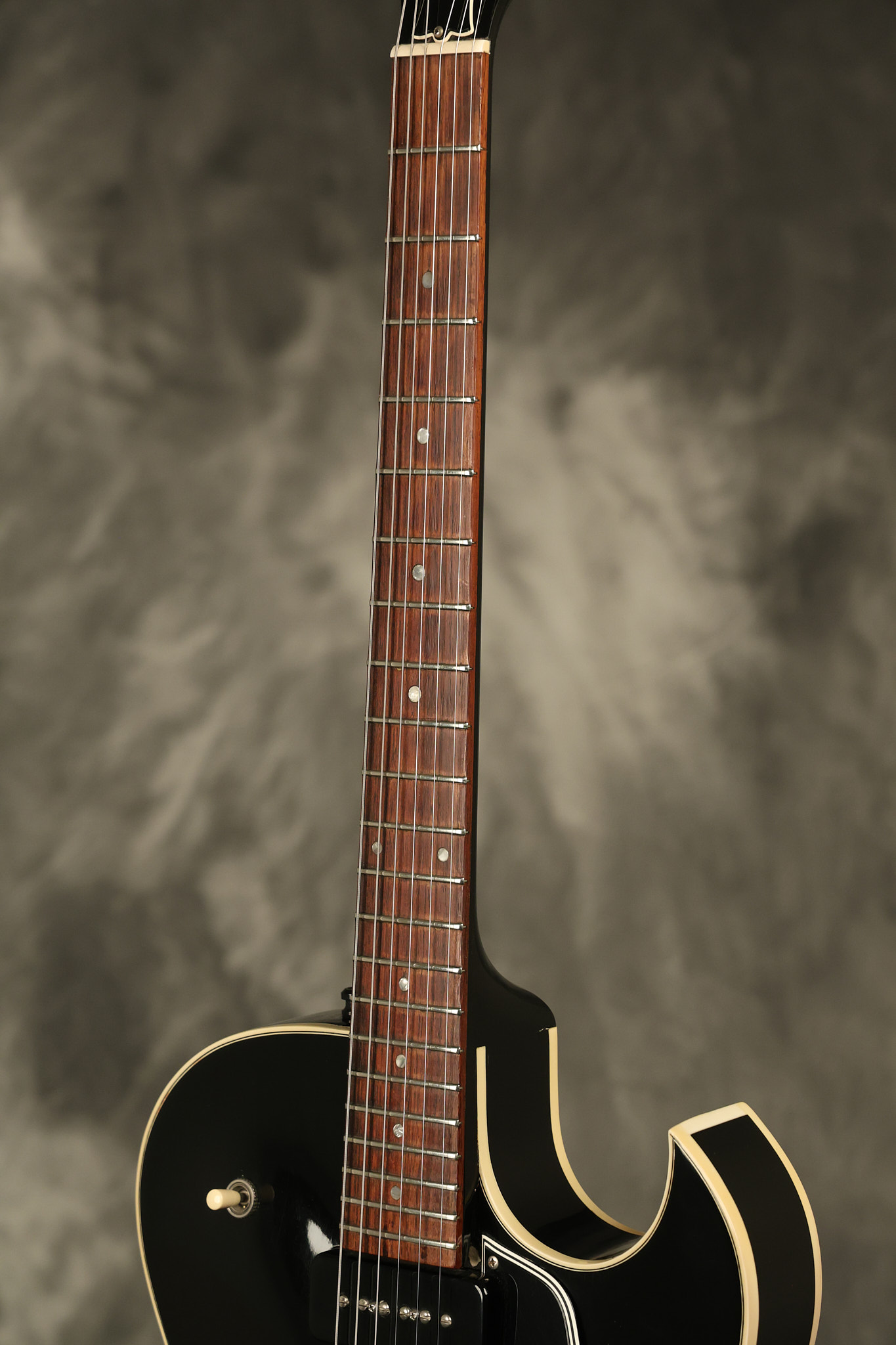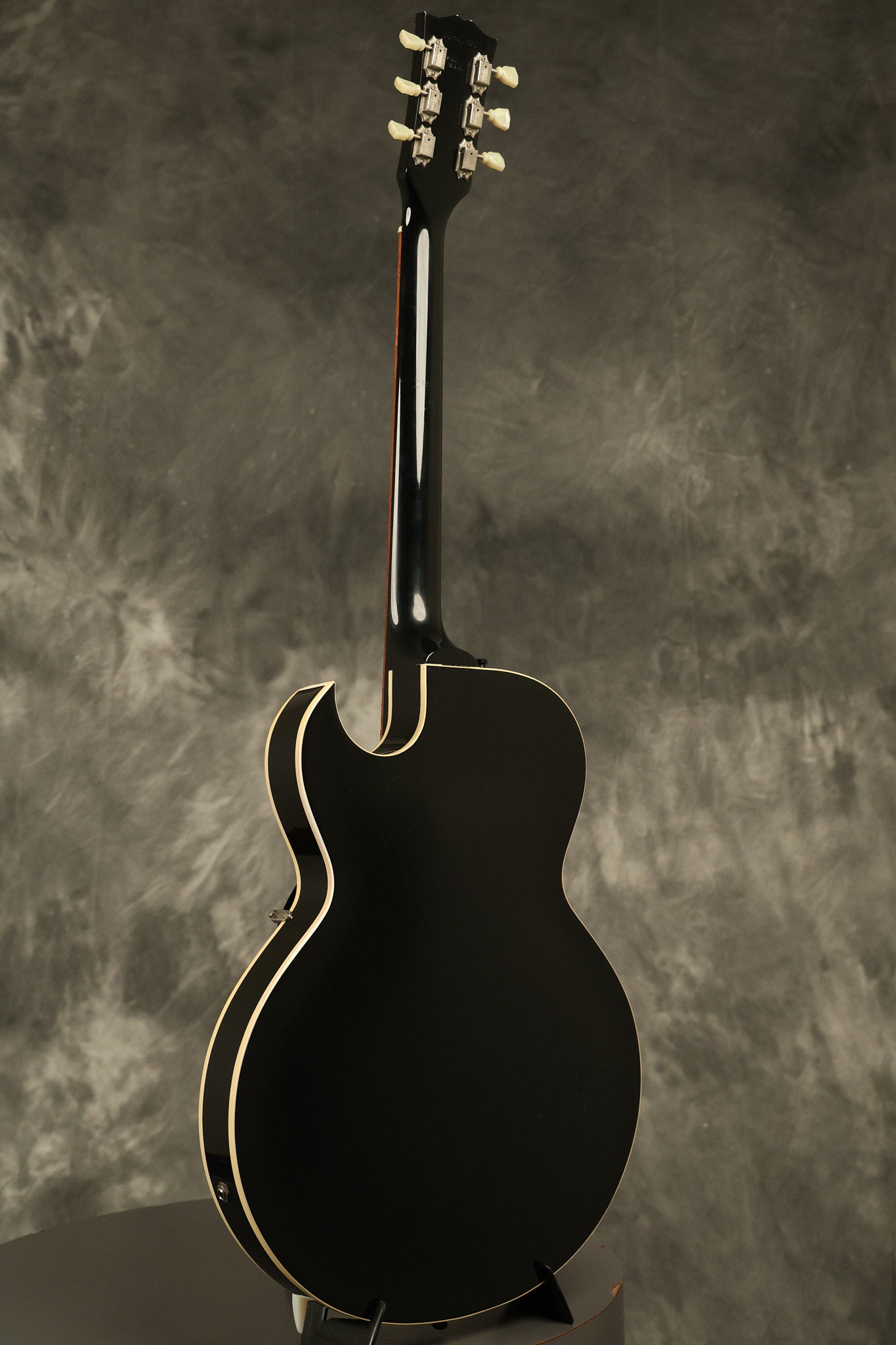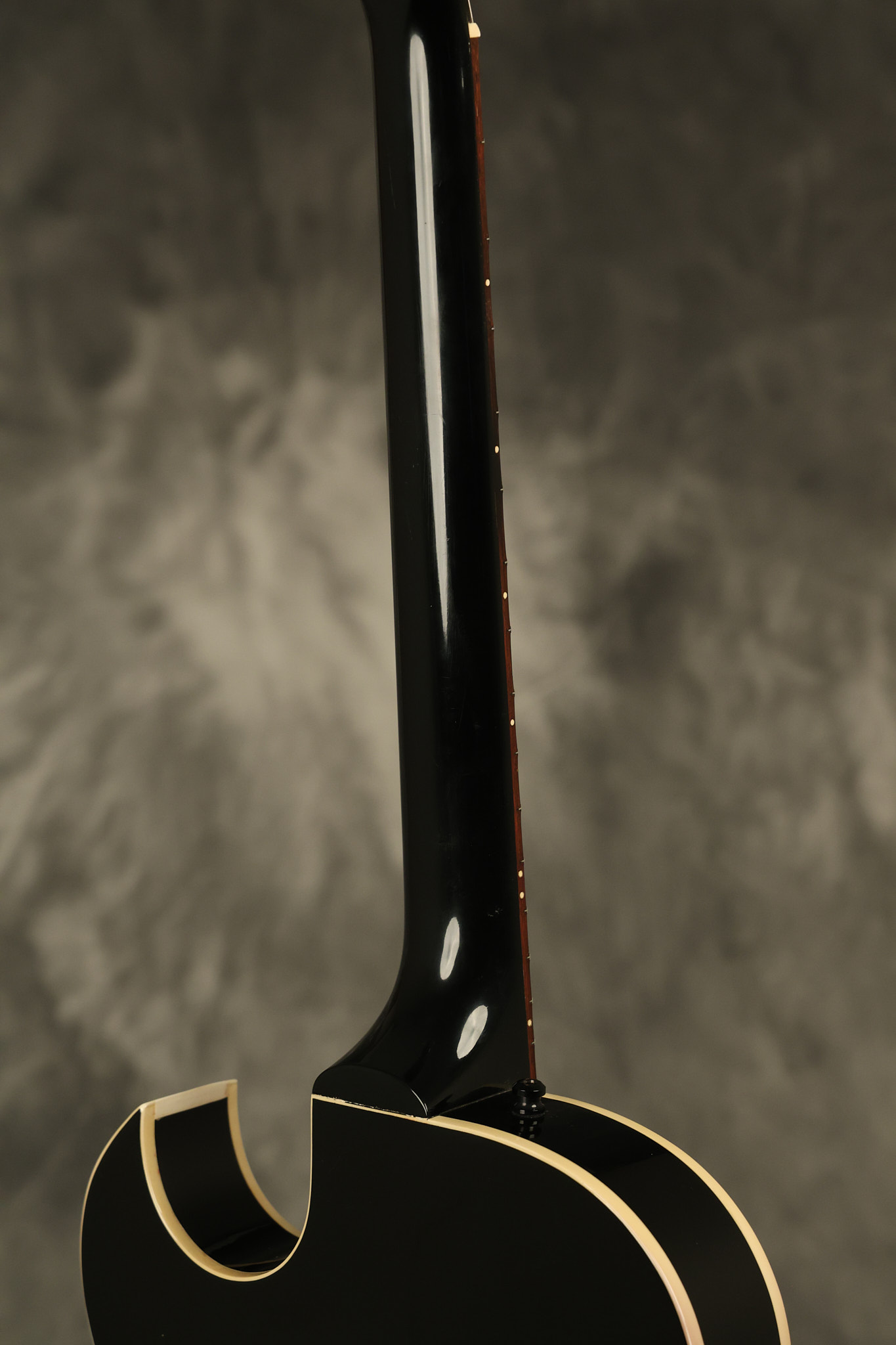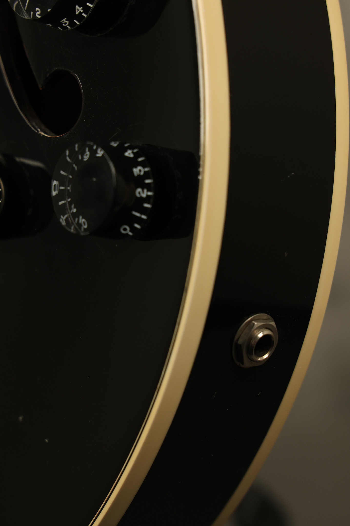 1993 Gibson ES-135 in Black. It has a great playing neck with good frets. It's all original with the exception of the aftermarket "Lyre" style vibrato, a nickel bridge, the knobs, strap buttons and switch tip. A later hardshell case is included. It looks great with some nicks + dings, some small chips in the finish and other minor cosmetic wear. The tip of the vibrato arm had cracked apart and has been glued back together. The guitar itself remains structurally sound with no cracks, breaks or repairs. All electronics work and sound great with its original pair of P-100 pickups.
