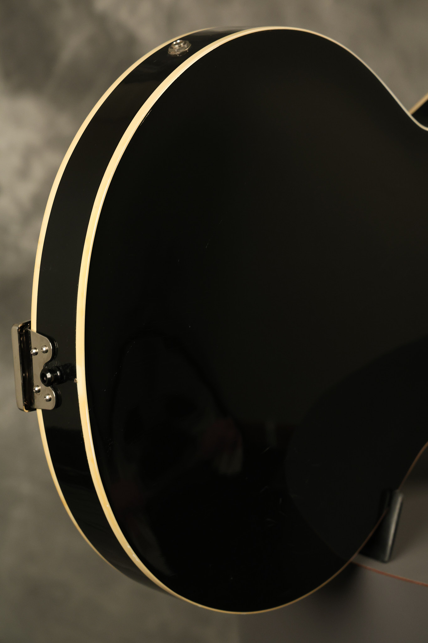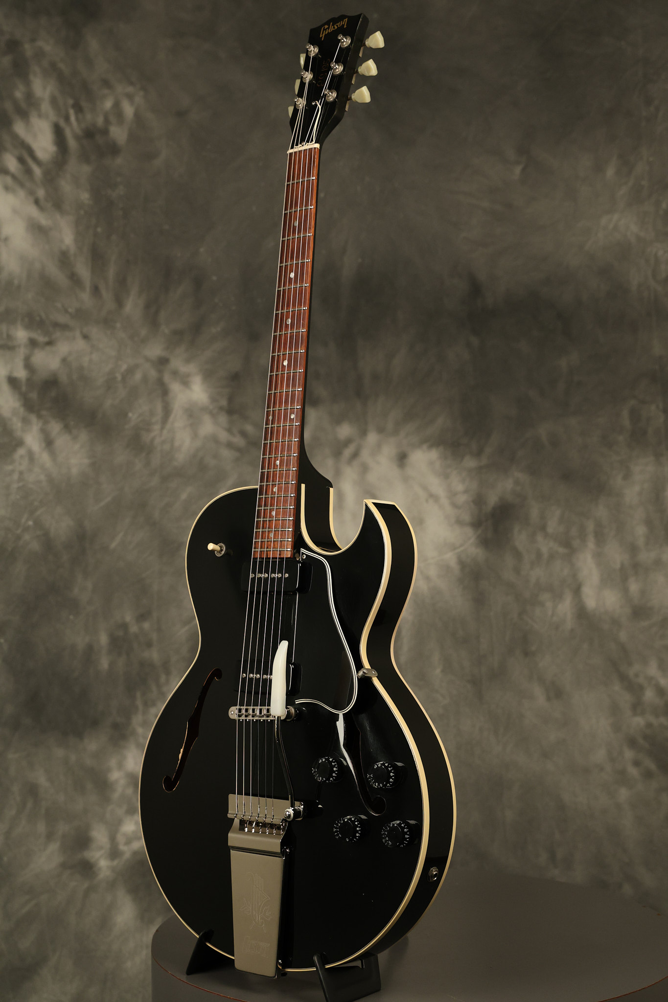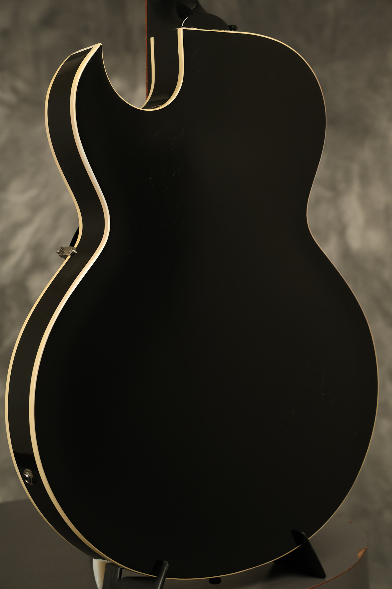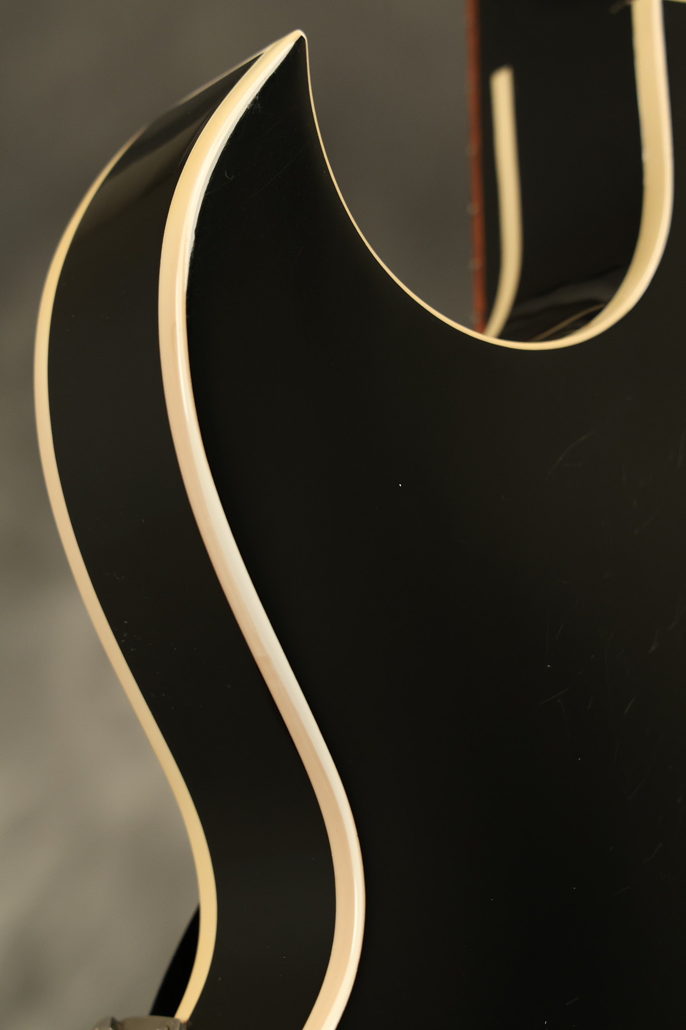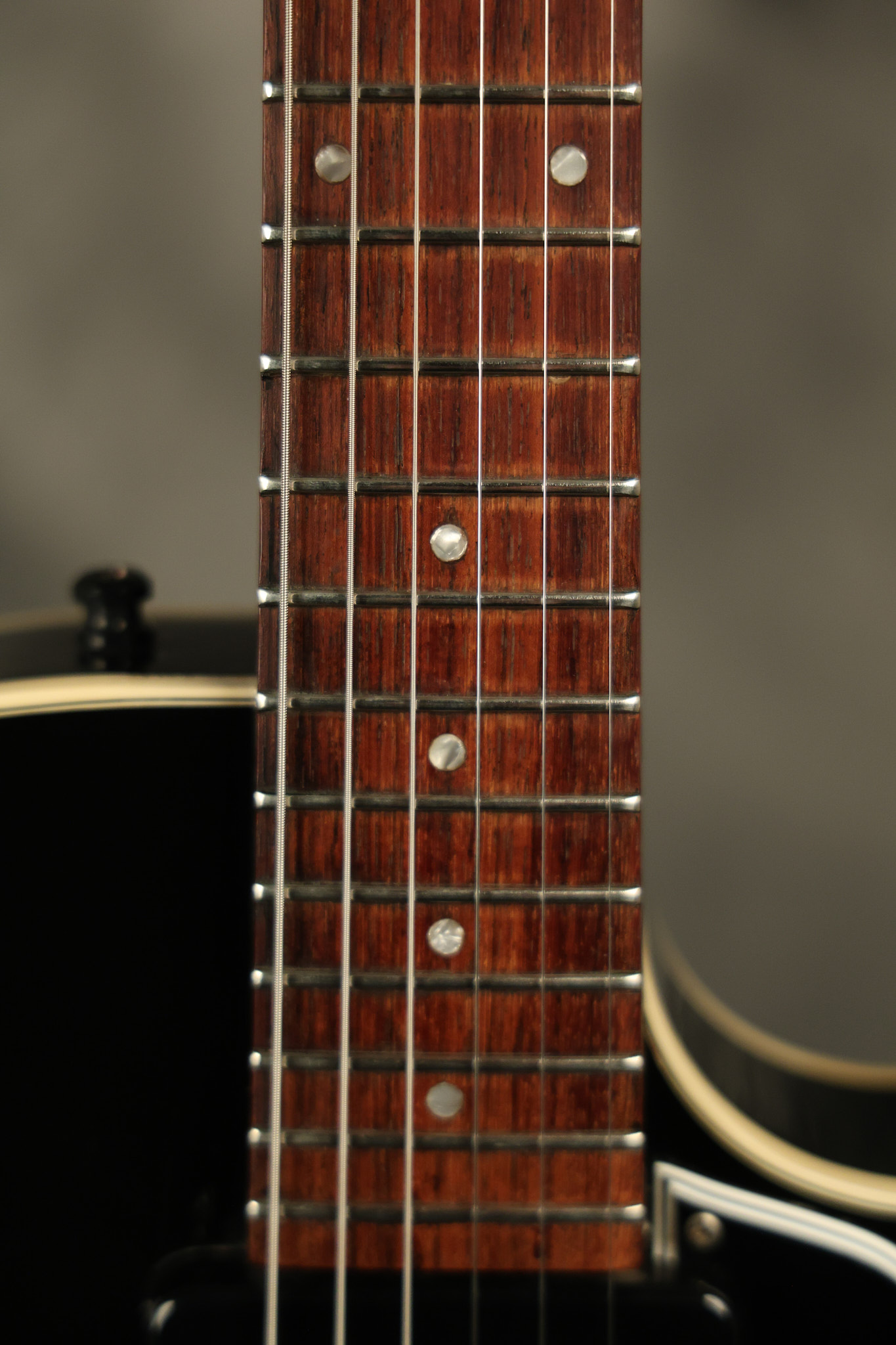 1993 Gibson ES-135 in Black. It has a great playing neck with good frets. It's all original with the exception of the aftermarket "Lyre" style vibrato, a nickel bridge, the knobs, strap buttons and switch tip. A later hardshell case is included. It looks great with some nicks + dings, some small chips in the finish and other minor cosmetic wear. The tip of the vibrato arm had cracked apart and has been glued back together. The guitar itself remains structurally sound with no cracks, breaks or repairs. All electronics work and sound great with its original pair of P-100 pickups.