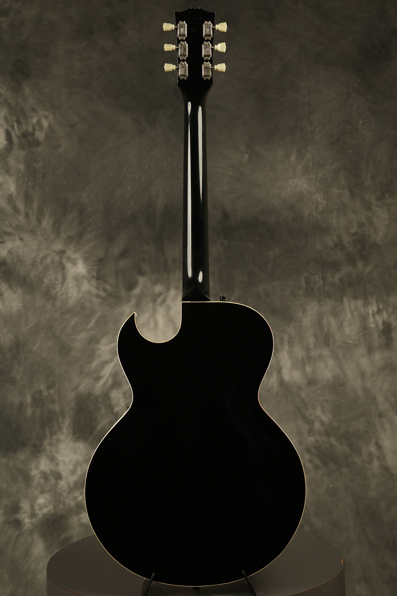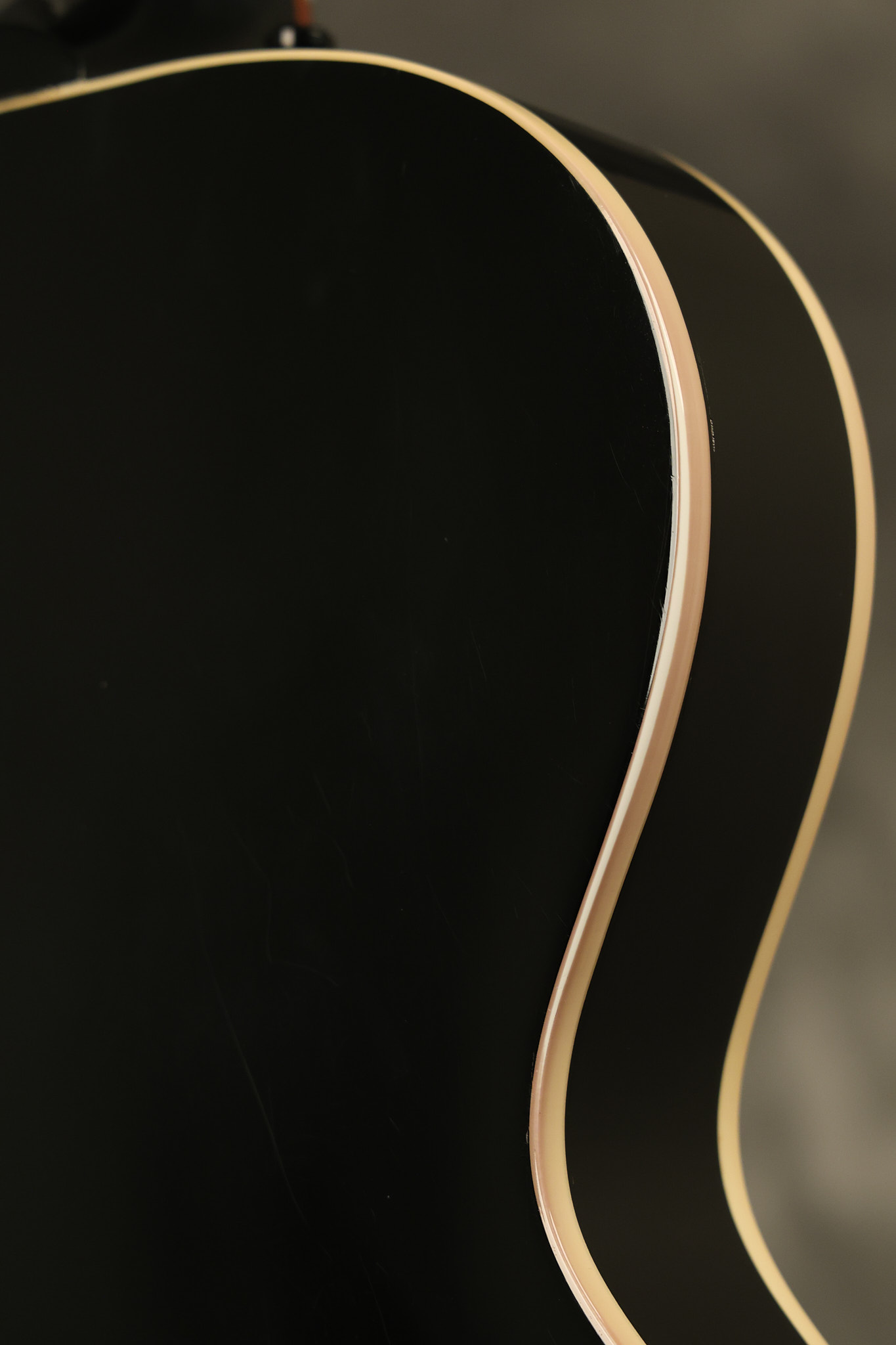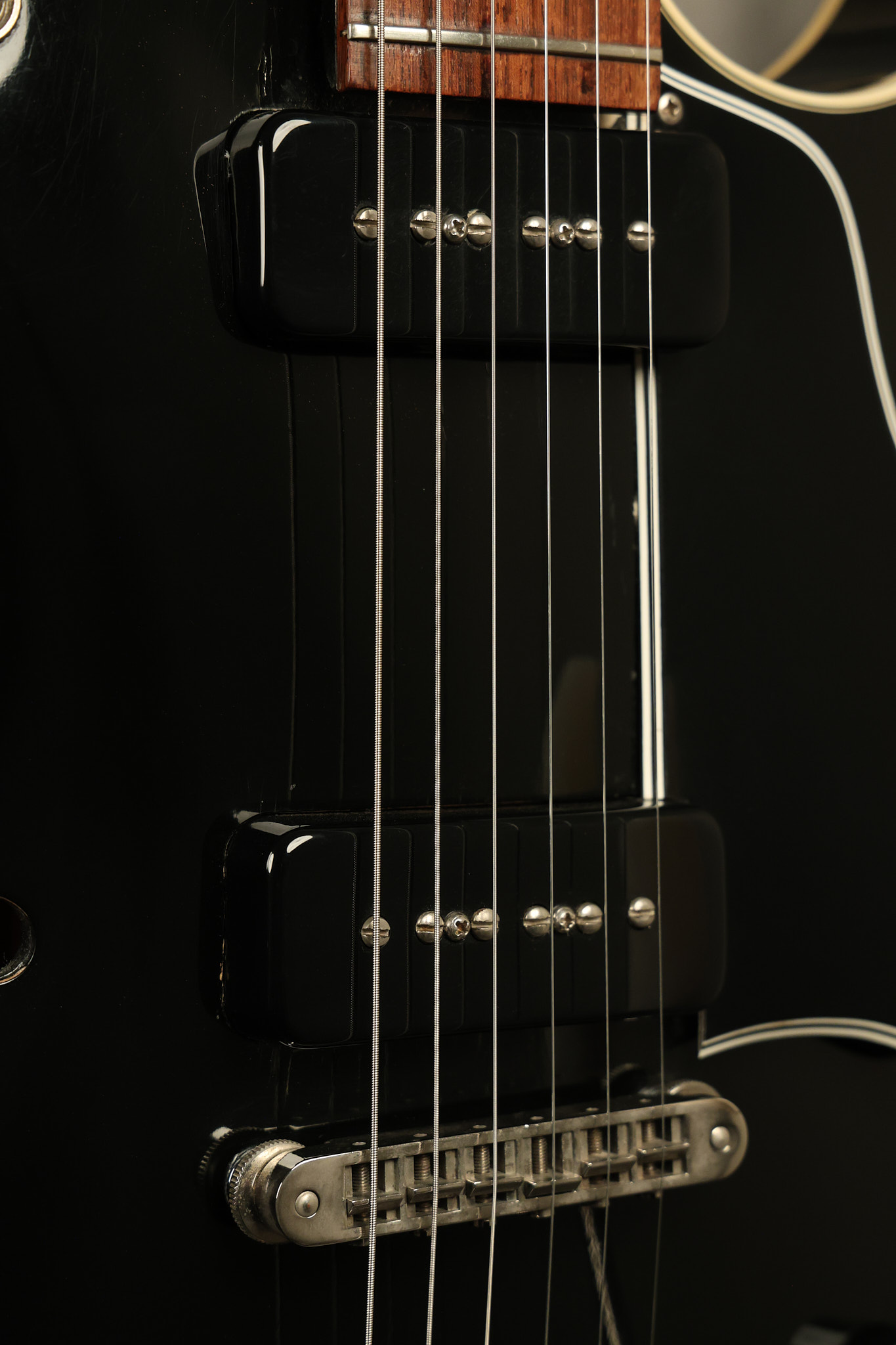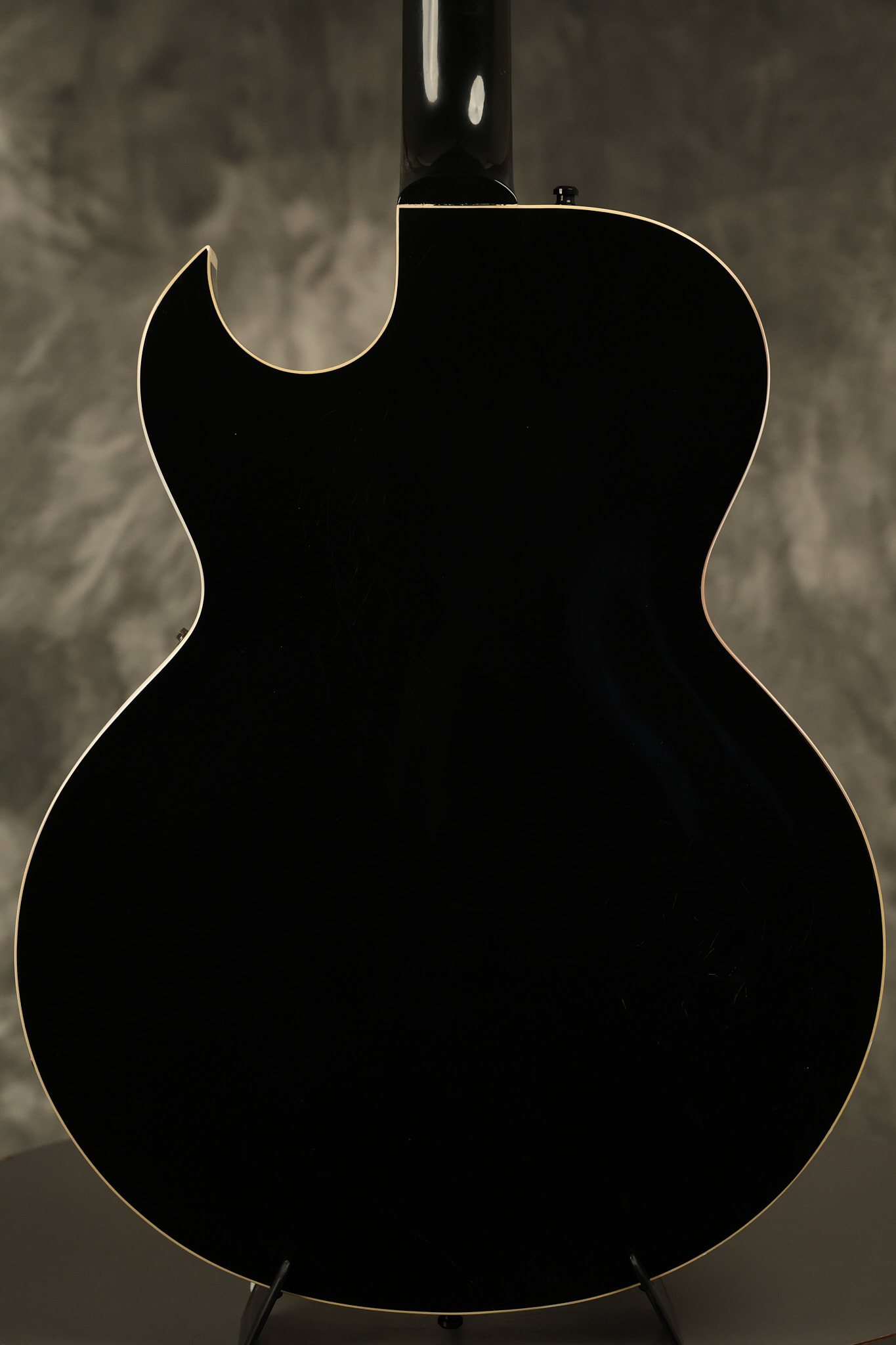 1993 Gibson ES-135 in Black. It has a great playing neck with good frets. It's all original with the exception of the aftermarket "Lyre" style vibrato, a nickel bridge, the knobs, strap buttons and switch tip. A later hardshell case is included. It looks great with some nicks + dings, some small chips in the finish and other minor cosmetic wear. The tip of the vibrato arm had cracked apart and has been glued back together. The guitar itself remains structurally sound with no cracks, breaks or repairs. All electronics work and sound great with its original pair of P-100 pickups.