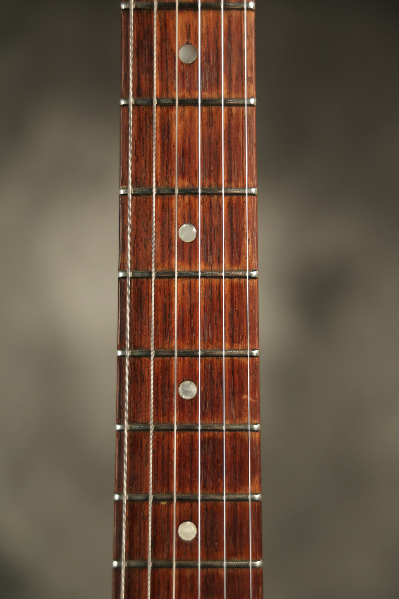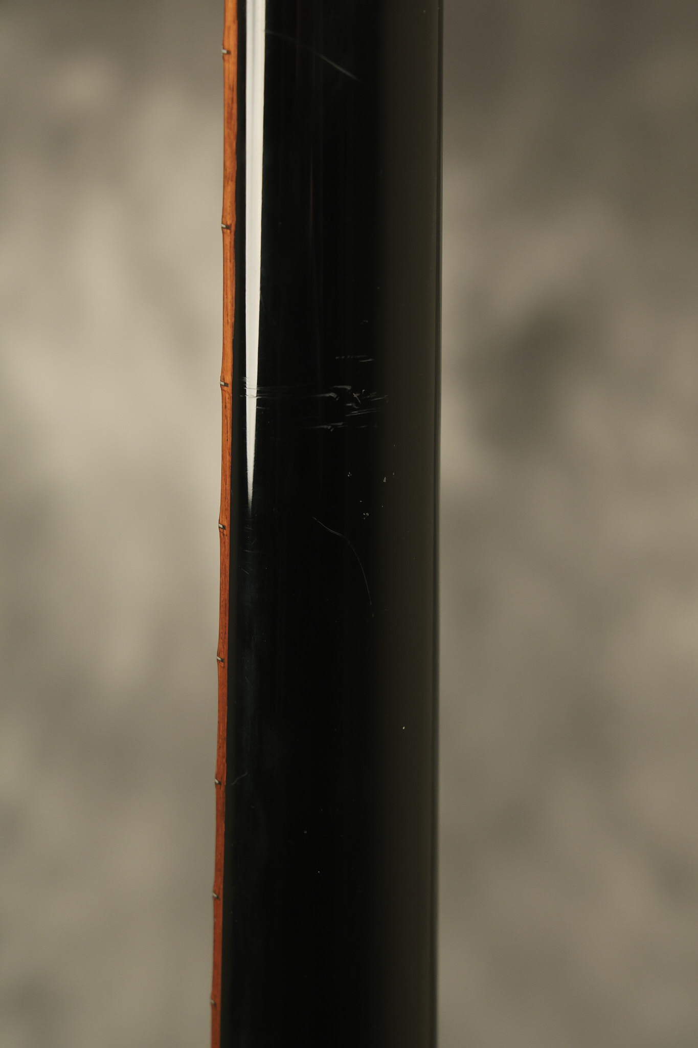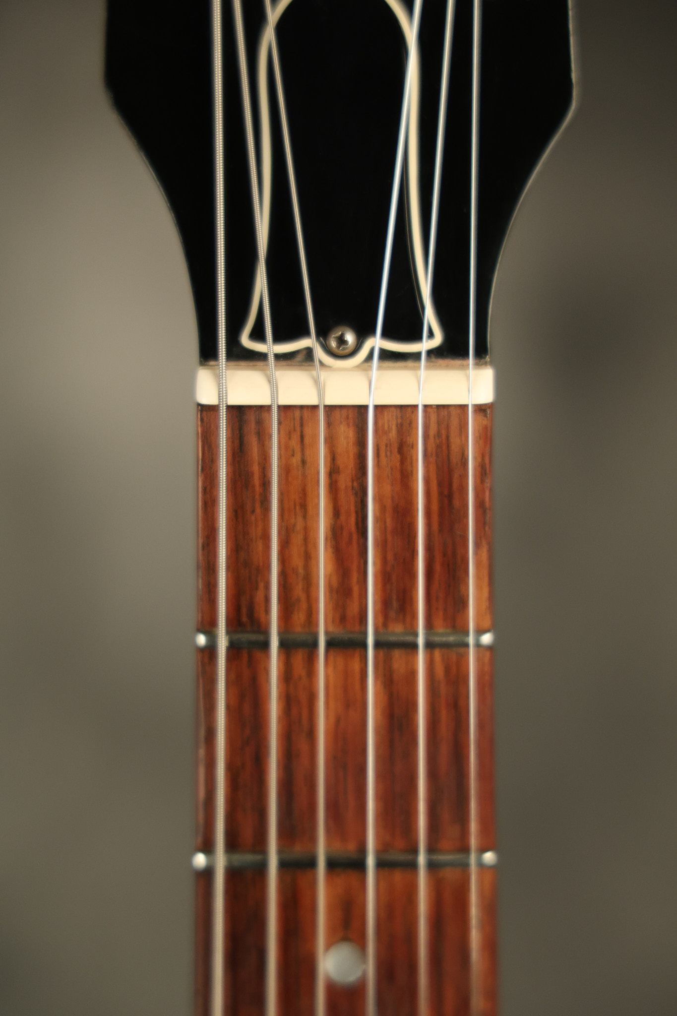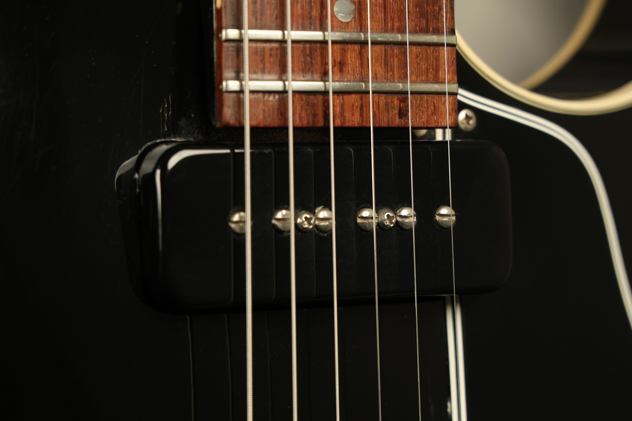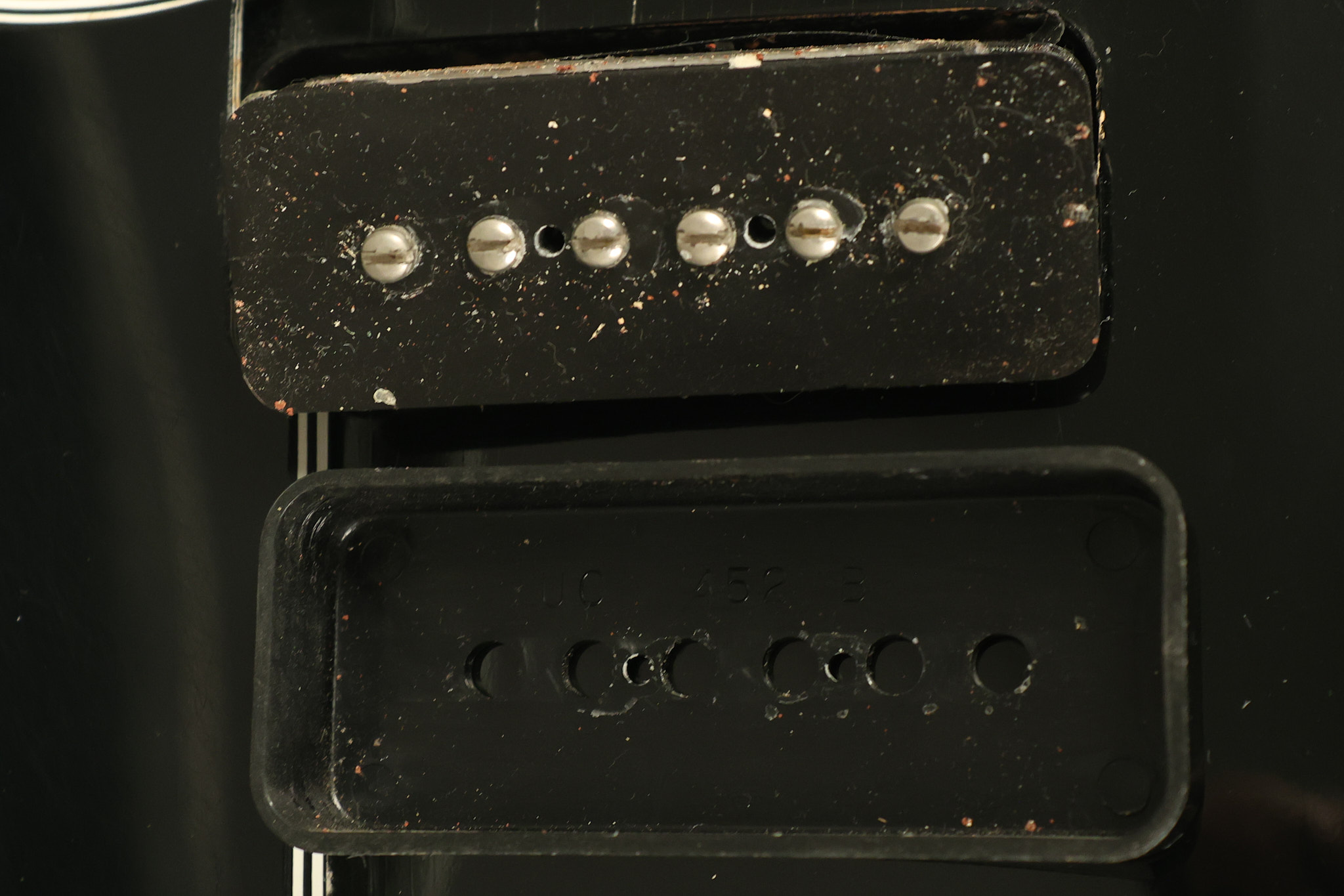 1993 Gibson ES-135 in Black. It has a great playing neck with good frets. It's all original with the exception of the aftermarket "Lyre" style vibrato, a nickel bridge, the knobs, strap buttons and switch tip. A later hardshell case is included. It looks great with some nicks + dings, some small chips in the finish and other minor cosmetic wear. The tip of the vibrato arm had cracked apart and has been glued back together. The guitar itself remains structurally sound with no cracks, breaks or repairs. All electronics work and sound great with its original pair of P-100 pickups.