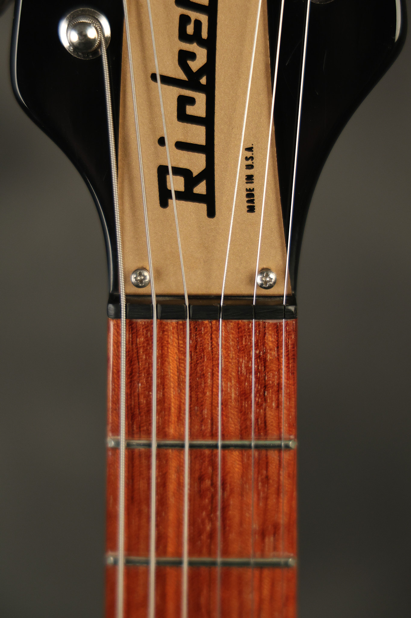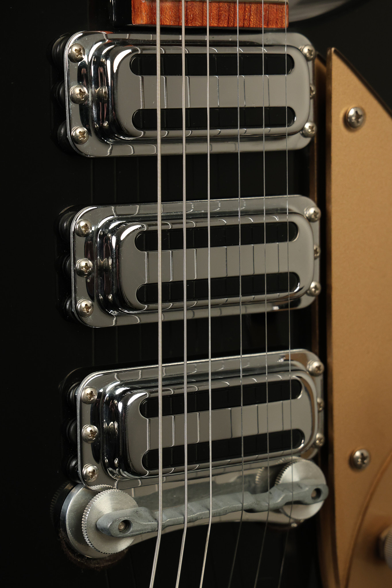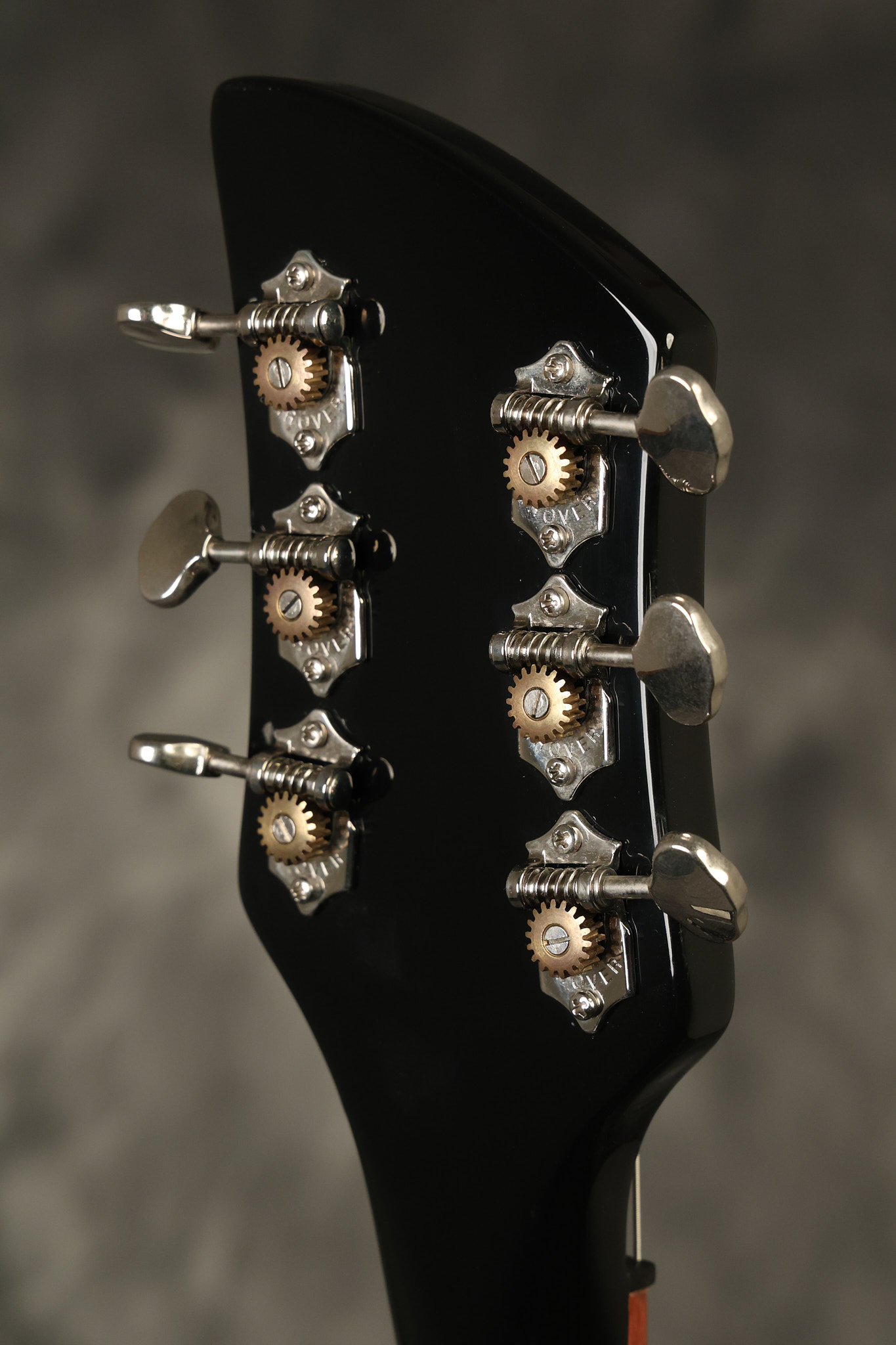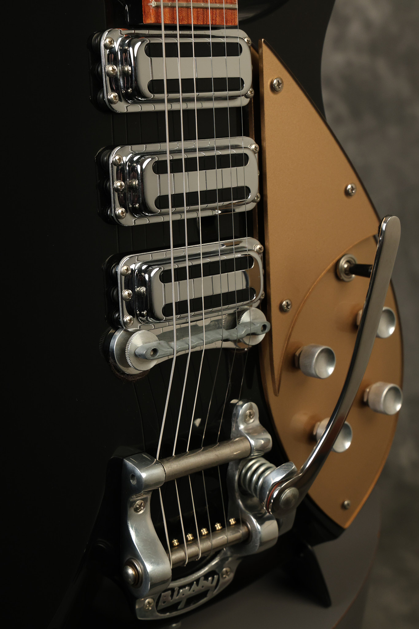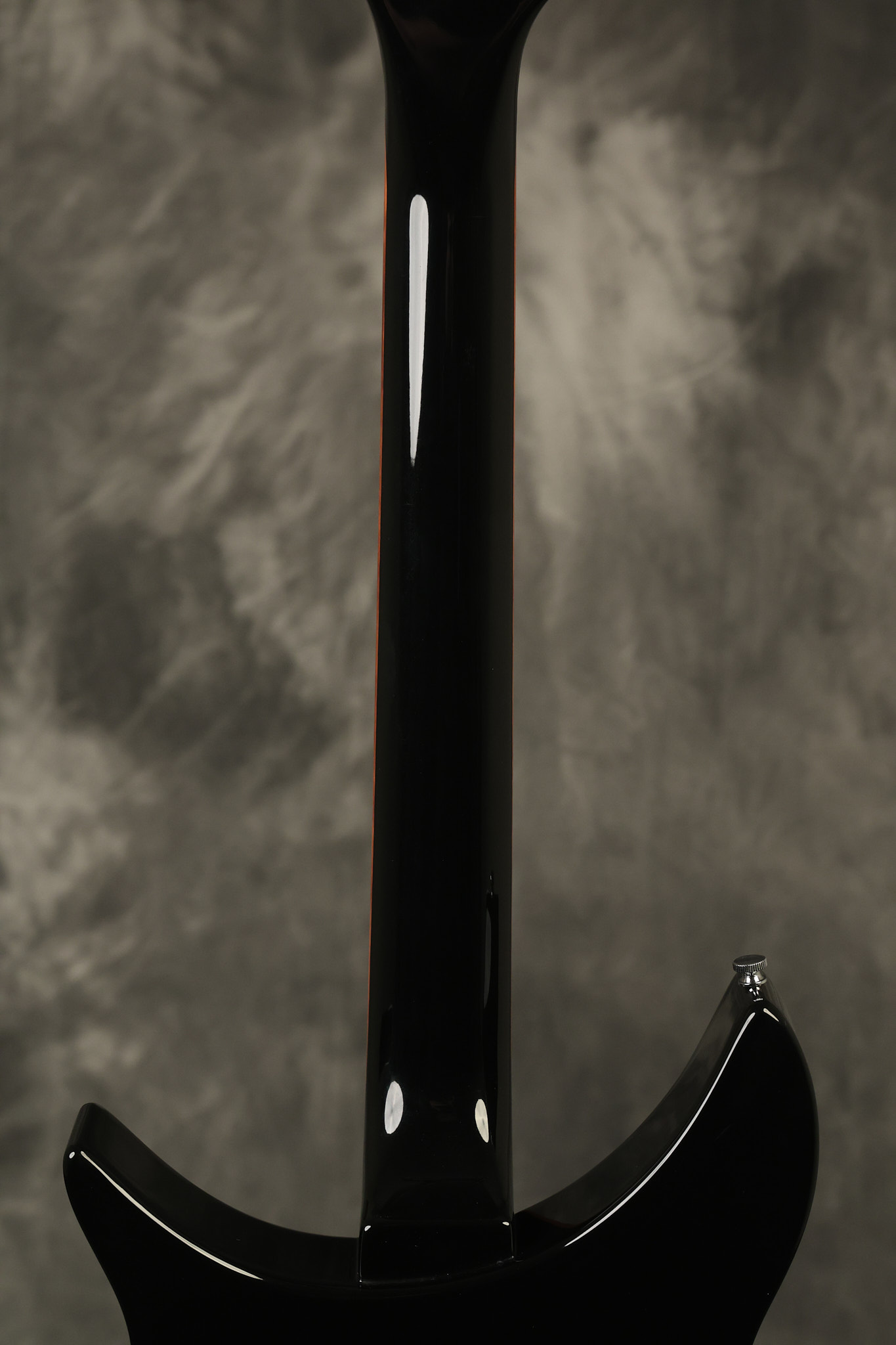 1994 Rickenbacker 325V59 in Jetglo that has had parts changed (Burns volume and tone knobs, Sorkin bridge, and open back Grover tuners) to resemble the specs of John Lennon's 1958 Rickenbacker model 325, with the exception of the upper portion of the pickguard being left on. It has a great playing neck with great frets. It's all original and 100% complete along with its original hardshell case. It's in EXCELLENT condition with only very little extremely minor surface wear. Pads were placed underneath the bridge to help protect the finish. Everything remains structurally sound with no cracks, breaks or repairs. All electronics work and sound great.