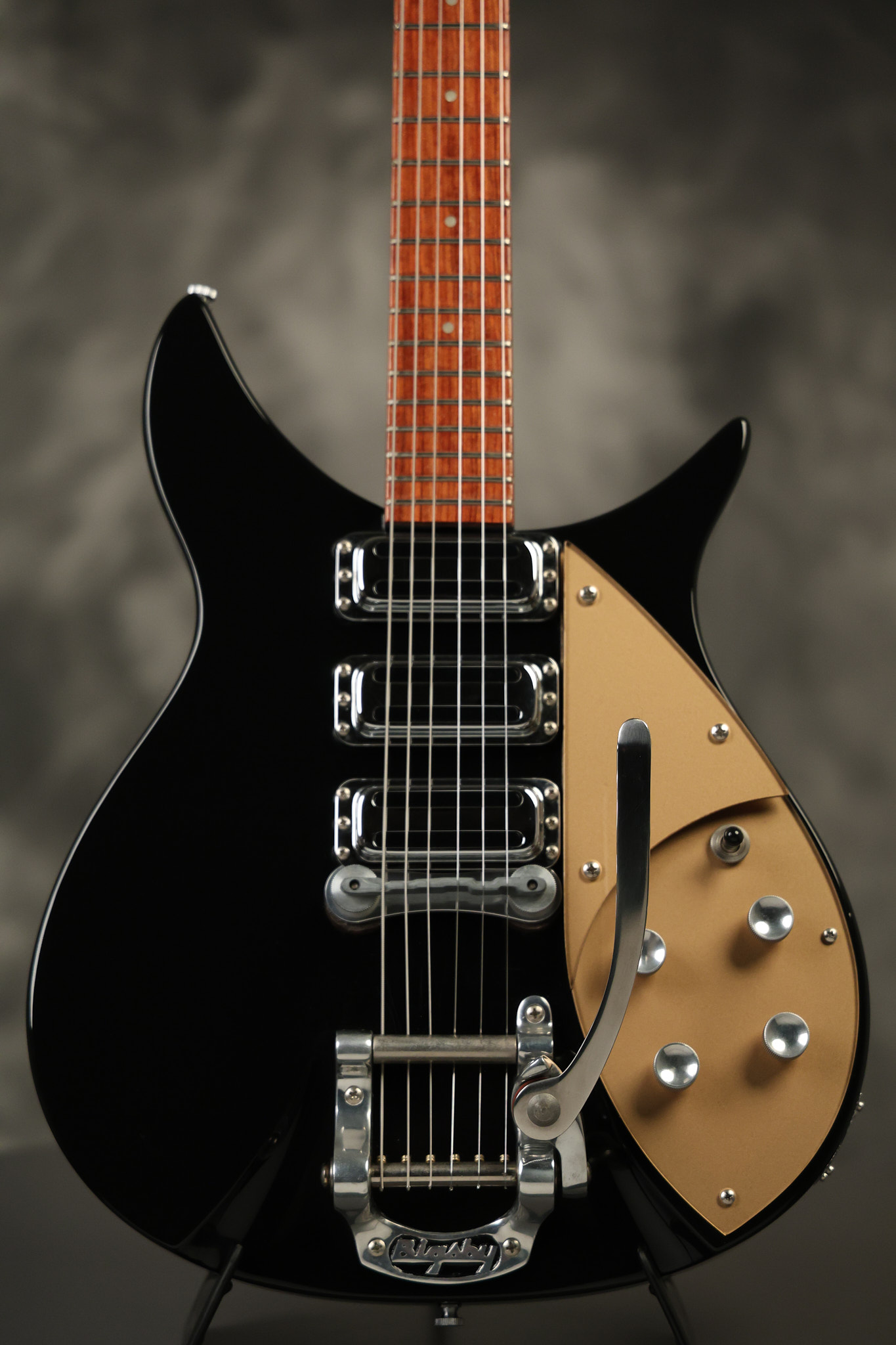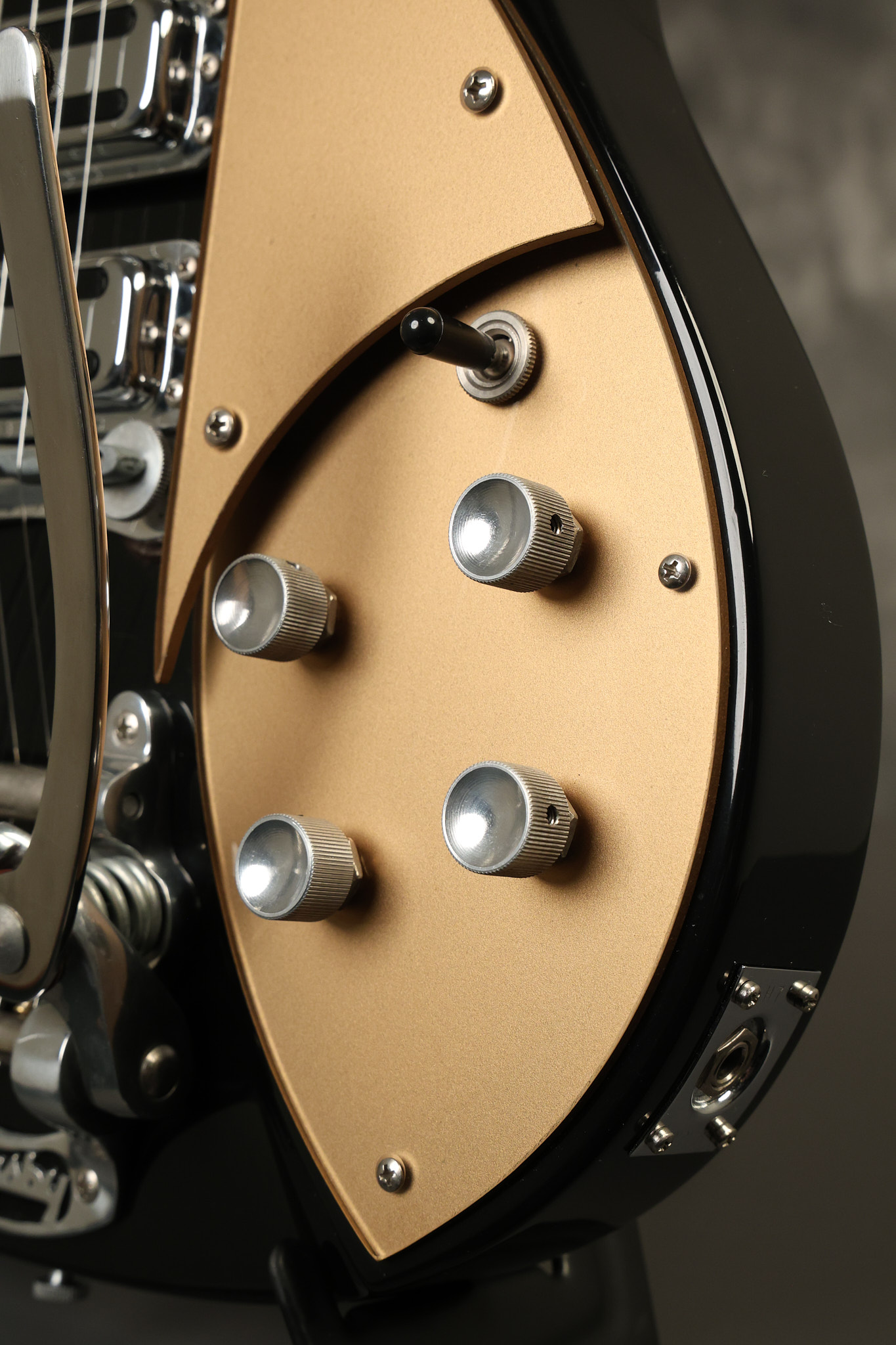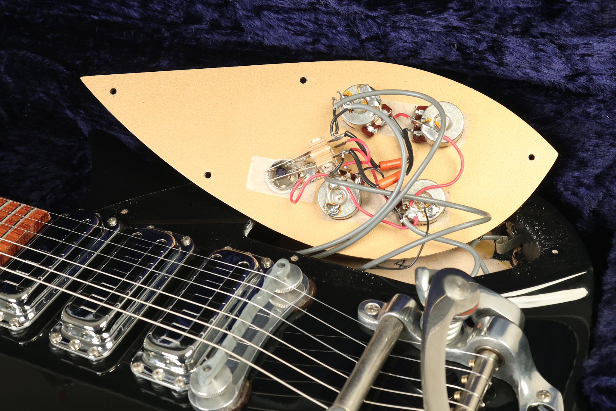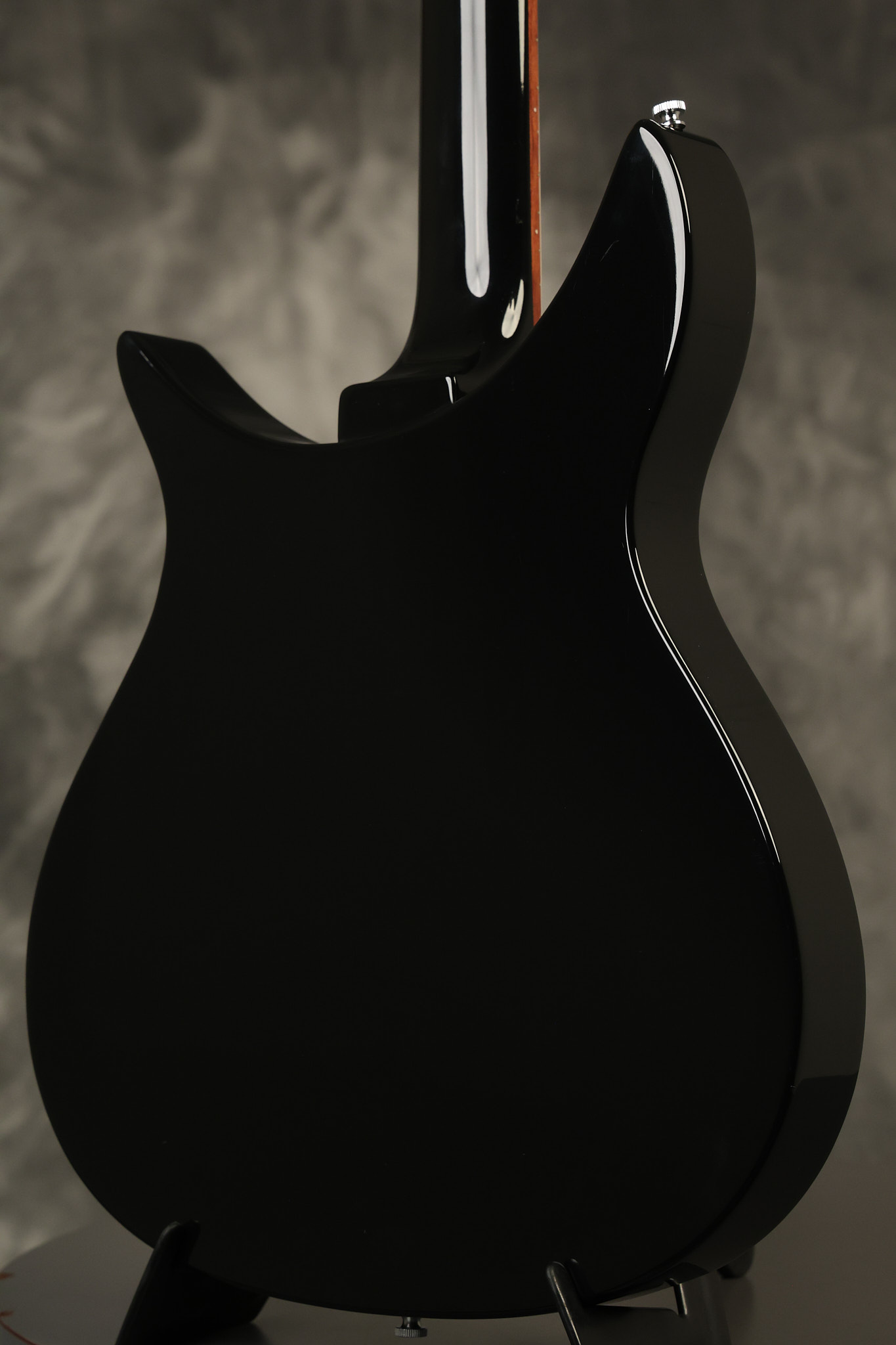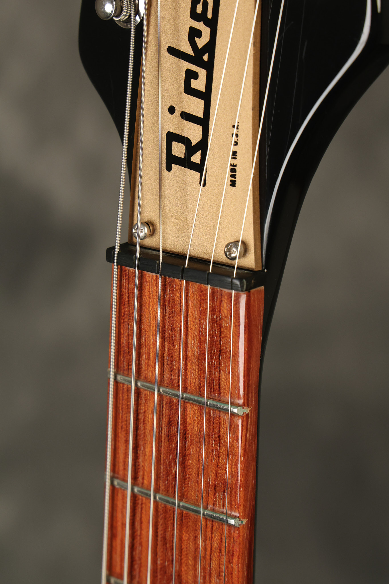 1994 Rickenbacker 325V59 in Jetglo that has had parts changed (Burns volume and tone knobs, Sorkin bridge, and open back Grover tuners) to resemble the specs of John Lennon's 1958 Rickenbacker model 325, with the exception of the upper portion of the pickguard being left on. It has a great playing neck with great frets. It's all original and 100% complete along with its original hardshell case. It's in EXCELLENT condition with only very little extremely minor surface wear. Pads were placed underneath the bridge to help protect the finish. Everything remains structurally sound with no cracks, breaks or repairs. All electronics work and sound great.