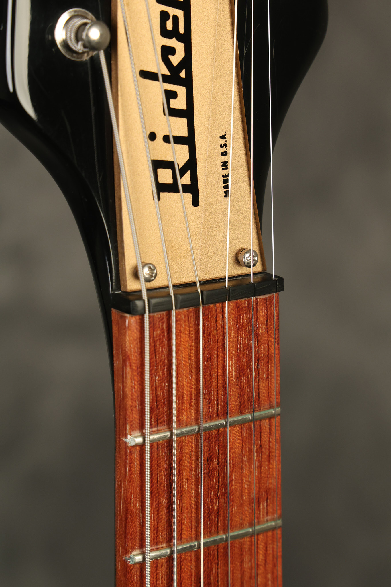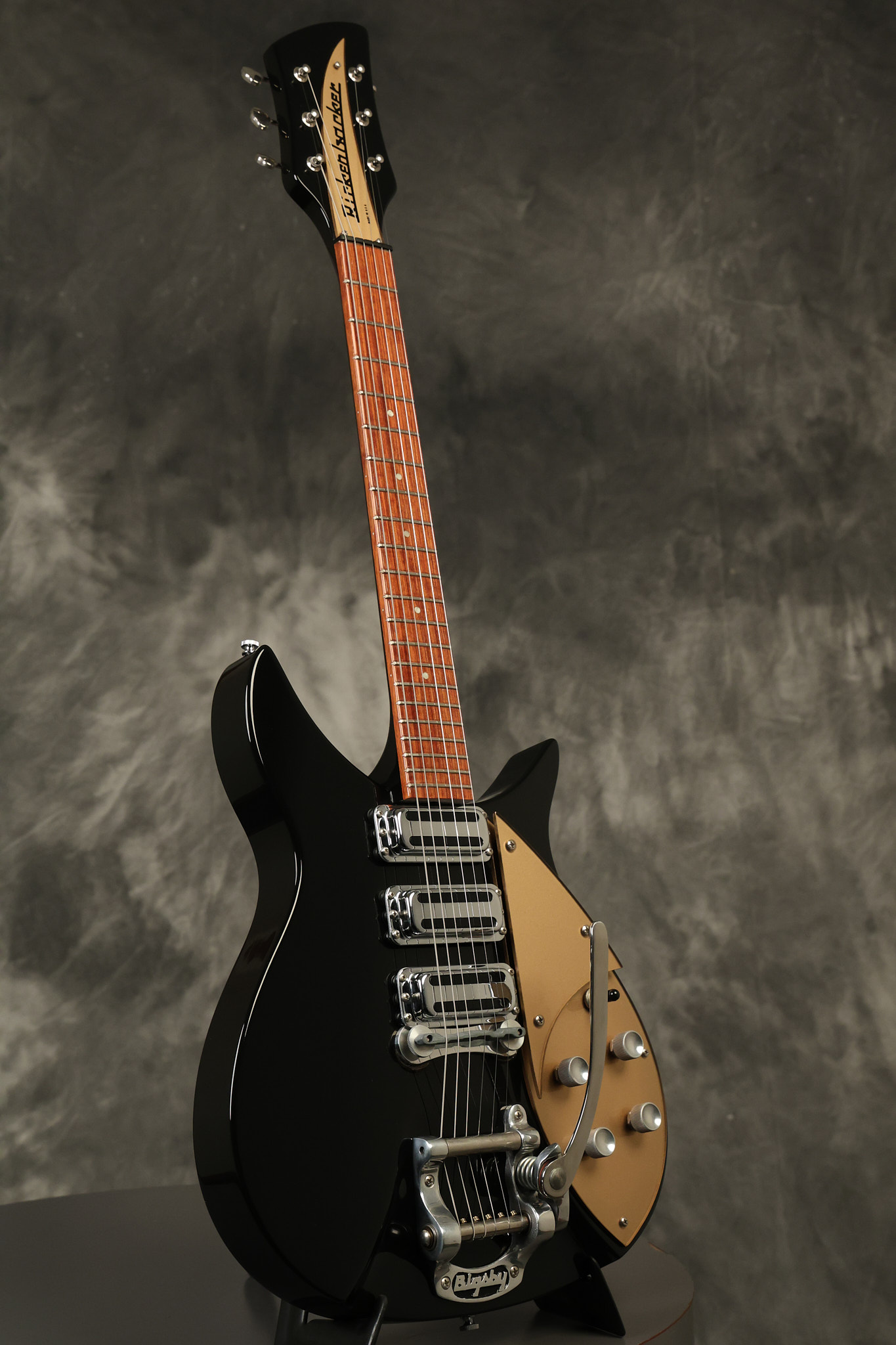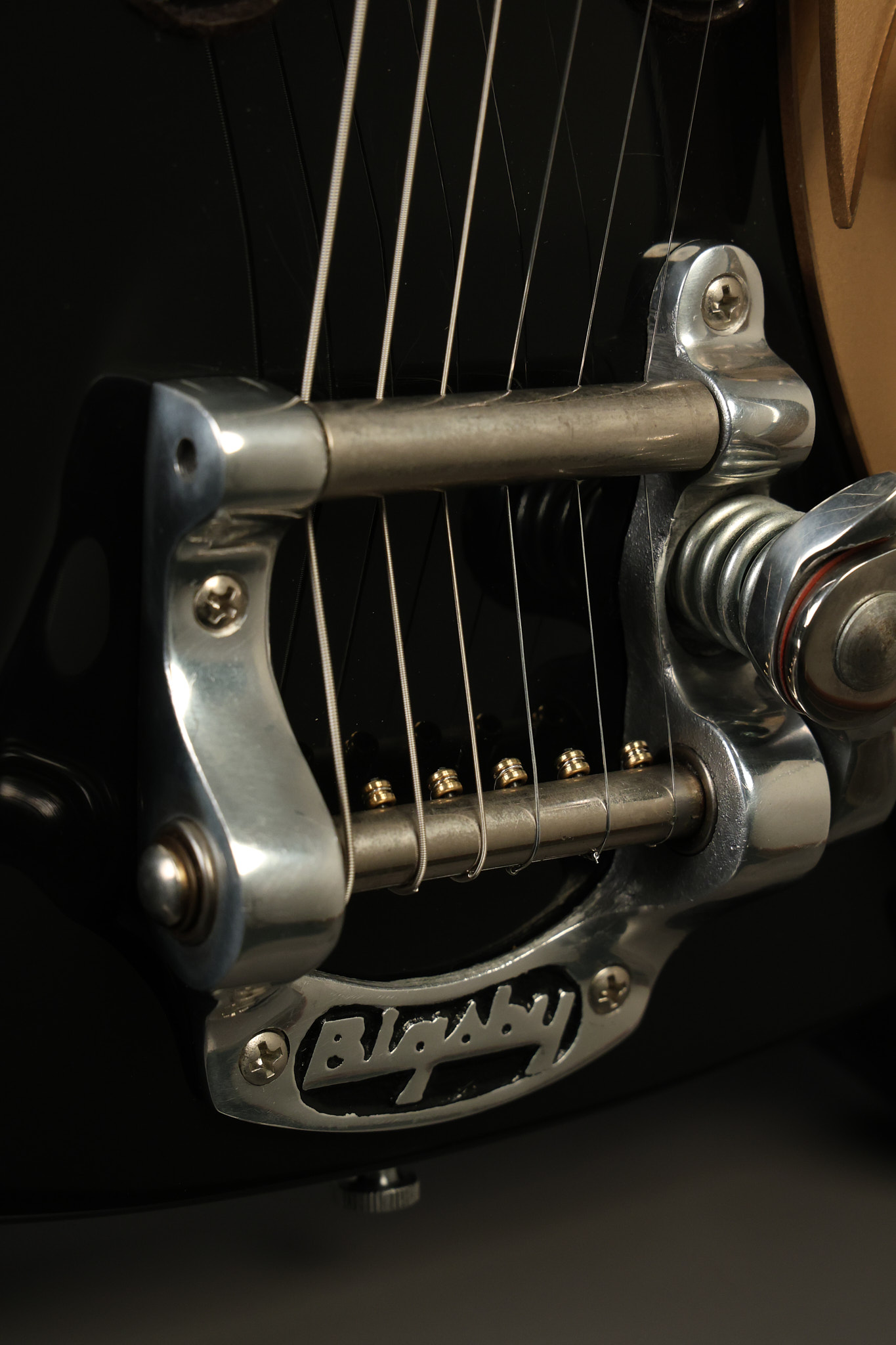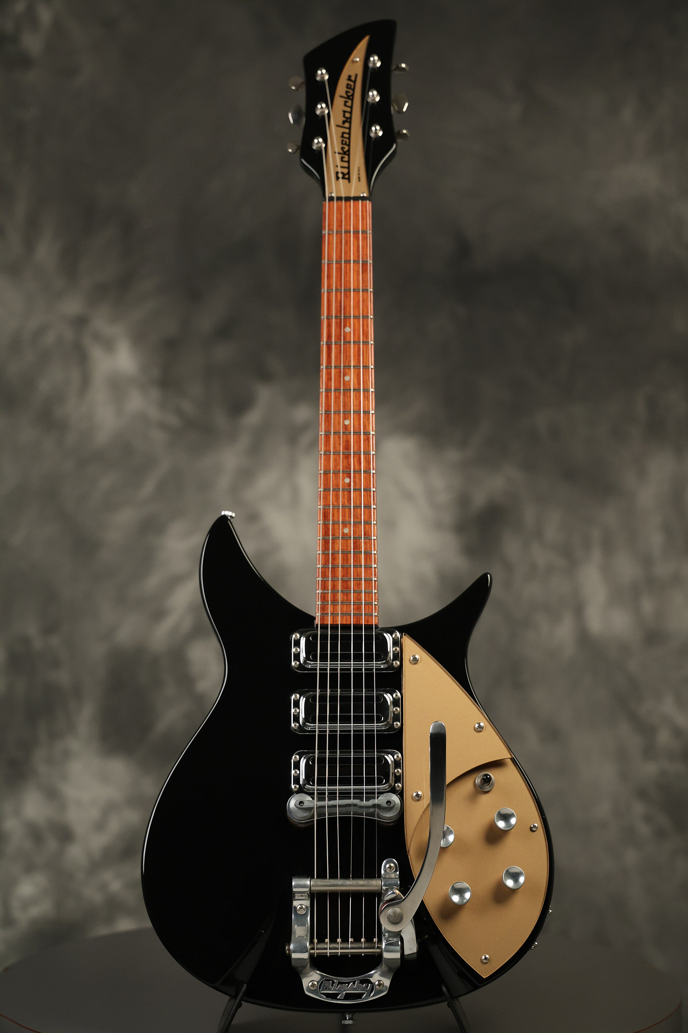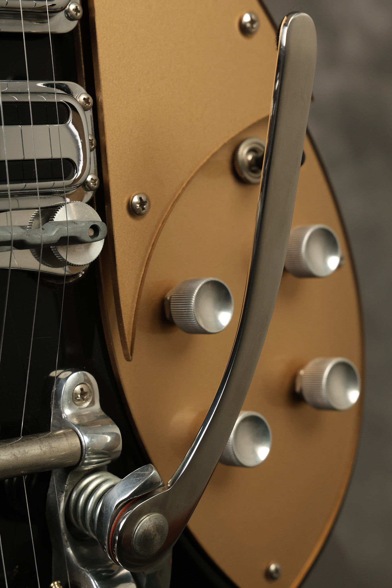 1994 Rickenbacker 325V59 in Jetglo that has had parts changed (Burns volume and tone knobs, Sorkin bridge, and open back Grover tuners) to resemble the specs of John Lennon's 1958 Rickenbacker model 325, with the exception of the upper portion of the pickguard being left on. It has a great playing neck with great frets. It's all original and 100% complete along with its original hardshell case. It's in EXCELLENT condition with only very little extremely minor surface wear. Pads were placed underneath the bridge to help protect the finish. Everything remains structurally sound with no cracks, breaks or repairs. All electronics work and sound great.