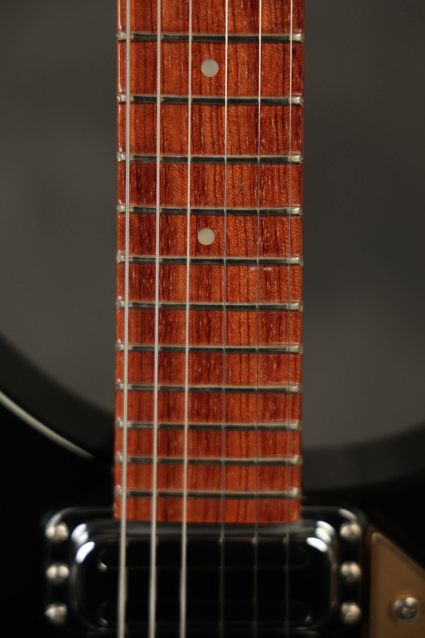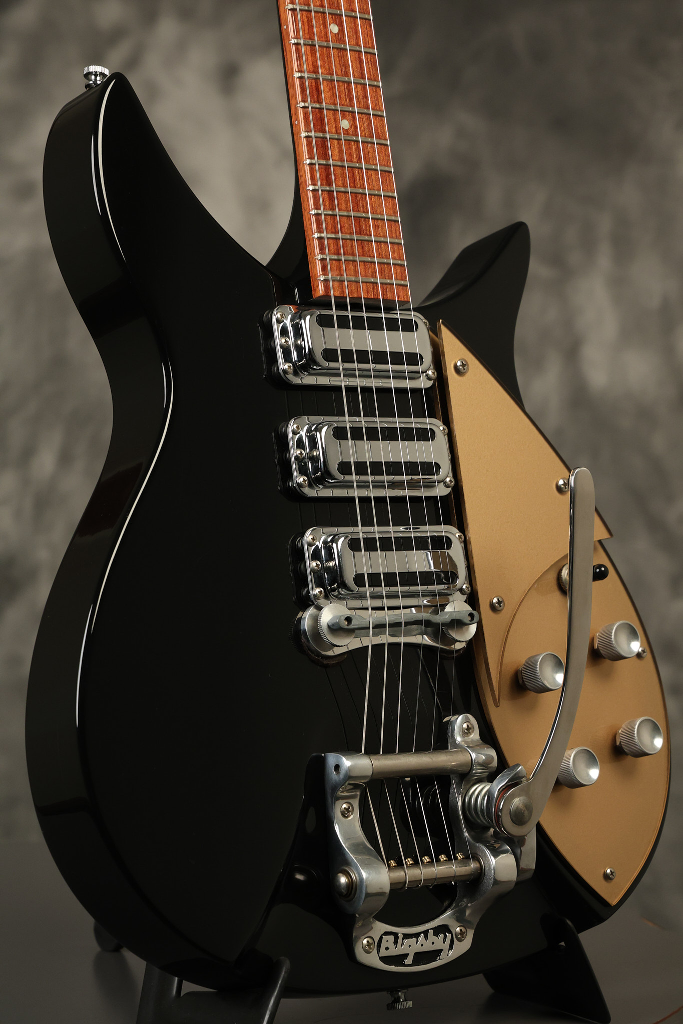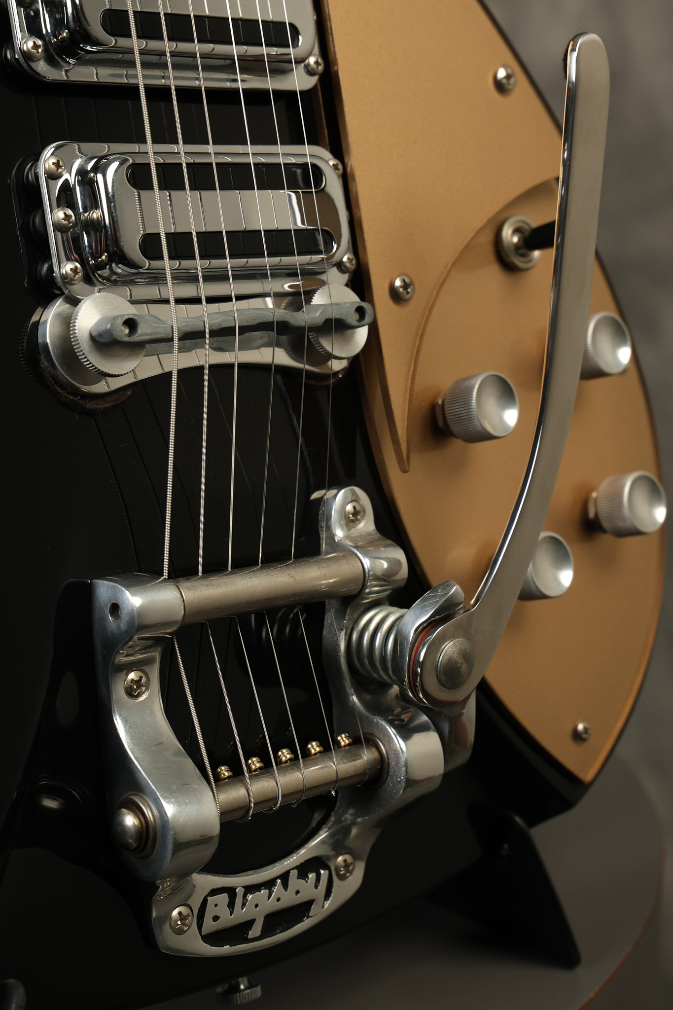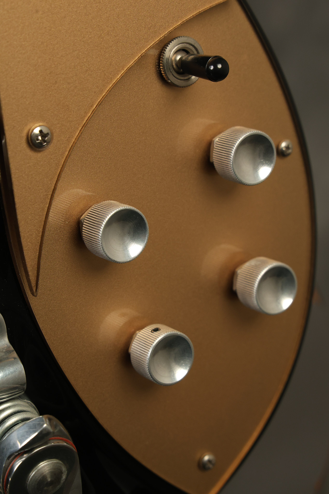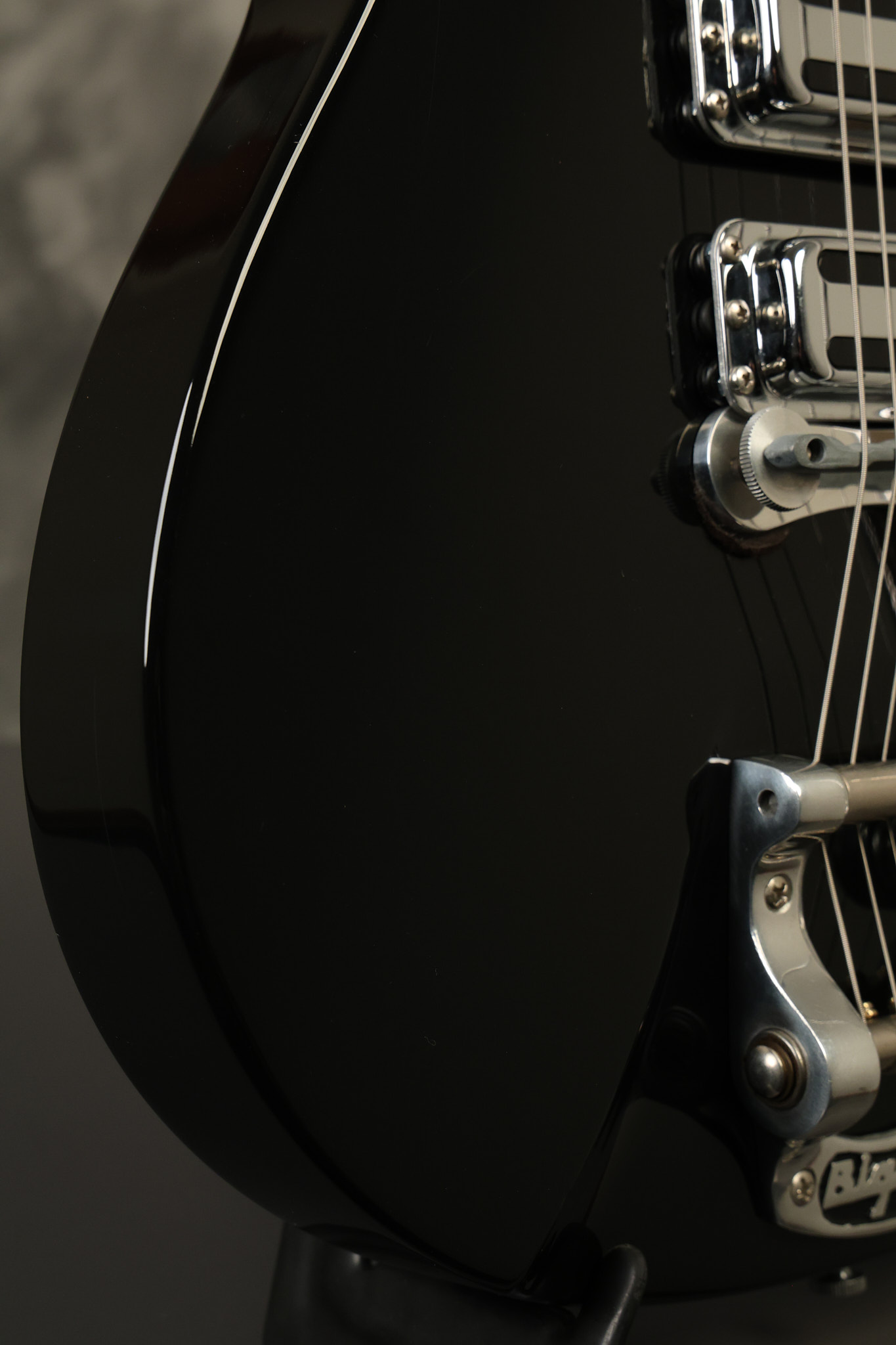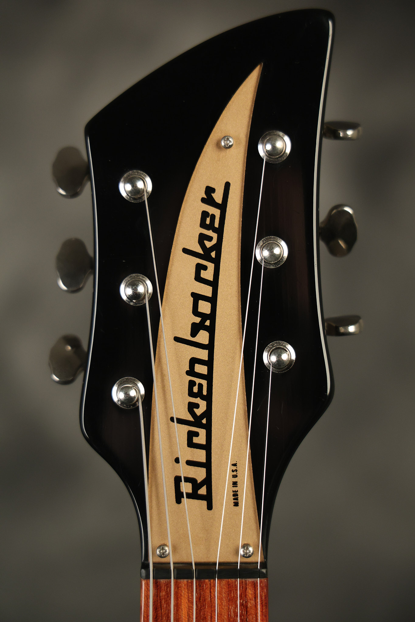 1994 Rickenbacker 325V59 in Jetglo that has had parts changed (Burns volume and tone knobs, Sorkin bridge, and open back Grover tuners) to resemble the specs of John Lennon's 1958 Rickenbacker model 325, with the exception of the upper portion of the pickguard being left on. It has a great playing neck with great frets. It's all original and 100% complete along with its original hardshell case. It's in EXCELLENT condition with only very little extremely minor surface wear. Pads were placed underneath the bridge to help protect the finish. Everything remains structurally sound with no cracks, breaks or repairs. All electronics work and sound great.