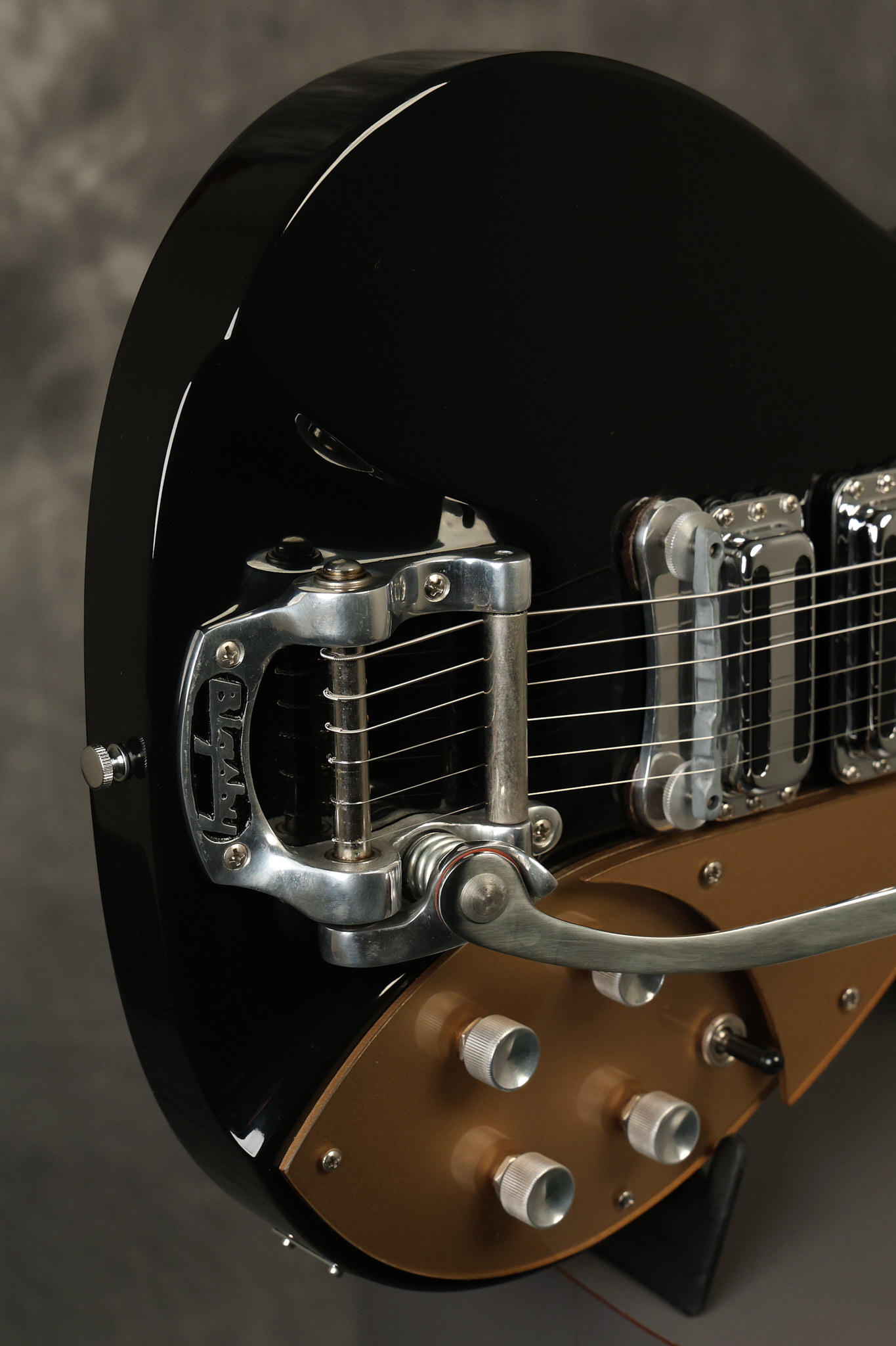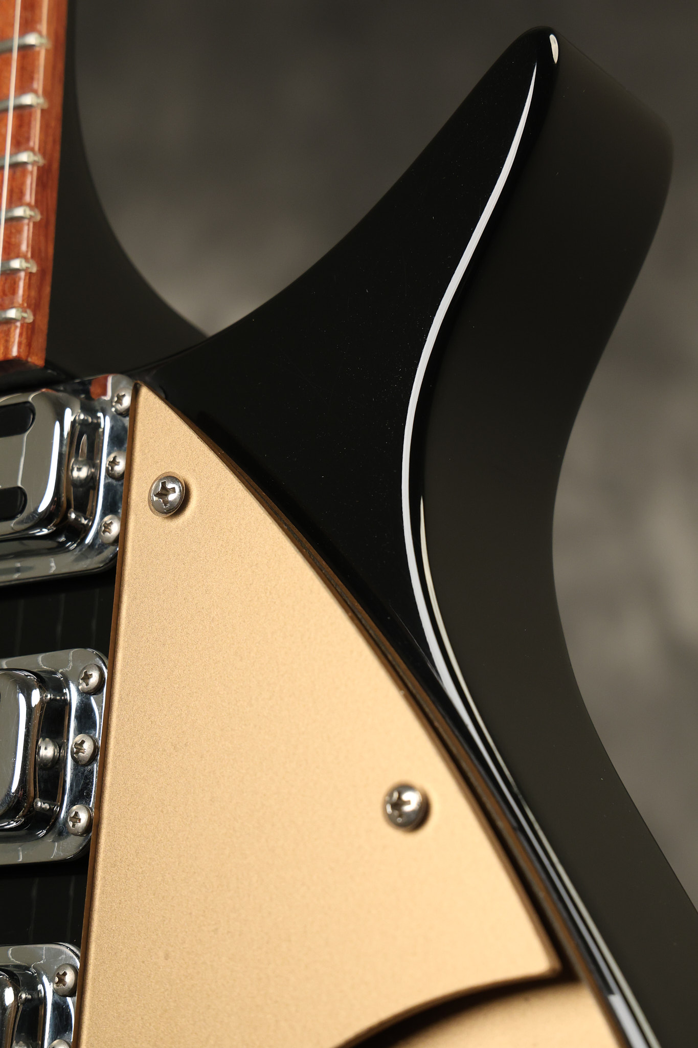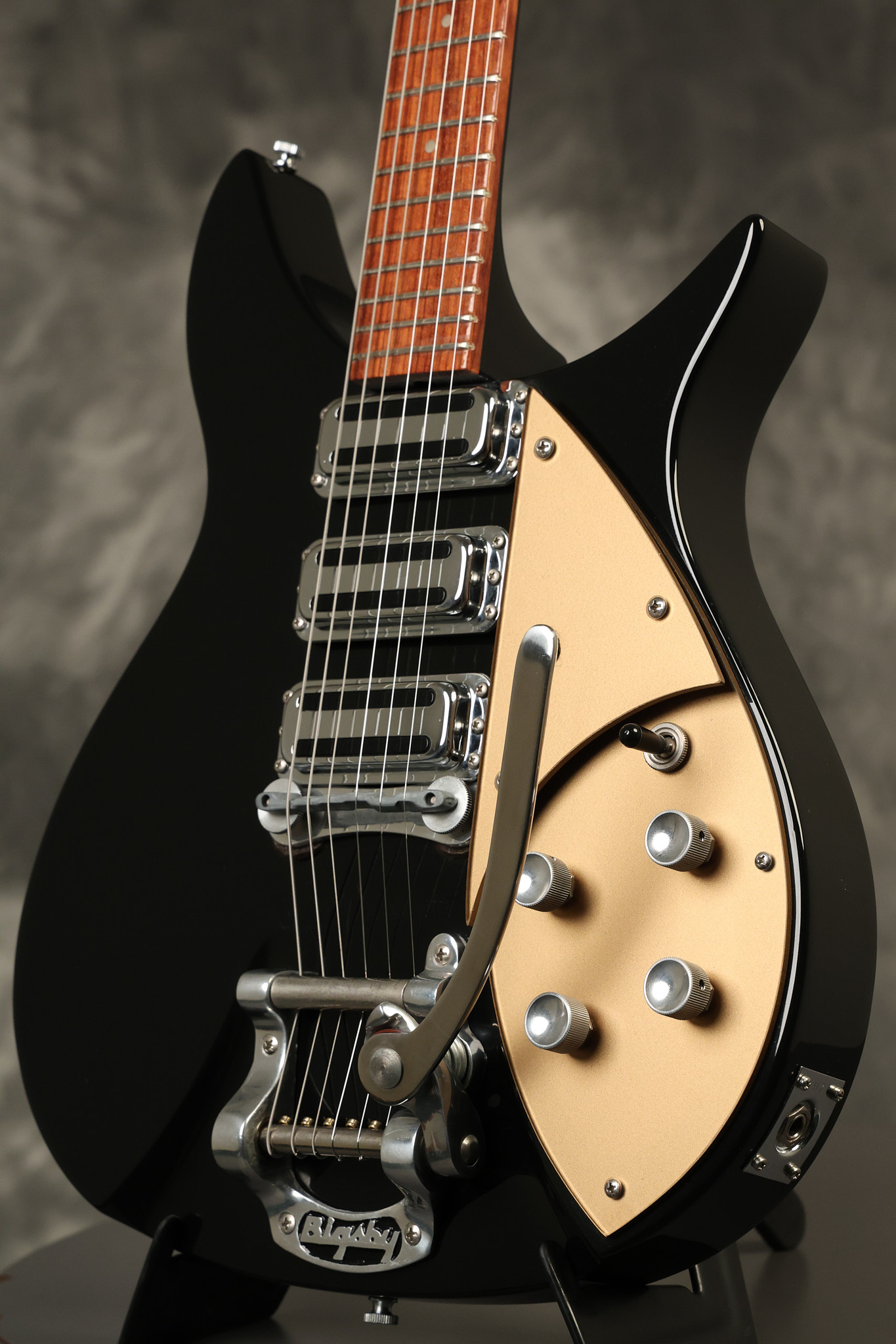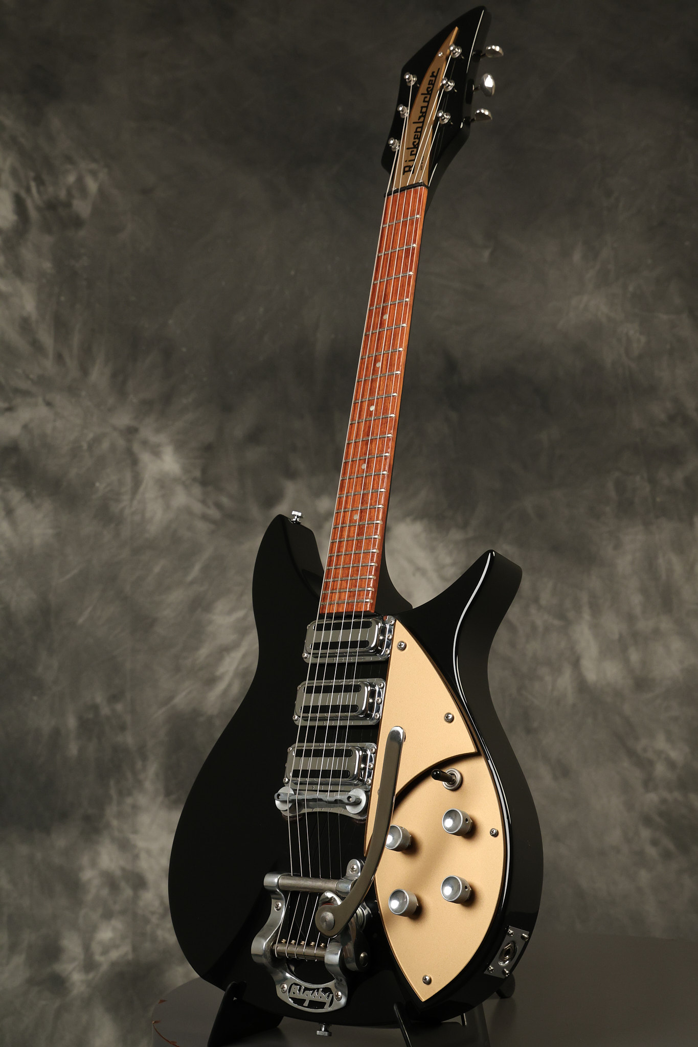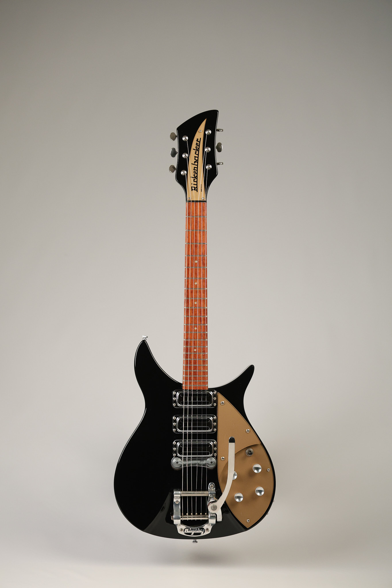 1994 Rickenbacker 325V59 in Jetglo that has had parts changed (Burns volume and tone knobs, Sorkin bridge, and open back Grover tuners) to resemble the specs of John Lennon's 1958 Rickenbacker model 325, with the exception of the upper portion of the pickguard being left on. It has a great playing neck with great frets. It's all original and 100% complete along with its original hardshell case. It's in EXCELLENT condition with only very little extremely minor surface wear. Pads were placed underneath the bridge to help protect the finish. Everything remains structurally sound with no cracks, breaks or repairs. All electronics work and sound great.