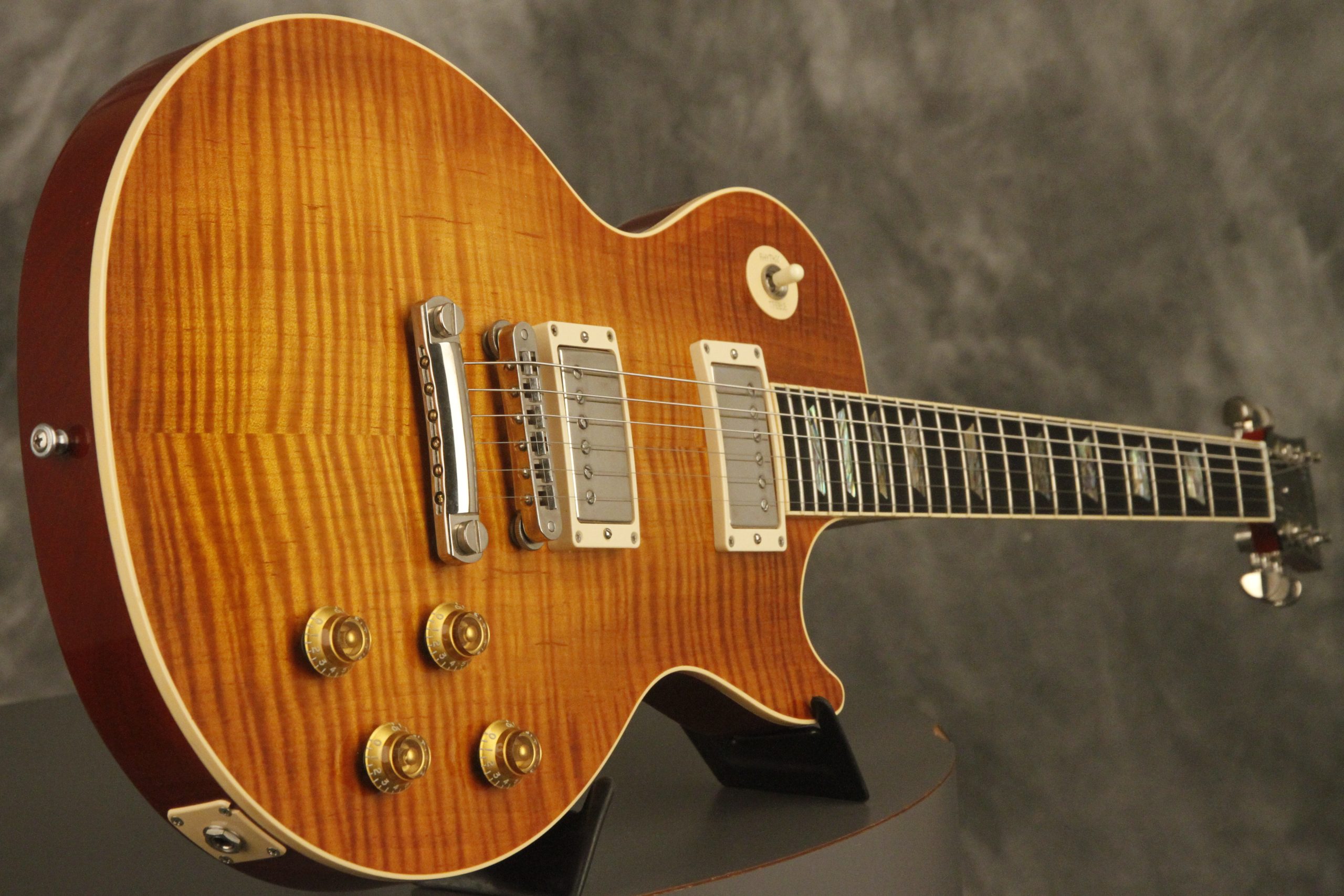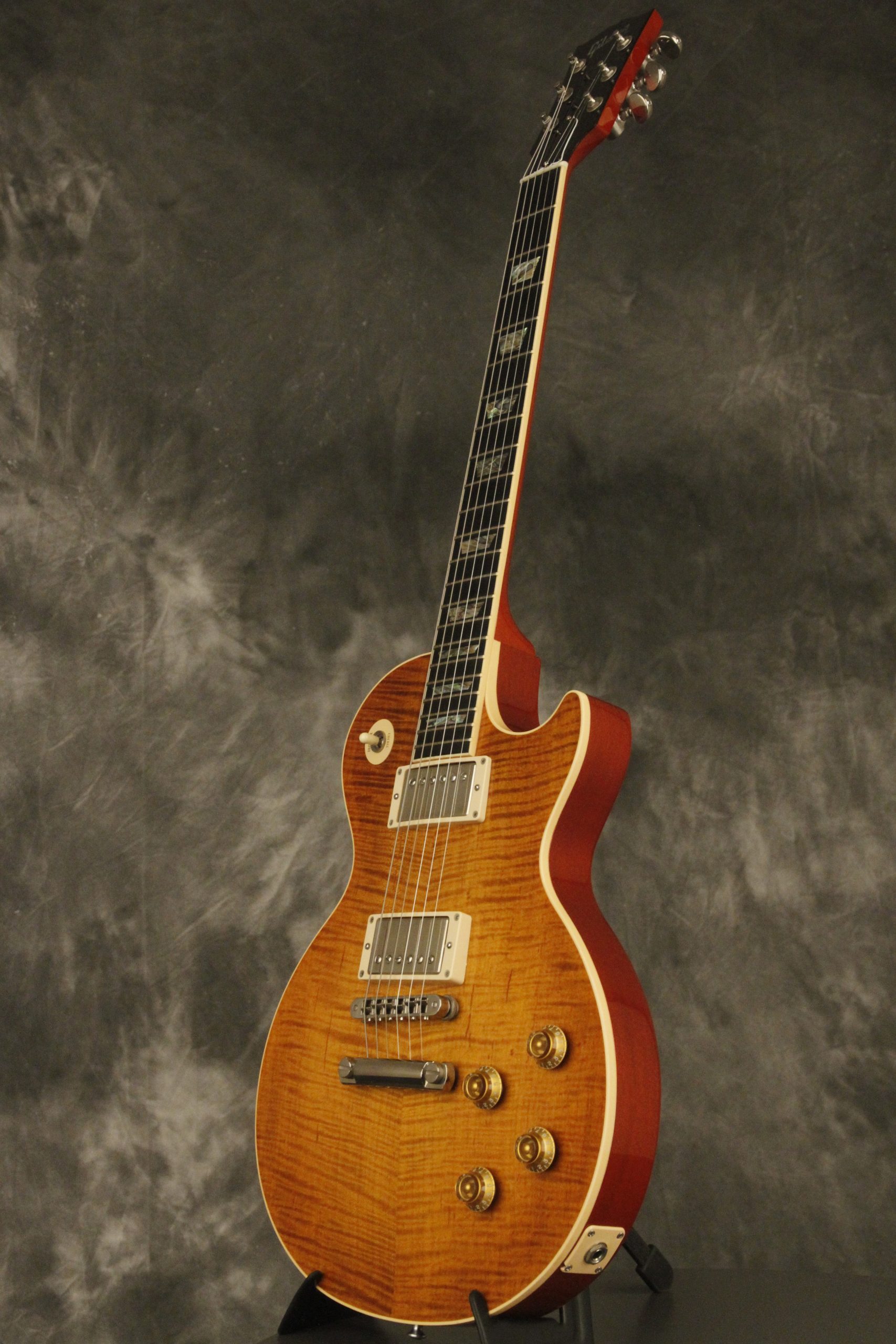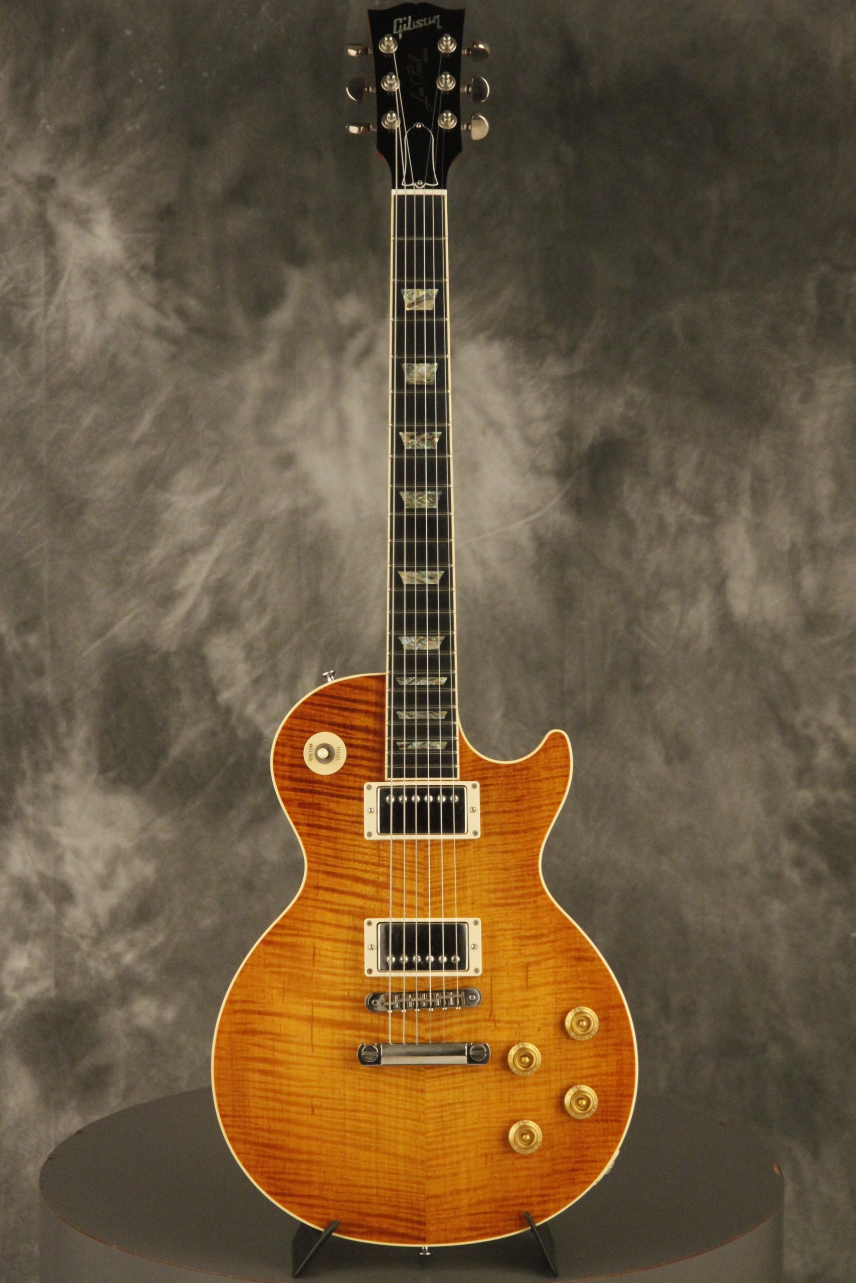 2000 Gibson Custom Shop Les Paul Elegant in Honeyburst which really shows off its incredible AAA flame maple top on a chambered body. It has a great playing neck with great frets. It's all original and 100% complete along with its original hardshell case. It's in EXCELLENT condition with only a few very minor nicks + dings, one short line of finish checking on the back of the headstock, a cracked jack plate and other barely noticeable surface wear. Everything remains structurally sound with no cracks, breaks or repairs. All electronics work and sound great with its original set of Classic '57 pickups.