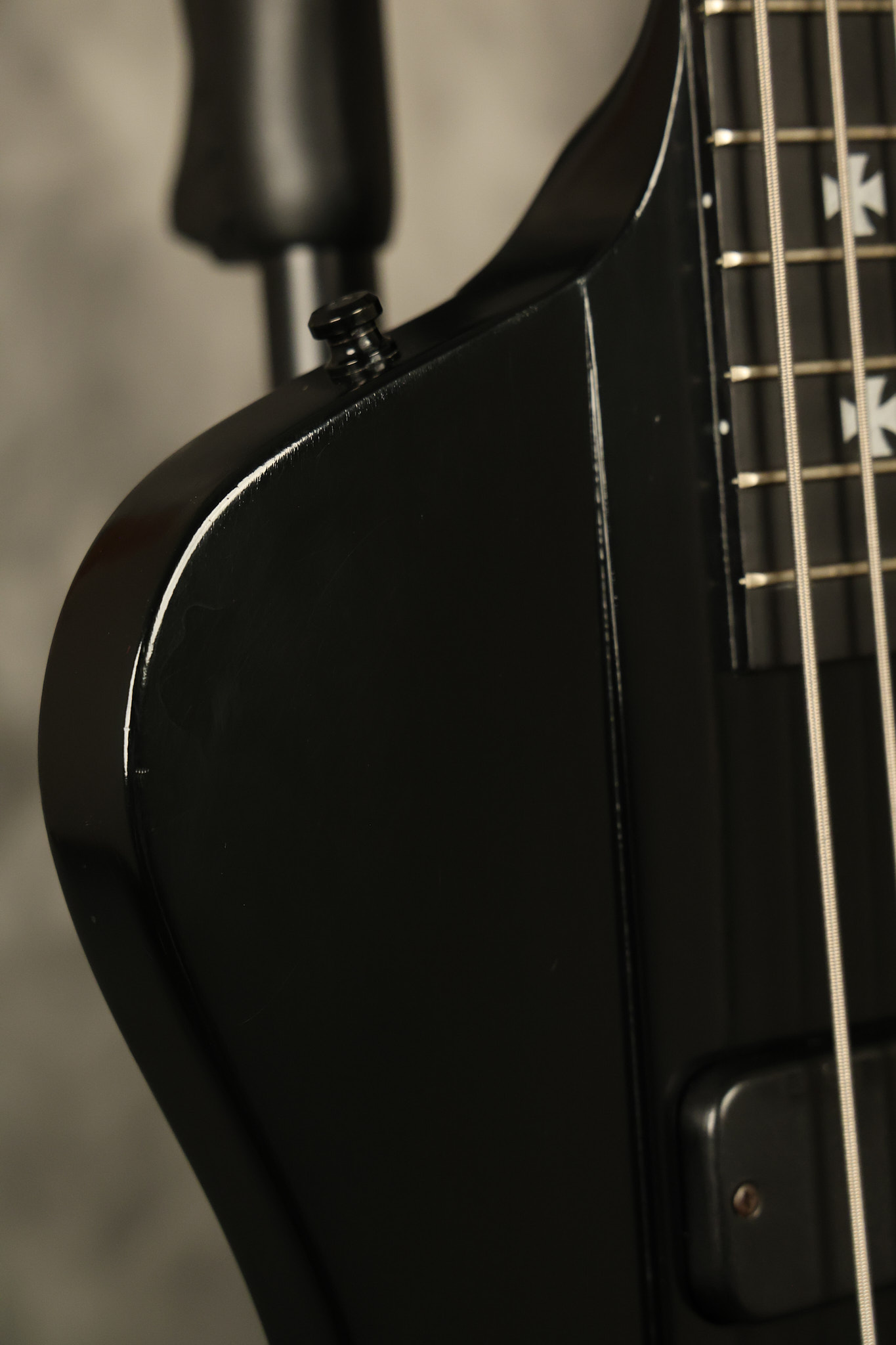 2001 Gibson Nikki Sixx model Blackbird Bass in its original Matte Black finish. It has a great playing neck with great frets. It's all original and 100% complete including its original hardshell case. It's in very good condition with some minor nicks + dings and lots of surface wear. Everything remains structurally sound with no cracks, breaks or repairs. All electronics work and sound great.