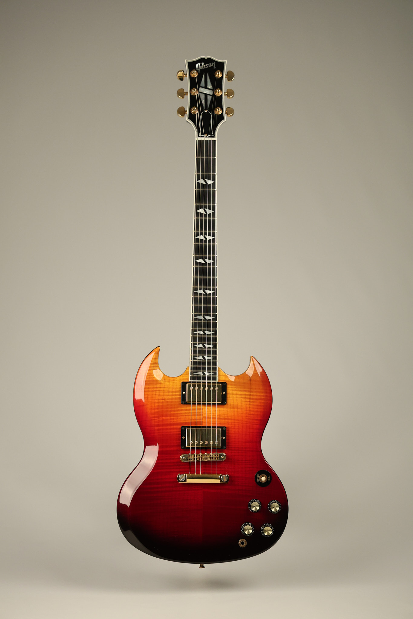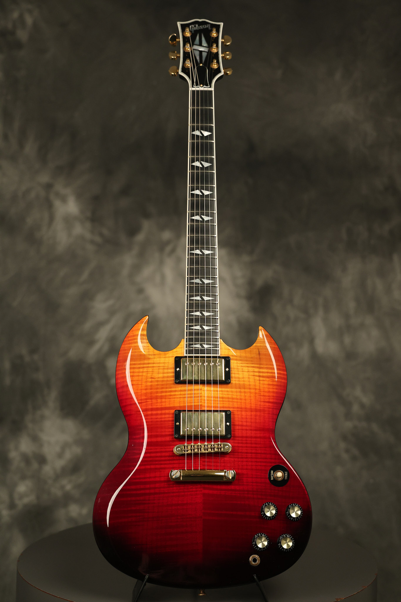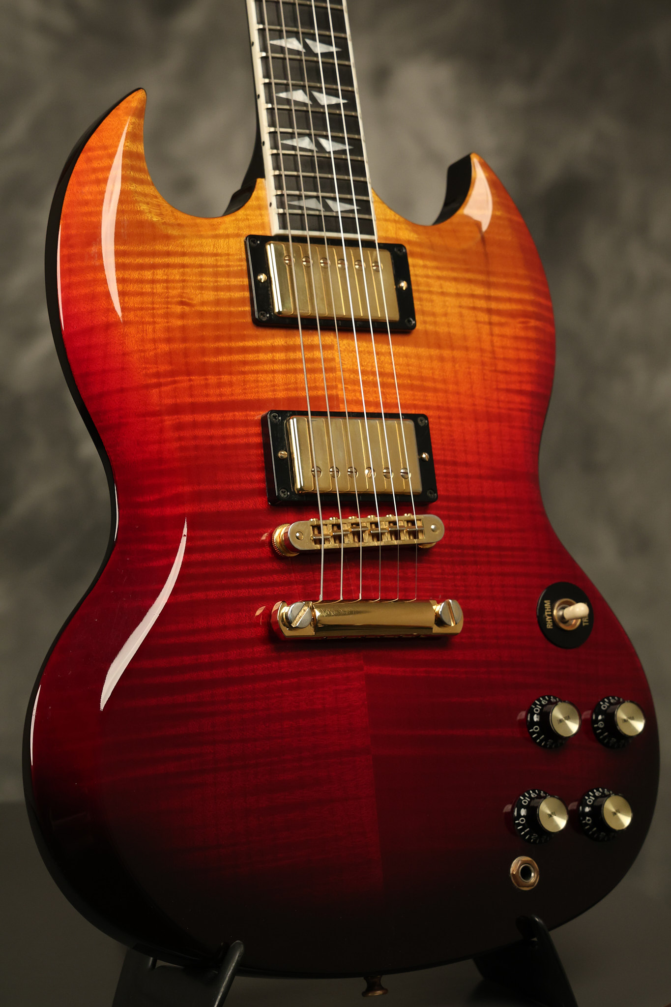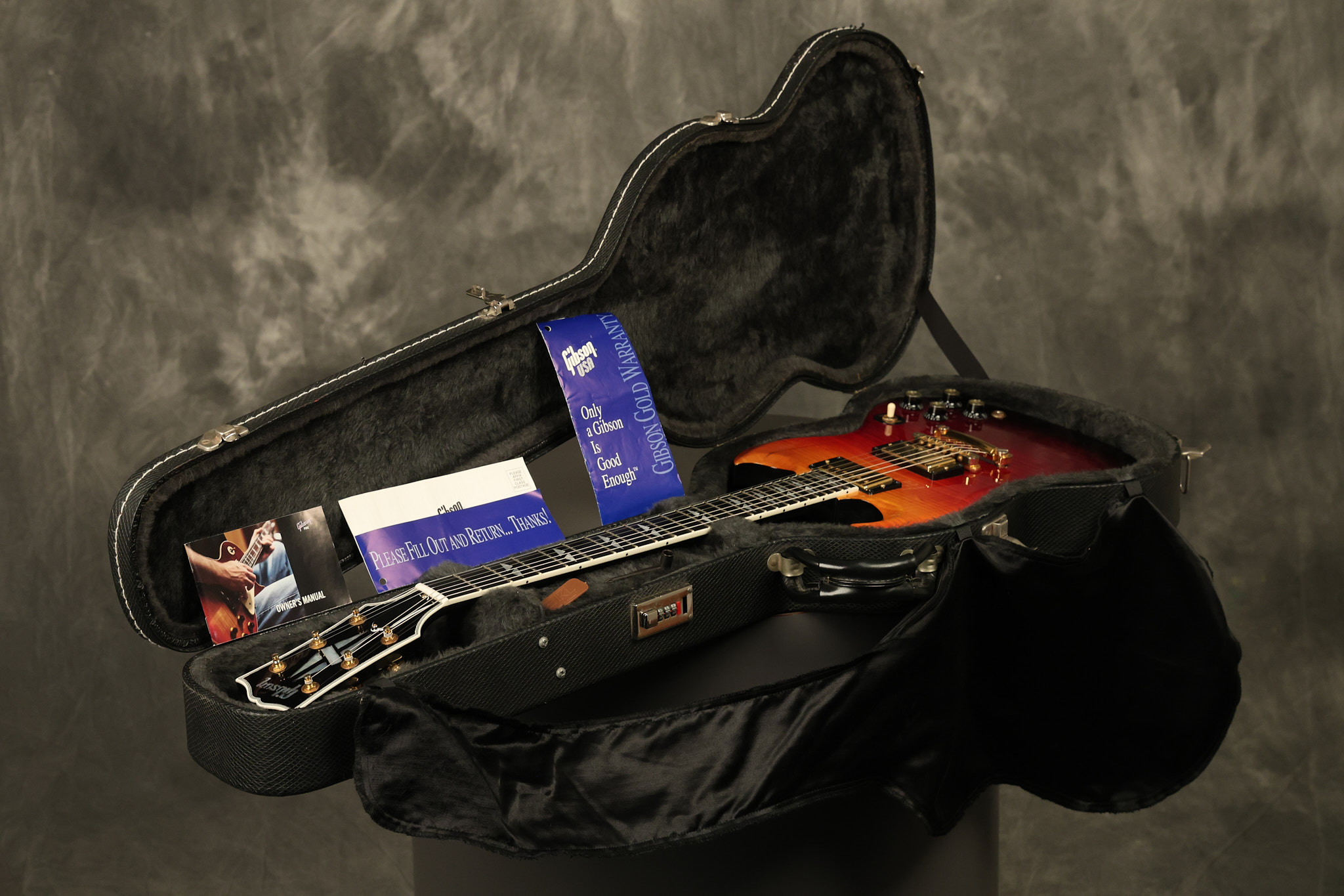 2003 Gibson SG Supreme in Lava Burst with a AAA flame maple top. It has a good playing neck with great frets. It's all original and 100% complete along with its original hardshell case and papers. It's in very good condition with a few very minor nicks + dings, some finish cracking along the seam of the binding edges on the face of the headstock and other minor cosmetic wear. Everything remains structurally sound with no cracks, breaks or repairs. All electronics work and sound great.