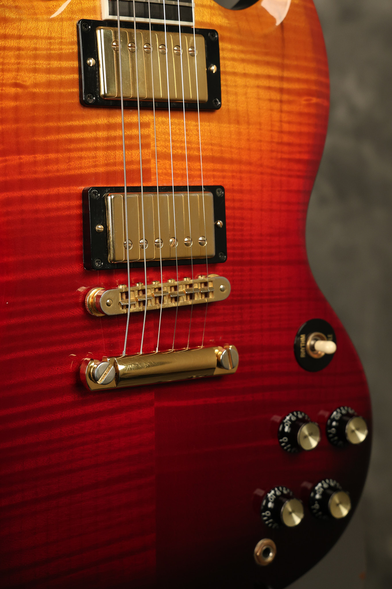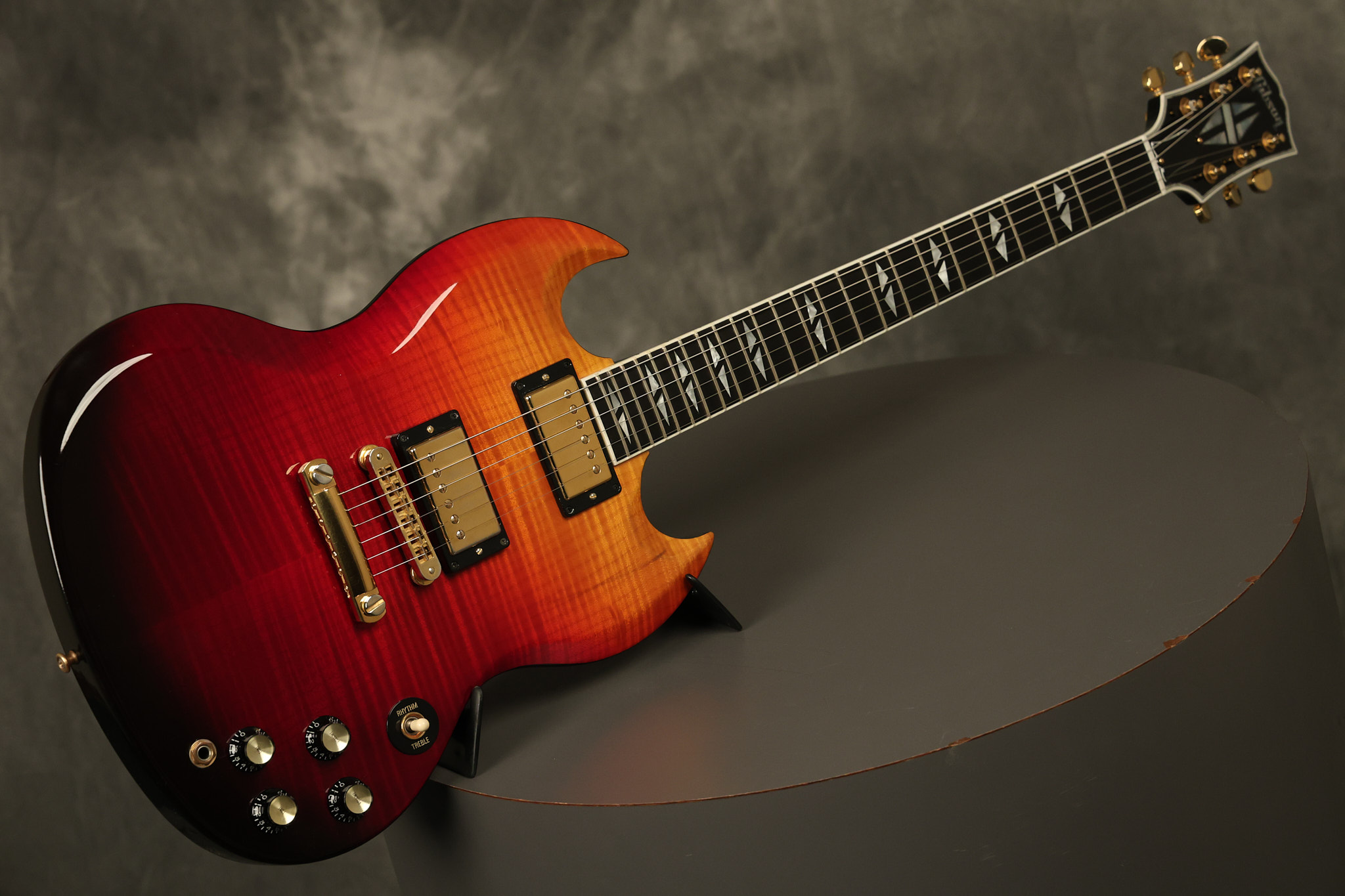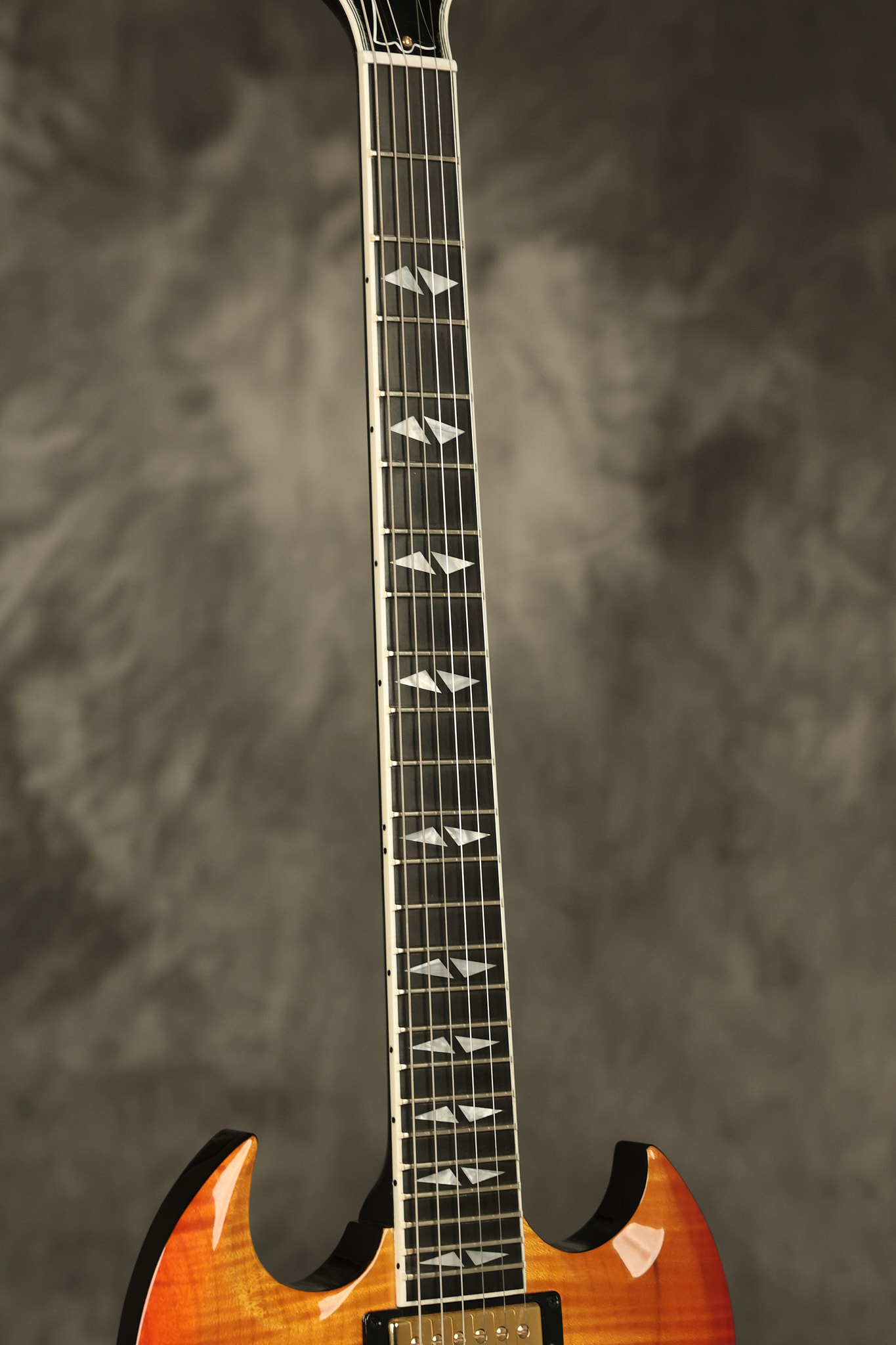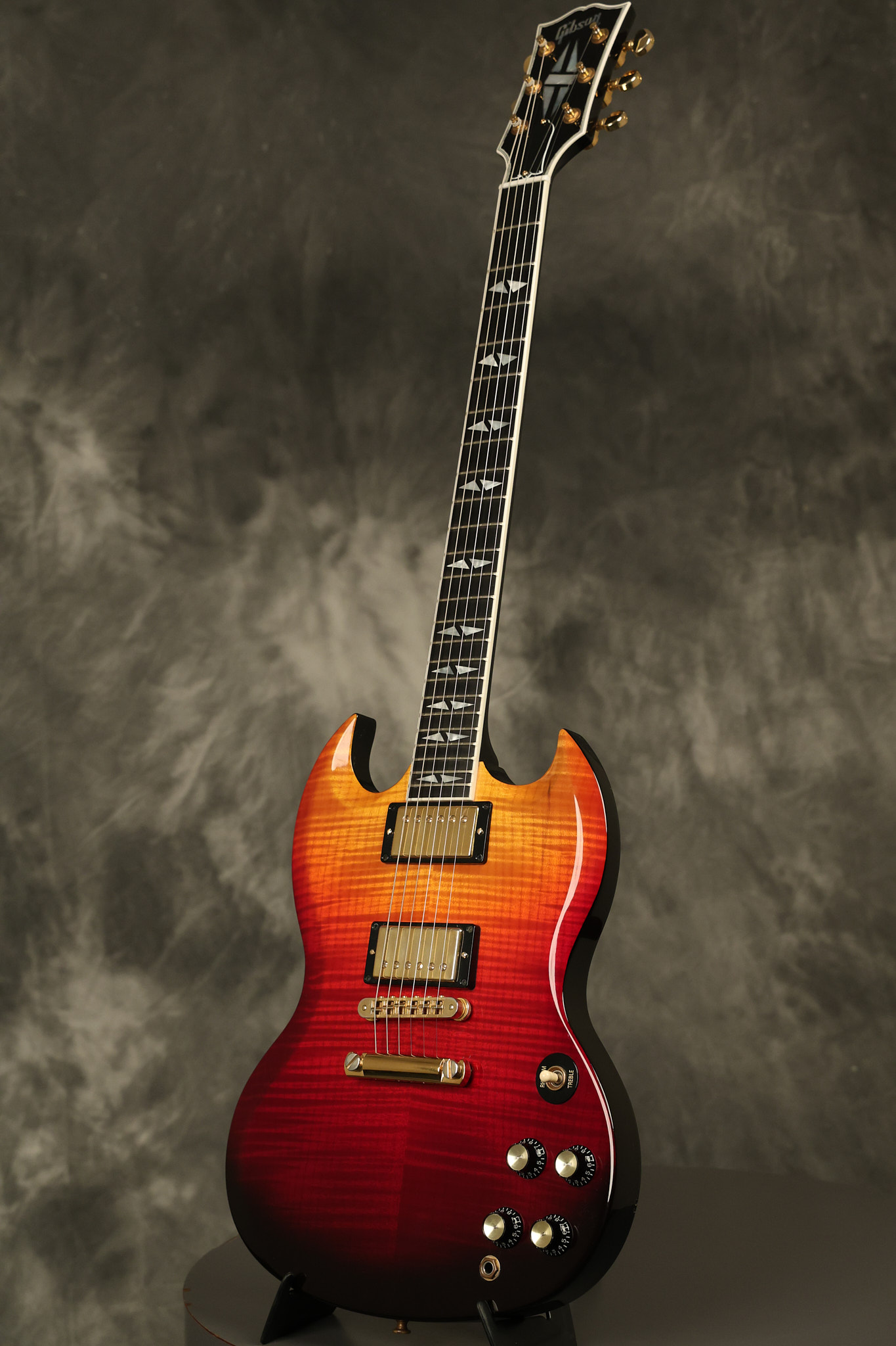 2003 Gibson SG Supreme in Lava Burst with a AAA flame maple top. It has a good playing neck with great frets. It's all original and 100% complete along with its original hardshell case and papers. It's in very good condition with a few very minor nicks + dings, some finish cracking along the seam of the binding edges on the face of the headstock and other minor cosmetic wear. Everything remains structurally sound with no cracks, breaks or repairs. All electronics work and sound great.