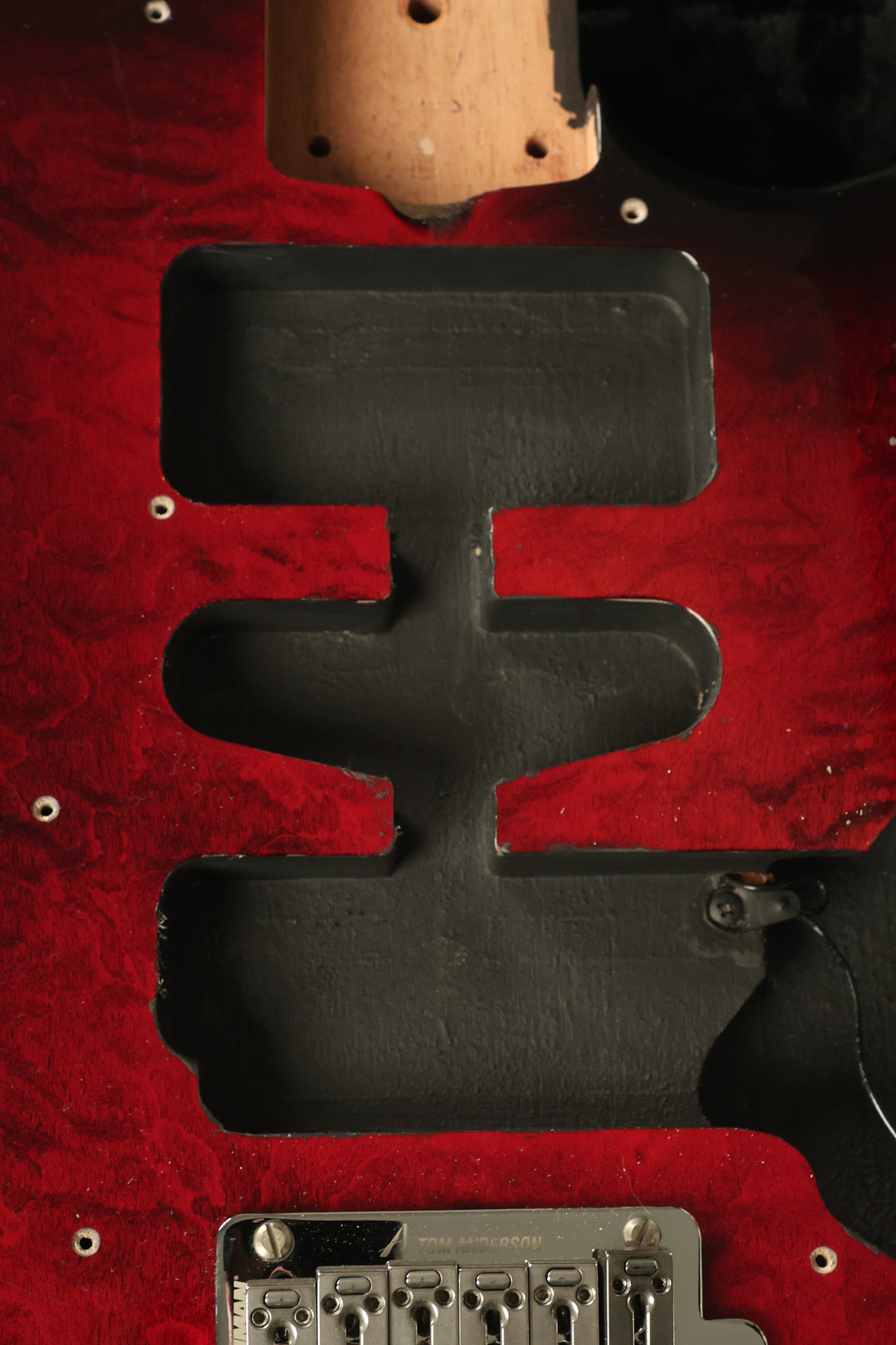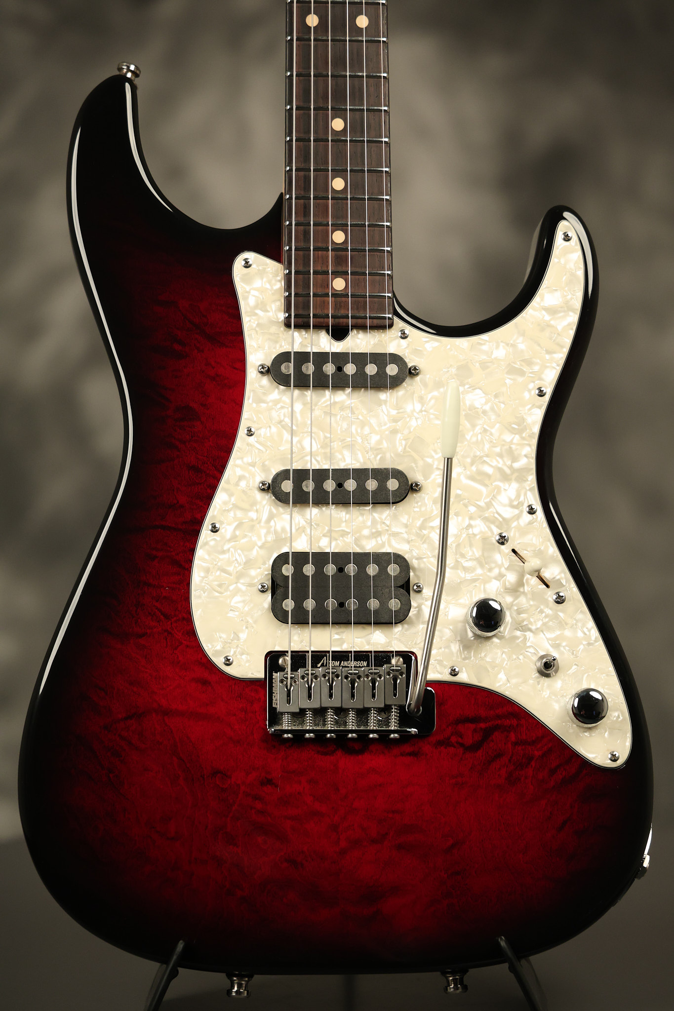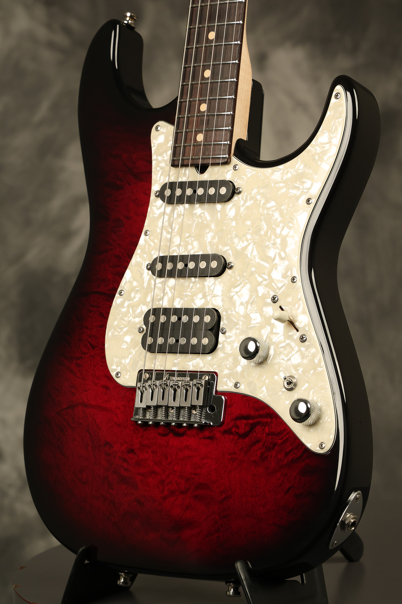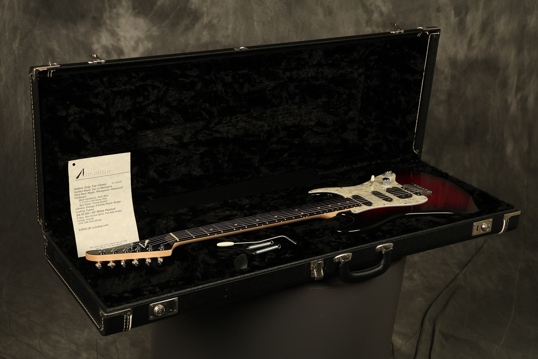 2003 Tom Anderson Drop Top Classic in Cajun Red to Black Burst with a quilted maple top. It has a great playing neck with great frets. It's all original and 100% complete along with its original hardshell case and spec sheet. It's in NEAR MINT condition with only very little barely noticeable surface wear. Everything remains structurally sound with no cracks, breaks or repairs. All electronics work and sound great.