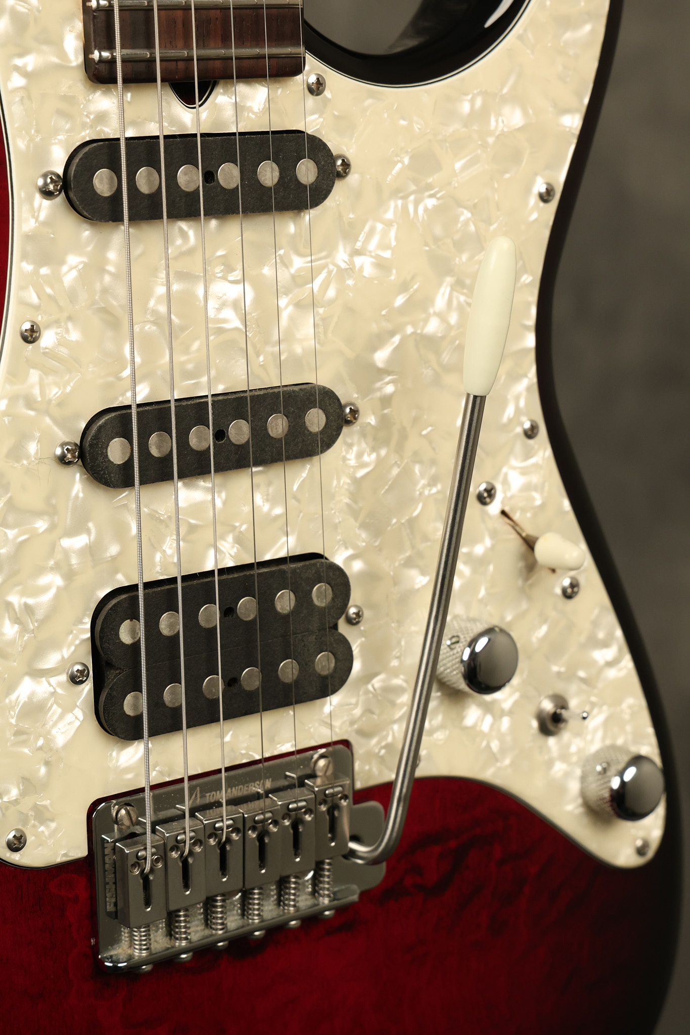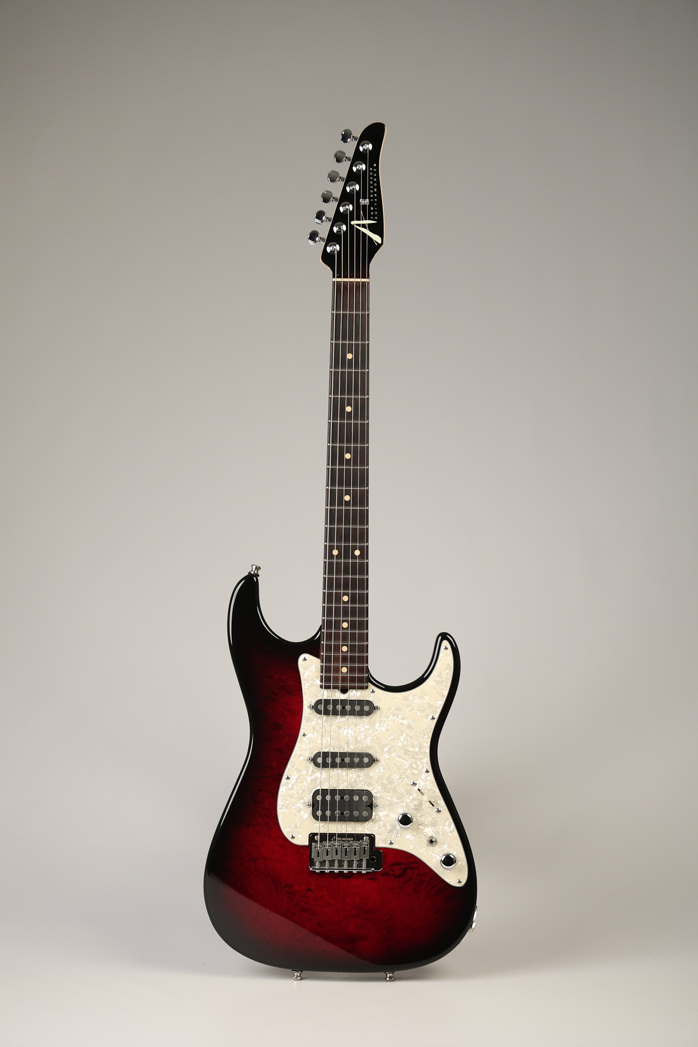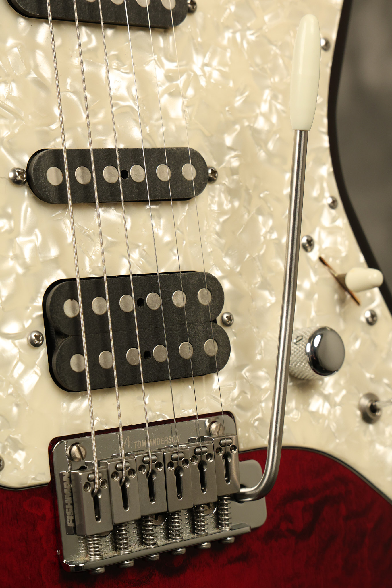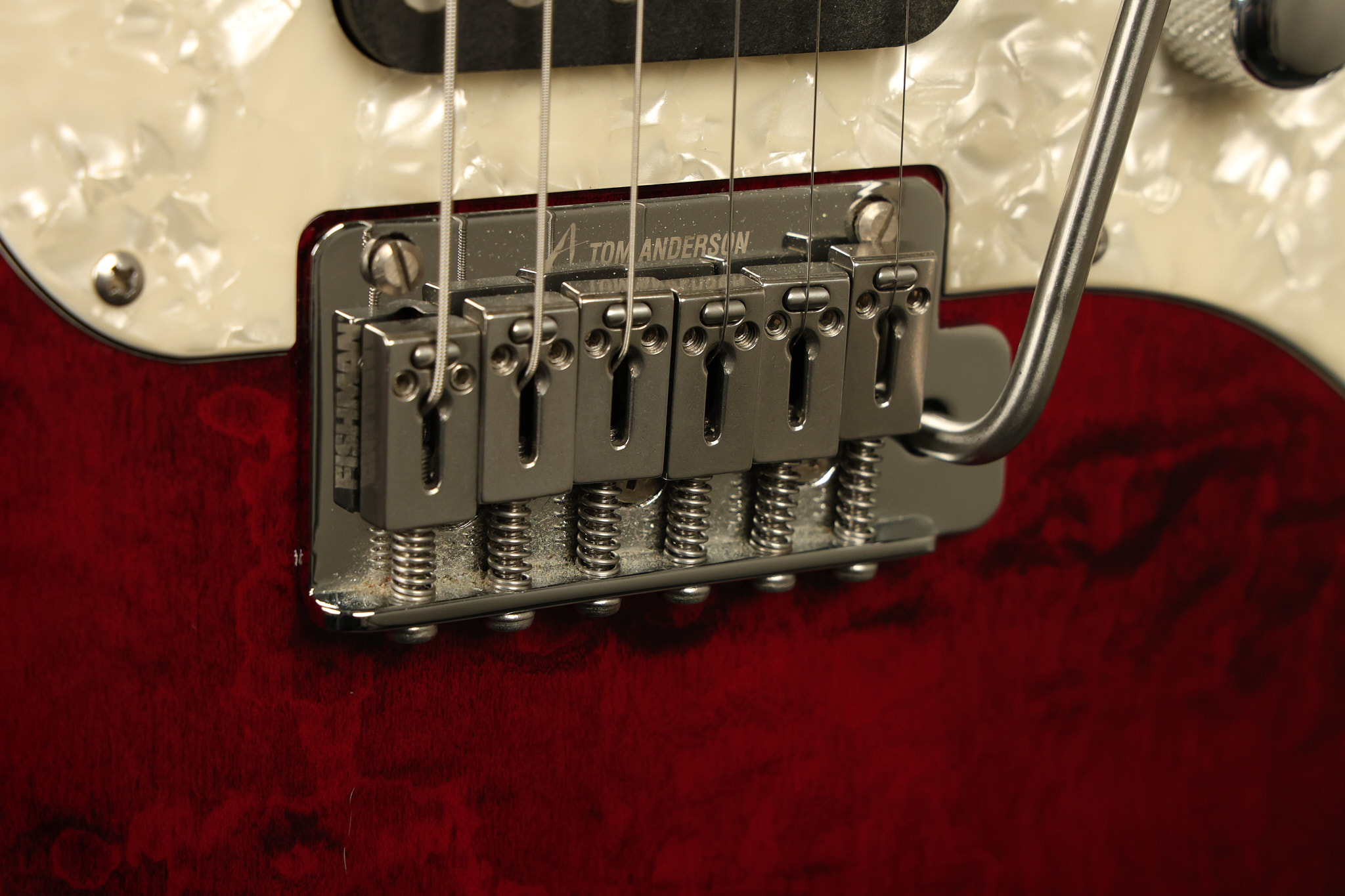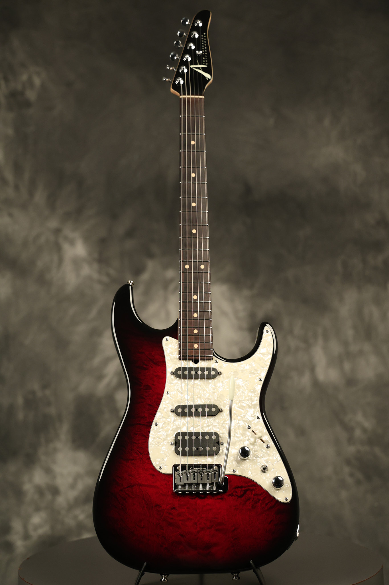 2003 Tom Anderson Drop Top Classic in Cajun Red to Black Burst with a quilted maple top. It has a great playing neck with great frets. It's all original and 100% complete along with its original hardshell case and spec sheet. It's in NEAR MINT condition with only very little barely noticeable surface wear. Everything remains structurally sound with no cracks, breaks or repairs. All electronics work and sound great.