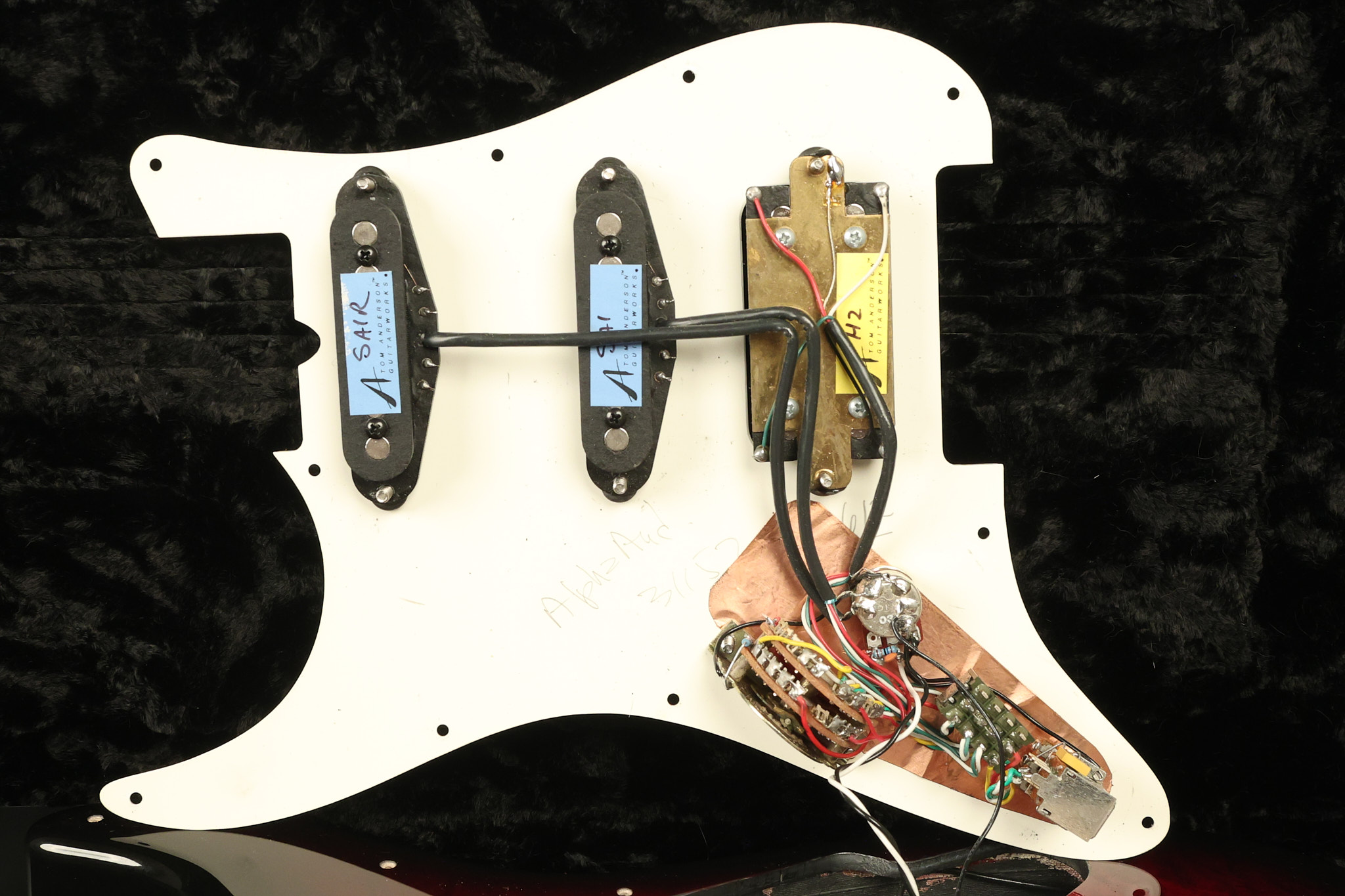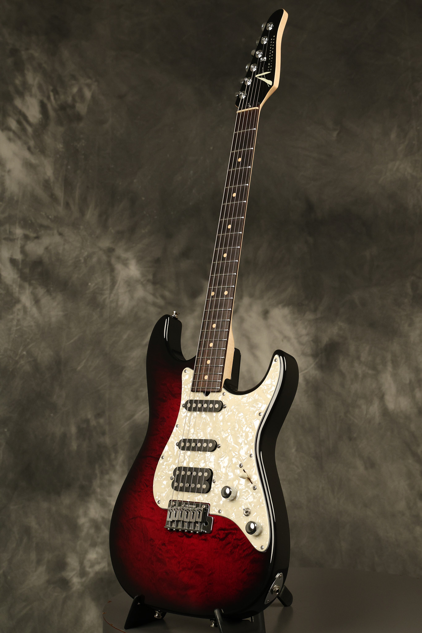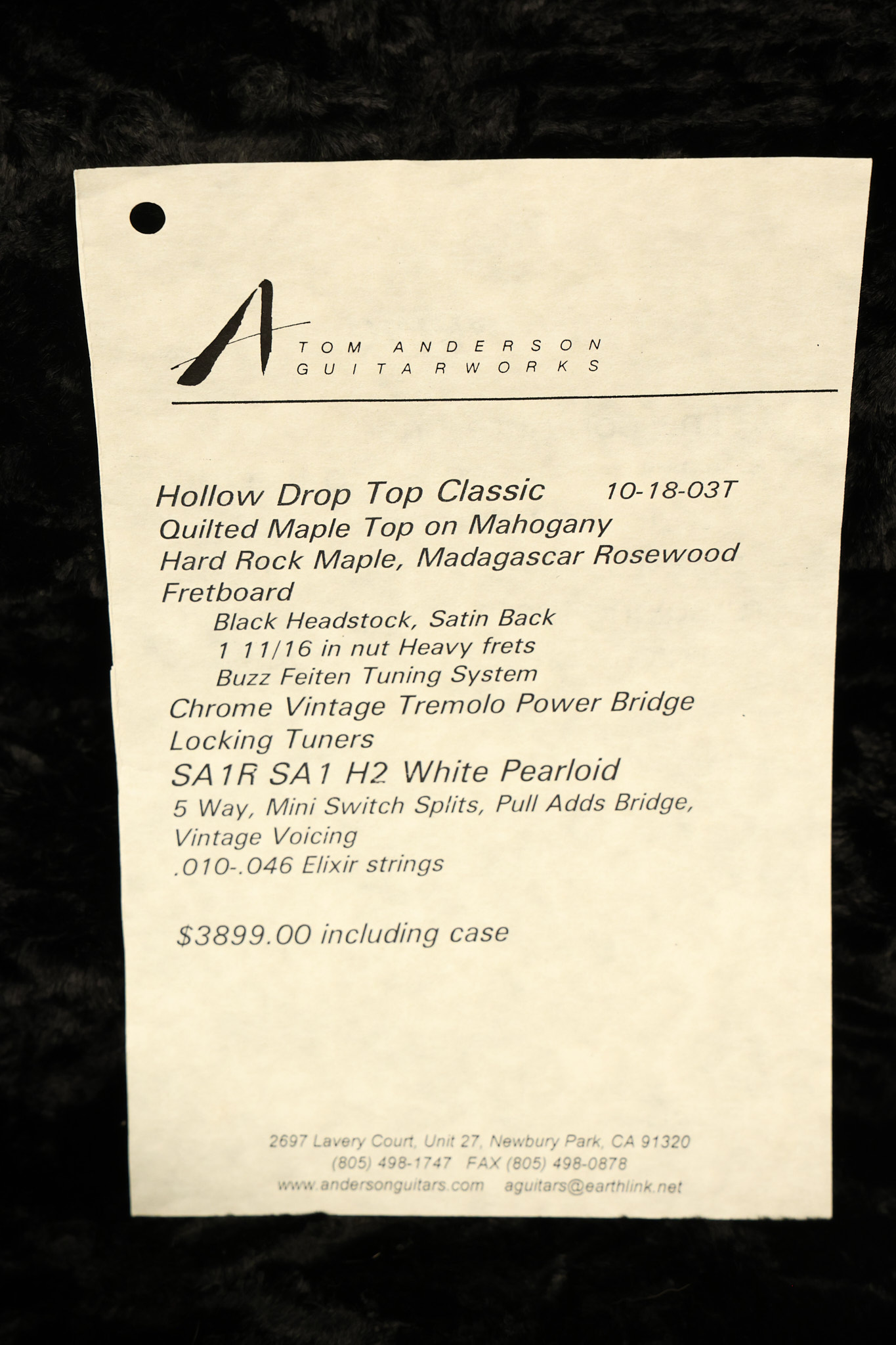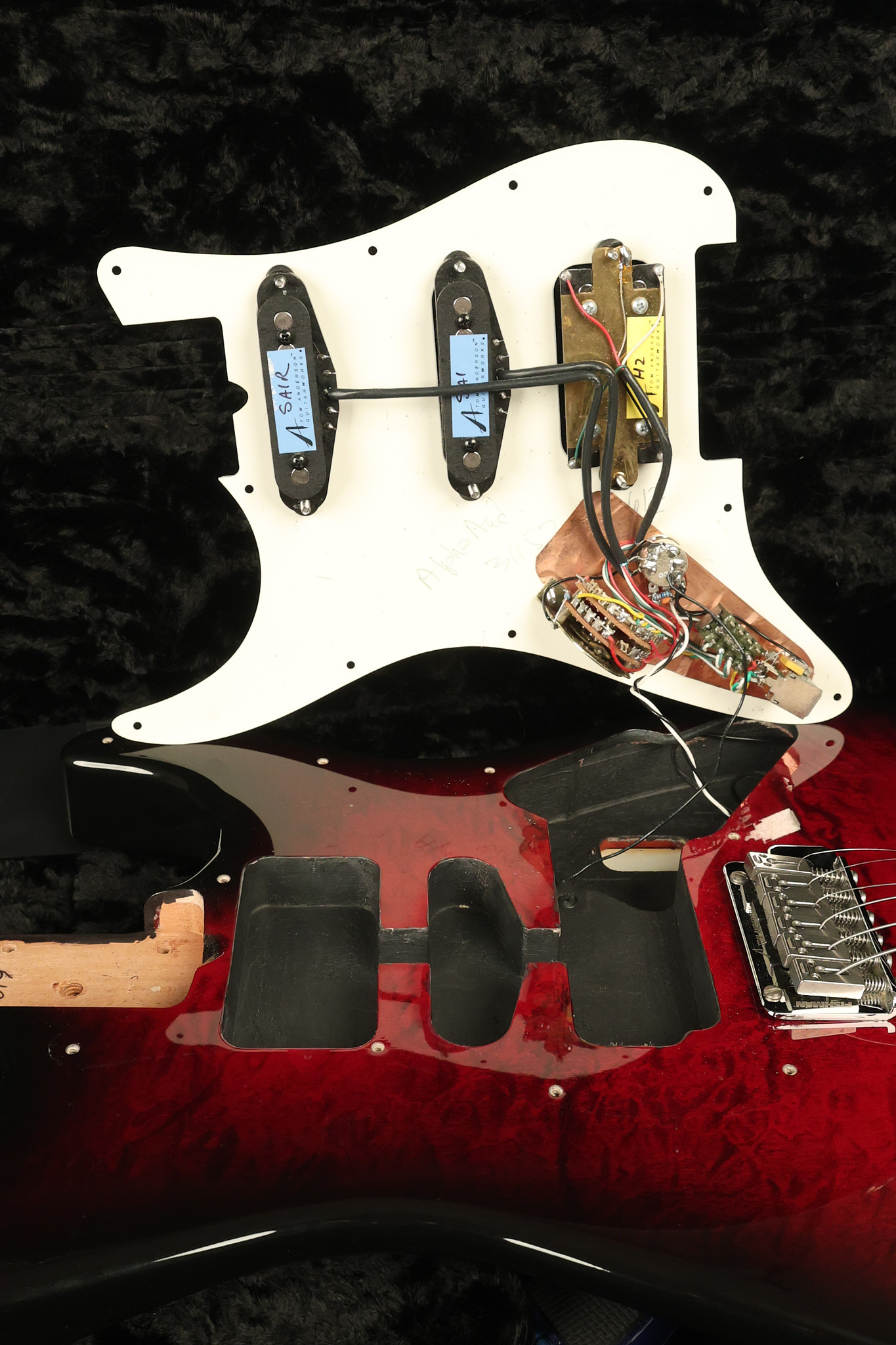 2003 Tom Anderson Drop Top Classic in Cajun Red to Black Burst with a quilted maple top. It has a great playing neck with great frets. It's all original and 100% complete along with its original hardshell case and spec sheet. It's in NEAR MINT condition with only very little barely noticeable surface wear. Everything remains structurally sound with no cracks, breaks or repairs. All electronics work and sound great.