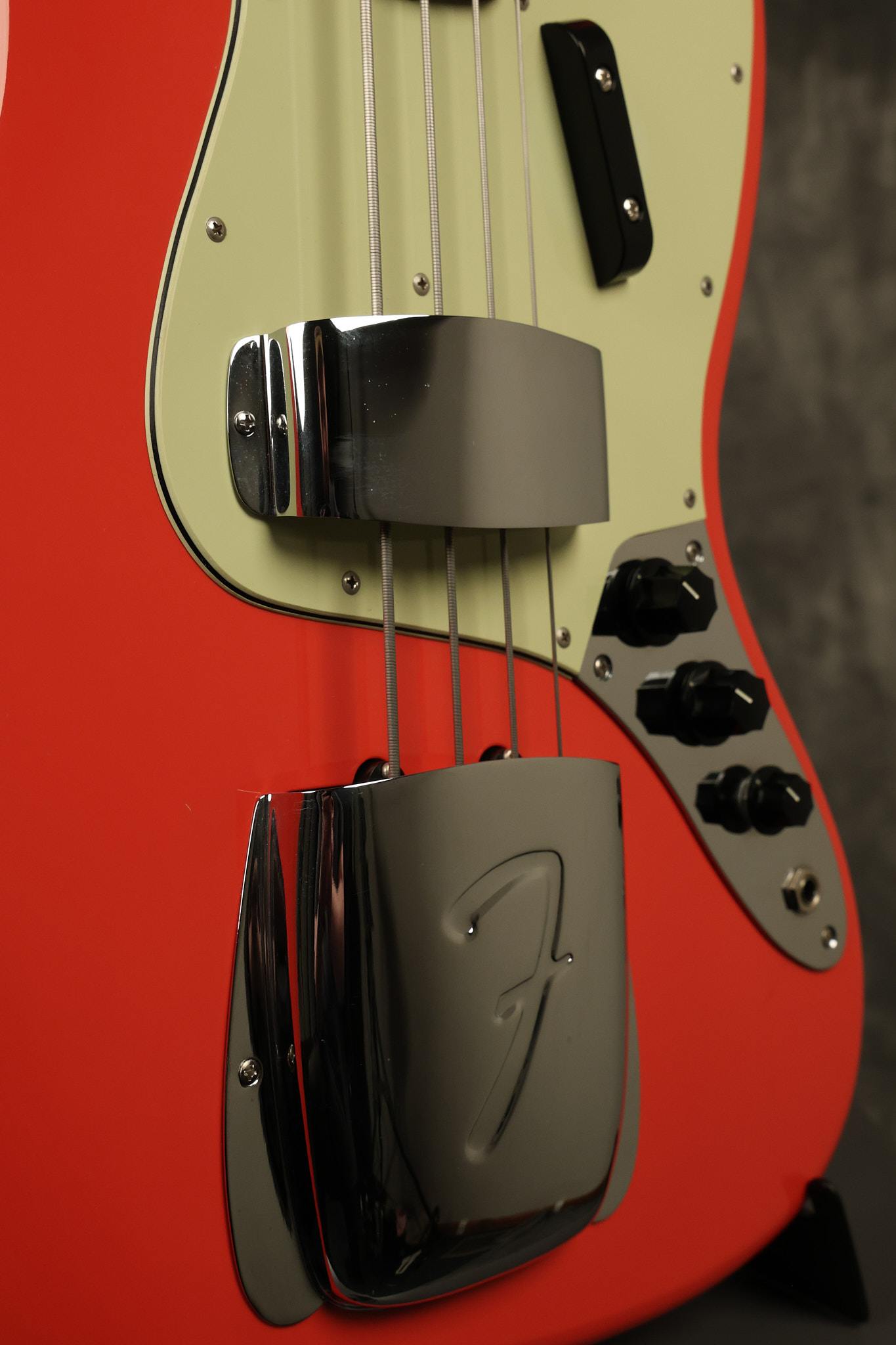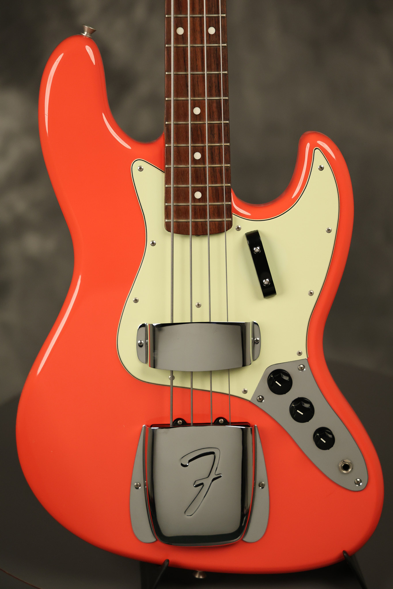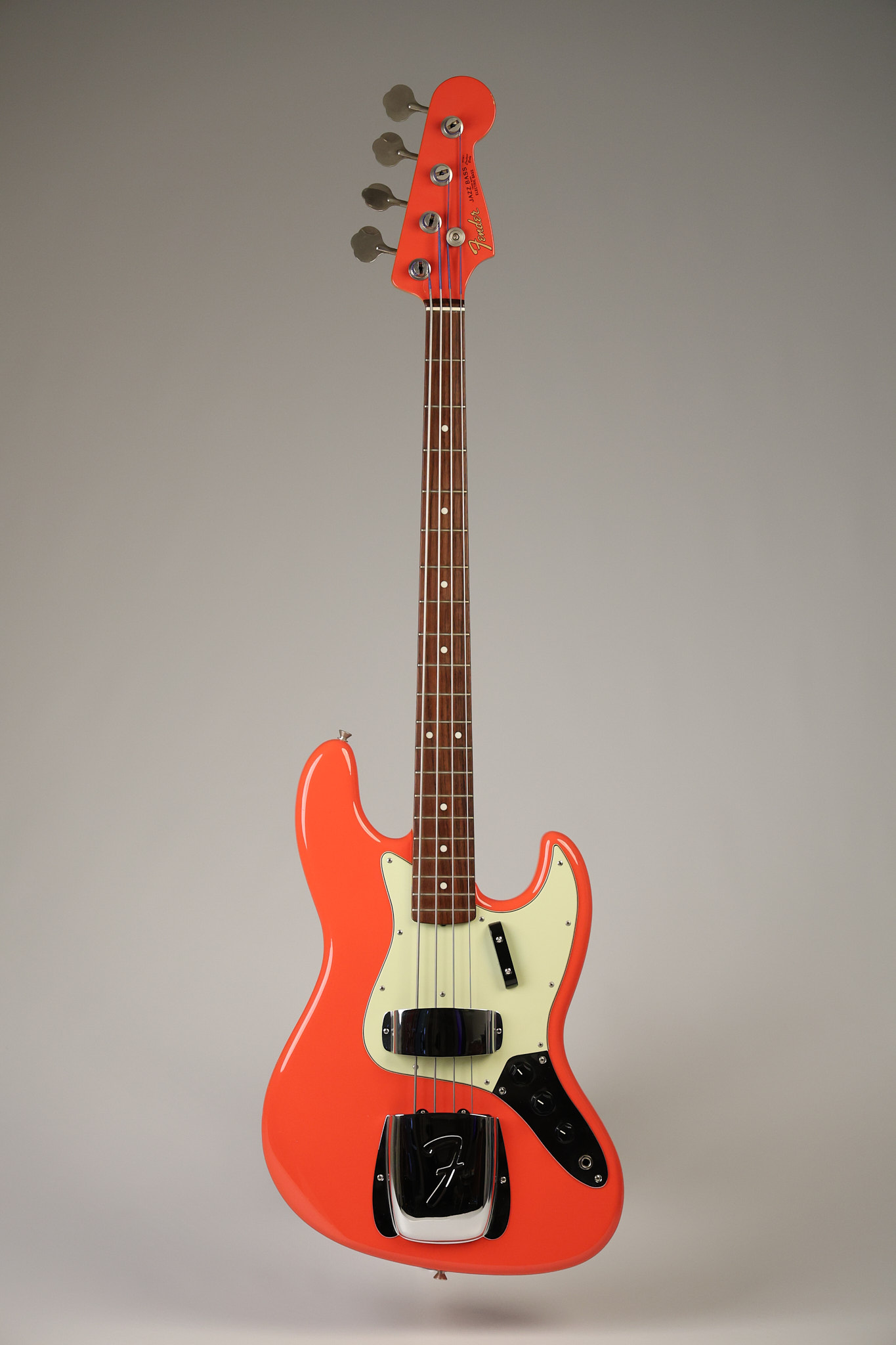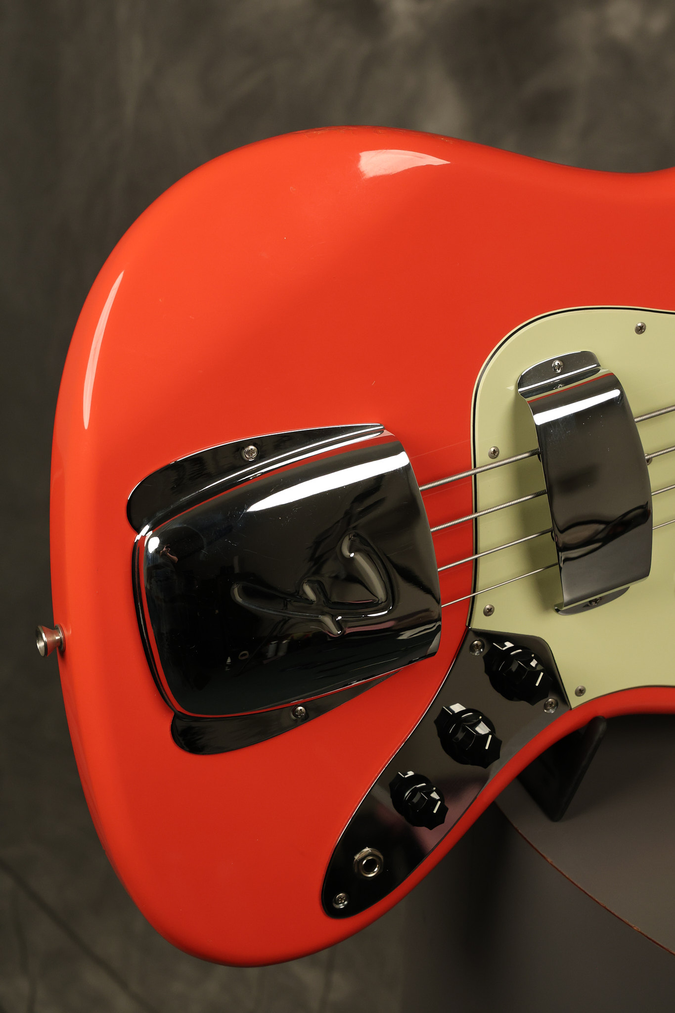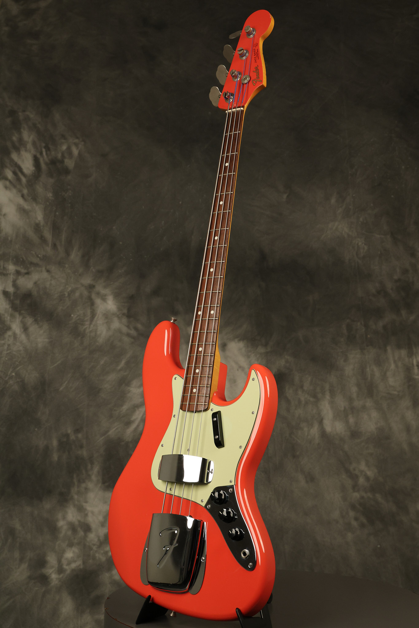 2005 Fender Crafted in Japan '62 Reissue Jazz Bass in Fiesta Red. It has a great playing neck with great frets. It's all original and 100% complete along with its original hardshell case. It's in EXCELLENT condition with only a couple of small surface blemsihes, including finish cracks on the lower bass side contour of the body, and a few small marks on the underside of the headstock. Everything remains structurally sound with no breaks or repairs. All electronics work and sound great.