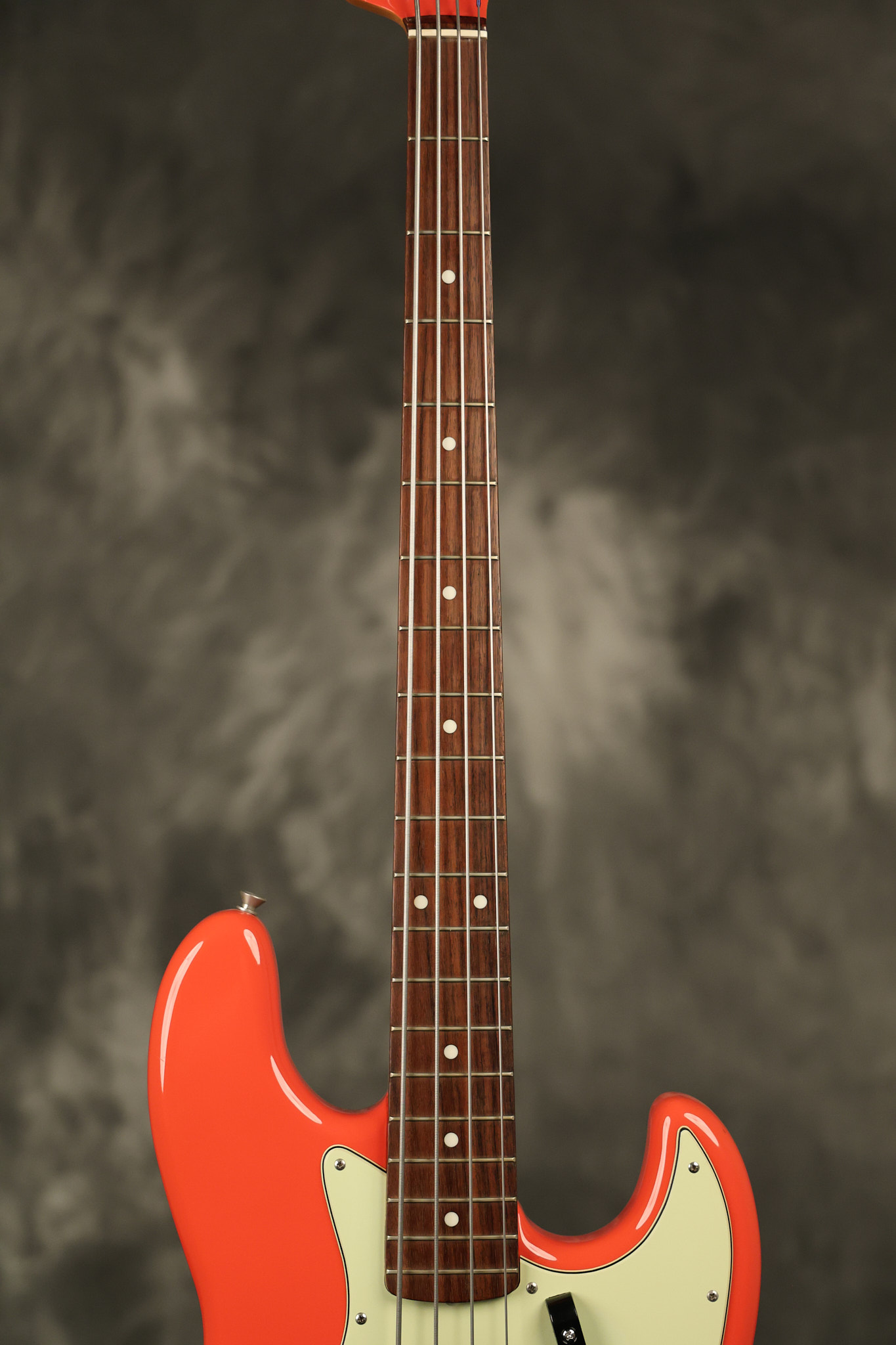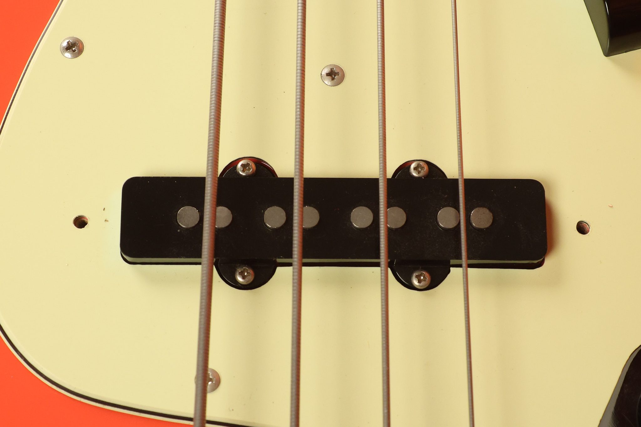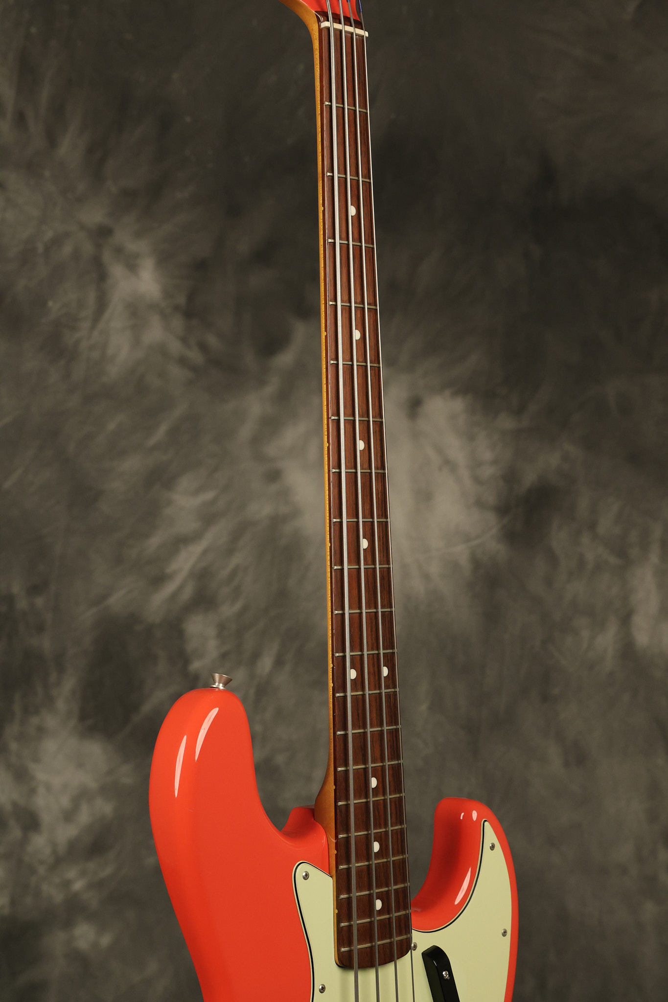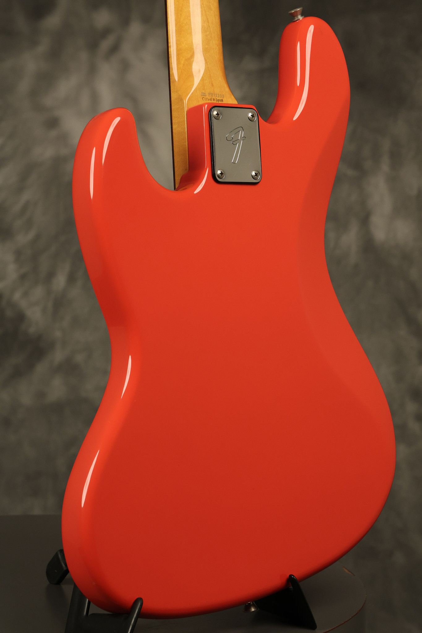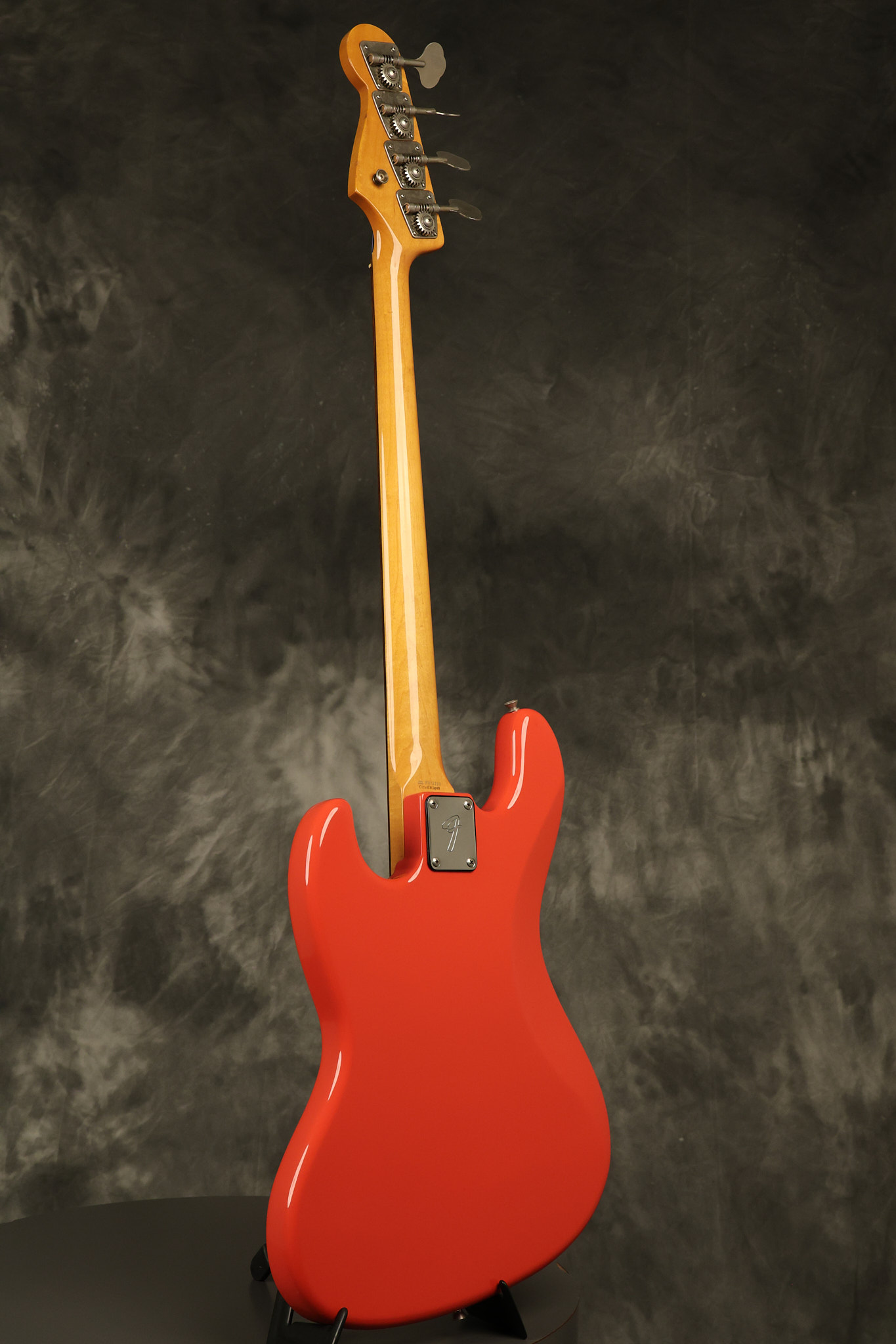 2005 Fender Crafted in Japan '62 Reissue Jazz Bass in Fiesta Red. It has a great playing neck with great frets. It's all original and 100% complete along with its original hardshell case. It's in EXCELLENT condition with only a couple of small surface blemsihes, including finish cracks on the lower bass side contour of the body, and a few small marks on the underside of the headstock. Everything remains structurally sound with no breaks or repairs. All electronics work and sound great.
