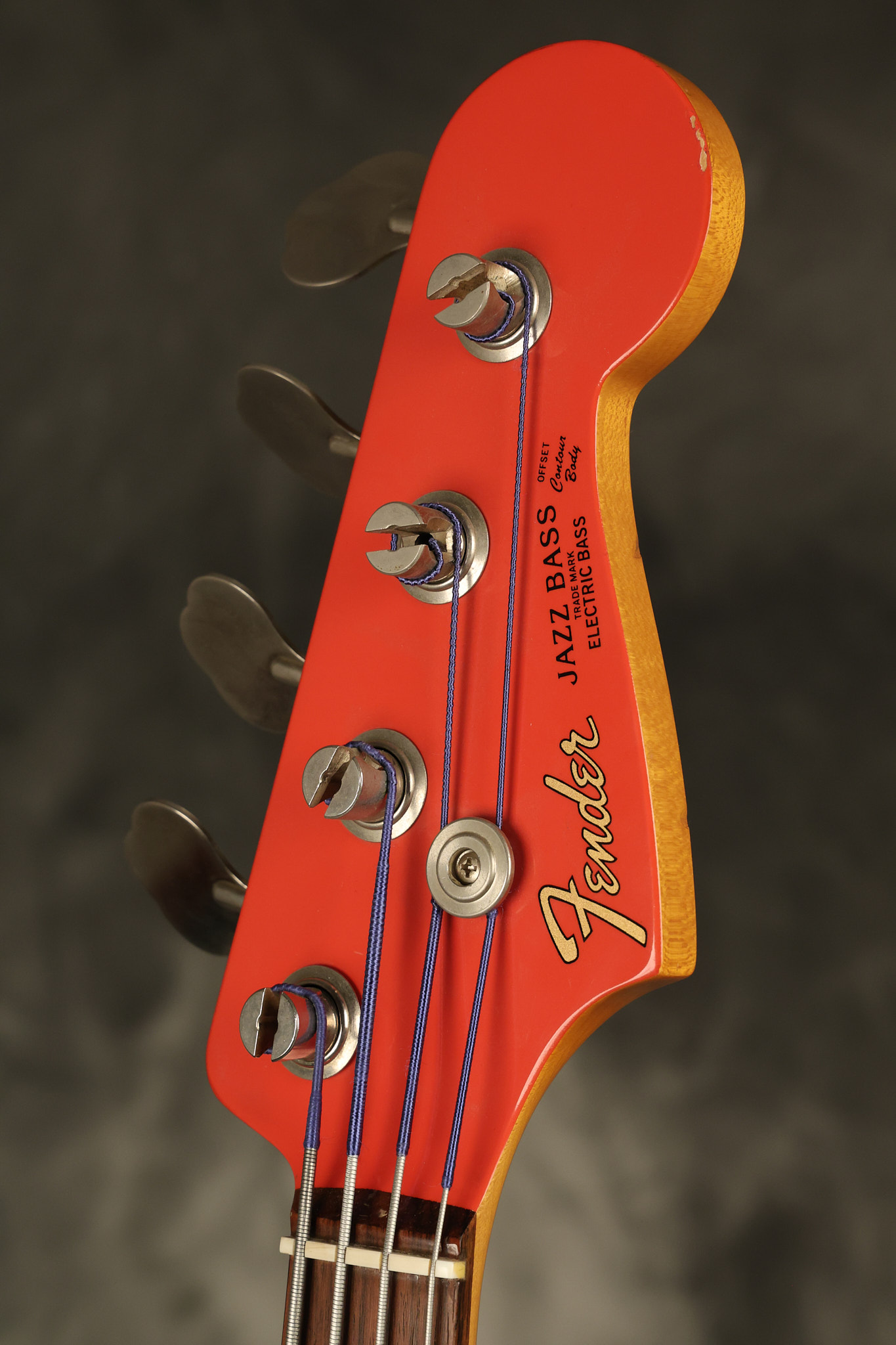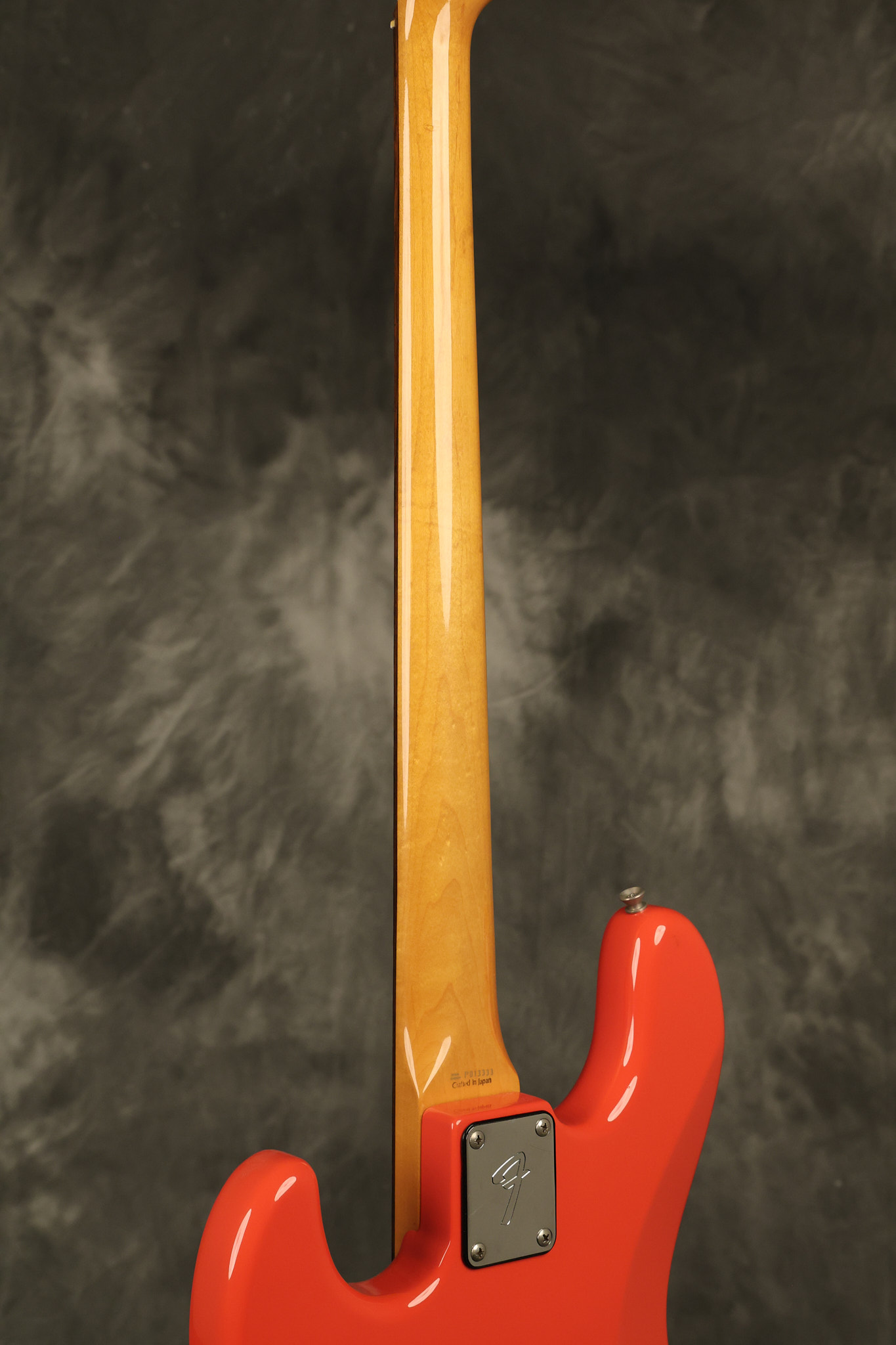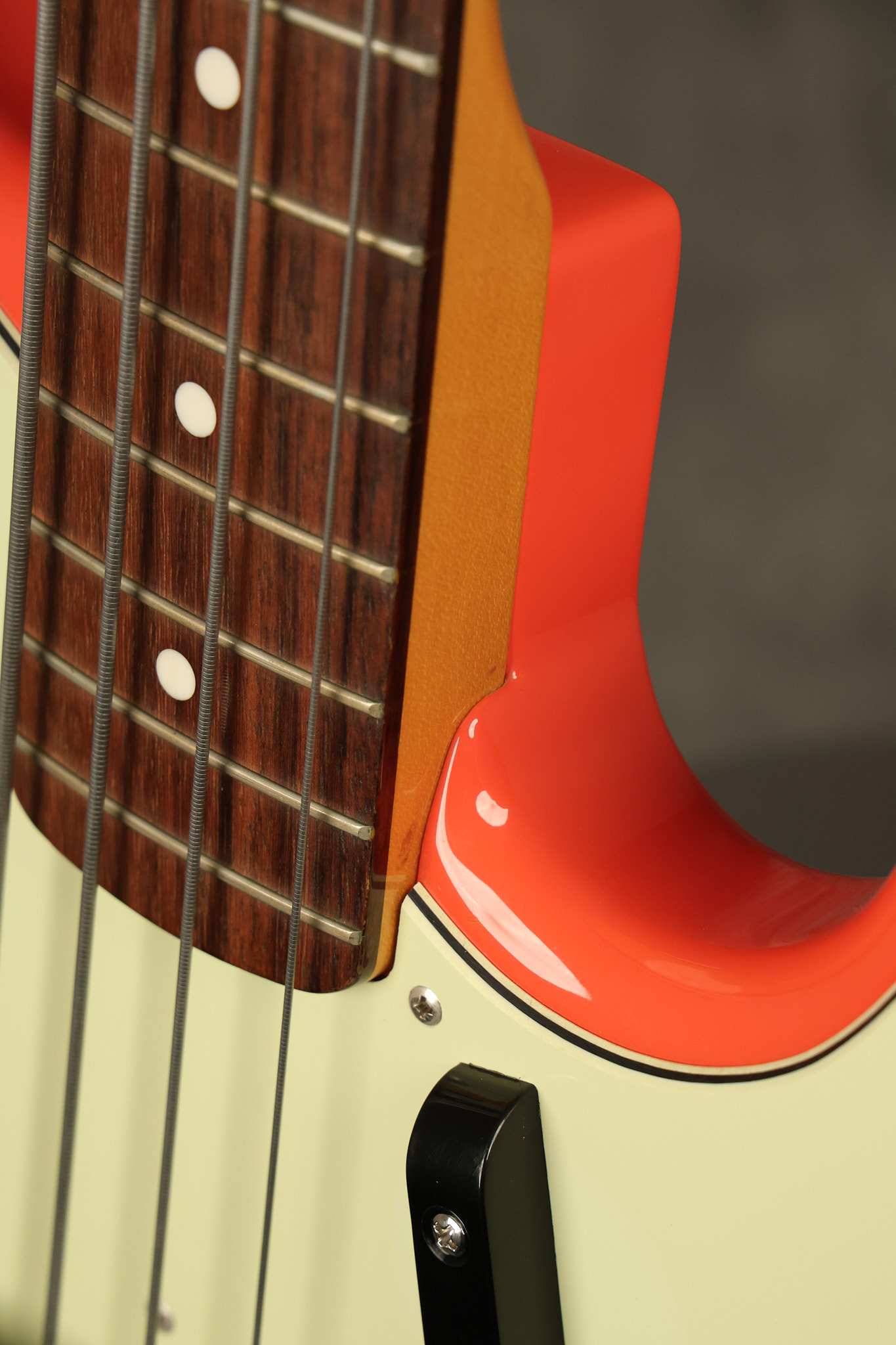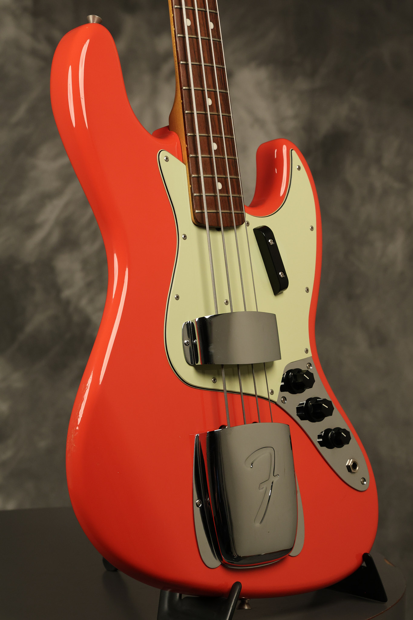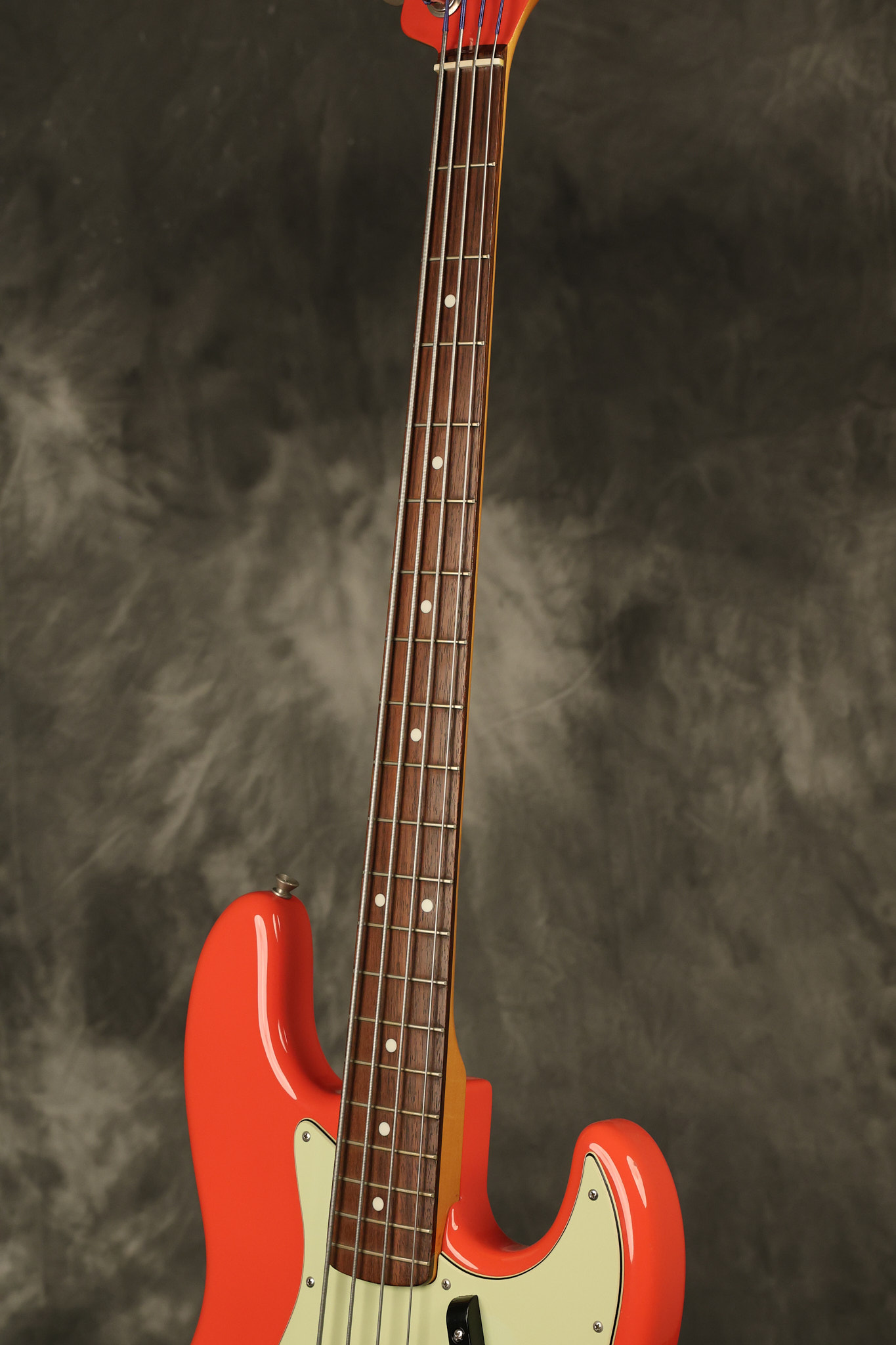 2005 Fender Crafted in Japan '62 Reissue Jazz Bass in Fiesta Red. It has a great playing neck with great frets. It's all original and 100% complete along with its original hardshell case. It's in EXCELLENT condition with only a couple of small surface blemsihes, including finish cracks on the lower bass side contour of the body, and a few small marks on the underside of the headstock. Everything remains structurally sound with no breaks or repairs. All electronics work and sound great.