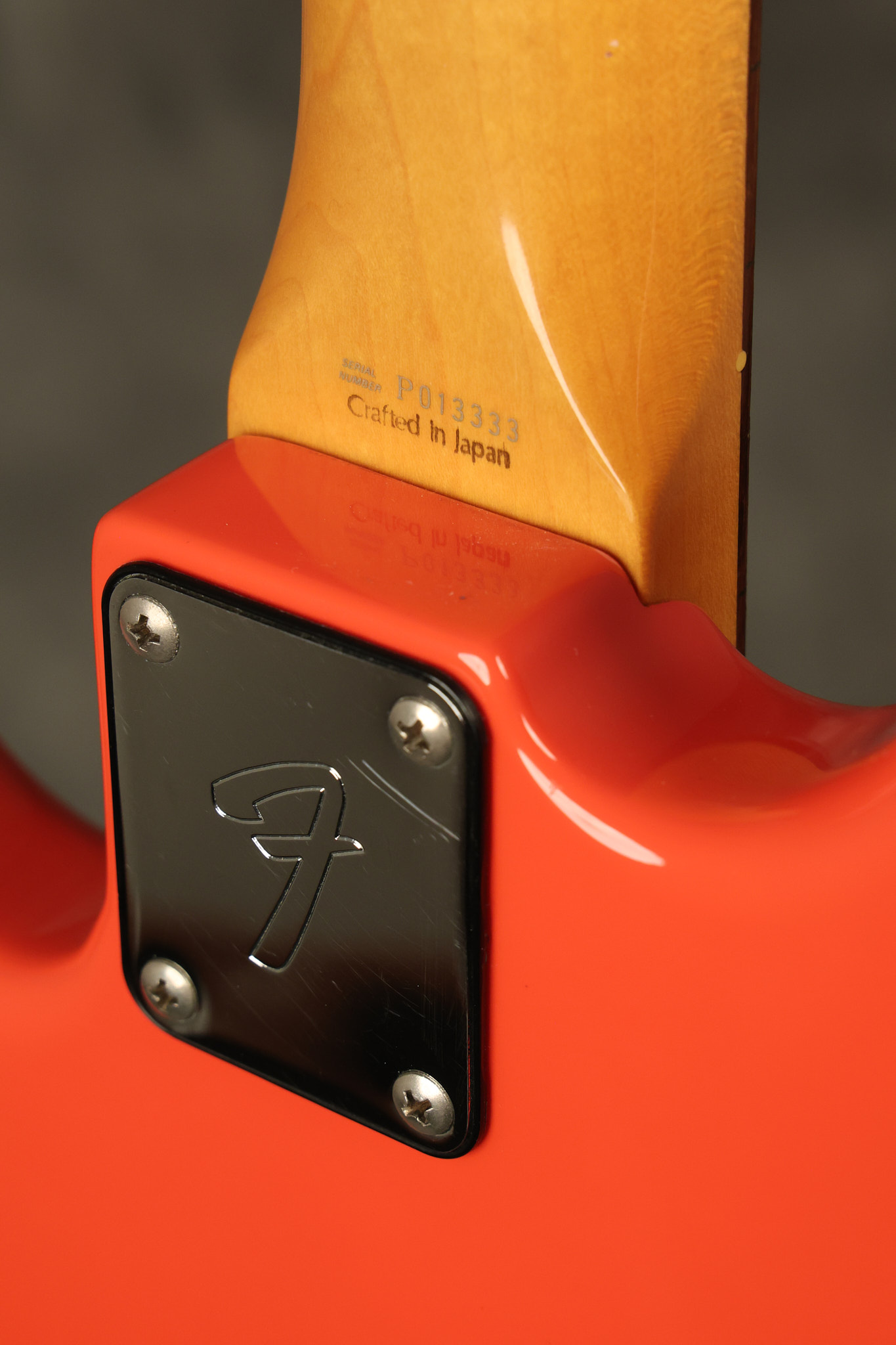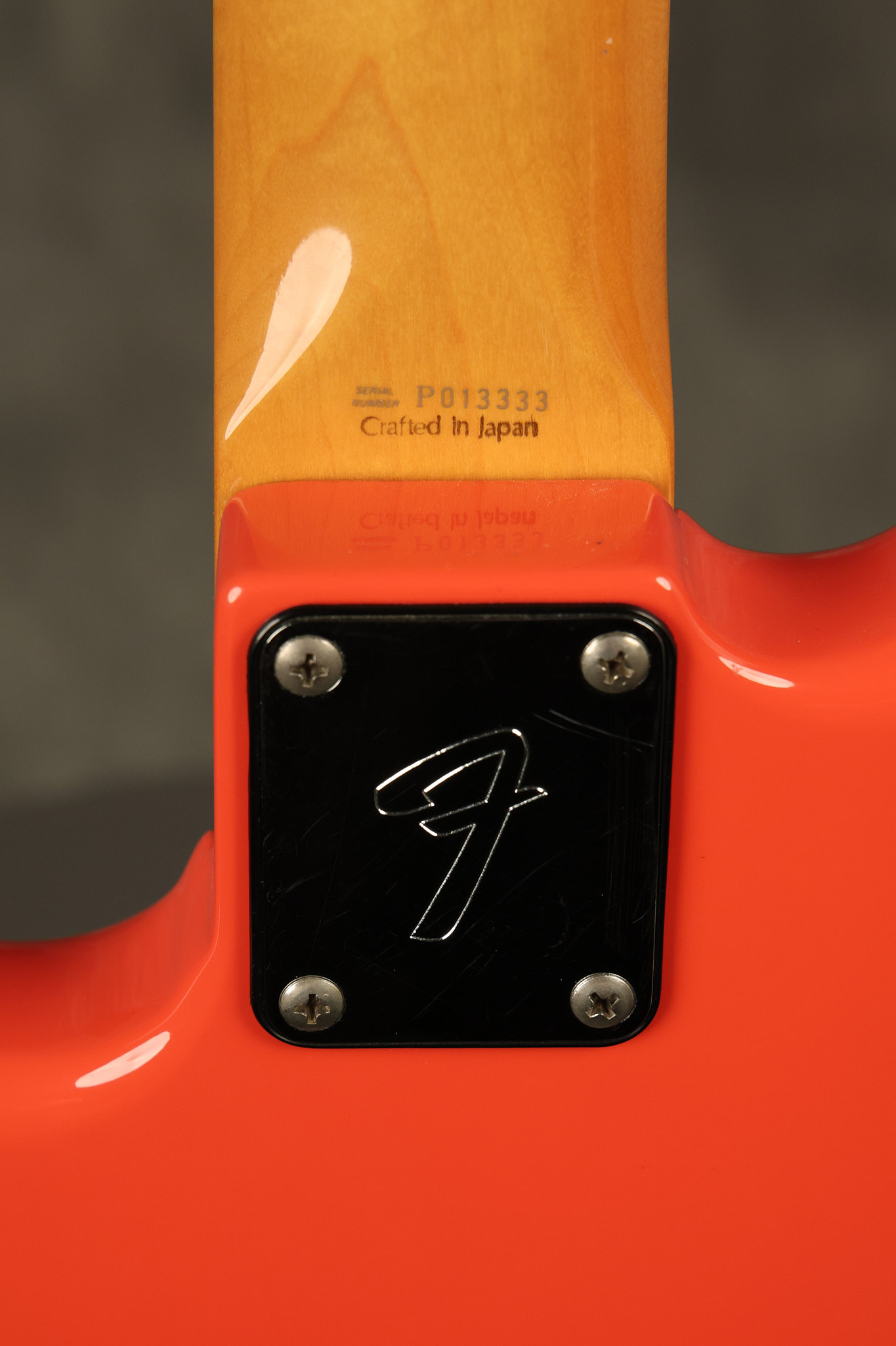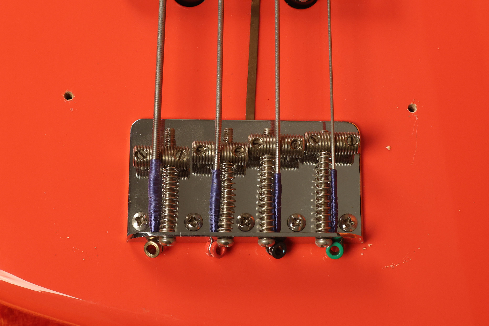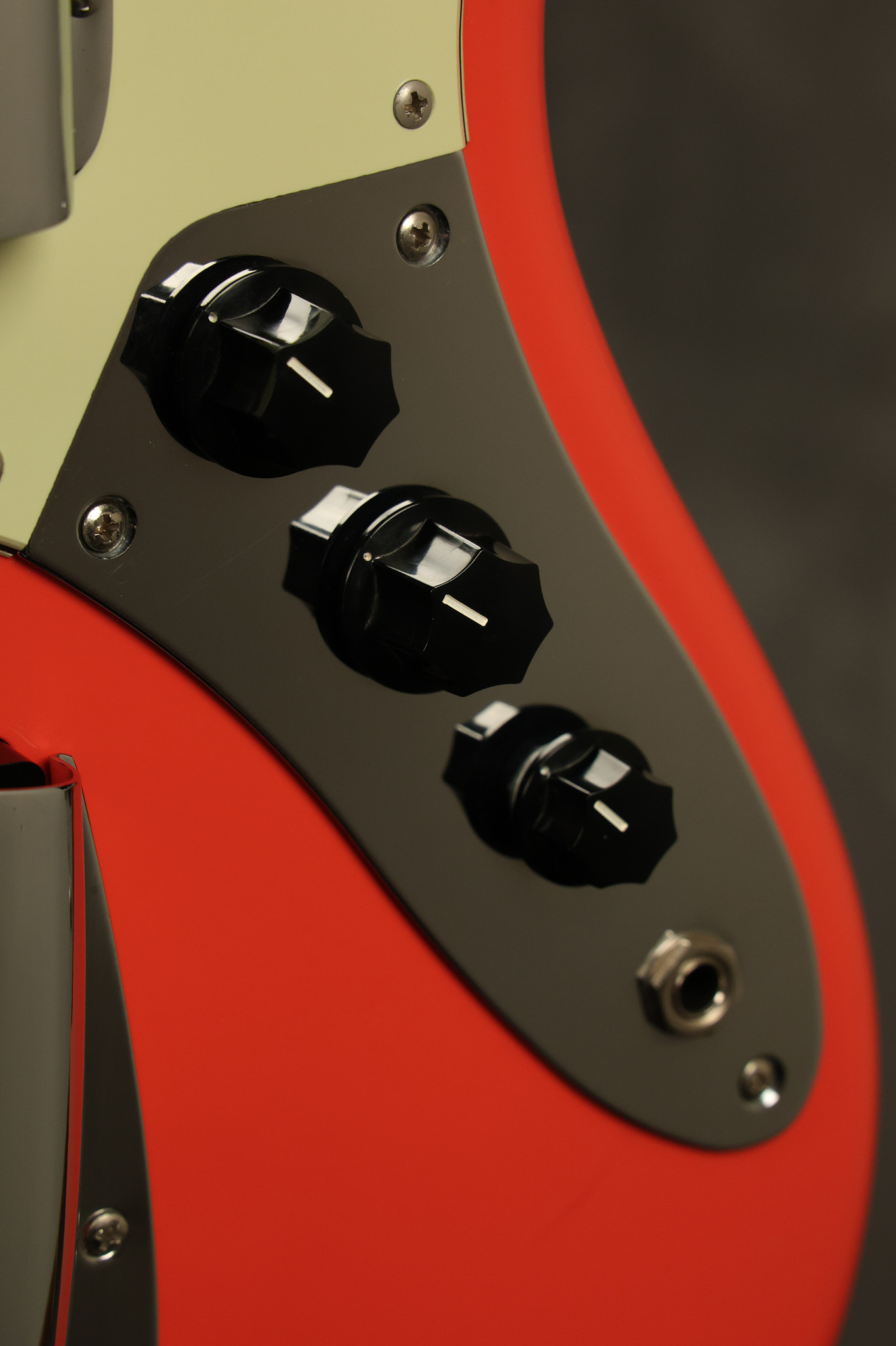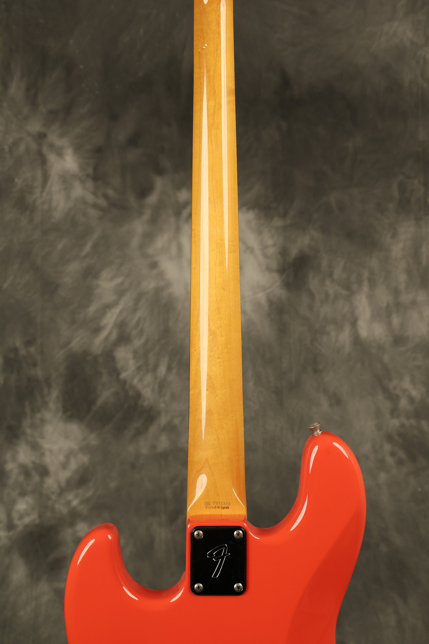2005 Fender Crafted in Japan '62 Reissue Jazz Bass in Fiesta Red. It has a great playing neck with great frets. It's all original and 100% complete along with its original hardshell case. It's in EXCELLENT condition with only a couple of small surface blemsihes, including finish cracks on the lower bass side contour of the body, and a few small marks on the underside of the headstock. Everything remains structurally sound with no breaks or repairs. All electronics work and sound great.