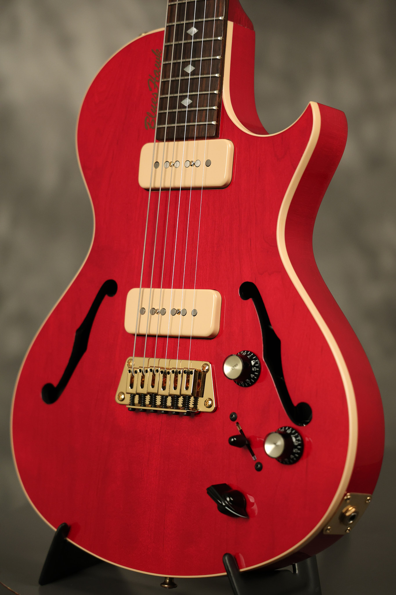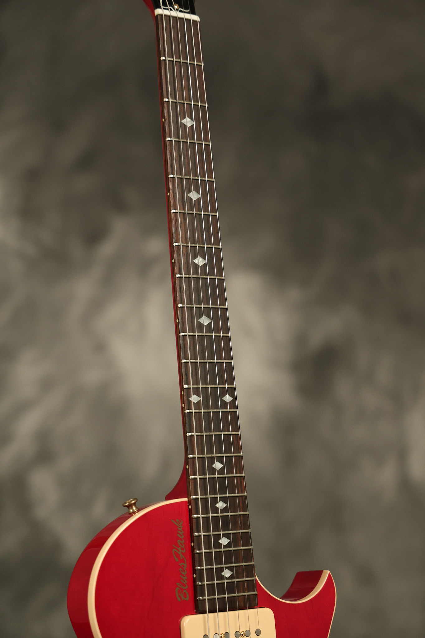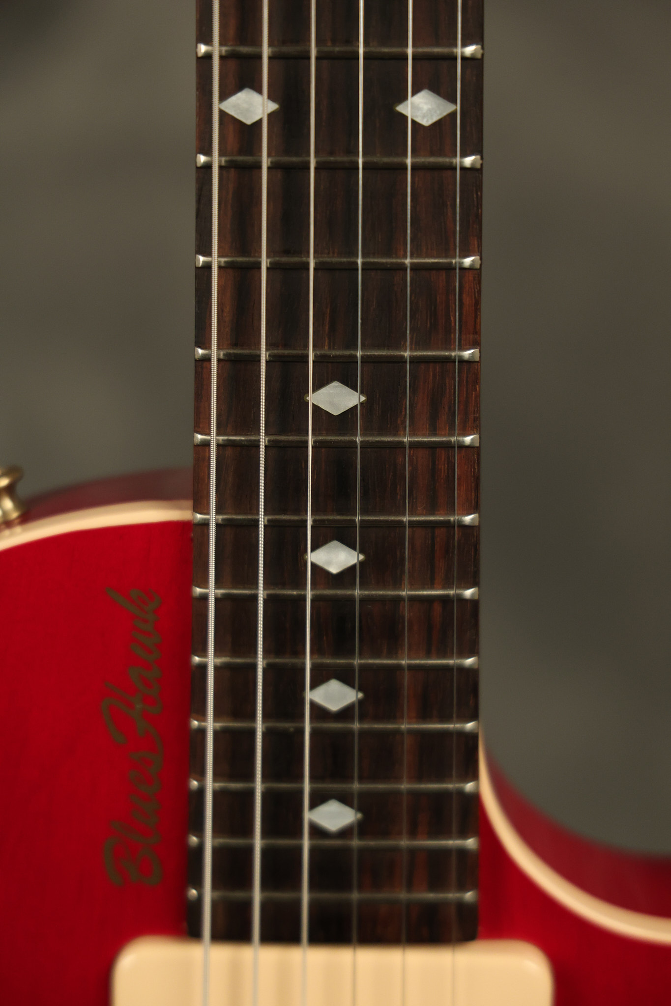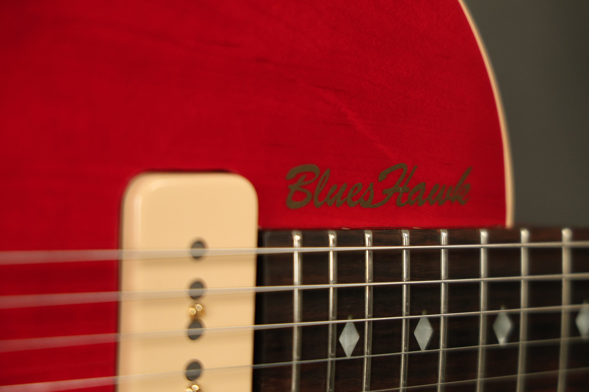 2005 Gibson Blueshawk in Heritage Cherry. It has a great playing neck with great frets. It's all original and 100% complete along with its original Gibson gigbag and papers. It's in NEAR MINT condition with only very little extremely minor cosmetic wear. The protective plastic is still on the back panels. Everything remains structurally sound with no cracks, breaks or repairs. All electronics work and sound great.
