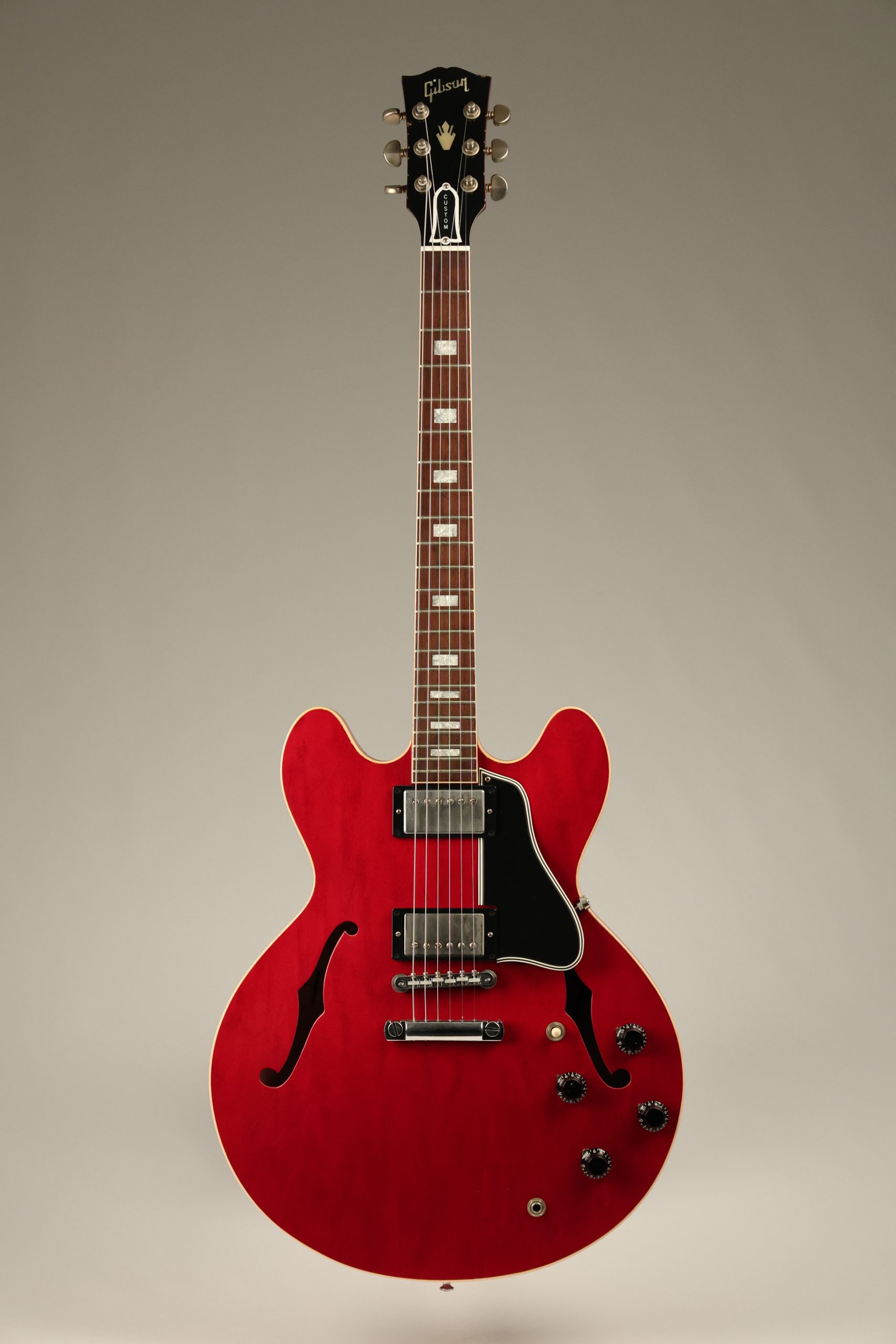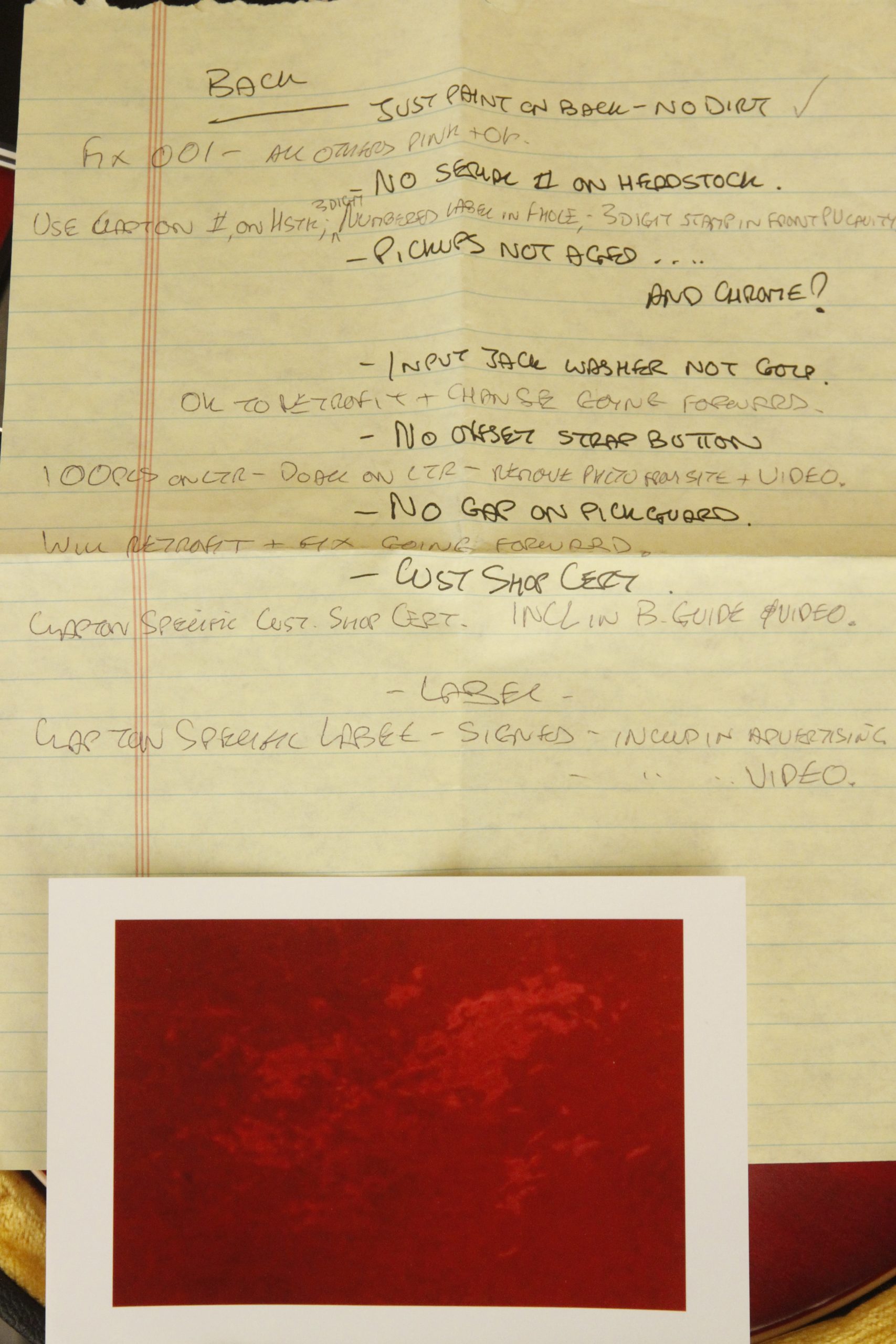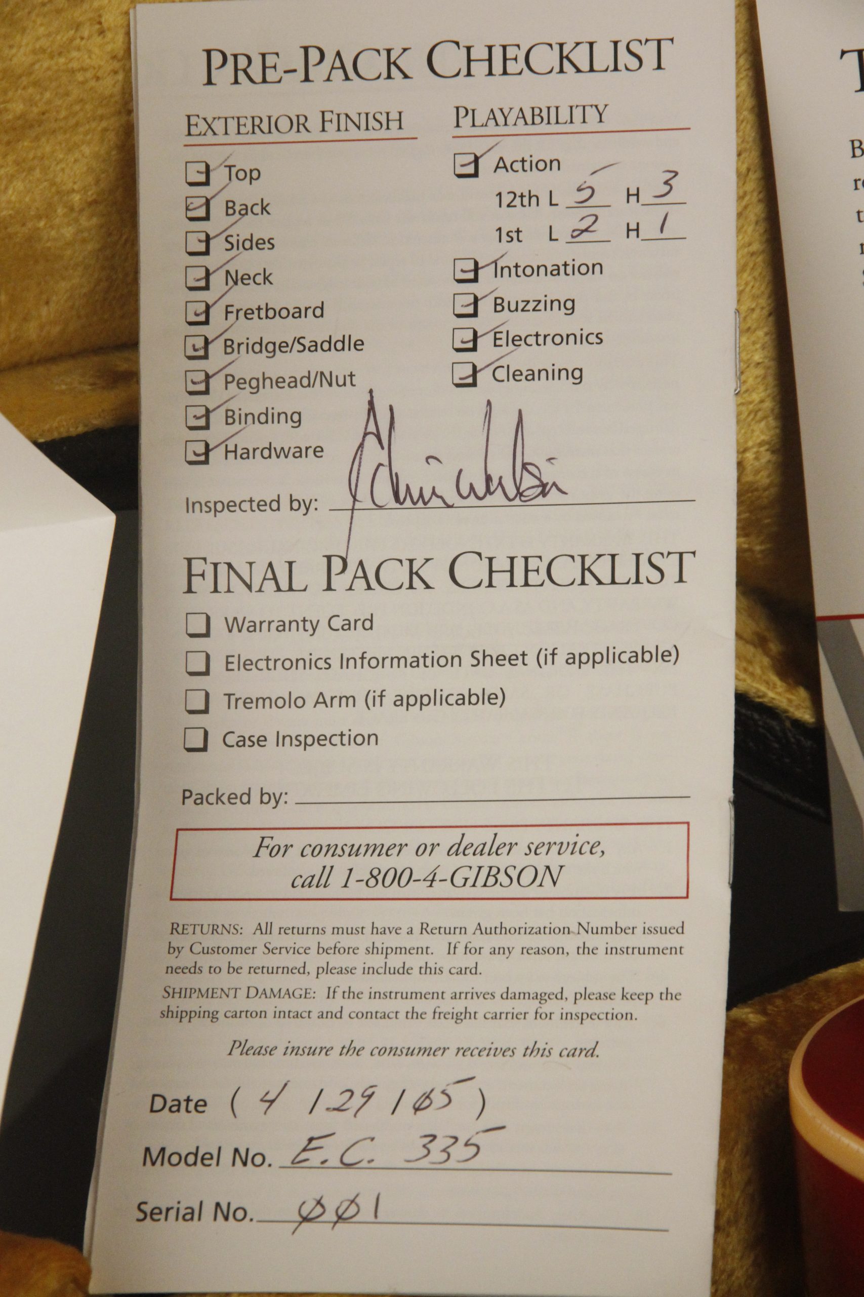 2005 Gibson Custom Shop Eric Clapton Crossroads '64 ES-335 replica. This is the first one from the numbered production of 175. Serial #001 with matching numbers on both certificates of authenticity, warranty card, preserved unapplied orange label, handwritten where label would be placed and stamped into the wood in the neck pickup cavity. The original replica hardshell case is included along with the "Making The Crossroads 335" DVD and a handwritten sheet of memos as the details were adjusted up to the production of #001. It's in EXCELLENT condition and all electronics work and sound great.
