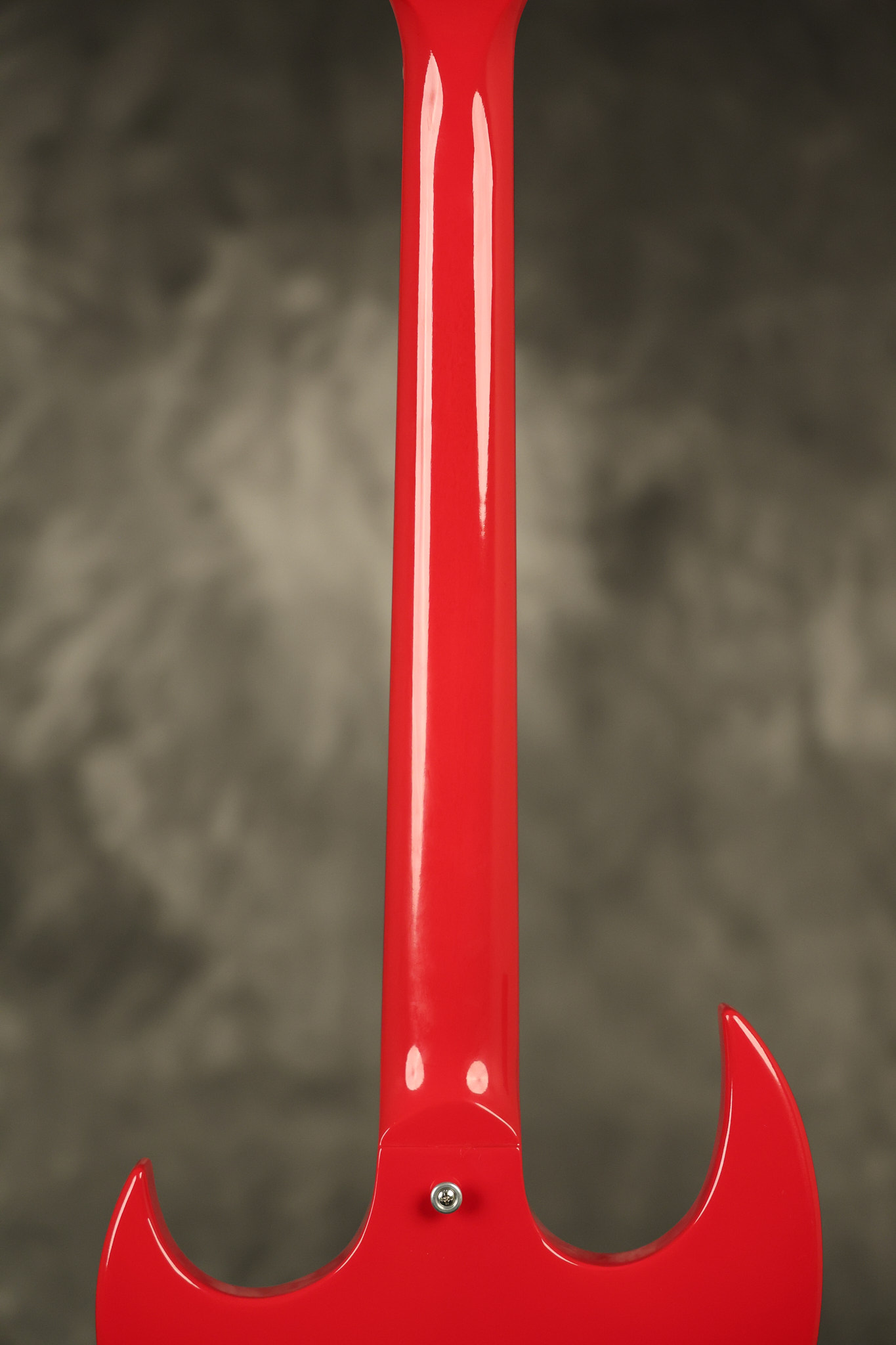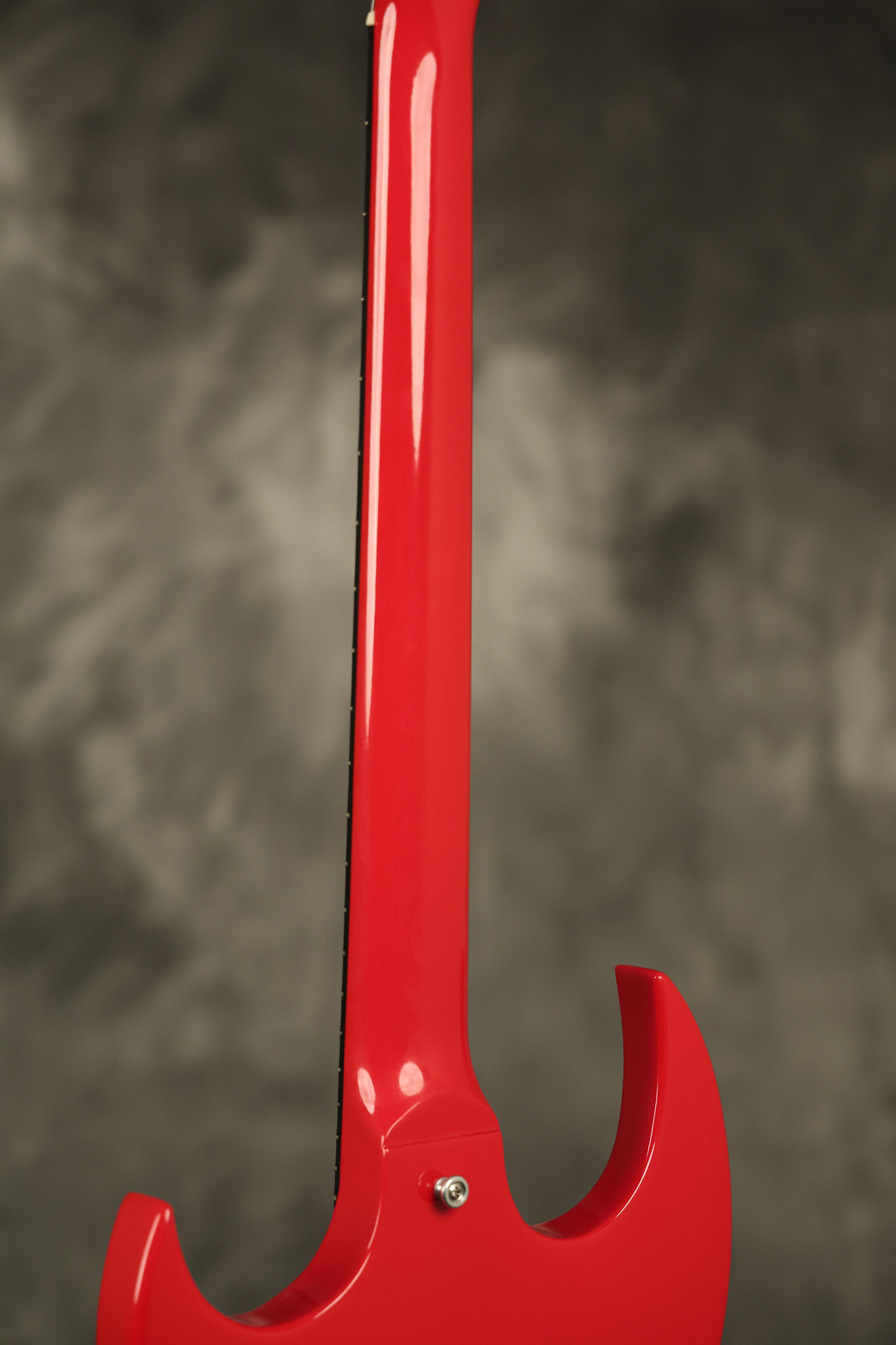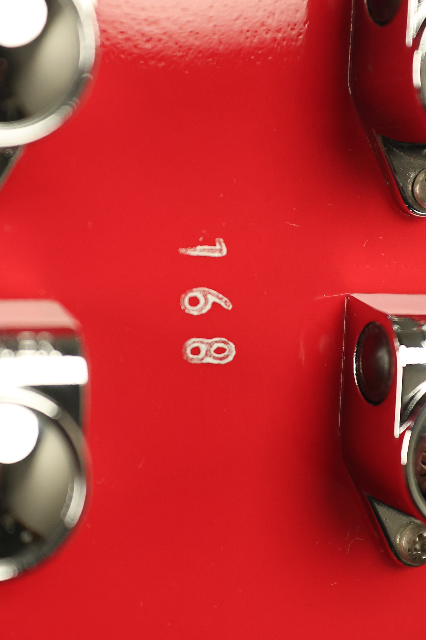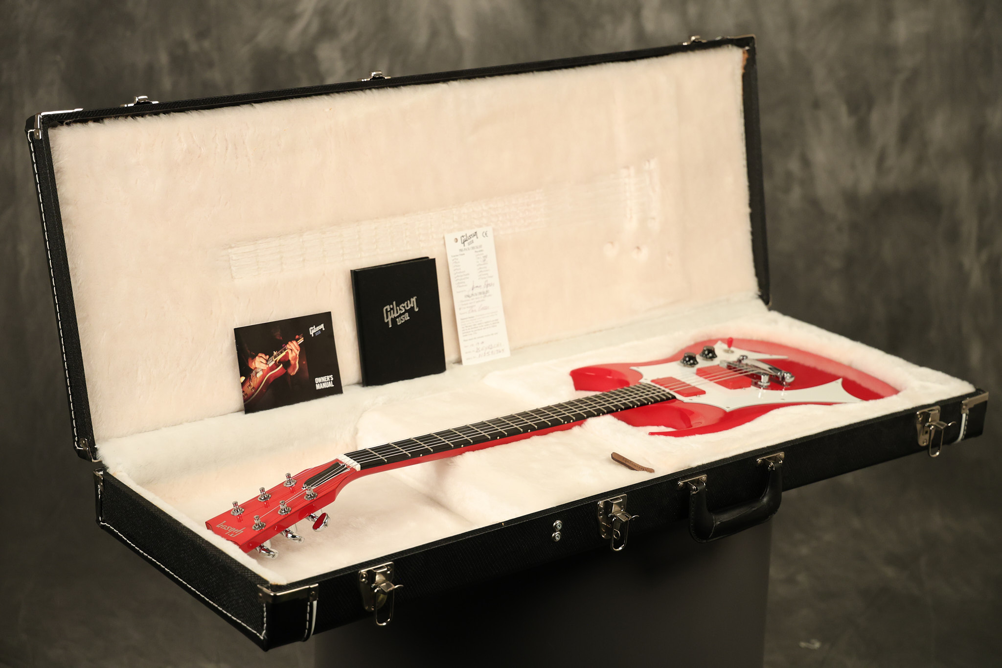 2009 Gibson Limited Run EYE guitar in Fire Engine Red. It has a great playing neck with great frets. It's all original and 100% complete along with its original certificate of authenticity and original hardshell case. It's in NEAR MINT condition with only very little extremely minor blemishes. The original protective plastic is still on the pickguard. Everything remains structurally sound with no cracks, breaks or repairs. All electronics work and sound great.