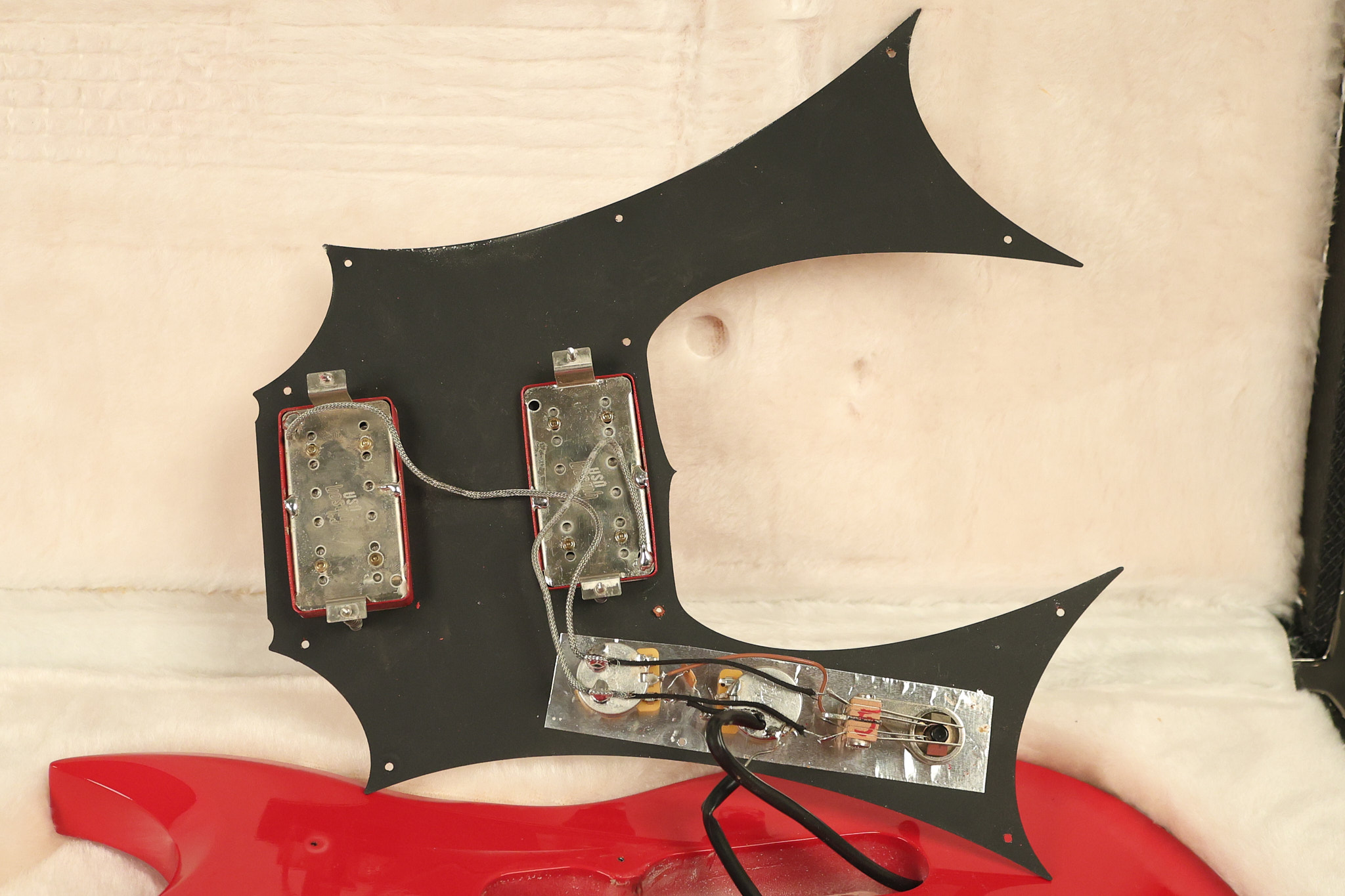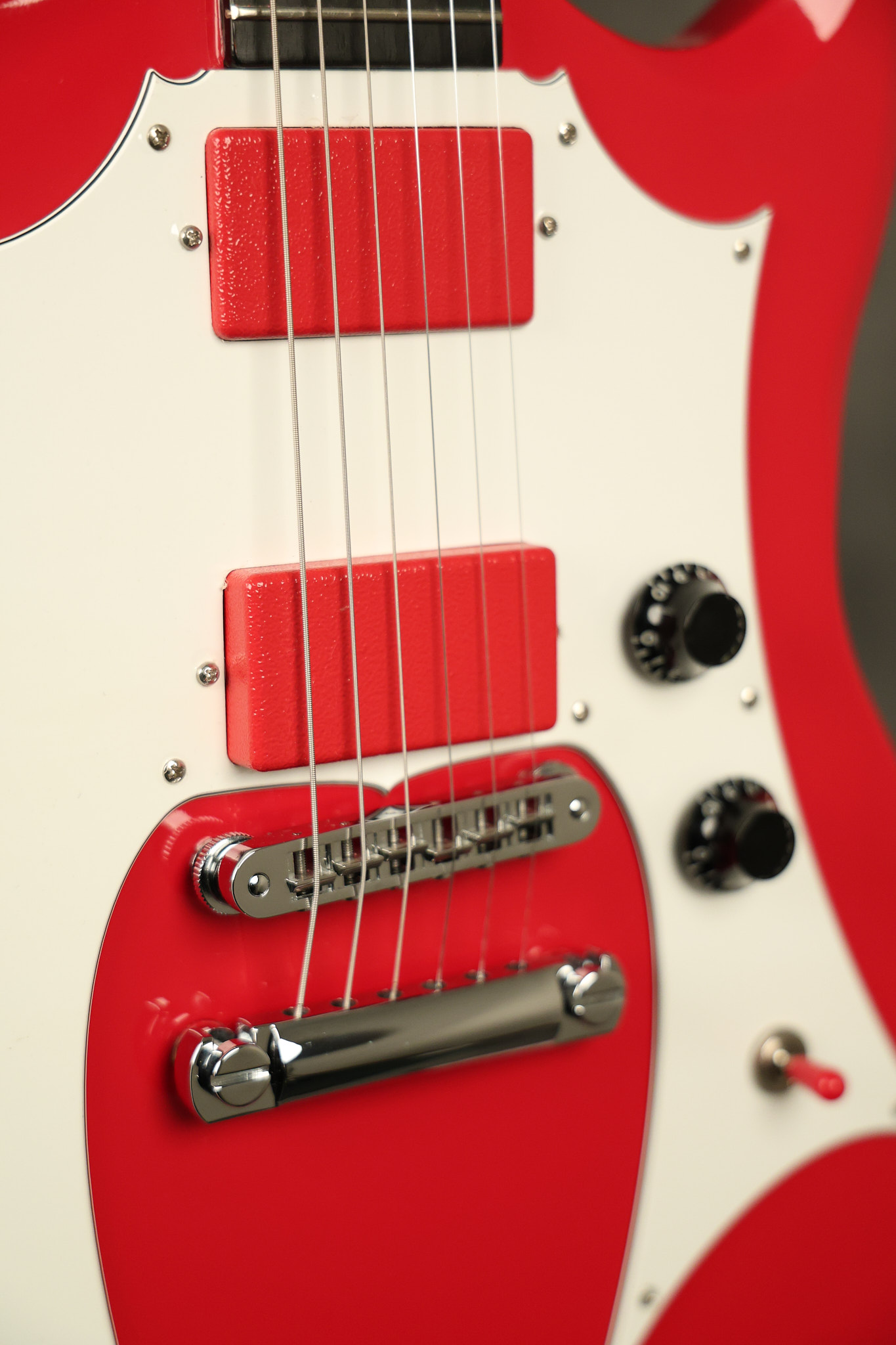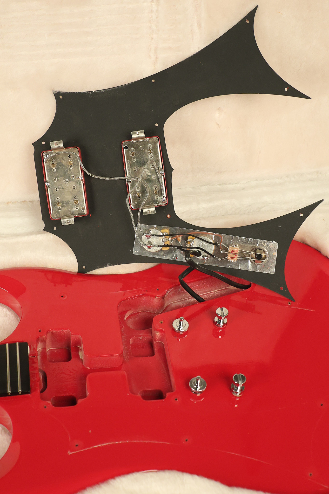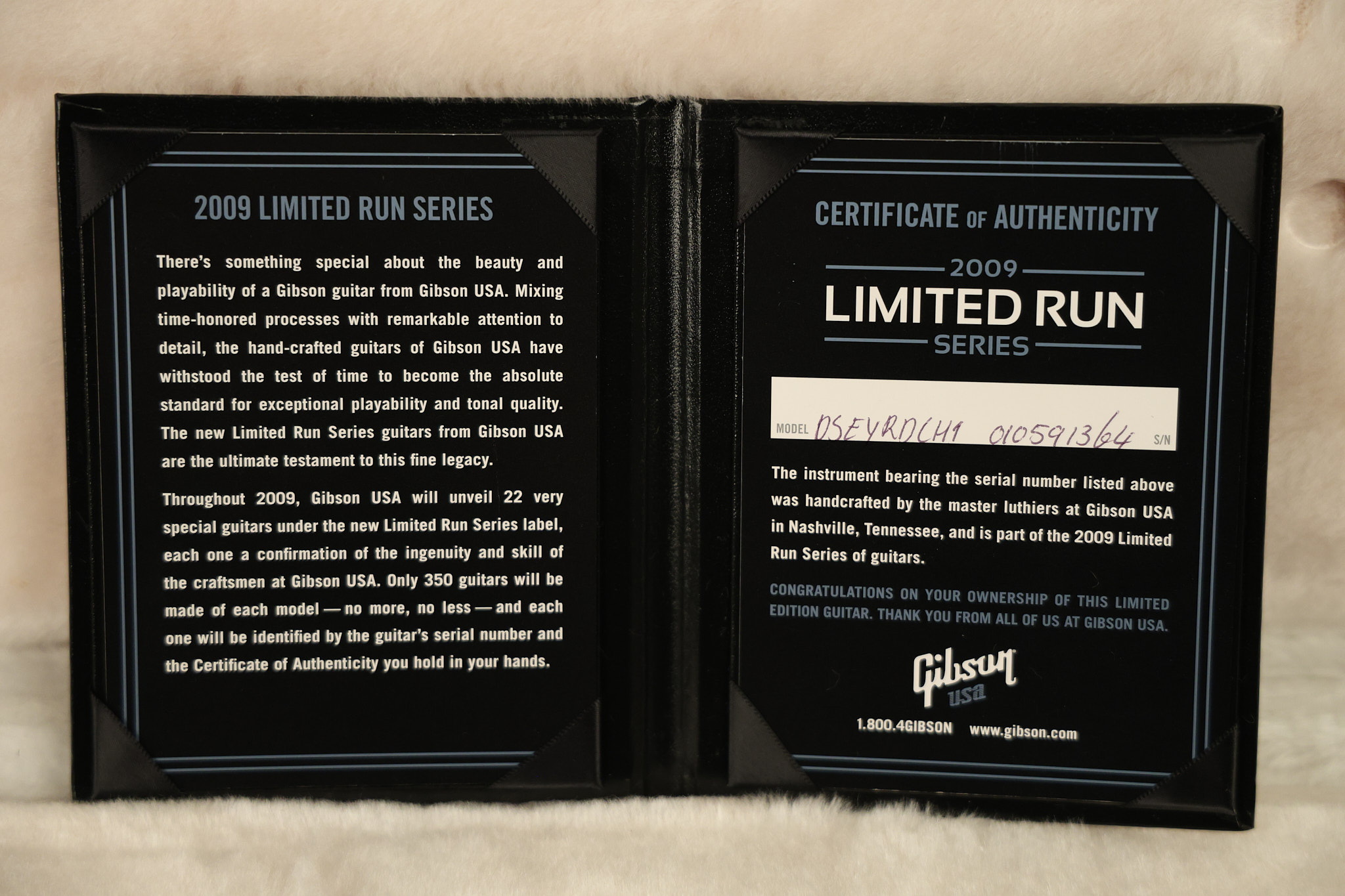 2009 Gibson Limited Run EYE guitar in Fire Engine Red. It has a great playing neck with great frets. It's all original and 100% complete along with its original certificate of authenticity and original hardshell case. It's in NEAR MINT condition with only very little extremely minor blemishes. The original protective plastic is still on the pickguard. Everything remains structurally sound with no cracks, breaks or repairs. All electronics work and sound great.