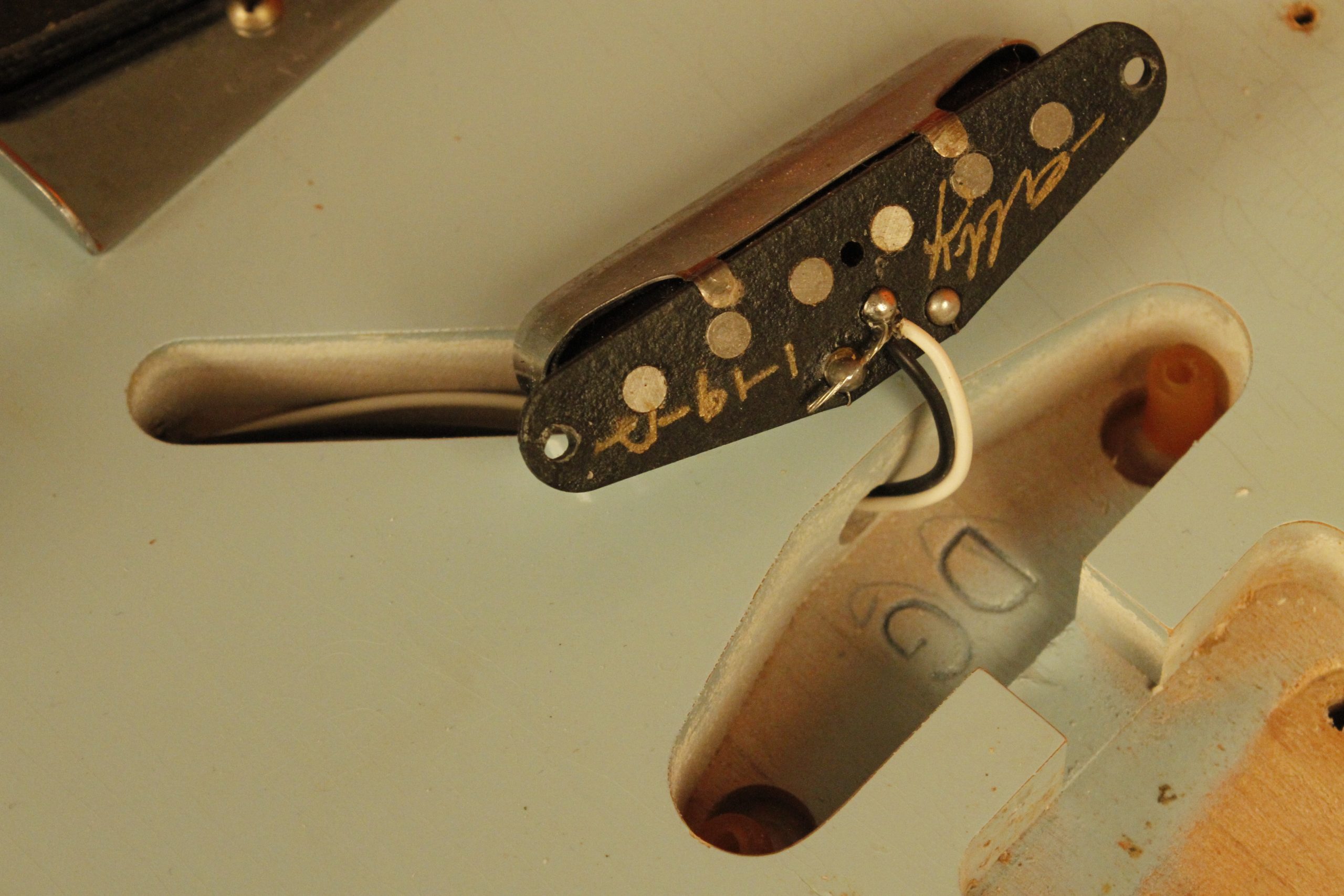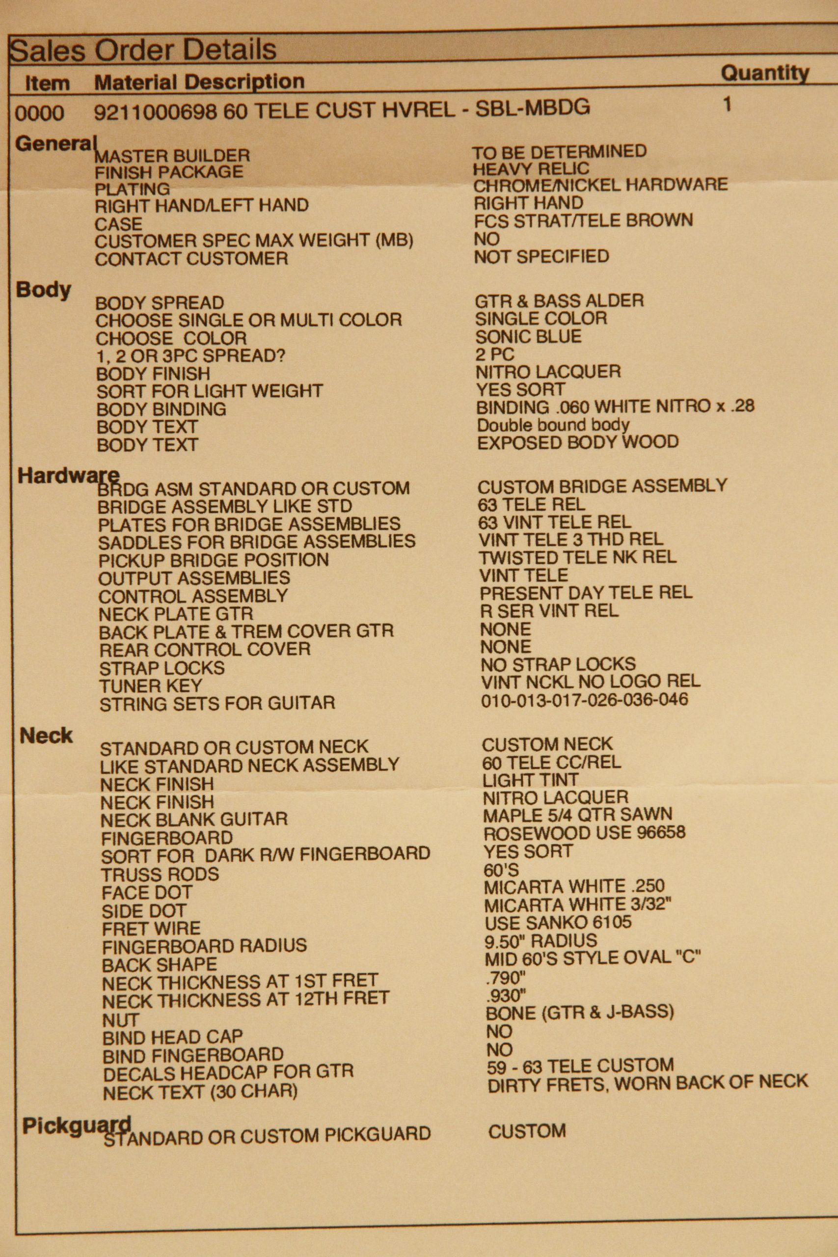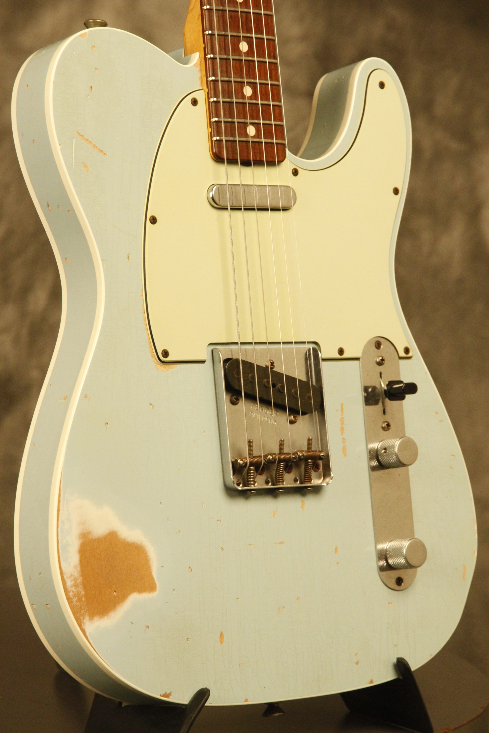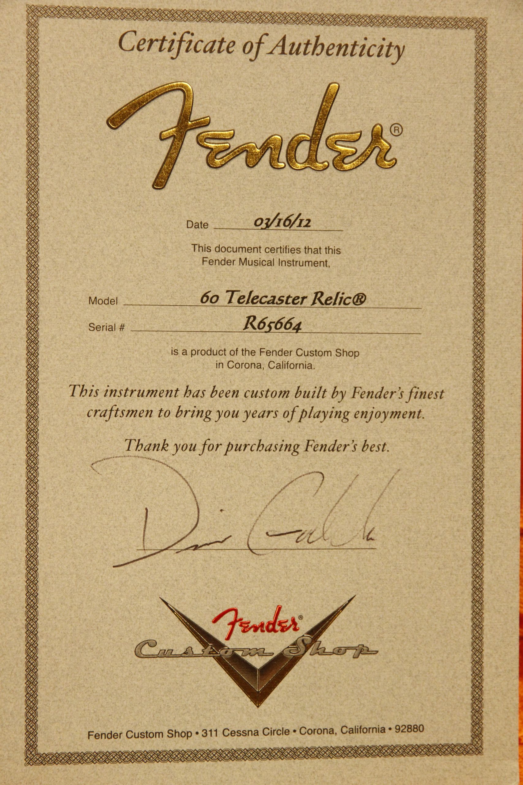 2012 Fender Dennis Galuszka Masterbuilt Custom Shop '60 Custom Telecaster Heavy Relic in Sonic Blue. It has a great playing neck with great frets. It's all original with the exception of one added ground wire and is 100% complete along with its original hardshell case and certificate of authenticity. It's in EXCELLENT condition and remains structurally sound with no cracks, breaks or repairs. All electronics work and sound great with factory pickups wound by Abigail Ybarra.