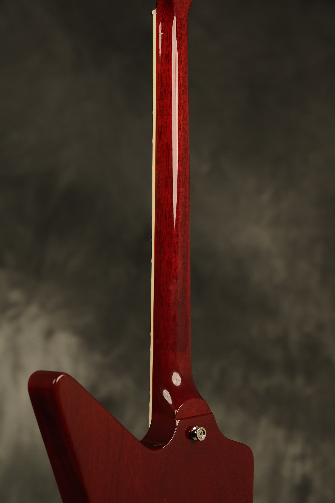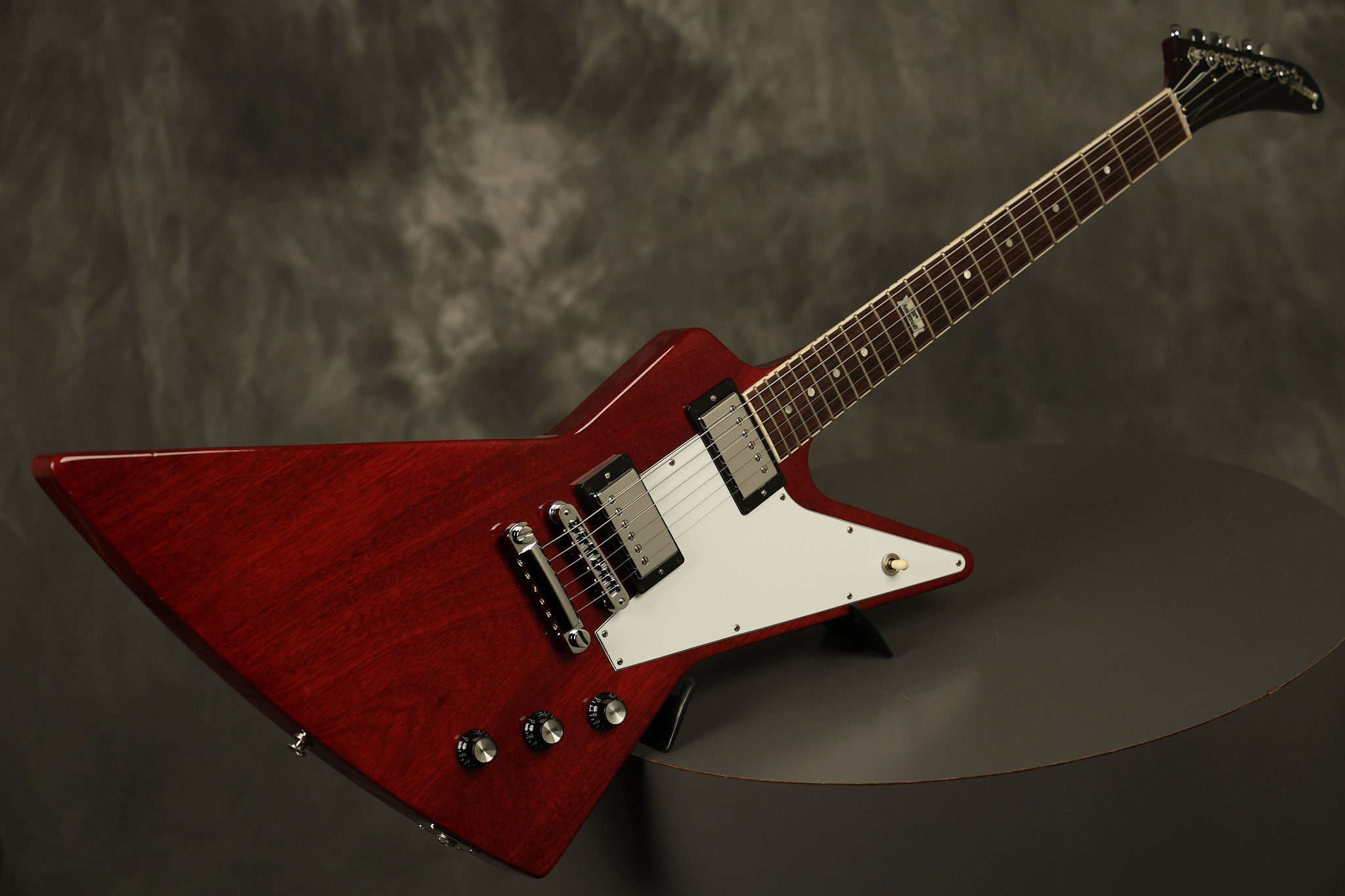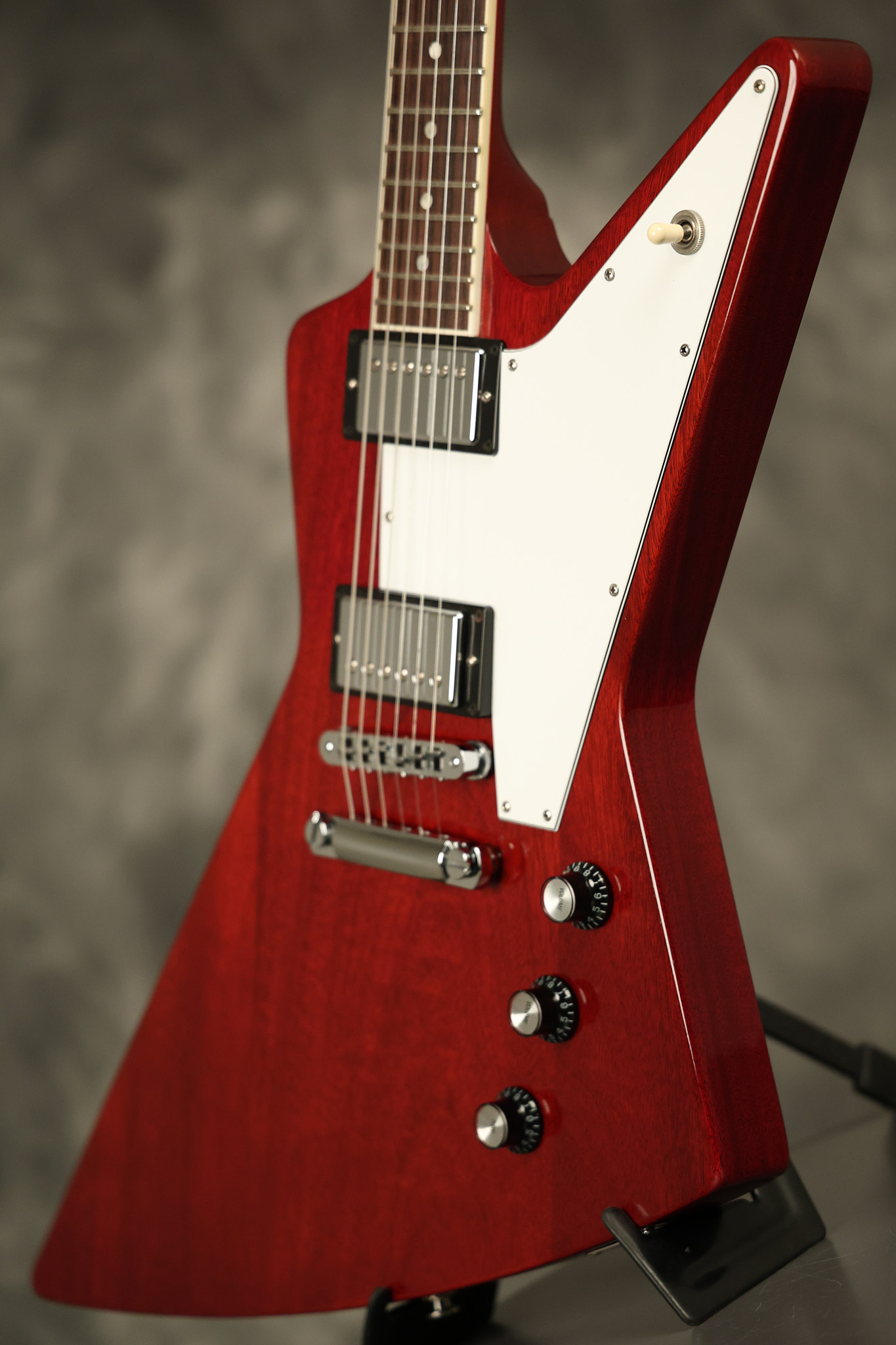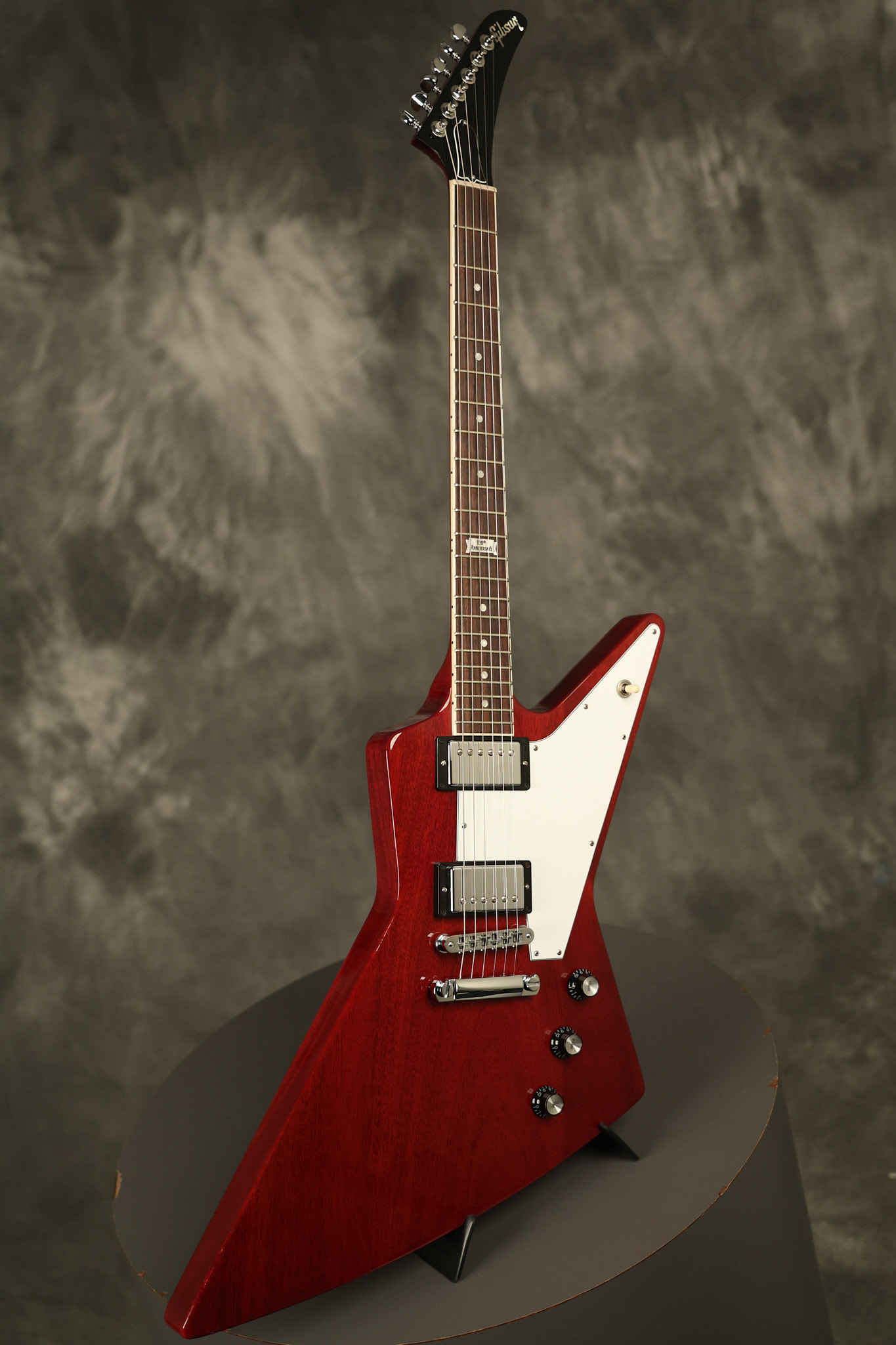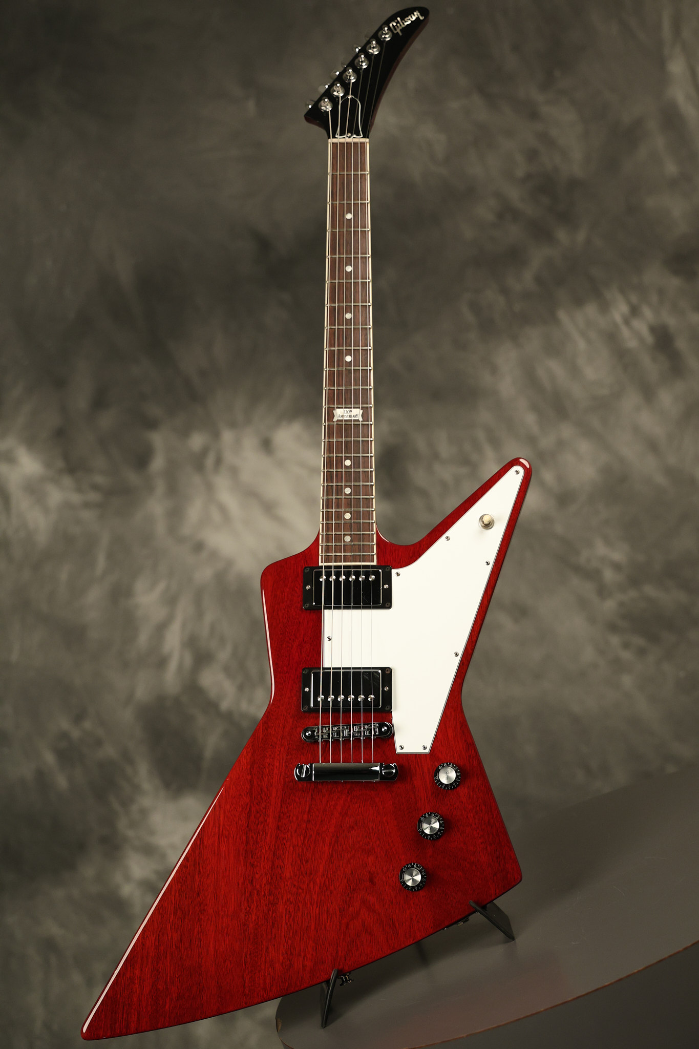 2014 Gibson 120th Anniversary model Explorer in Heritage Cherry. It has a great playing neck with great frets. It's all original with the addition of one replaced Gibson volume knobs as the original was cracked, but is still included. It is also 100% complete along with its original hardshell case. It's in very good condition with some minor nicks + dings, very light belt buckle wear on the back of the body, two marks in the finish on the underside of the headstock caused from an old guitar hanger and other minor cosmetic wear. Everything remains structurally sound with no cracks, breaks or repairs. All electronics work and sound great.