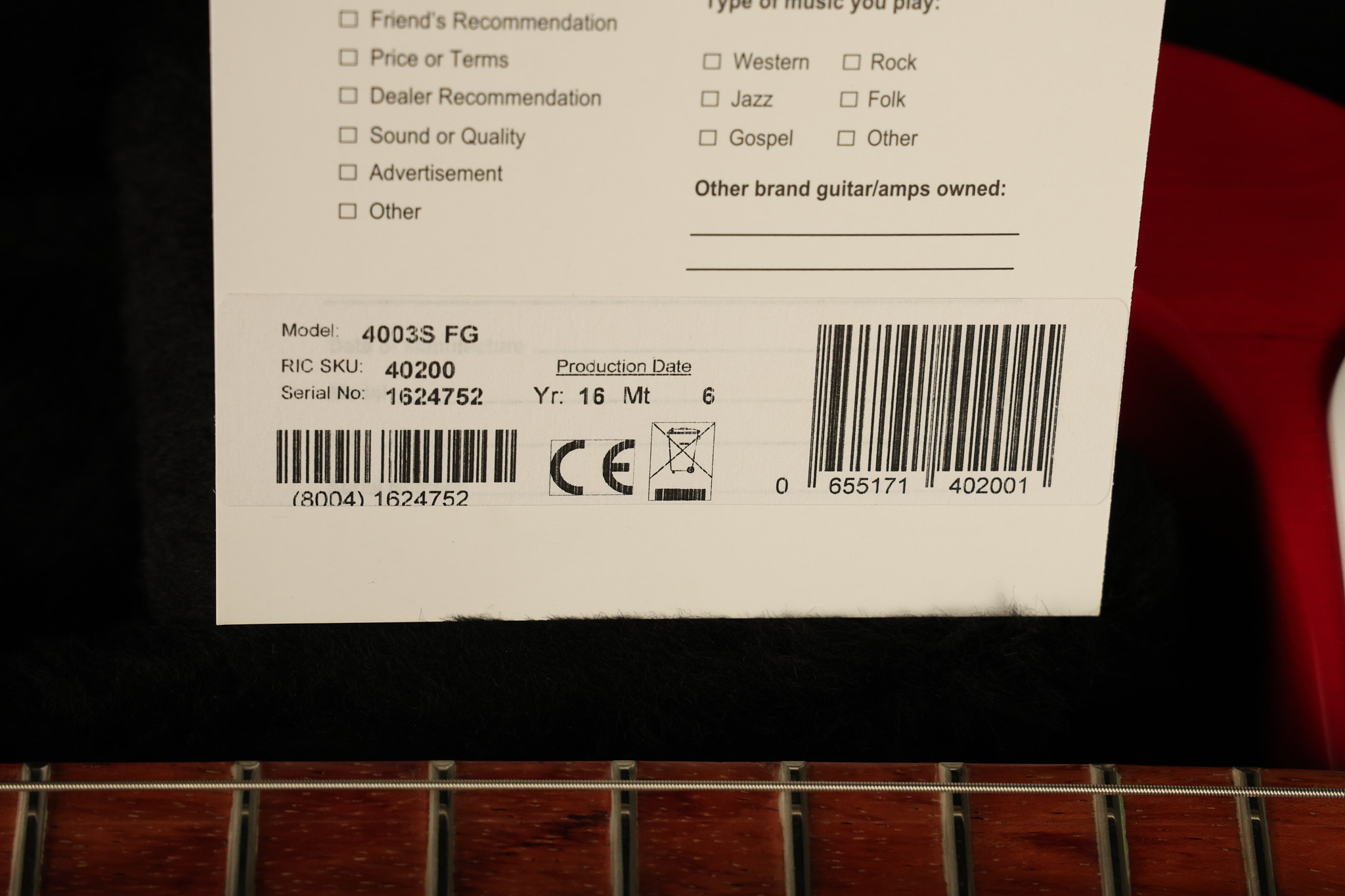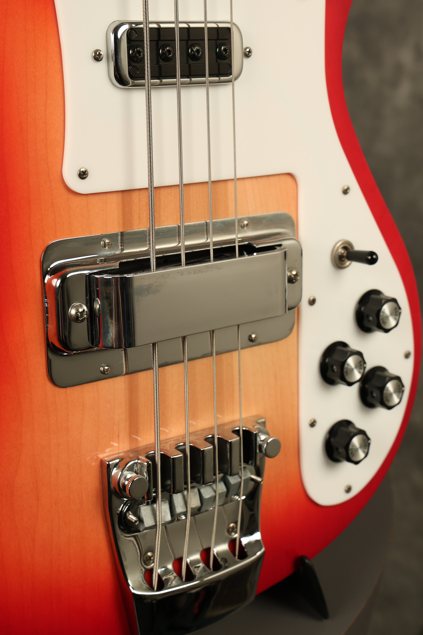 2016 Rickenbacker 4003S in Fireglo. It has a great playing neck with great frets. It's all original and 100% complete along with its original hardshell case. It's in NEAR MINT condition with only very little barely noticeable surface wear. All electronics work and sound great.