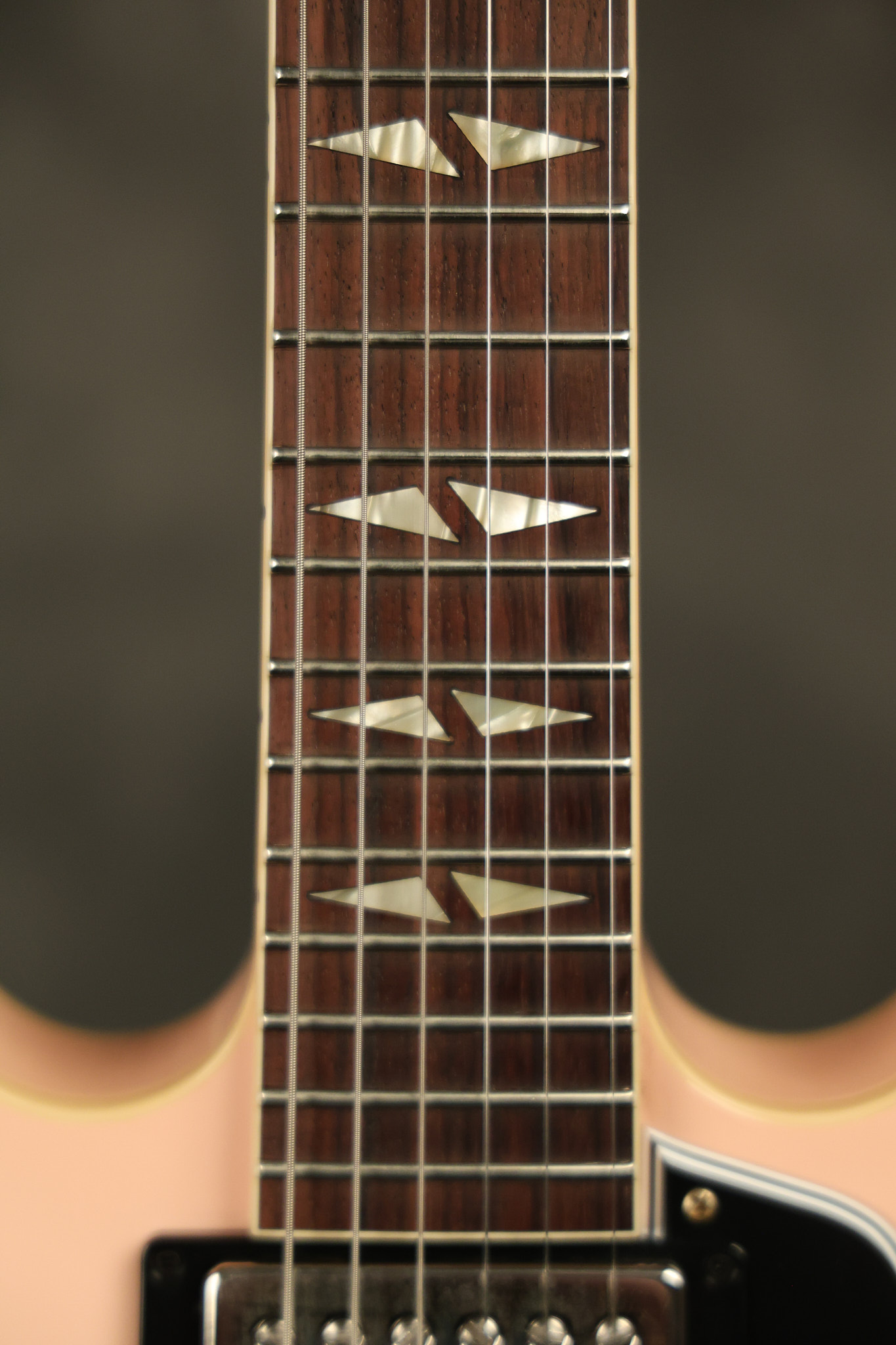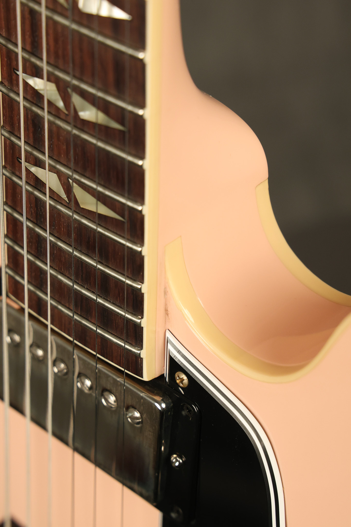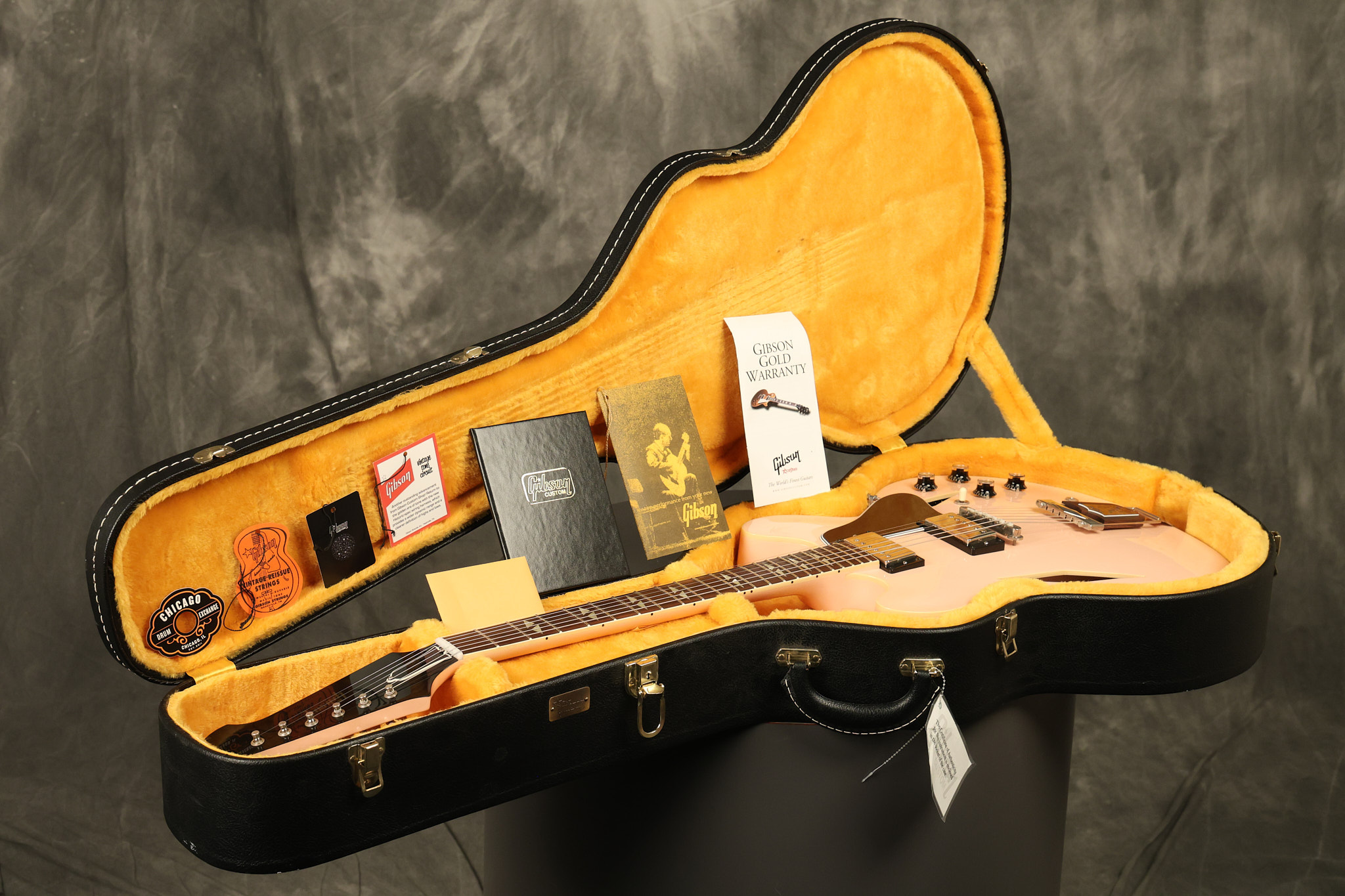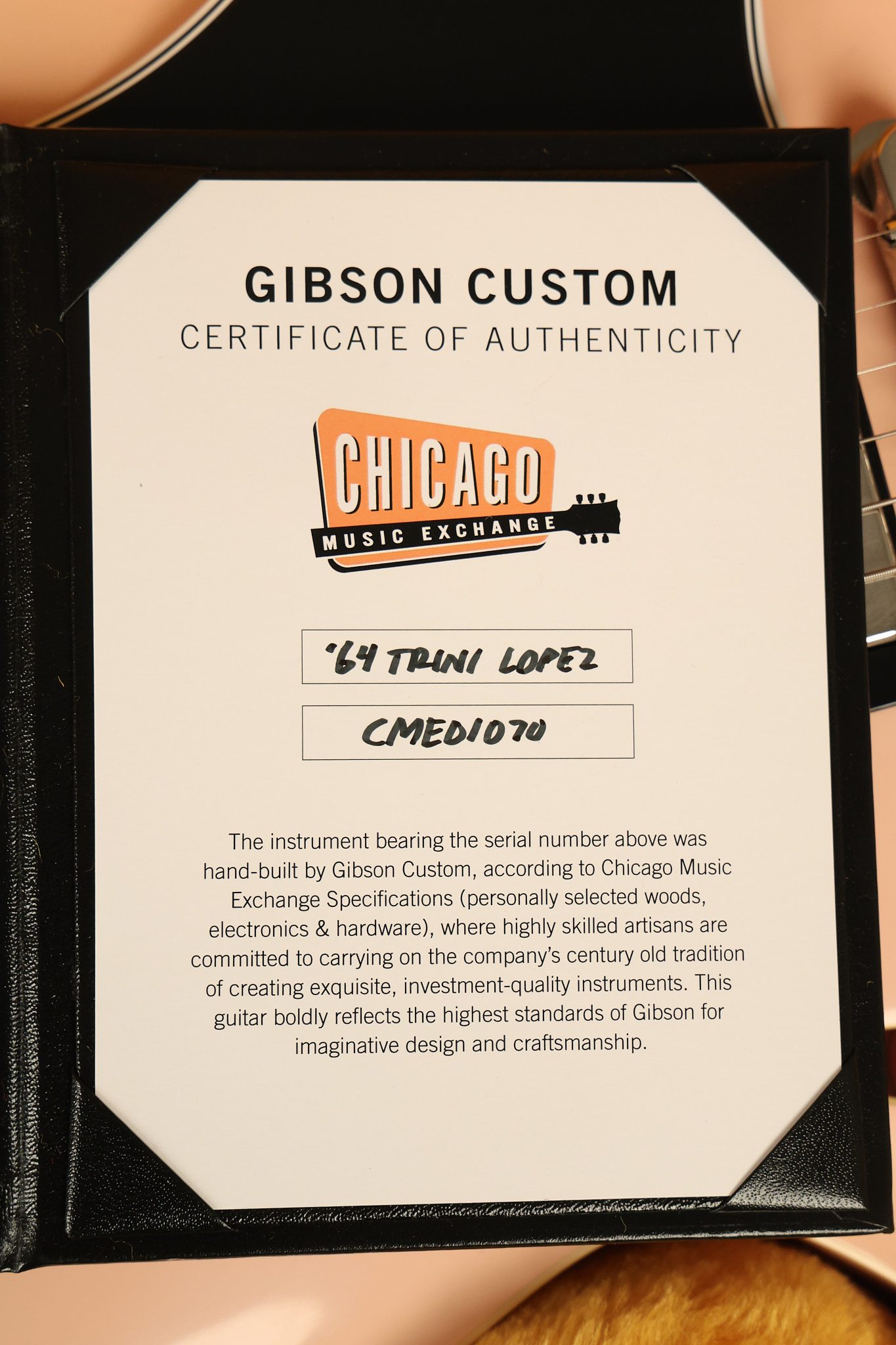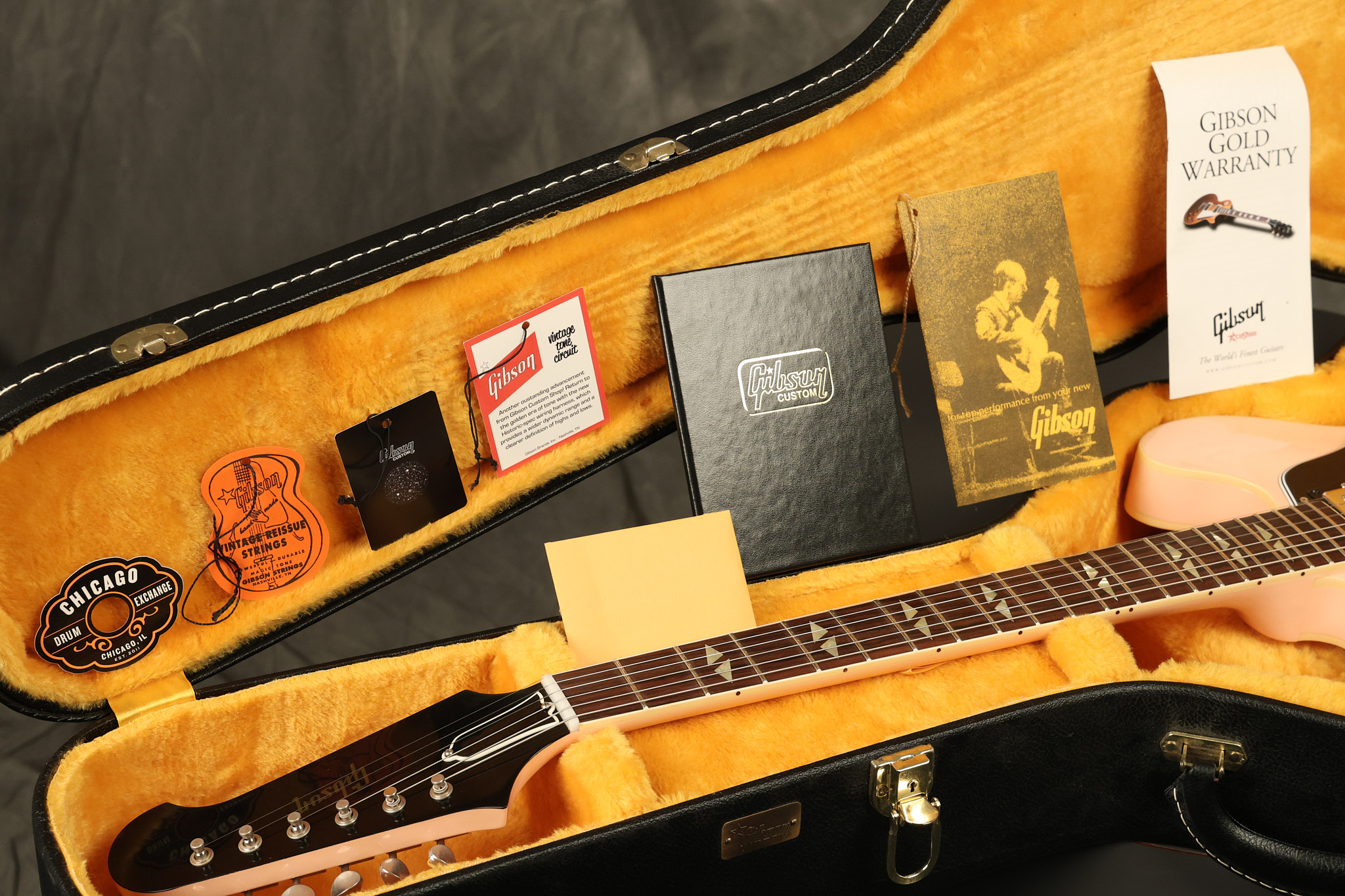 2021 Gibson Custom Shop CME Exclusive '64 Trini Lopez reissue in Antique Shell Pink VOS. It has a great playing neck with great frets. It's all original and 100% complete along along with its original hardshell case and certificate of authenticity. It's in EXCELLENT condition with only very little extremely minor cosmetic wear. Everything remains structurally sound with no cracks, breaks or repairs. All electronics work and sound great.