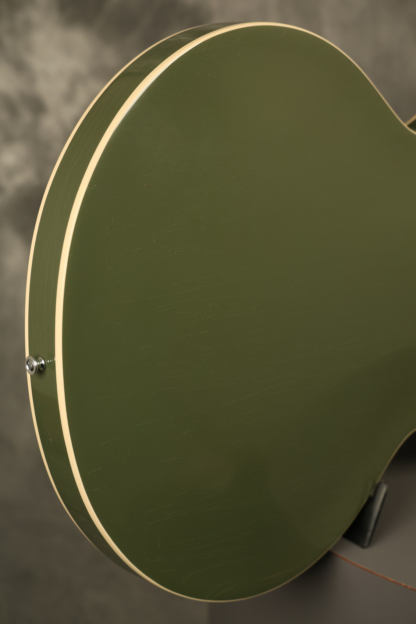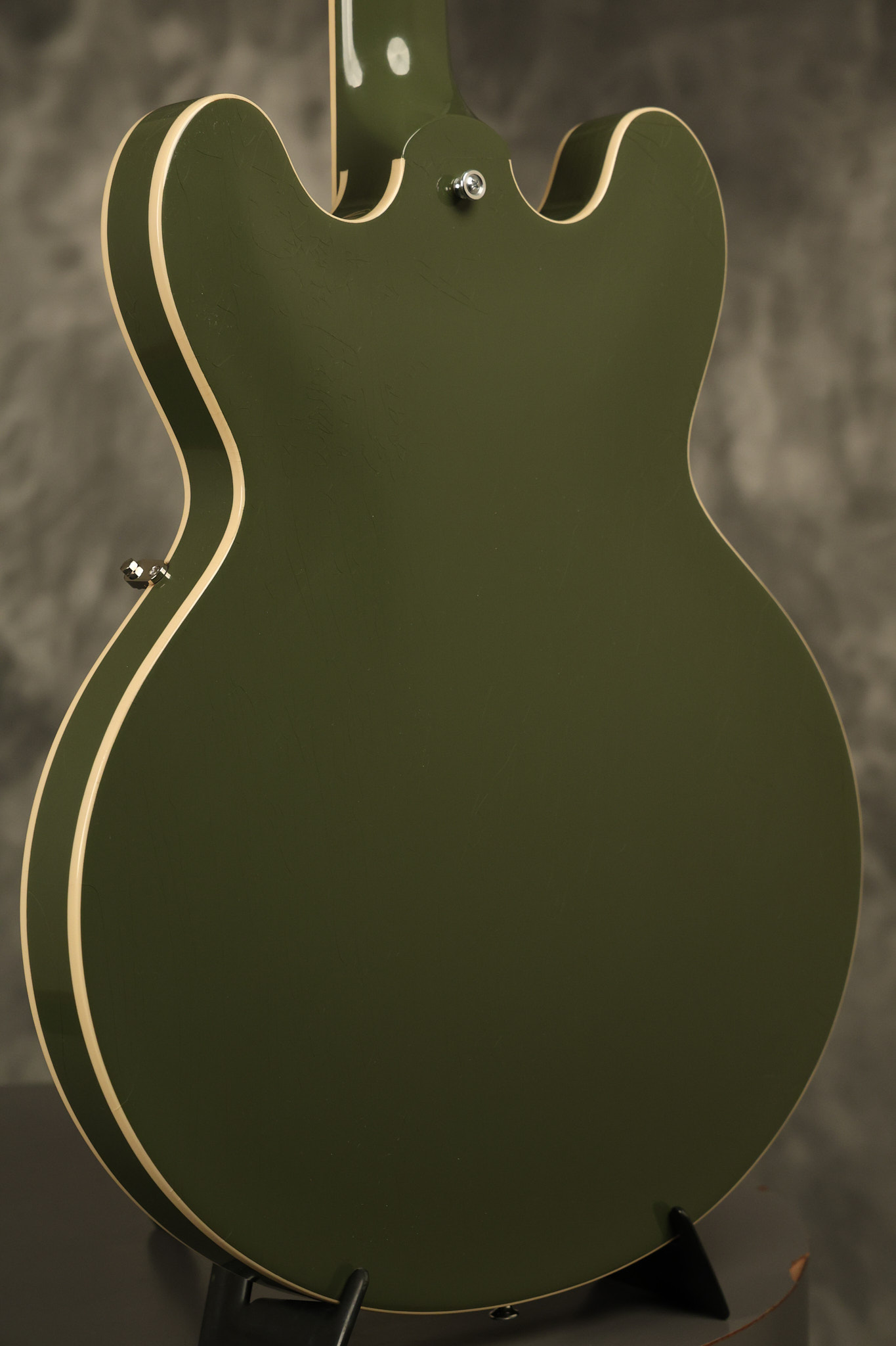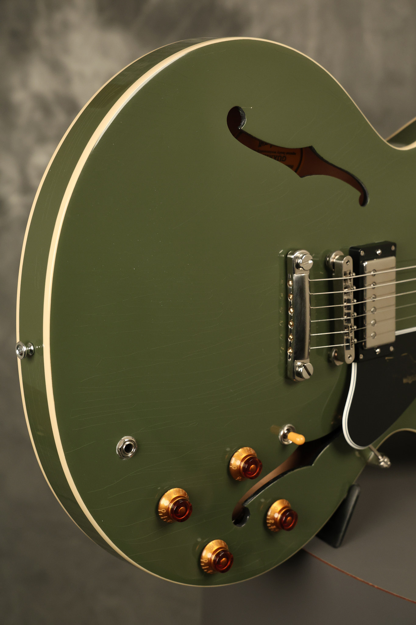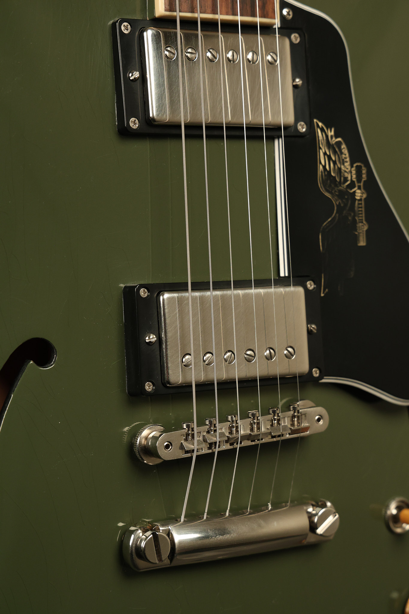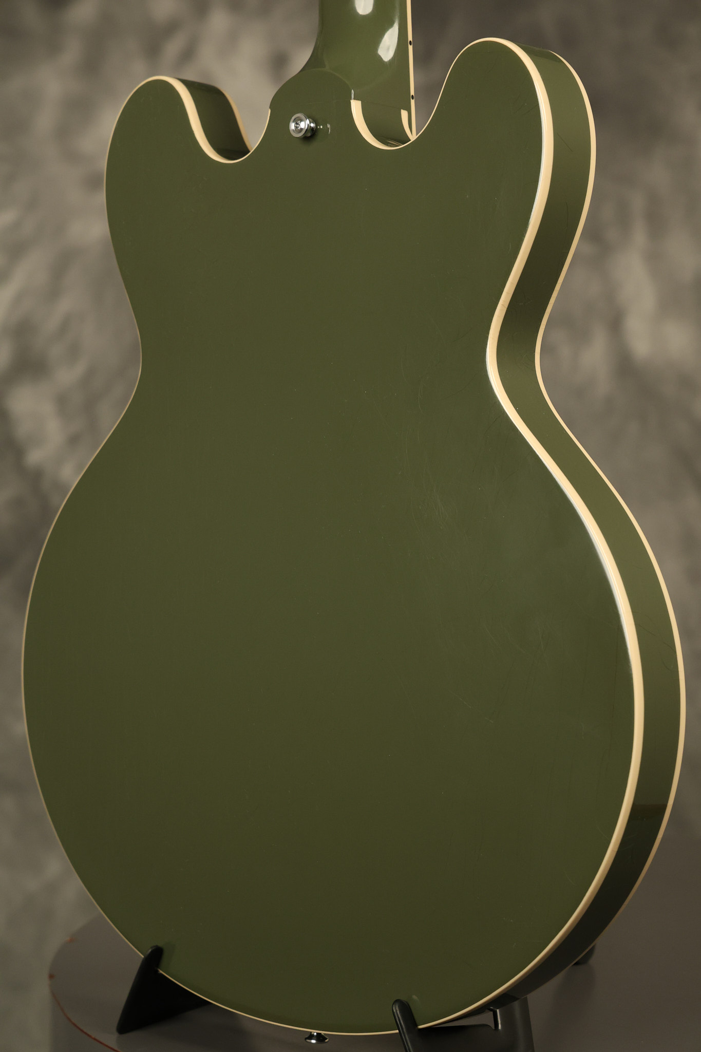 2021 Gibson ES-335 in Olive Drab Gloss. A previous owner gave it a different look by changing the pickguard with a Black Government Issue series, black pickup surrounds, changed knobs, changed switch tip, a set of Seymour Duncan Pearly Gates pickups and the surface of the guitar is covered in minor scratches as an attempt to resemble more of a VOS appearance. We have buffed a lot out to bring back more of a Gloss finish, but the minor scratches are still visible. It has a great playing neck with great frets. The original hardshell case is included along with the papers and Gibson strap. This unique ES-335 looks good with some minor nicks + dings, lots of minor finish checking and other cosmetic wear. The guitar itself remains structurally sound with no cracks, breaks or repairs. All electronics work and sound great.