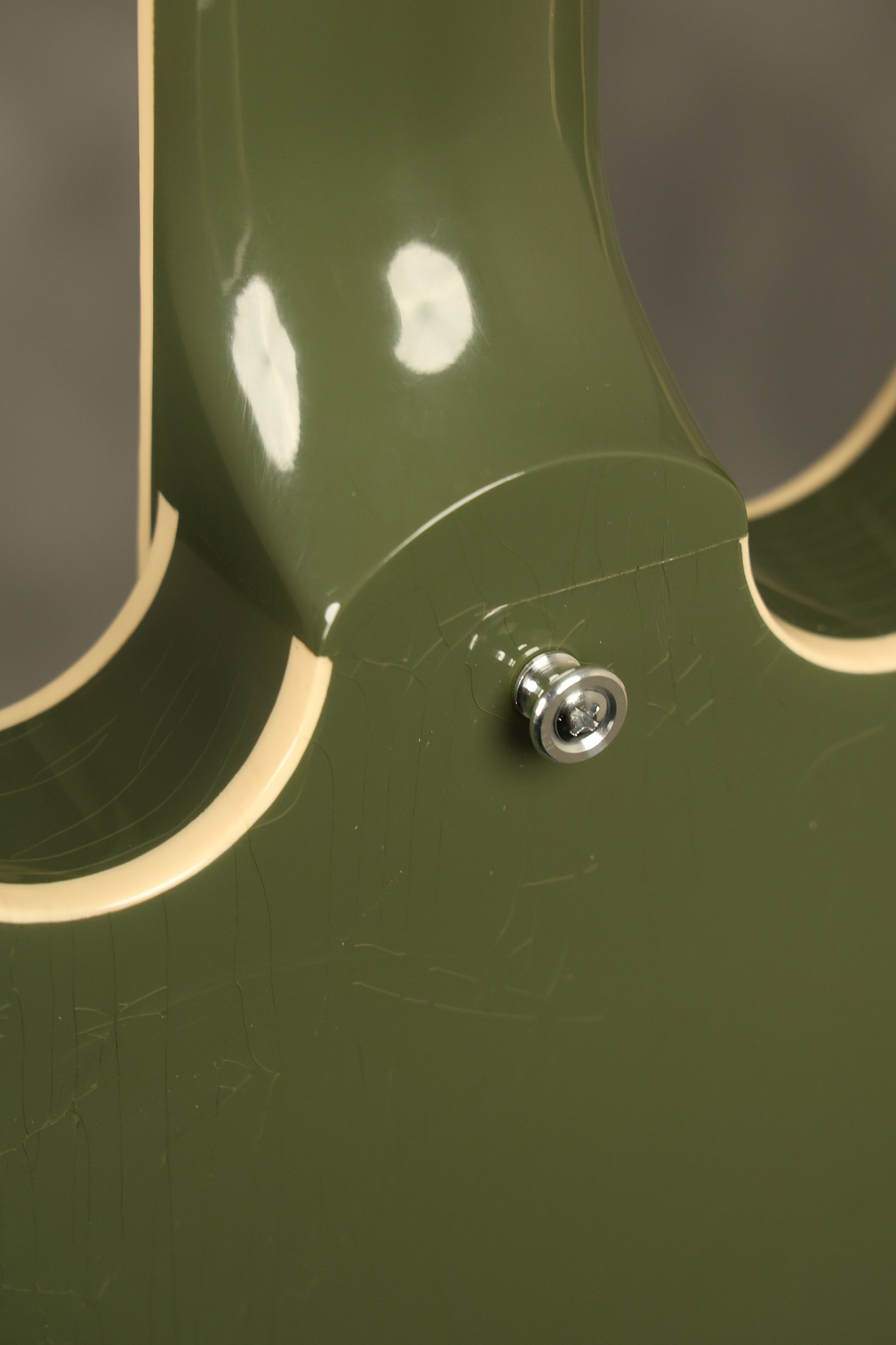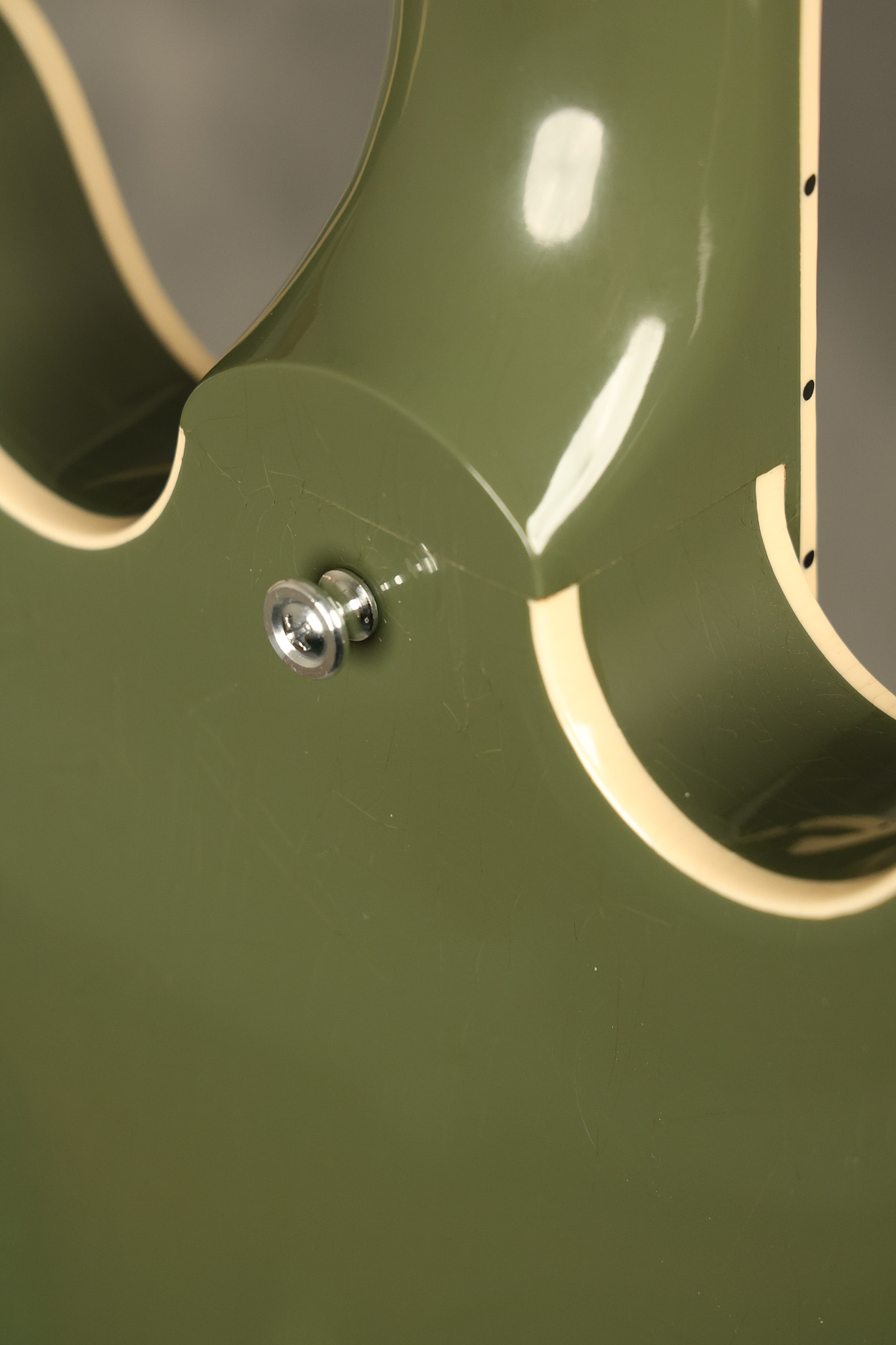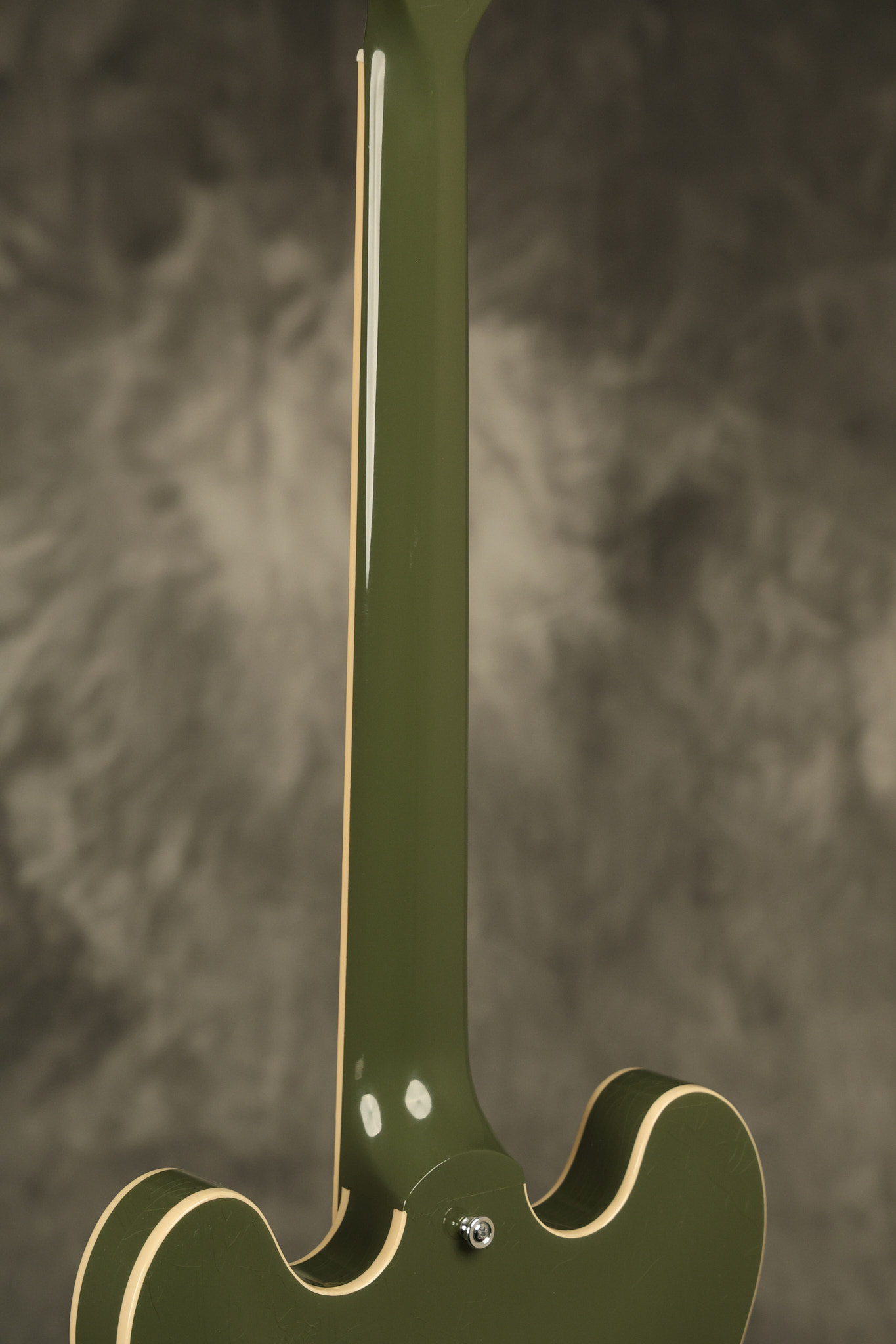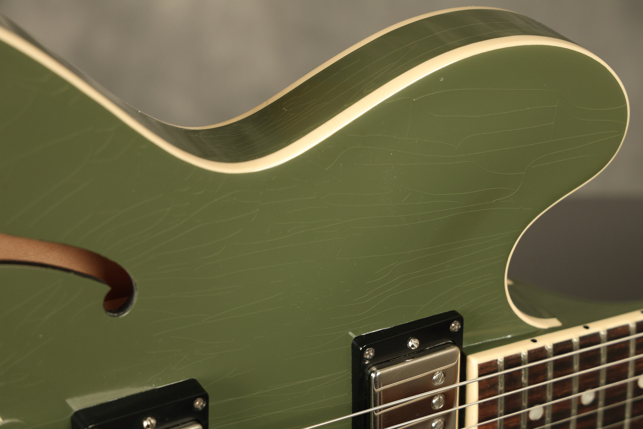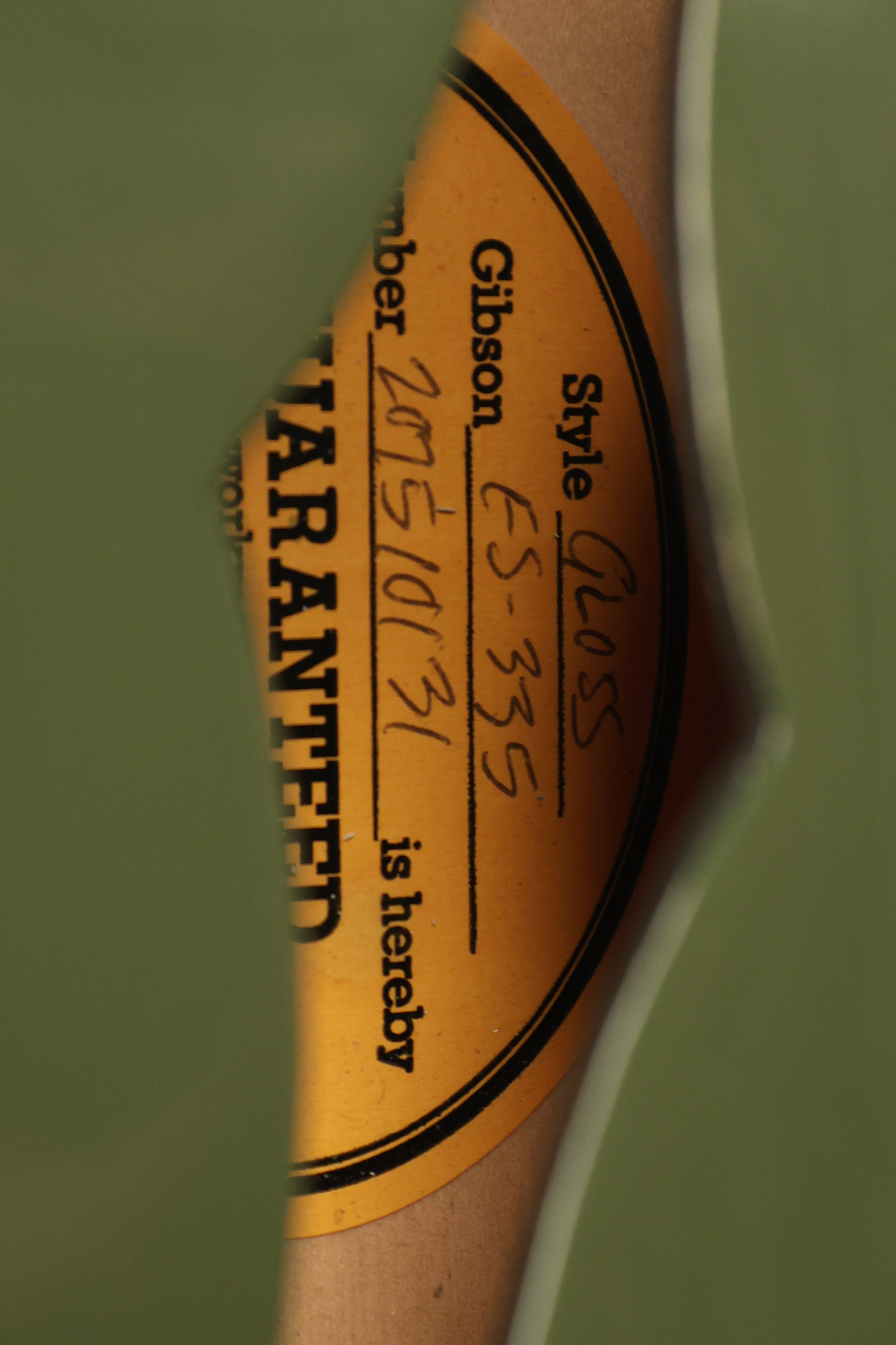 2021 Gibson ES-335 in Olive Drab Gloss. A previous owner gave it a different look by changing the pickguard with a Black Government Issue series, black pickup surrounds, changed knobs, changed switch tip, a set of Seymour Duncan Pearly Gates pickups and the surface of the guitar is covered in minor scratches as an attempt to resemble more of a VOS appearance. We have buffed a lot out to bring back more of a Gloss finish, but the minor scratches are still visible. It has a great playing neck with great frets. The original hardshell case is included along with the papers and Gibson strap. This unique ES-335 looks good with some minor nicks + dings, lots of minor finish checking and other cosmetic wear. The guitar itself remains structurally sound with no cracks, breaks or repairs. All electronics work and sound great.