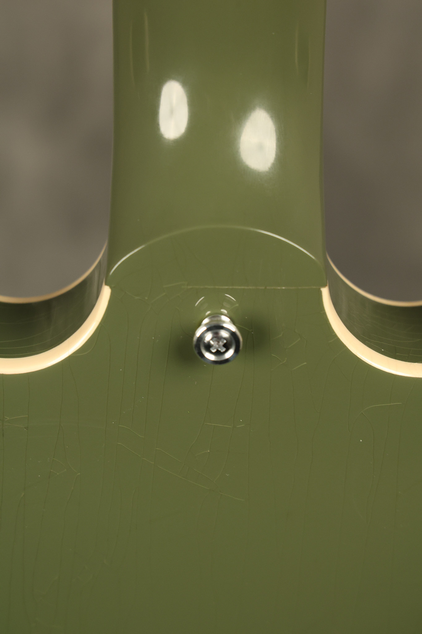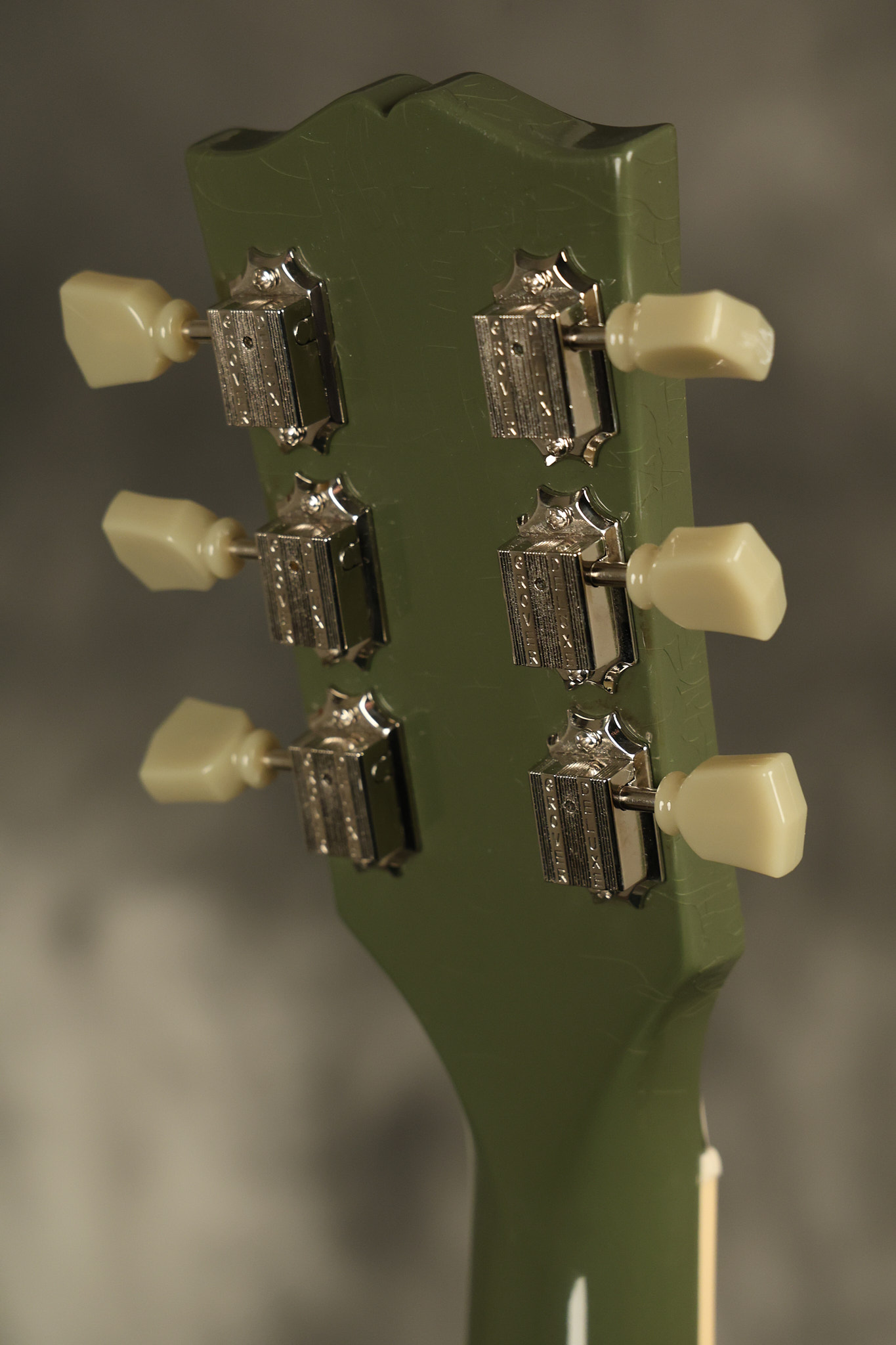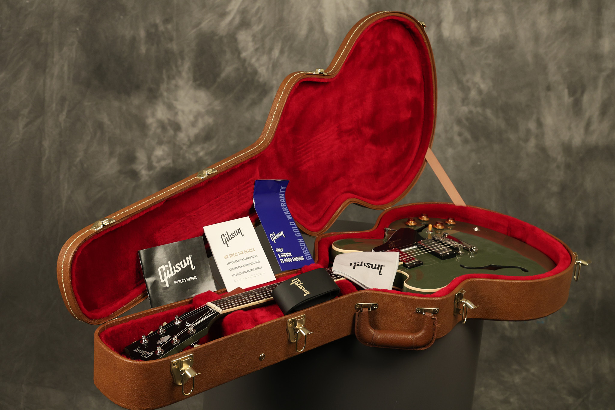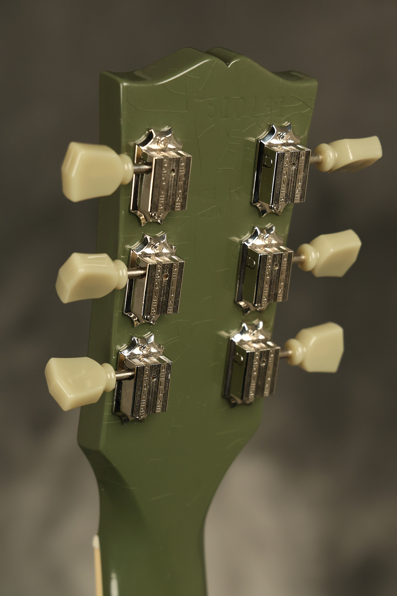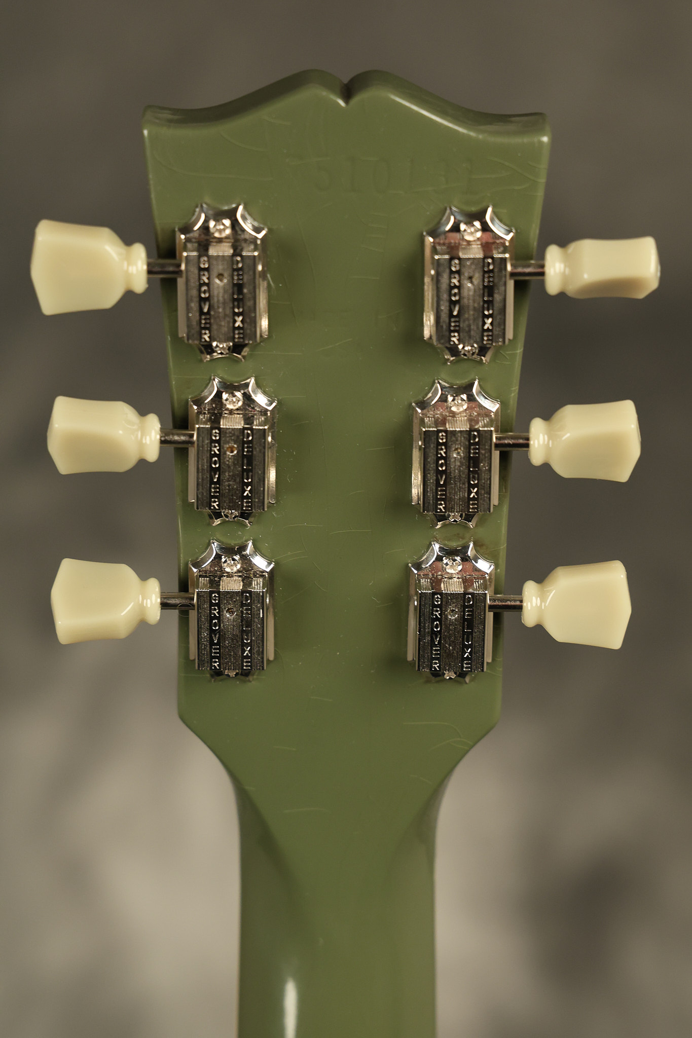 2021 Gibson ES-335 in Olive Drab Gloss. A previous owner gave it a different look by changing the pickguard with a Black Government Issue series, black pickup surrounds, changed knobs, changed switch tip, a set of Seymour Duncan Pearly Gates pickups and the surface of the guitar is covered in minor scratches as an attempt to resemble more of a VOS appearance. We have buffed a lot out to bring back more of a Gloss finish, but the minor scratches are still visible. It has a great playing neck with great frets. The original hardshell case is included along with the papers and Gibson strap. This unique ES-335 looks good with some minor nicks + dings, lots of minor finish checking and other cosmetic wear. The guitar itself remains structurally sound with no cracks, breaks or repairs. All electronics work and sound great.
