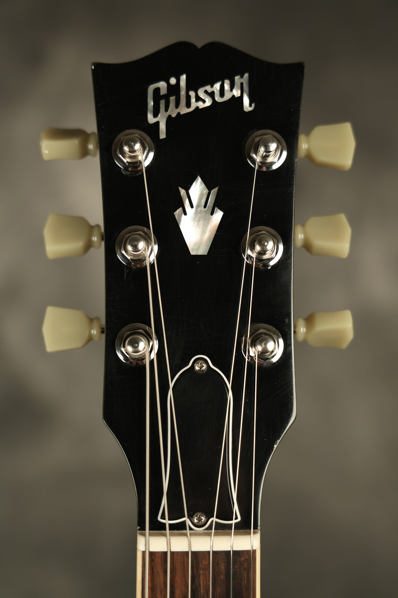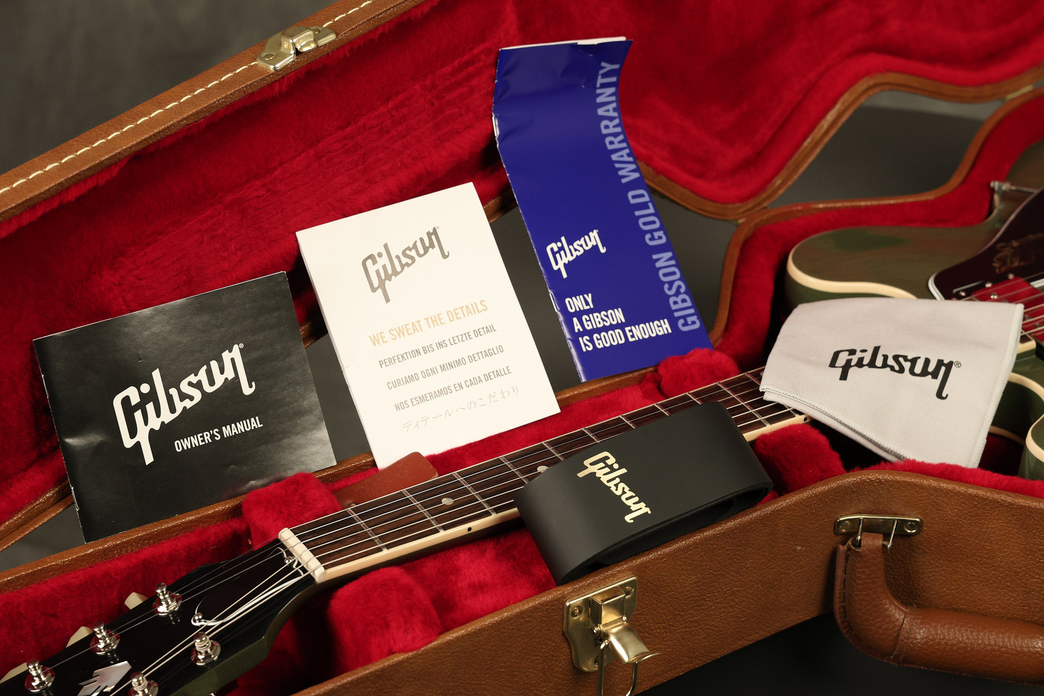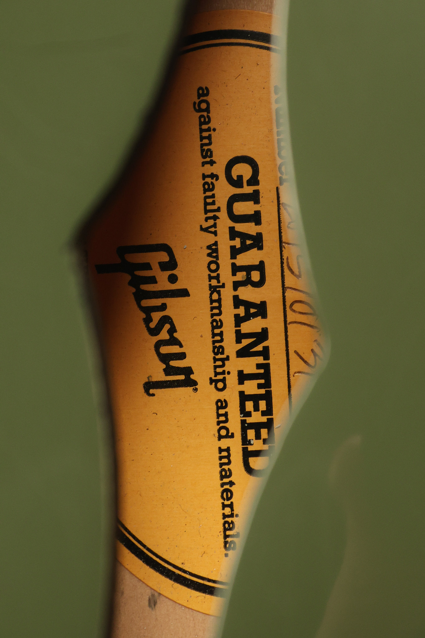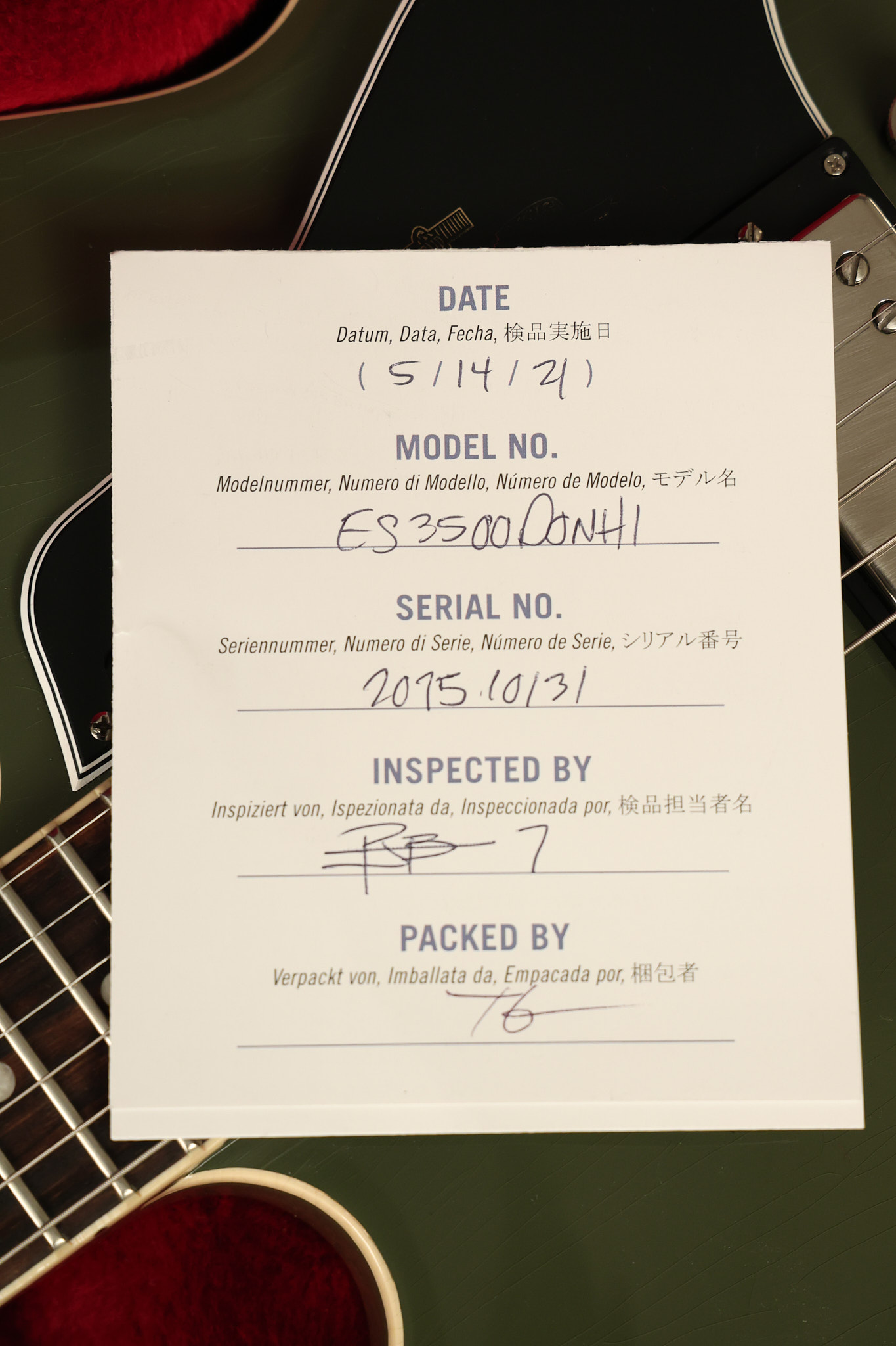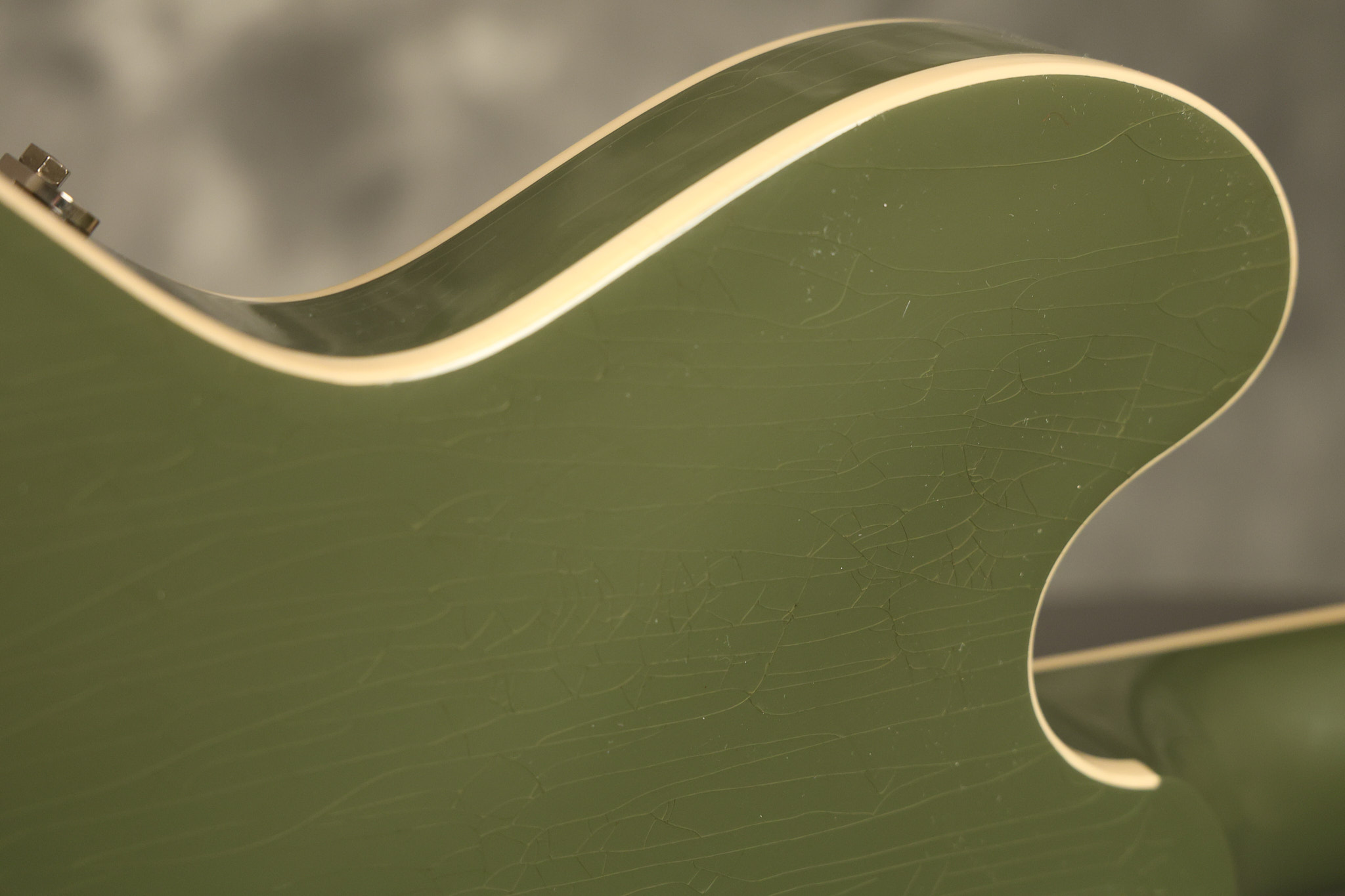 2021 Gibson ES-335 in Olive Drab Gloss. A previous owner gave it a different look by changing the pickguard with a Black Government Issue series, black pickup surrounds, changed knobs, changed switch tip, a set of Seymour Duncan Pearly Gates pickups and the surface of the guitar is covered in minor scratches as an attempt to resemble more of a VOS appearance. We have buffed a lot out to bring back more of a Gloss finish, but the minor scratches are still visible. It has a great playing neck with great frets. The original hardshell case is included along with the papers and Gibson strap. This unique ES-335 looks good with some minor nicks + dings, lots of minor finish checking and other cosmetic wear. The guitar itself remains structurally sound with no cracks, breaks or repairs. All electronics work and sound great.