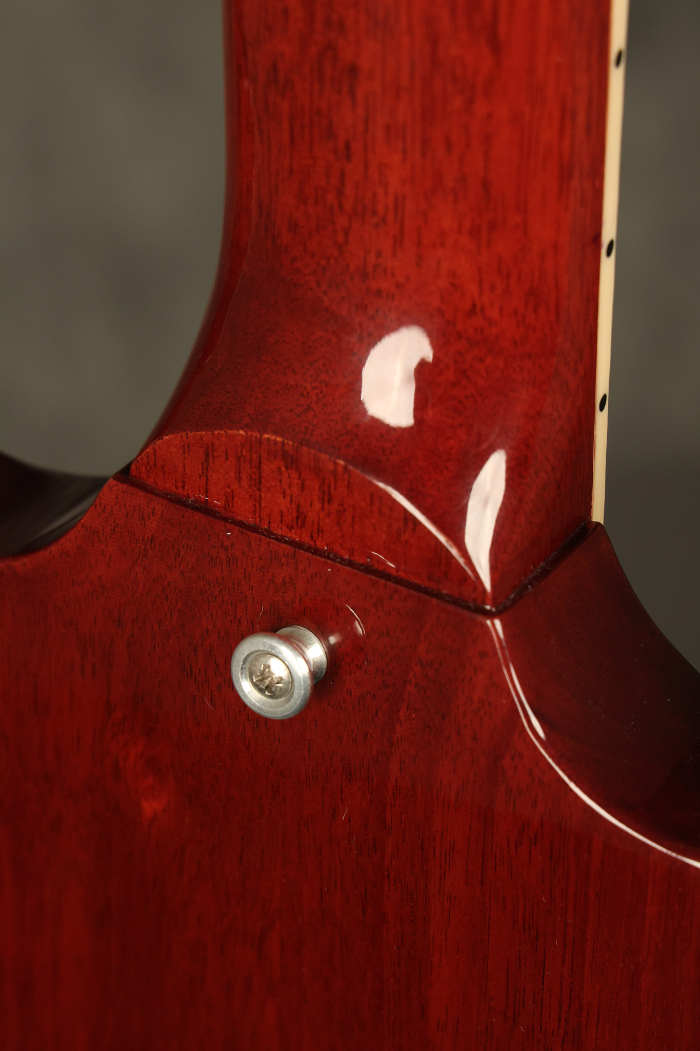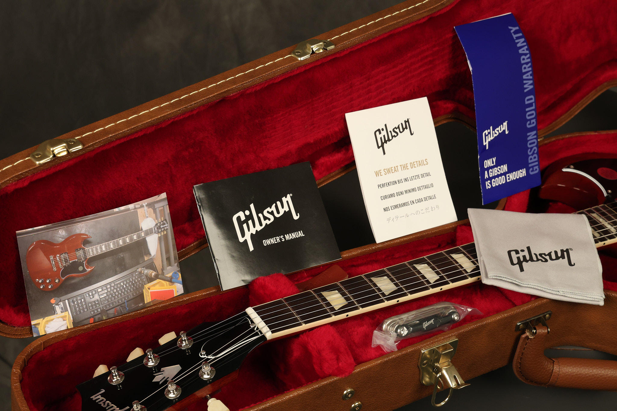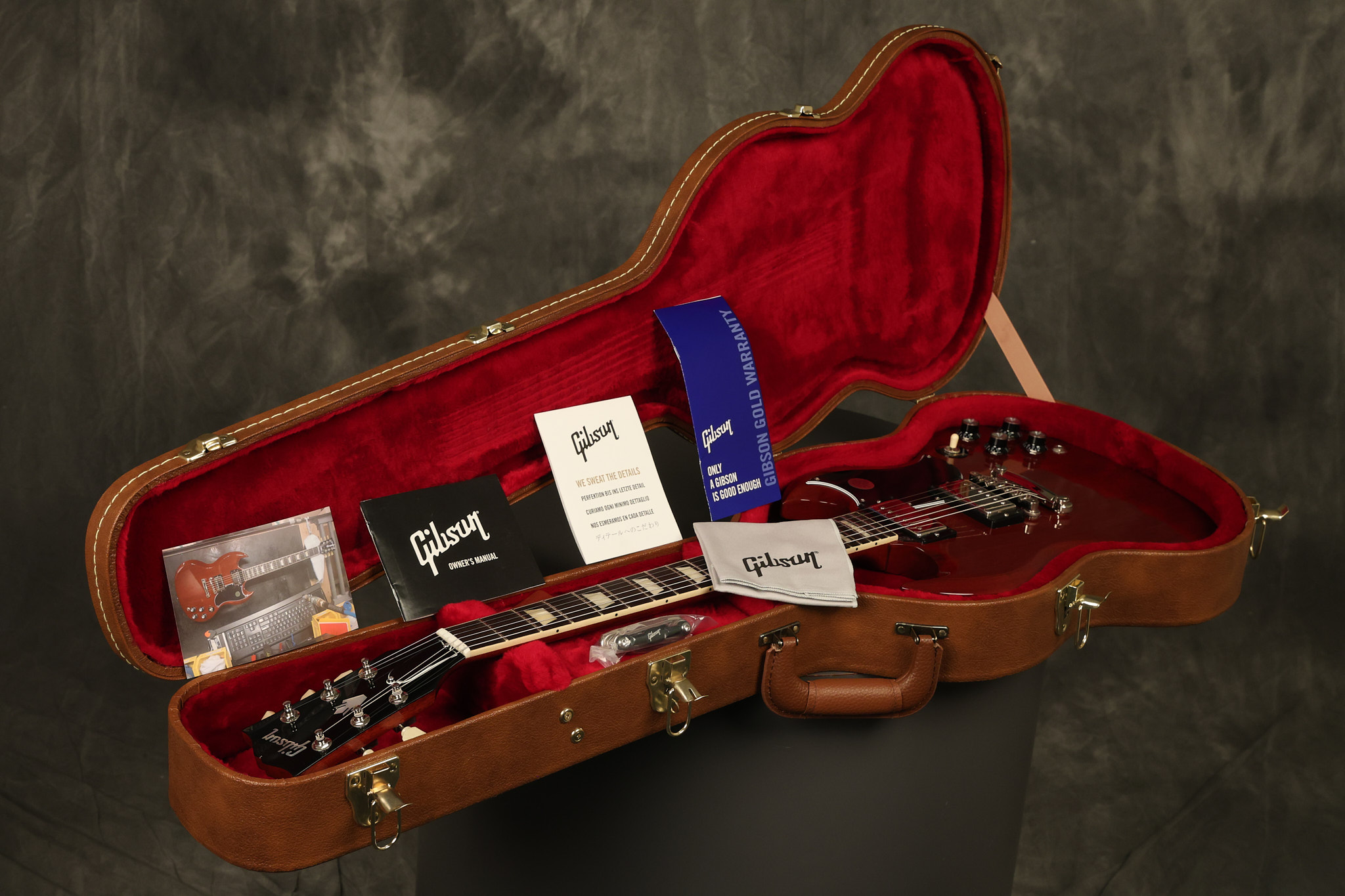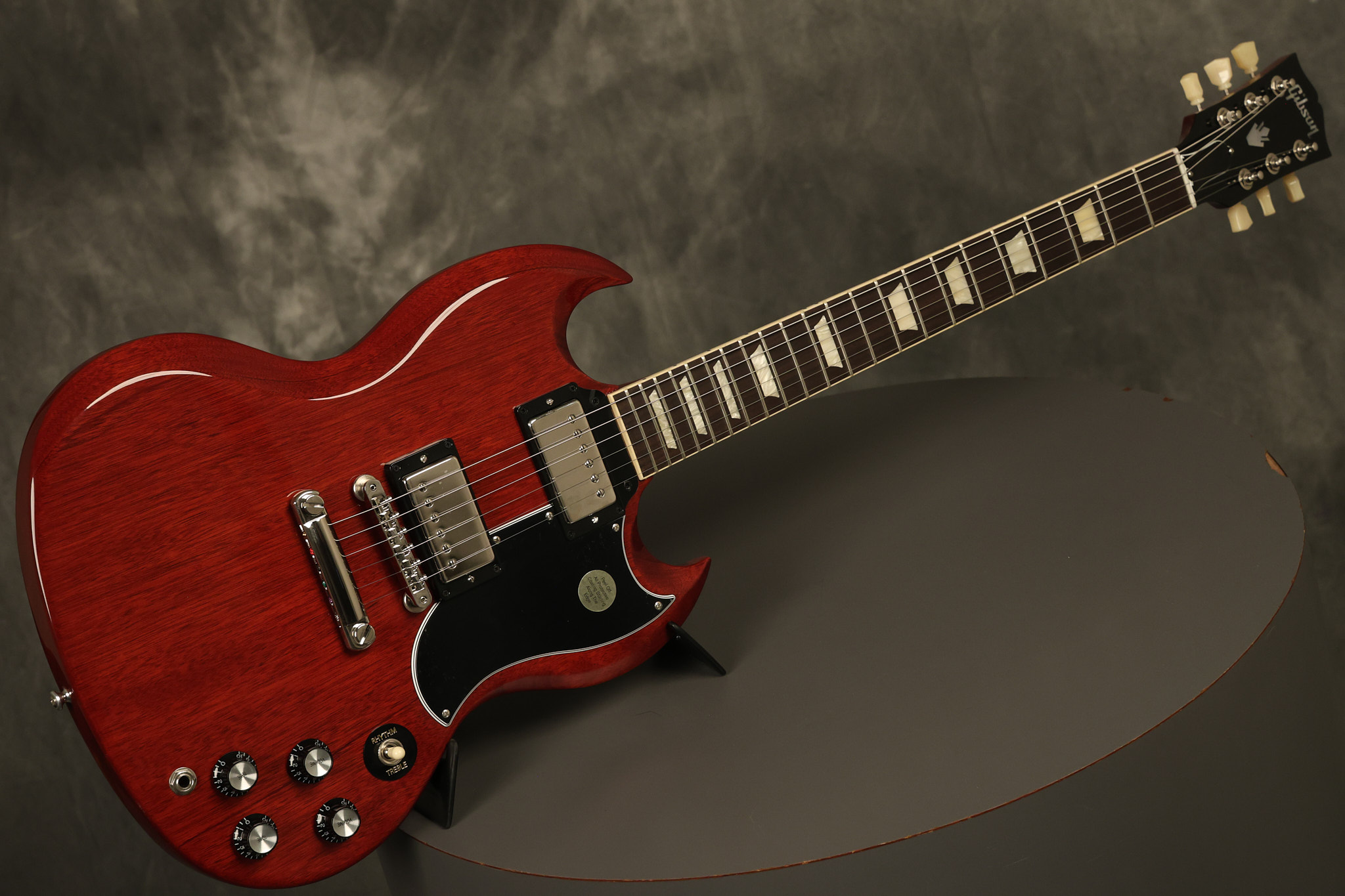 2021 Gibson SG Standard '61 reissue in Cherry. It has a great playing neck with great frets. It's all original and 100% complete along with its original hardshell case. It's in EXCELLENT condition with some tiny barely noticeable blemishes in the finish and some other minor surface wear. The protective plastic is still on the pickguard. Everything remains structurally sound with no cracks, breaks or repairs. All electronics work and sound great.